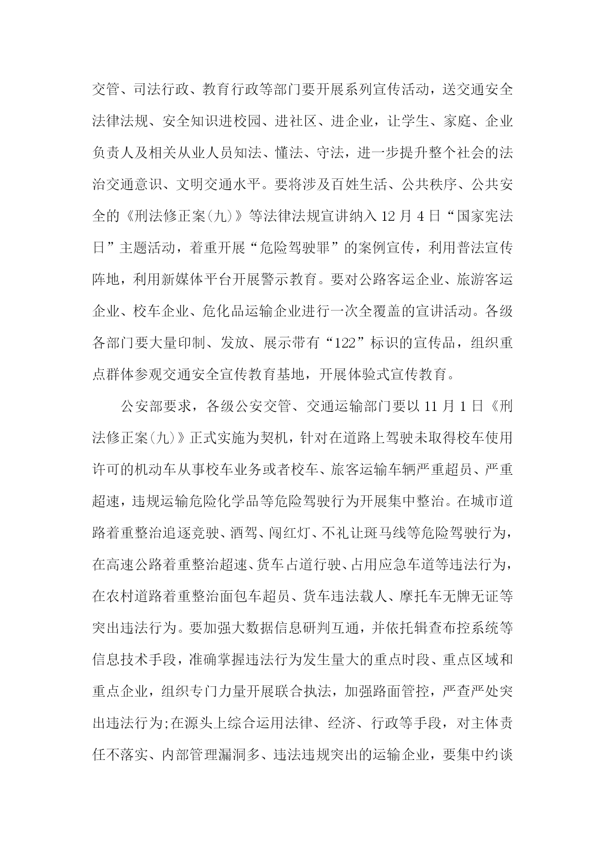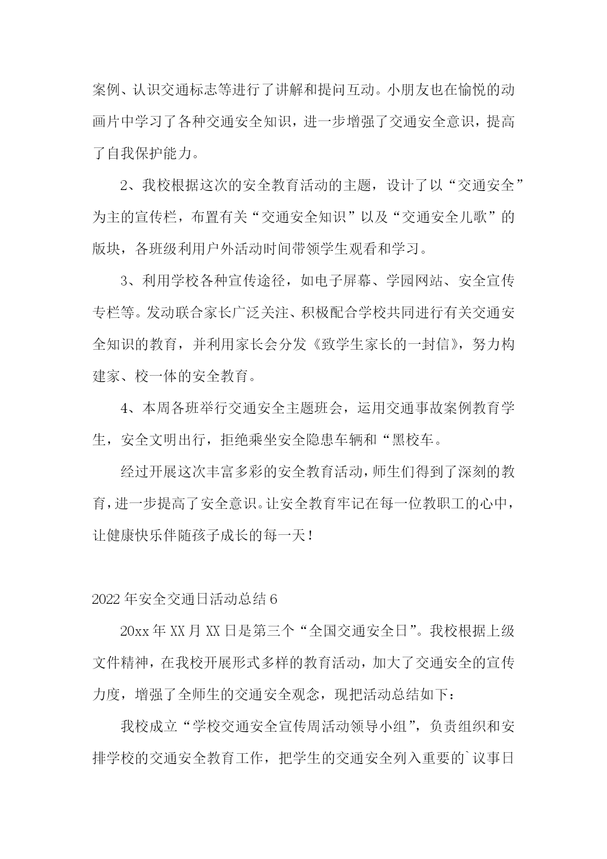 安全交通日活动总结2022年安全交通日活动总结1为增强广大师生交通安全和法律意识,11月23日,我局交警大队深入三江小学开展“交通安全宣传活动”讲座,受到在校1200多名师生的一致好评。民警针对学生的年龄特点,提醒小学生要时刻注意自身安全,提高自我安全防范意识。同时,通过讲述交通事故实例,警示学生们一定要遵守交通规则,文明礼让出行,不要骑自行车相互追逐,过马路要“一停二看三经过”,养成良好的交通习惯。开展此次交通安全知识讲座,进一步增强了学生们的交通安全防范意识和自我保护能力,为莘莘学子们的健康快乐成长提供了正面的交通安全宣传力量。2022年安全交通日活动总结2为认真落实《国务院关于加强道路交通安全工作的意见》,提升全民交通安全意识、法治意识和文明意识,深入推动“文明交通行动计划”实施,形成严格遵守交通法规、自觉维护良好秩序、携手治理交通环境、切实提升文明交通水平的社会氛围,公安部、中央文明办、教育部、司法部、交通运输部、国家安全监管总局等部门,今年将以“拒绝危险驾驶、安全文明出行”为主题,在全国组织开展122“全国交通安全日”主题活动。公安部提出,此次122“全国交通安全日”主题活动,各级公安交管、司法行政、教育行政等部门要开展系列宣传活动,送交通安全法律法规、安全知识进校园、进社区、进企业,让学生、家庭、企业负责人及相关从业人员知法、懂法、守法,进一步提升整个社会的法治交通意识、文明交通水平。要将涉及百姓生活、公共秩序、公共安全的《刑法修正案(九)》等法律法规宣讲纳入12月4日“国家宪法日”主题活动,着重开展“危险驾驶罪”的案例宣传,利用普法宣传阵地,利用新媒体平台开展警示教育。要对公路客运企业、旅游客运企业、校车企业、危化品运输企业进行一次全覆盖的宣讲活动。各级各部门要大量印制、发放、展示带有“122”标识的宣传品,组织重点群体参观交通安全宣传教育基地,开展体验式宣传教育。公安部要求,各级公安交管、交通运输部门要以11月1日《刑法修正案(九)》正式实施为契机,针对在道路上驾驶未取得校车使用许可的机动车从事校车业务或者校车、旅客运输车辆严重超员、严重超速,违规运输危险化学品等危险驾驶行为开展集中整治。在城市道路着重整治追逐竞驶、酒驾、闯红灯、不礼让斑马线等危险驾驶行为,在高速公路着重整治超速、货车占道行驶、占用应急车道等违法行为,在农村道路着重整治面包车超员、货车违法载人、摩托车无牌无证等突出违法行为。要加强大数据信息研判互通,并依托辑查布控系统等信息技术手段,准确掌握违法行为发生量大的重点时段、重点区域和重点企业,组织专门力量开展联合执法,加强路面管控,严查严处突出违法行为;在源头上综合运用法律、经济、行政等手段,对主体责任不落实、内部管理漏洞多、违法违规突出的运输企业,要集中约谈企业负责人,责令加强内部管理,严格落实动态监控制度、内部安全教育制度和“五不两确保”安全承诺制度;对问题严重的,要依法追究企业负责人、安全管理人员责任。各级文明办、共青团、妇联、工会等要充分动员社会各方面资源,结合地区实际,开展文明交通志愿服务引导、扶助事故受害者等公益活动,积极倡导文明出行、礼貌乘车,大力宣传文明交通新风尚,倡导文明交通好习惯。各级交通运输、公安交管部门要集中宣传、公开表彰文明驾驶先进个人、集体和示范村、学校,广泛展示“好交警”、“好司机”的故事,大力传播文明交通正能量。各地各部门要鼓励企事业单位、社会名人发挥示范作用,积极履行社会责任,抵制危险驾驶行为,参加文明交通倡议等主题活动,积极参与“降速五公里”、“系上安全带”、“送头盔下乡”等公益活动。另外,各级各有关部门要集中宣传力量、拓展宣传手段,在农村地区、客货运输企业、驾校组织开展“拒绝危险驾驶”主题宣传教育活动。排查修缮农村地区交通安全宣传设施,依托行政村出入口、村委会(村民服务中心)、国省道沿线自然村醒目位置宣传牌、农村交通安全服务站(劝导站)集中展示主题海报、宣传画和宣传标语,依托县电视台、广播站、乡村广播(大喇叭)开展集中宣传,组织交通安全宣传队深入农村地区宣讲危险驾驶行为的法律责任和现实危害,争取覆盖到全部乡、镇和行政村。各级交通运输、公安交管部门要结合驾驶考试制度改革,组织驾驶培训机构对驾校学员深入开展文明交通理念集中宣传、强化培训。各级交通运输部门要督促客货运输企业向每一位驾驶人告知刑法新规定、发送一次主题短信。并利用广播、电视、报纸、网络等媒体连续推出“全国交通安全日”特别节目,形成集中报道声势。相关部门领导要走进直播间参与宣传活动,要以滚动字幕、公益广告等形式播出“全国交通安全日”相关消息和主题提示;在报刊杂志开辟专版、专栏,结合违规企业、危险驾驶典型案例曝光,持续宣传危险驾驶行为的法律责任和现实危害;在互联网、“两微一端”等网络平台,统一组织“全国交通
