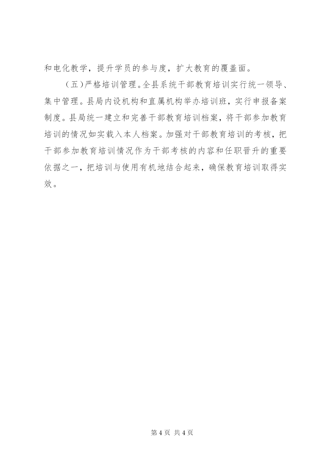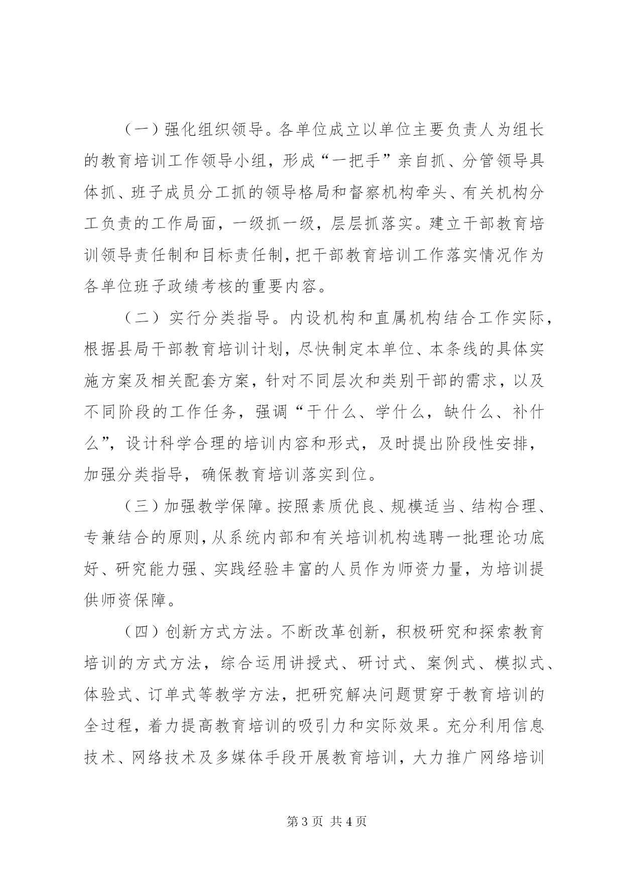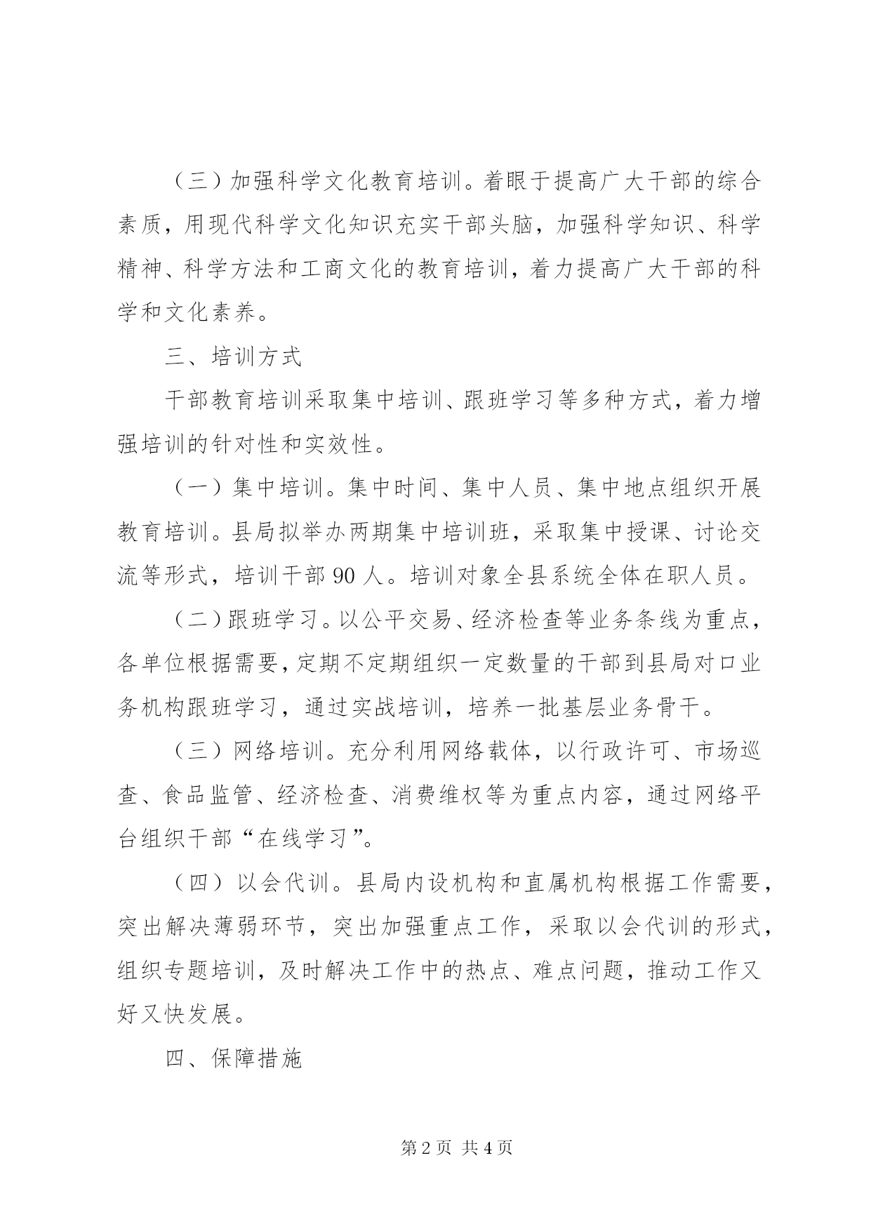 第PAGE\*Arabic\*MERGEFORMAT4页共NUMPAGES\*MERGEFORMAT4页工商局干部教育培训计划为全面提高全县工商系统干部队伍能力素质,打造一支政治过硬、业务过硬、作风过硬的干部队伍,制定2012年干部教育培训计划如下:一、总体目标2012年度全县系统干部培训人员比例达到100%,每人培训达2次以上。通过大规模教育培训,使广大干部专业素质显著提升,履职能力明显增强,工作效能全面提高,队伍形象不断改善。二、主要任务2012年,重点突出干部业务水平、专项业务技能和科学文化素养等教育培训。(一)加强干部业务培训。以基层工商所干部为重点对象,突出履行岗位职责应知应会的法律法规、业务知识、监管执法技能等内容的培训,着力提高基层干部巡查监管、查办案件、服务发展的能力和水平,培养一支适应新时期工商行政管理工作任务和要求的基层干部队伍。(二)加强专项业务岗位技能培训。以从事登记注册、经济检查、食品监管、消费维权和政务督察等岗位工作人员为重点对象,突出法律法规和岗位技能等内容的培训,着力提高专项业务知识水平、岗位技能和工作效能,培养一批登记注册、经济检查、食品监管、消费维权、政务督察等岗位的专家型、复合型人才。(三)加强科学文化教育培训。着眼于提高广大干部的综合素质,用现代科学文化知识充实干部头脑,加强科学知识、科学精神、科学方法和工商文化的教育培训,着力提高广大干部的科学和文化素养。三、培训方式干部教育培训采取集中培训、跟班学习等多种方式,着力增强培训的针对性和实效性。(一)集中培训。集中时间、集中人员、集中地点组织开展教育培训。县局拟举办两期集中培训班,采取集中授课、讨论交流等形式,培训干部90人。培训对象全县系统全体在职人员。(二)跟班学习。以公平交易、经济检查等业务条线为重点,各单位根据需要,定期不定期组织一定数量的干部到县局对口业务机构跟班学习,通过实战培训,培养一批基层业务骨干。(三)网络培训。充分利用网络载体,以行政许可、市场巡查、食品监管、经济检查、消费维权等为重点内容,通过网络平台组织干部“在线学习”。(四)以会代训。县局内设机构和直属机构根据工作需要,突出解决薄弱环节,突出加强重点工作,采取以会代训的形式,组织专题培训,及时解决工作中的热点、难点问题,推动工作又好又快发展。四、保障措施(一)强化组织领导。各单位成立以单位主要负责人为组长的教育培训工作领导小组,形成“一把手”亲自抓、分管领导具体抓、班子成员分工抓的领导格局和督察机构牵头、有关机构分工负责的工作局面,一级抓一级,层层抓落实。建立干部教育培训领导责任制和目标责任制,把干部教育培训工作落实情况作为各单位班子政绩考核的重要内容。(二)实行分类指导。内设机构和直属机构结合工作实际,根据县局干部教育培训计划,尽快制定本单位、本条线的具体实施方案及相关配套方案,针对不同层次和类别干部的需求,以及不同阶段的工作任务,强调“干什么、学什么,缺什么、补什么”,设计科学合理的培训内容和形式,及时提出阶段性安排,加强分类指导,确保教育培训落实到位。(三)加强教学保障。按照素质优良、规模适当、结构合理、专兼结合的原则,从系统内部和有关培训机构选聘一批理论功底好、研究能力强、实践经验丰富的人员作为师资力量,为培训提供师资保障。(四)创新方式方法。不断改革创新,积极研究和探索教育培训的方式方法,综合运用讲授式、研讨式、案例式、模拟式、体验式、订单式等教学方法,把研究解决问题贯穿于教育培训的全过程,着力提高教育培训的吸引力和实际效果。充分利用信息技术、网络技术及多媒体手段开展教育培训,大力推广网络培训和电化教学,提升学员的参与度,扩大教育的覆盖面。(五)严格培训管理。全县系统干部教育培训实行统一领导、集中管理。县局内设机构和直属机构举办培训班,实行申报备案制度。县局统一建立和完善干部教育培训档案,将干部参加教育培训的情况如实载入本人档案。加强对干部教育培训的考核,把干部参加教育培训情况作为干部考核的内容和任职晋升的重要依据之一,把培训与使用有机地结合起来,确保教育培训取得实效。
