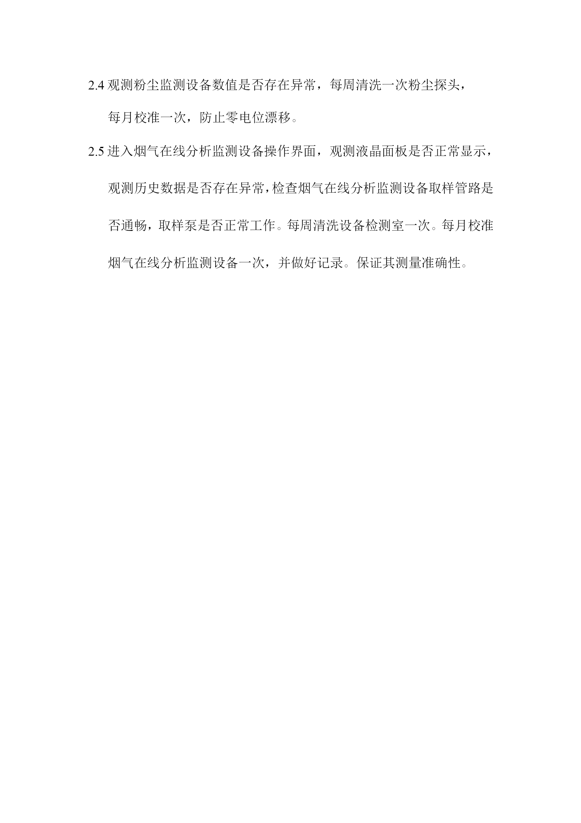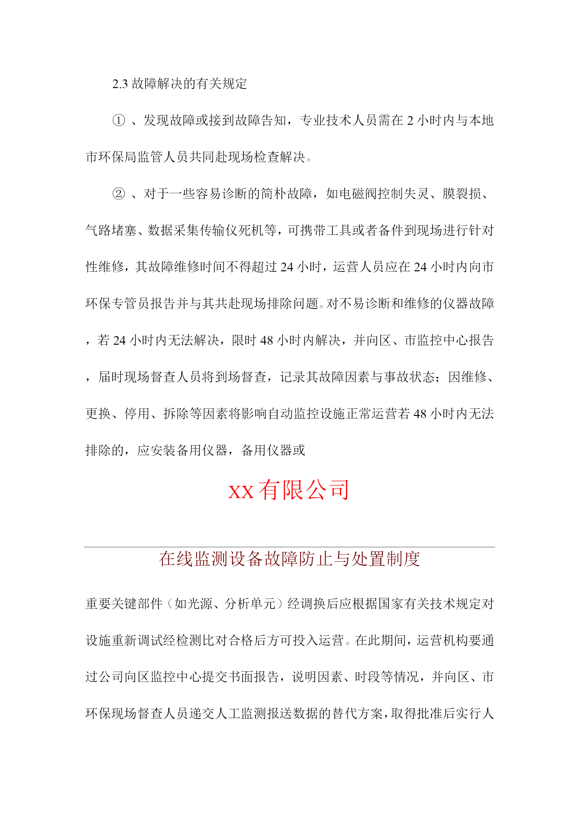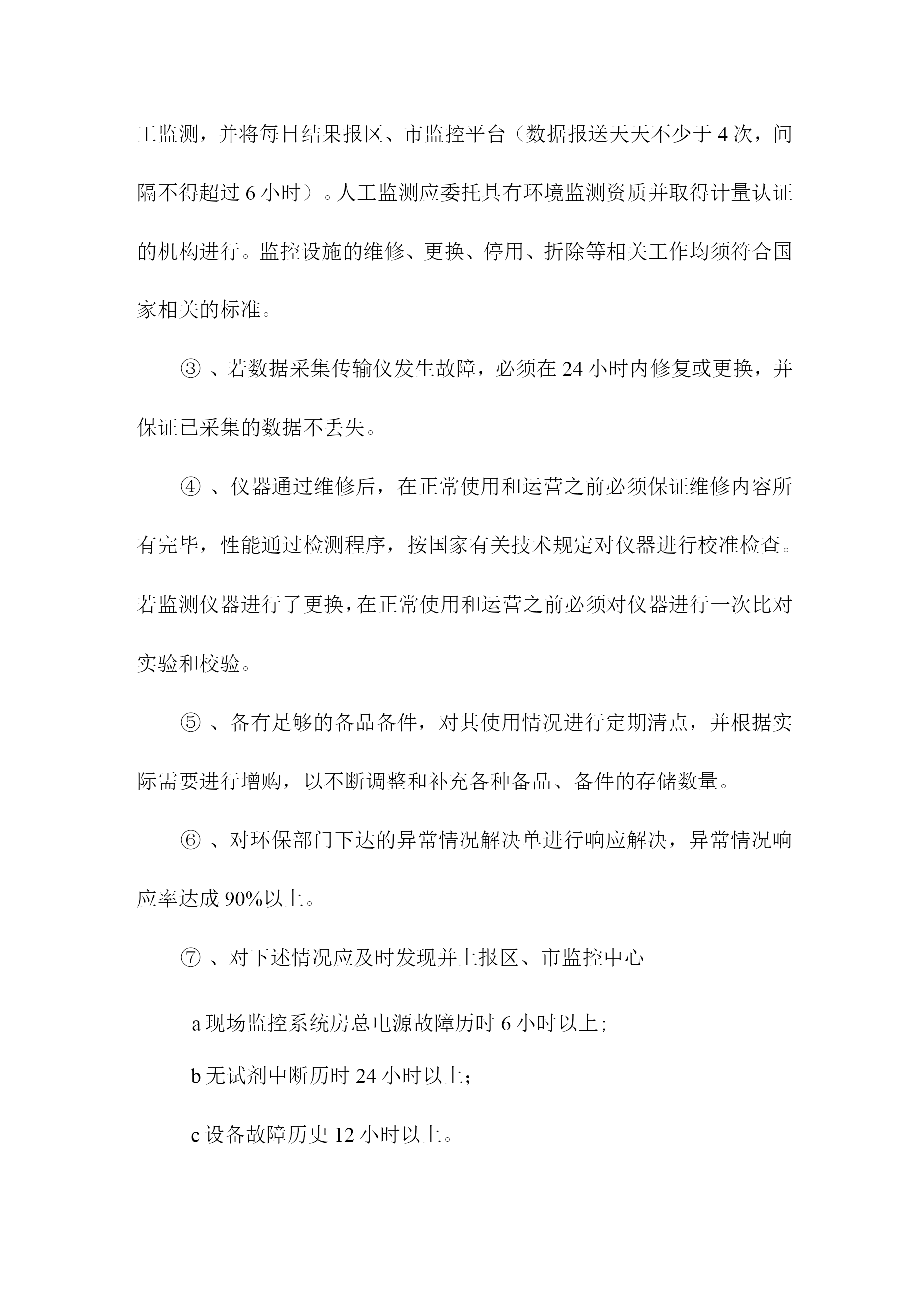 XX有限公司在线监测设备操作使用注意事项和维护规程1、在线监测设备操作使用注意事项1.1在线监测设备涉及数据采集传送仪,烟气在线监测测量仪等。1.2认真学习各种设备使用说明书,严格按照说明书上操作方法对相应设备进行操作。2、在线监测设备维护规程2.1在线监测设备精密仪器,工作环境温度介于00C至400C之间,检查监控房供电是否正常,空调运转是否正常,保证所有设备在抱负的工作环境下运营。2.2检查数采仪液晶面板是否正常显示,采集数据是否与监测设备一致,是否正常联网上传;检查任意时间段历史数据是否完整。2.3观测流量监测设备瞬时流量及累积流量值,检查采样探头是否有东西堵塞,每周清洗一次流量探头,保证流量测量的准确性。2.4观测粉尘监测设备数值是否存在异常,每周清洗一次粉尘探头,每月校准一次,防止零电位漂移。2.5进入烟气在线分析监测设备操作界面,观测液晶面板是否正常显示,观测历史数据是否存在异常,检查烟气在线分析监测设备取样管路是否通畅,取样泵是否正常工作。每周清洗设备检测室一次。每月校准烟气在线分析监测设备一次,并做好记录。保证其测量准确性。XX有限公司在线监测设备定期校验制度1、在线监测监控系统属于精密类监测仪器,定期的维护保养校准对设备的使用寿命和监测数据的准确性极为重要,本部分重要是为了制定相应的制度的质量记录,保证在线监测设备的正常运营工作。2、在线监测监控系统的定期核实验时间以仪器说明为准,由专人对不同功能的在线仪器进行校准,并对校准过程和结果进行记录。3、制定在线监测设备定期校准计划,并设专门负责人负责校准。4、校准专责人负责仪器仪表的定期校准,负责记录校准结果、记录系统是否可以正常工作,并将结果报告上极。5、每台在线监测仪器需要建立仪器运营监测结果台帐。6、新购入和修理后的仪器必须通过校准以保证其测量准确后方能使用。XX有限公司在线监测设备故障防止与处置制度1、在线监测设备设备故障防止制度严格按照岗位职责及相关制度,做好设备的平常巡检、平常维护保养、定期校准和校验等工作,如实记录现场条件变化,并对其带来的影响作出判断,保证设备的正常运营。2、设备故障处置制度2.1建立平常维护工作报告制度,如发现重大事故或仪器严重故障,应立即向区、市环境监控中心进行报告,说明因素、时段等情况,并递交人工监测报送数据的替代方案,获批准后实行。2.2故障解决的基本原则、先入后出;先高端后低端。、先重点后一般;先调通后修理,故障消除后立即复原。2.3故障解决的有关规定、发现故障或接到故障告知,专业技术人员需在2小时内与本地市环保局监管人员共同赴现场检查解决。、对于一些容易诊断的简朴故障,如电磁阀控制失灵、膜裂损、气路堵塞、数据采集传输仪死机等,可携带工具或者备件到现场进行针对性维修,其故障维修时间不得超过24小时,运营人员应在24小时内向市环保专管员报告并与其共赴现场排除问题。对不易诊断和维修的仪器故障,若24小时内无法解决,限时48小时内解决,并向区、市监控中心报告,届时现场督查人员将到场督查,记录其故障因素与事故状态;因维修、更换、停用、拆除等因素将影响自动监控设施正常运营若48小时内无法排除的,应安装备用仪器,备用仪器或XX有限公司在线监测设备故障防止与处置制度重要关键部件(如光源、分析单元)经调换后应根据国家有关技术规定对设施重新调试经检测比对合格后方可投入运营。在此期间,运营机构要通过公司向区监控中心提交书面报告,说明因素、时段等情况,并向区、市环保现场督查人员递交人工监测报送数据的替代方案,取得批准后实行人工监测,并将每日结果报区、市监控平台(数据报送天天不少于4次,间隔不得超过6小时)。人工监测应委托具有环境监测资质并取得计量认证的机构进行。监控设施的维修、更换、停用、折除等相关工作均须符合国家相关的标准。、若数据采集传输仪发生故障,必须在24小时内修复或更换,并保证已采集的数据不丢失。、仪器通过维修后,在正常使用和运营之前必须保证维修内容所有完毕,性能通过检测程序,按国家有关技术规定对仪器进行校准检查。若监测仪器进行了更换,在正常使用和运营之前必须对仪器进行一次比对实验和校验。、备有足够的备品备件,对其使用情况进行定期清点,并根据实际需要进行增购,以不断调整和补充各种备品、备件的存储数量。、对环保部门下达的异常情况解决单进行响应解决,异常情况响应率达成90%以上。、对下述情况应及时发现并上报区、市监控中心a现场监控系统房总电源故障历时6小时以上;b无试剂中断历时24小时以上;c设备故障历史12小时以上。、重大障碍解决完毕后,三日内写出书面专题报告,将故障的现象、因素、解决过程、经验、教训等上报区、市监控中心。XX有限公司在线监测设备操作