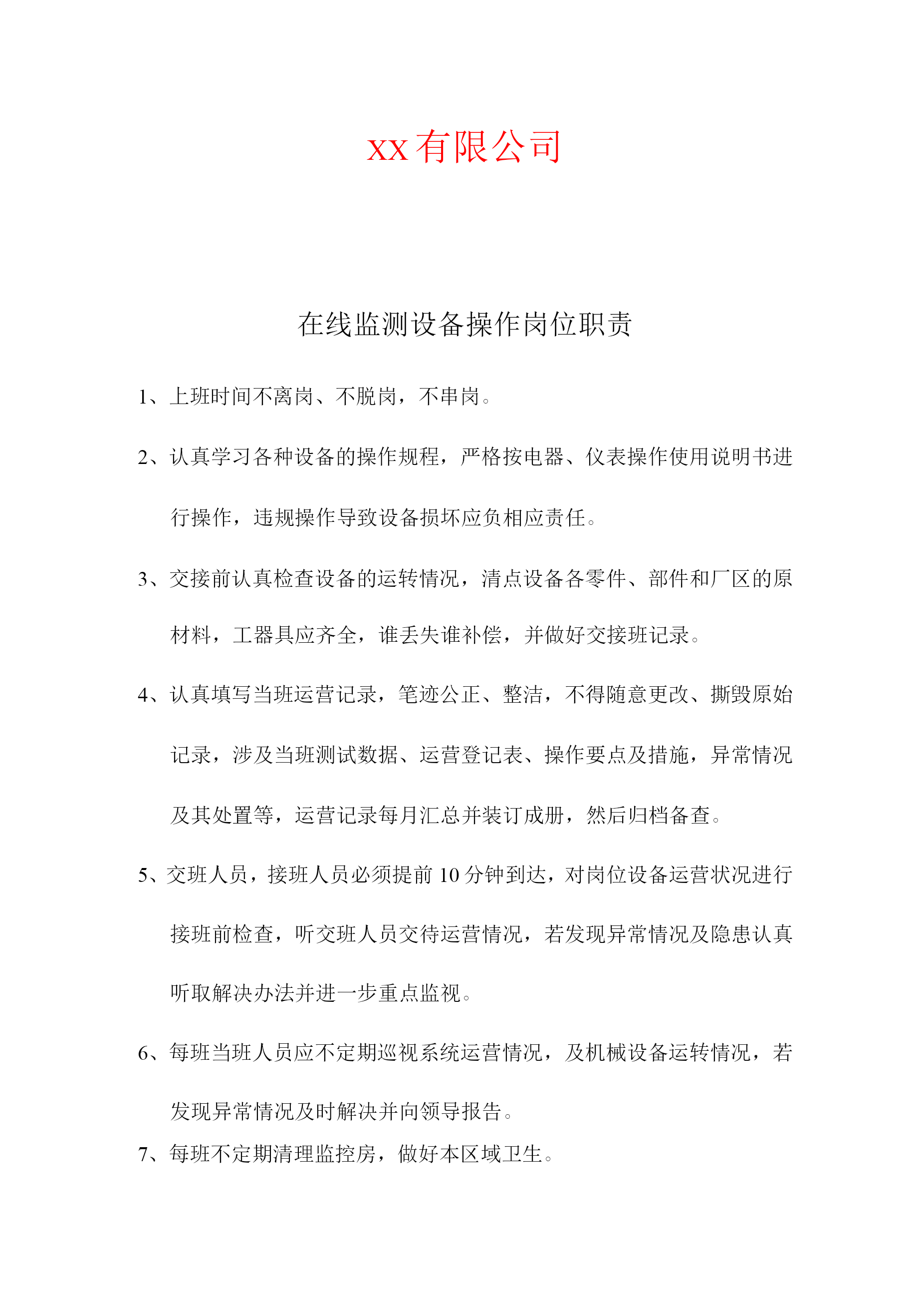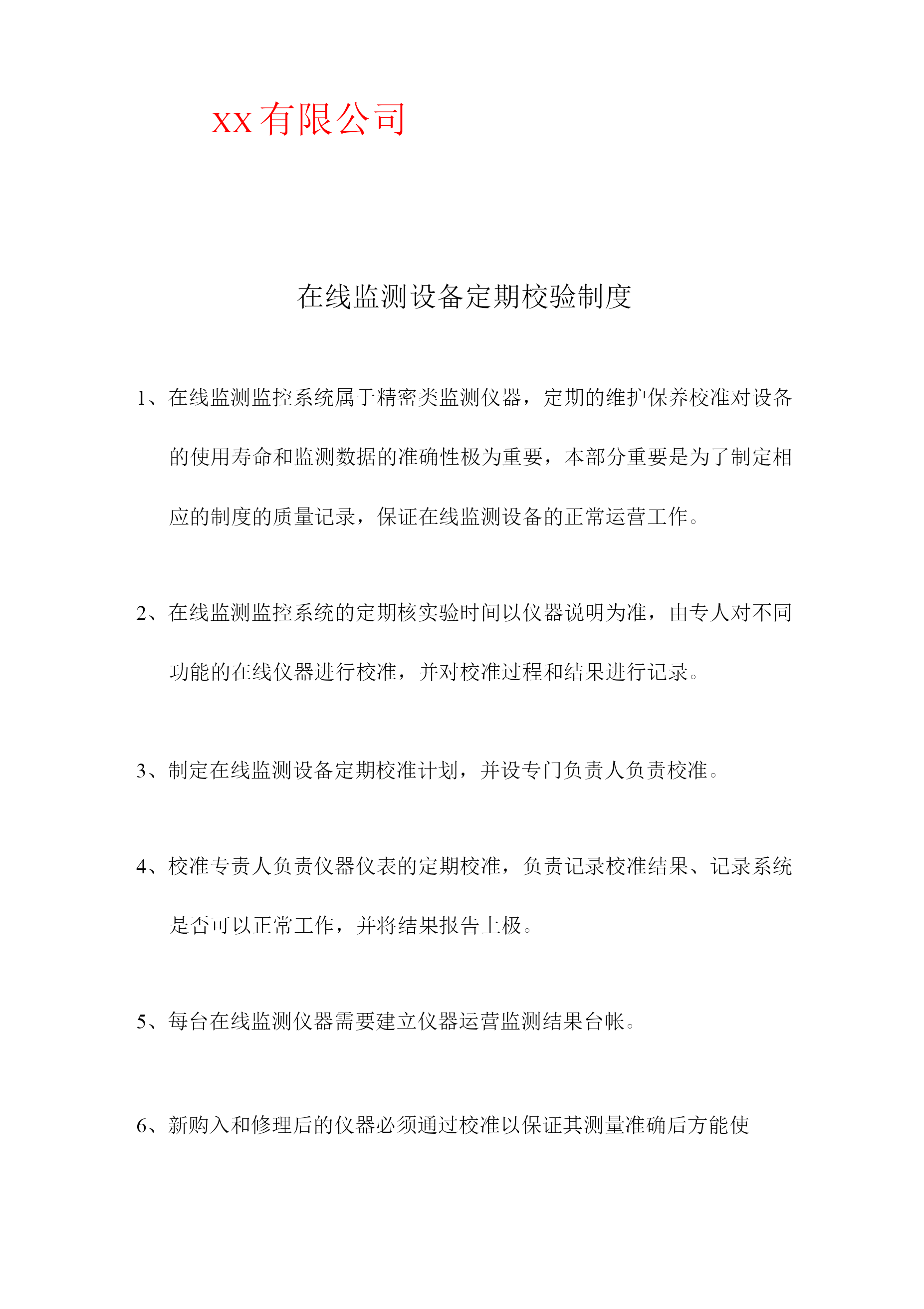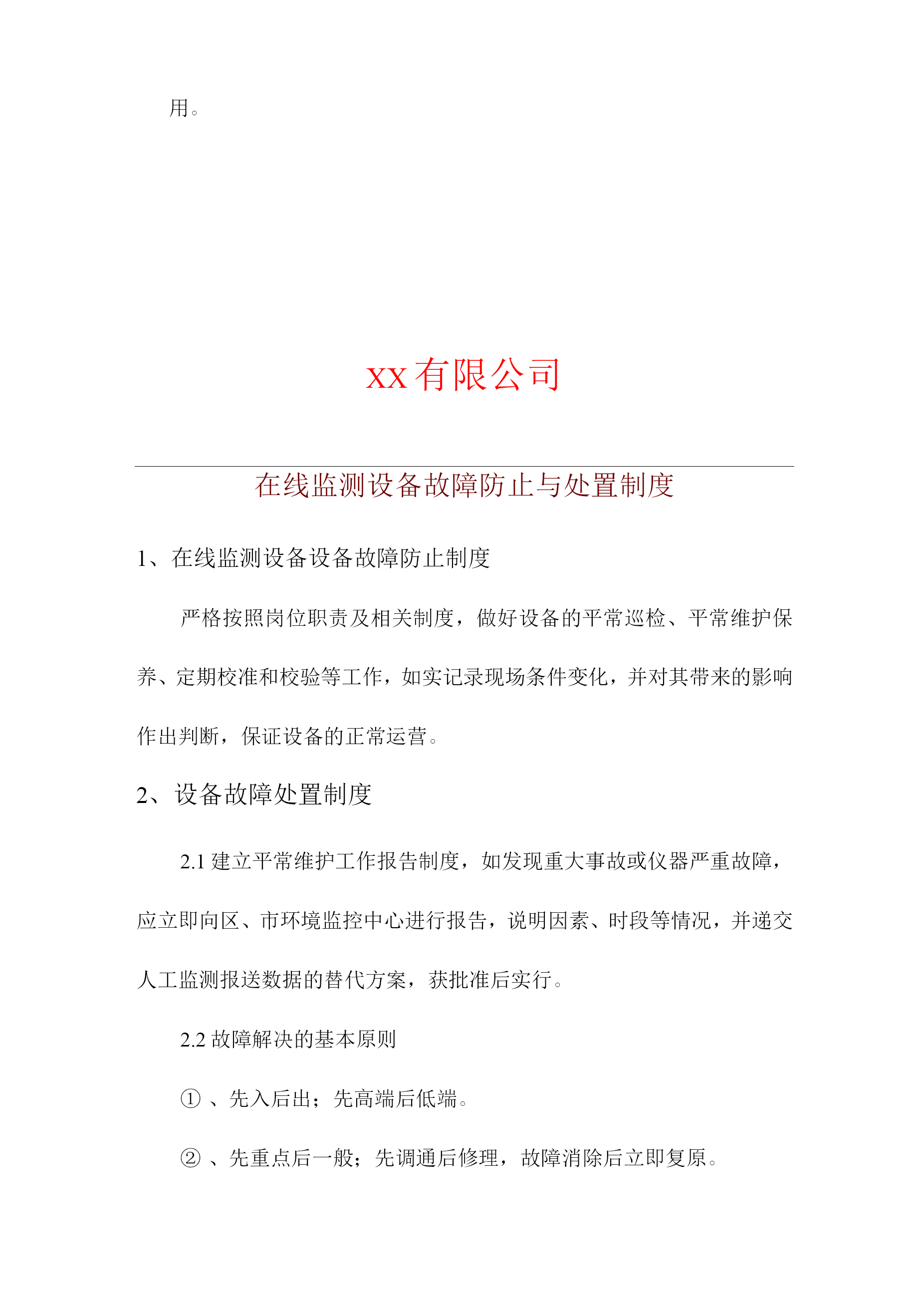XX有限公司在线监测设备操作使用注意事项和维护规程1、在线监测设备操作使用注意事项1.1在线监测设备涉及数据采集传送仪,烟气在线监测测量仪等。1.2认真学习各种设备使用说明书,严格按照说明书上操作方法对相应设备进行操作。2、在线监测设备维护规程2.1在线监测设备精密仪器,工作环境温度介于00C至400C之间,检查监控房供电是否正常,空调运转是否正常,保证所有设备在抱负的工作环境下运营。2.2检查数采仪液晶面板是否正常显示,采集数据是否与监测设备一致,是否正常联网上传;检查任意时间段历史数据是否完整。2.3观测流量监测设备瞬时流量及累积流量值,检查采样探头是否有东西堵塞,每周清洗一次流量探头,保证流量测量的准确性。2.4观测粉尘监测设备数值是否存在异常,每周清洗一次粉尘探头,每月校准一次,防止零电位漂移。2.5进入烟气在线分析监测设备操作界面,观测液晶面板是否正常显示,观测历史数据是否存在异常,检查烟气在线分析监测设备取样管路是否通畅,取样泵是否正常工作。每周清洗设备检测室一次。每月校准烟气在线分析监测设备一次,并做好记录。保证其测量准确性。XX有限公司在线监测设备定期校验制度1、在线监测监控系统属于精密类监测仪器,定期的维护保养校准对设备的使用寿命和监测数据的准确性极为重要,本部分重要是为了制定相应的制度的质量记录,保证在线监测设备的正常运营工作。2、在线监测监控系统的定期核实验时间以仪器说明为准,由专人对不同功能的在线仪器进行校准,并对校准过程和结果进行记录。3、制定在线监测设备定期校准计划,并设专门负责人负责校准。4、校准专责人负责仪器仪表的定期校准,负责记录校准结果、记录系统是否可以正常工作,并将结果报告上极。5、每台在线监测仪器需要建立仪器运营监测结果台帐。6、新购入和修理后的仪器必须通过校准以保证其测量准确后方能使用。XX有限公司在线监测设备故障防止与处置制度1、在线监测设备设备故障防止制度严格按照岗位职责及相关制度,做好设备的平常巡检、平常维护保养、定期校准和校验等工作,如实记录现场条件变化,并对其带来的影响作出判断,保证设备的正常运营。2、设备故障处置制度2.1建立平常维护工作报告制度,如发现重大事故或仪器严重故障,应立即向区、市环境监控中心进行报告,说明因素、时段等情况,并递交人工监测报送数据的替代方案,获批准后实行。2.2故障解决的基本原则、先入后出;先高端后低端。、先重点后一般;先调通后修理,故障消除后立即复原。2.3故障解决的有关规定、发现故障或接到故障告知,专业技术人员需在2小时内与本地市环保局监管人员共同赴现场检查解决。、对于一些容易诊断的简朴故障,如电磁阀控制失灵、膜裂损、气路堵塞、数据采集传输仪死机等,可携带工具或者备件到现场进行针对性维修,其故障维修时间不得超过24小时,运营人员应在24小时内向市环保专管员报告并与其共赴现场排除问题。对不易诊断和维修的仪器故障,若24小时内无法解决,限时48小时内解决,并向区、市监控中心报告,届时现场督查人员将到场督查,记录其故障因素与事故状态;因维修、更换、停用、拆除等因素将影响自动监控设施正常运营若48小时内无法排除的,应安装备用仪器,备用仪器或XX有限公司在线监测设备故障防止与处置制度重要关键部件(如光源、分析单元)经调换后应根据国家有关技术规定对设施重新调试经检测比对合格后方可投入运营。在此期间,运营机构要通过公司向区监控中心提交书面报告,说明因素、时段等情况,并向区、市环保现场督查人员递交人工监测报送数据的替代方案,取得批准后实行人工监测,并将每日结果报区、市监控平台(数据报送天天不少于4次,间隔不得超过6小时)。人工监测应委托具有环境监测资质并取得计量认证的机构进行。监控设施的维修、更换、停用、折除等相关工作均须符合国家相关的标准。、若数据采集传输仪发生故障,必须在24小时内修复或更换,并保证已采集的数据不丢失。、仪器通过维修后,在正常使用和运营之前必须保证维修内容所有完毕,性能通过检测程序,按国家有关技术规定对仪器进行校准检查。若监测仪器进行了更换,在正常使用和运营之前必须对仪器进行一次比对实验和校验。、备有足够的备品备件,对其使用情况进行定期清点,并根据实际需要进行增购,以不断调整和补充各种备品、备件的存储数量。、对环保部门下达的异常情况解决单进行响应解决,异常情况响应率达成90%以上。、对下述情况应及时发现并上报区、市监控中心a现场监控系统房总电源故障历时6小时以上;b无试剂中断历时24小时以上;c设备故障历史12小时以上。、重大障碍解决完毕后,三日内写出书面专题报告,将故障的现象、因素、解决过程、经验、教训等上报区、市监控中心。XX有限公司在线监测设备操作