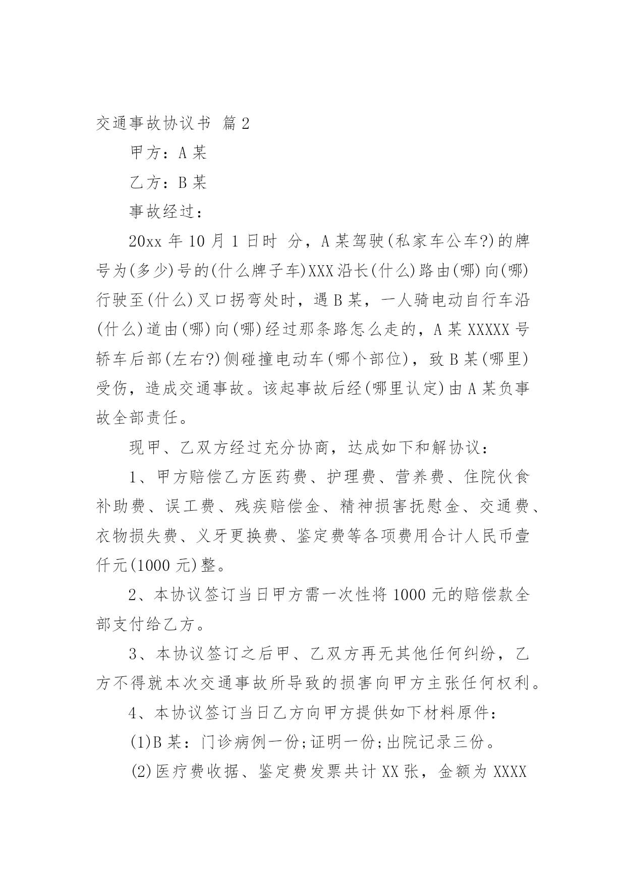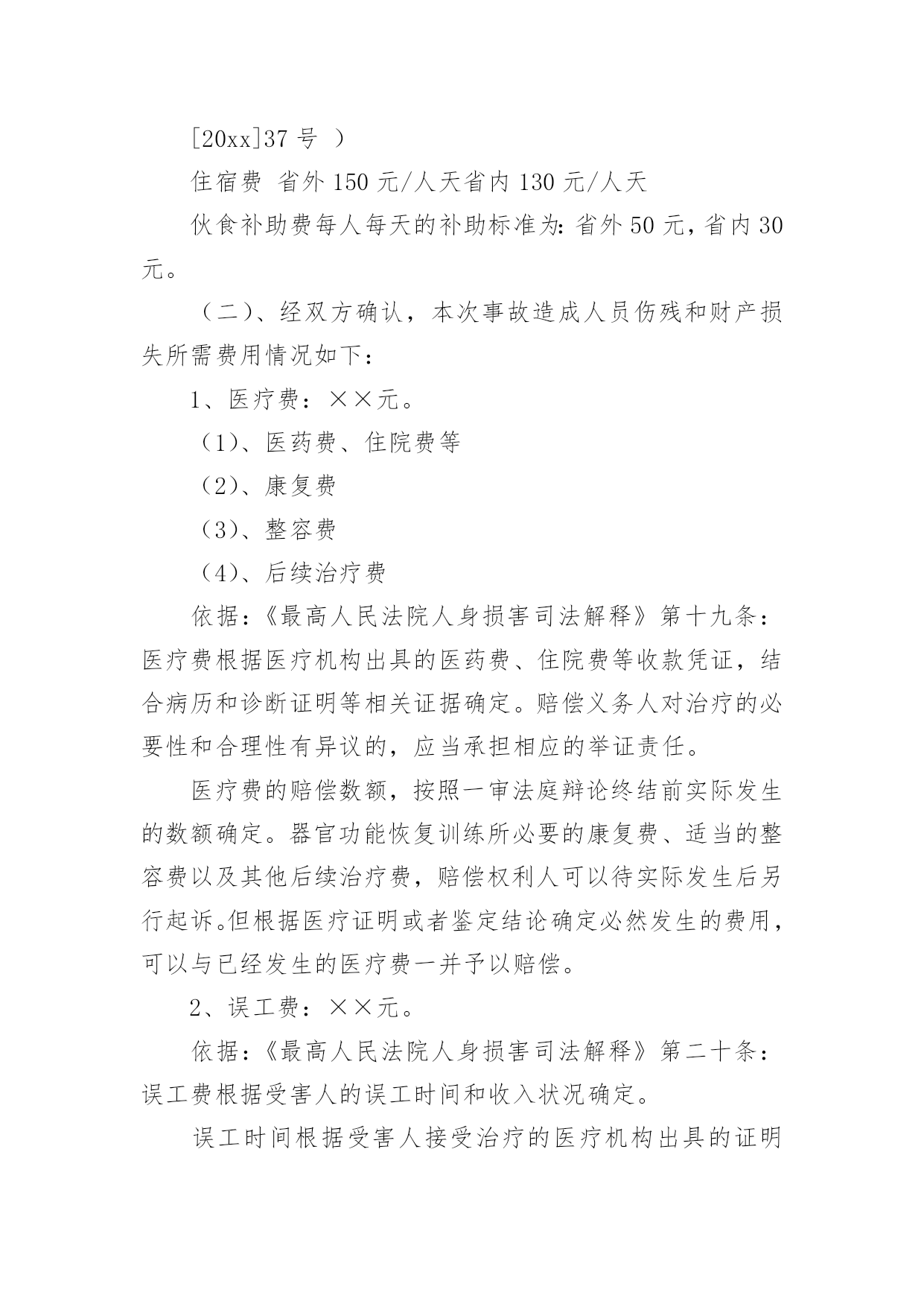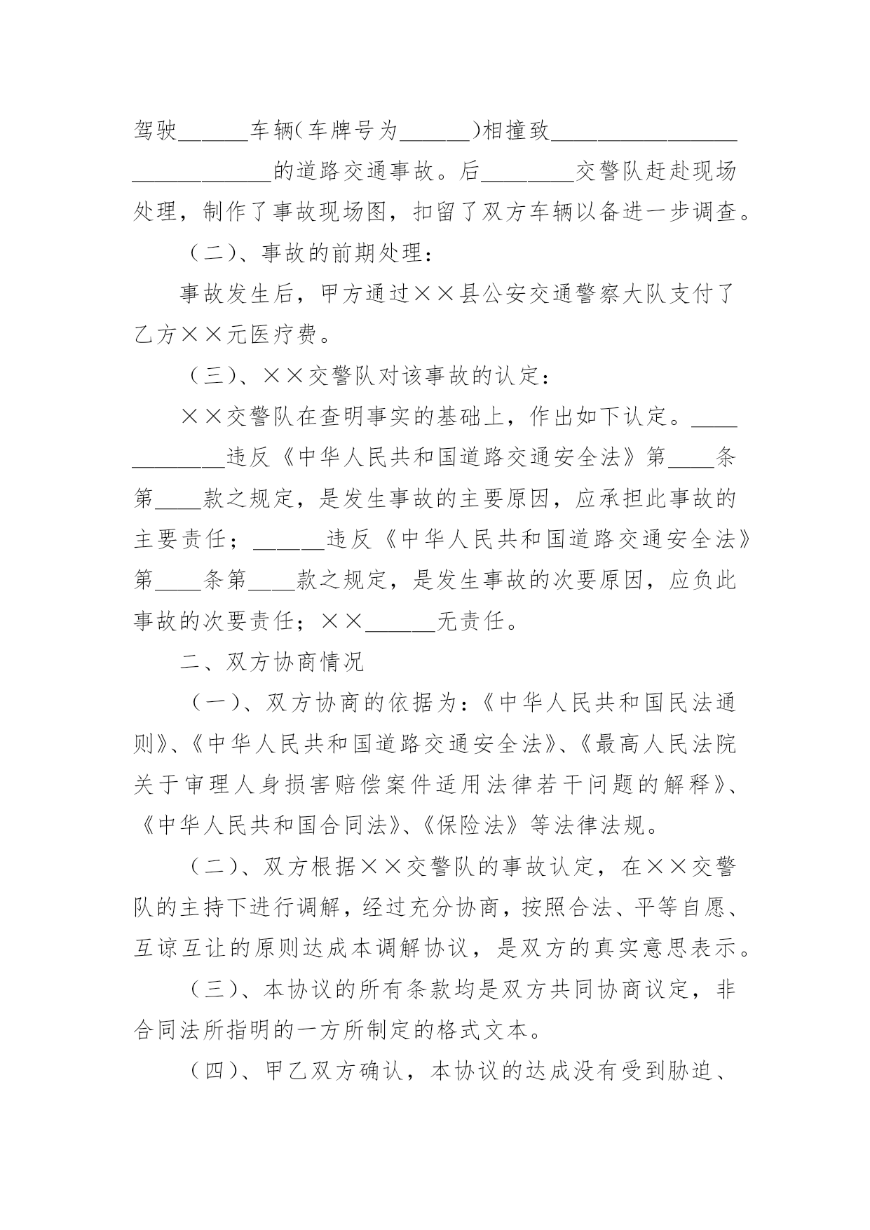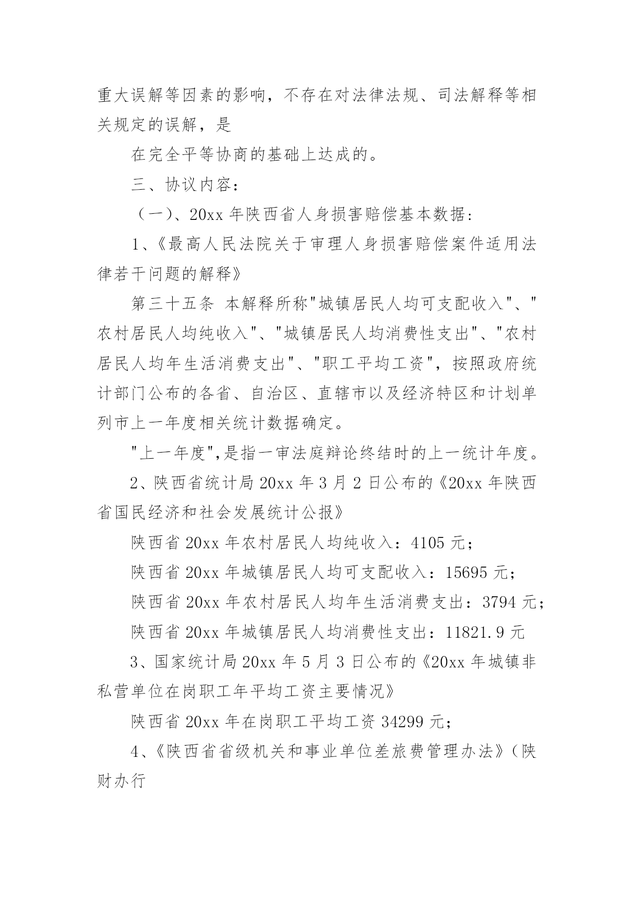 交通事故协议书精选交通事故协议书集锦8篇现如今,男女老少都可能需要用到协议,签订协议可以保障自身的权益不被侵害。一起来参考协议是怎么写的吧,下面是小编整理的交通事故协议书8篇,希望能够帮助到大家。交通事故协议书篇1甲方(肇事方):(自然人姓名、性别、年龄、民族、职业、单位或住址、身份证号、联系方式;法人及社会组织的名称、地址、法定代表人姓名和职务、联系人、联系方式)或(系驾驶员)或(系车主)或(系肇事方之×)甲方委托代理人:乙方(受害方):(自然人姓名、性别、年龄、民族、职业、单位或住址、身份证号、联系方式)或(系受害方之×)乙方委托代理人:丙方(调解方或见证方):××交警大队或(××人民调解委员会)一、交通事故基本情况(一)、事故经过:___年_月_日,发生了___驾驶___车辆(车牌号为___)在____________路段和___驾驶___车辆(车牌号为___)相撞致______________的道路交通事故。后____交警队赶赴现场处理,制作了事故现场图,扣留了双方车辆以备进一步调查。(二)、事故的前期处理:事故发生后,甲方通过××县公安交通警察大队支付了乙方××元医疗费。(三)、××交警队对该事故的认定:××交警队在查明事实的基础上,作出如下认定。______违反《中华人民共和国道路交通安全法》第__条第__款之规定,是发生事故的主要原因,应承担此事故的主要责任;___违反《中华人民共和国道路交通安全法》第__条第__款之规定,是发生事故的次要原因,应负此事故的次要责任;××___无责任。二、双方协商情况(一)、双方协商的依据为:《中华人民共和国民法通则》、《中华人民共和国道路交通安全法》、《最高人民法院关于审理人身损害赔偿案件适用法律若干问题的解释》、《中华人民共和国合同法》、《保险法》等法律法规。(二)、双方根据××交警队的事故认定,在××交警队的主持下进行调解,经过充分协商,按照合法、平等自愿、互谅互让的原则达成本调解协议,是双方的真实意思表示。(三)、本协议的所有条款均是双方共同协商议定,非合同法所指明的一方所制定的格式文本。(四)、甲乙双方确认,本协议的达成没有受到胁迫、重大误解等因素的影响,不存在对法律法规、司法解释等相关规定的误解,是在完全平等协商的基础上达成的。三、协议内容:(一)、20xx年陕西省人身损害赔偿基本数据:1、《最高人民法院关于审理人身损害赔偿案件适用法律若干问题的解释》第三十五条本解释所称"城镇居民人均可支配收入"、"农村居民人均纯收入"、"城镇居民人均消费性支出"、"农村居民人均年生活消费支出"、"职工平均工资",按照政府统计部门公布的各省、自治区、直辖市以及经济特区和计划单列市上一年度相关统计数据确定。"上一年度",是指一审法庭辩论终结时的上一统计年度。2、陕西省统计局20xx年3月2日公布的《20xx年陕西省国民经济和社会发展统计公报》陕西省20xx年农村居民人均纯收入:4105元;陕西省20xx年城镇居民人均可支配收入:15695元;陕西省20xx年农村居民人均年生活消费支出:3794元;陕西省20xx年城镇居民人均消费性支出:11821.9元3、国家统计局20xx年5月3日公布的《20xx年城镇非私营单位在岗职工年平均工资主要情况》陕西省20xx年在岗职工平均工资34299元;4、《陕西省省级机关和事业单位差旅费管理办法》(陕财办行[20xx]37号)住宿费省外150元/人天省内130元/人天伙食补助费每人每天的补助标准为:省外50元,省内30元。(二)、经双方确认,本次事故造成人员伤残和财产损失所需费用情况如下:1、医疗费:××元。(1)、医药费、住院费等(2)、康复费(3)、整容费(4)、后续治疗费依据:《最高人民法院人身损害司法解释》第十九条:医疗费根据医疗机构出具的医药费、住院费等收款凭证,结合病历和诊断证明等相关证据确定。赔偿义务人对治疗的必要性和合理性有异议的,应当承担相应的举证责任。医疗费的赔偿数额,按照一审法庭辩论终结前实际发生的数额确定。器官功能恢复训练所必要的康复费、适当的整容费以及其他后续治疗费,赔偿权利人可以待实际发生后另行起诉。但根据医疗证明或者鉴定结论确定必然发生的费用,可以与已经发生的医疗费一并予以赔偿。2、误工费:××元。依据:《最高人民法院人身损害司法解释》第二十条:误工费根据受害人的误工时间和收入状况确定。误工时间根据受害人接受治疗的医疗机构出具的证明确定。受害人因伤致残持续误工的,误工时间可以计算至定残日前一天。受害人有固定收入的,误工费按照实际减少的收入计算。受害人无固定收入的,按照其最近三年的平均收入计算;受害人不能举证证明其最近三年的平均收入状况的,可以参照受诉法院所在地相同或者相近行业上一年度职工的平均工资计算。3、护理费:×