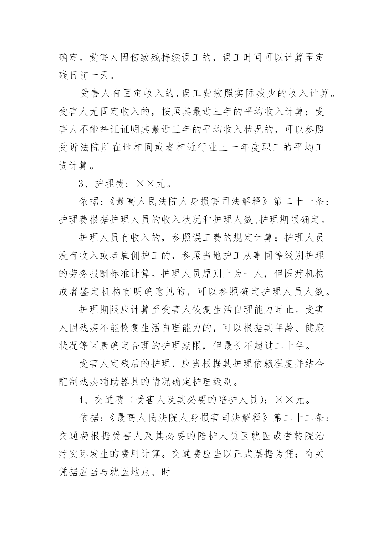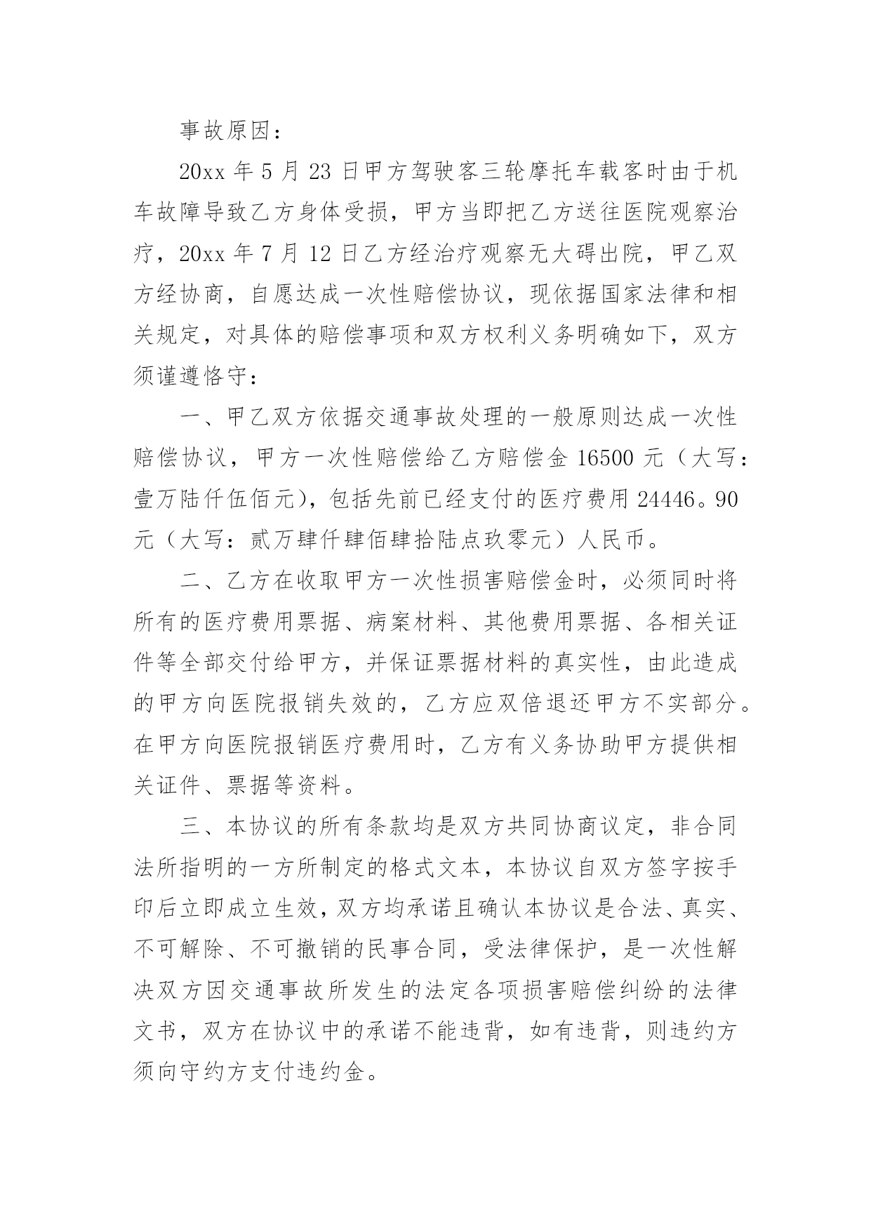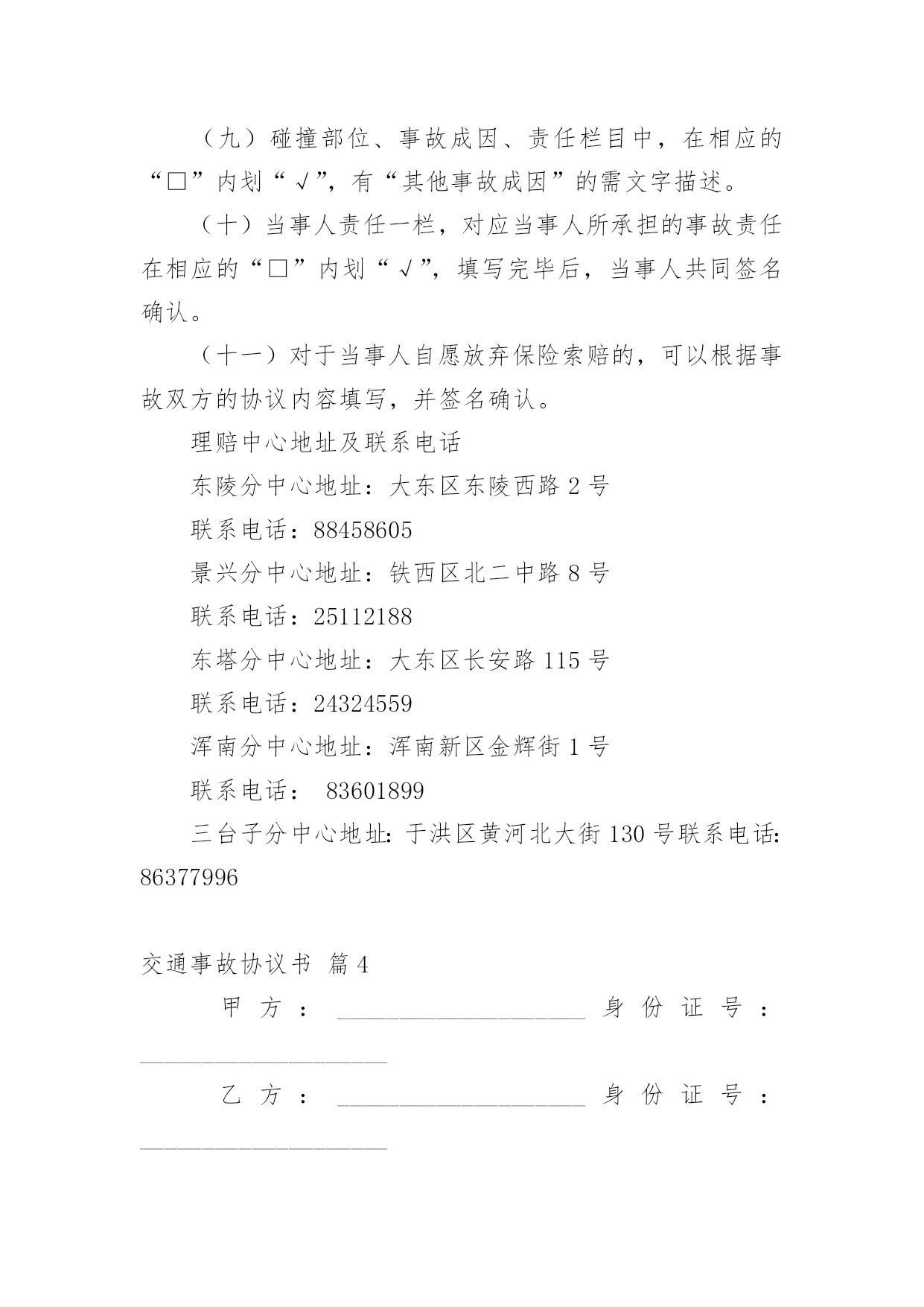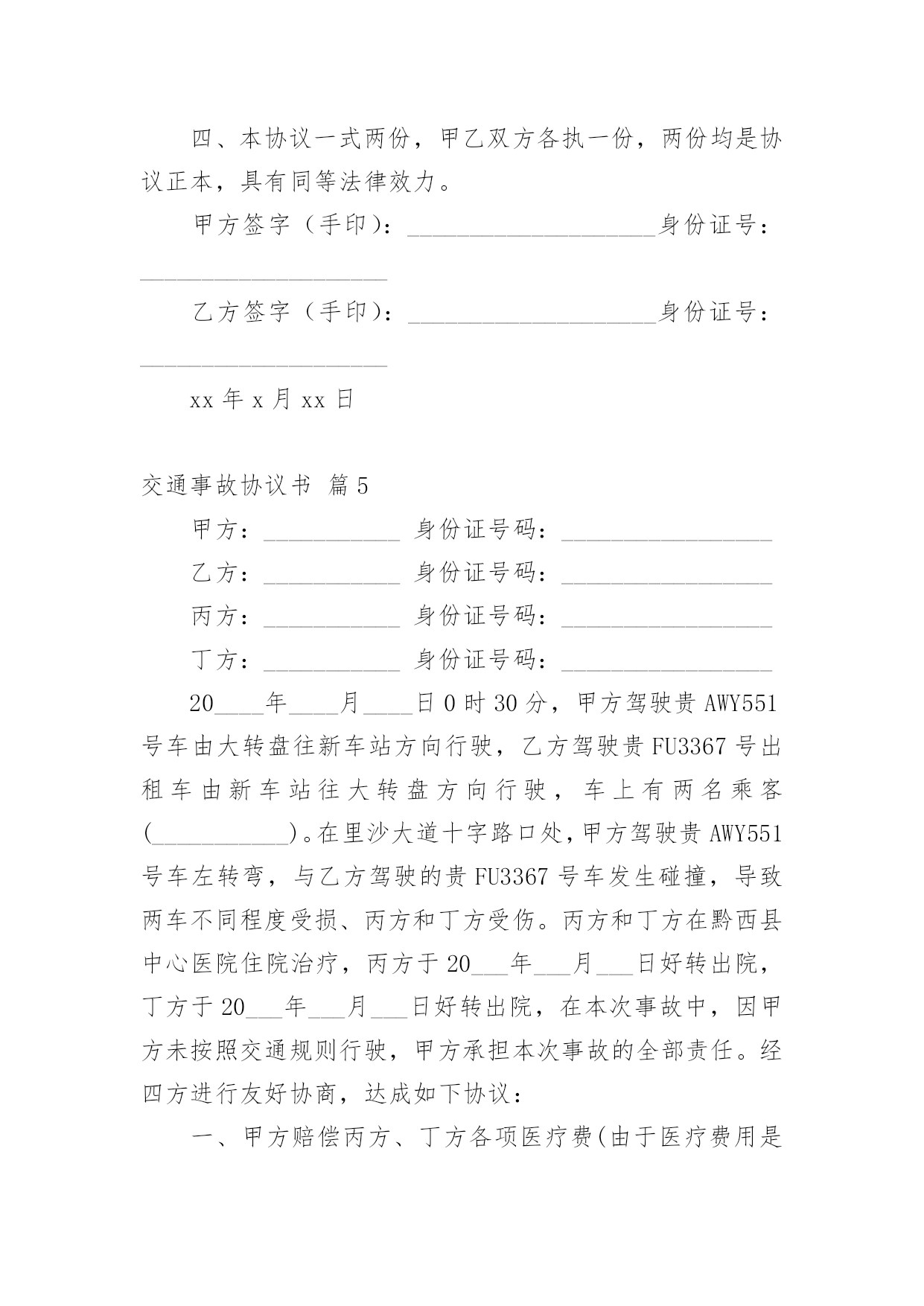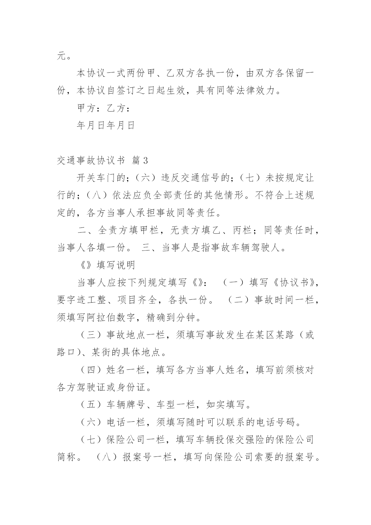 交通事故协议书精选交通事故协议书集锦8篇现如今,男女老少都可能需要用到协议,签订协议可以保障自身的权益不被侵害。一起来参考协议是怎么写的吧,下面是小编整理的交通事故协议书8篇,希望能够帮助到大家。交通事故协议书篇1甲方(肇事方):(自然人姓名、性别、年龄、民族、职业、单位或住址、身份证号、联系方式;法人及社会组织的名称、地址、法定代表人姓名和职务、联系人、联系方式)或(系驾驶员)或(系车主)或(系肇事方之×)甲方委托代理人:乙方(受害方):(自然人姓名、性别、年龄、民族、职业、单位或住址、身份证号、联系方式)或(系受害方之×)乙方委托代理人:丙方(调解方或见证方):××交警大队或(××人民调解委员会)一、交通事故基本情况(一)、事故经过:___年_月_日,发生了___驾驶___车辆(车牌号为___)在____________路段和___驾驶___车辆(车牌号为___)相撞致______________的道路交通事故。后____交警队赶赴现场处理,制作了事故现场图,扣留了双方车辆以备进一步调查。(二)、事故的前期处理:事故发生后,甲方通过××县公安交通警察大队支付了乙方××元医疗费。(三)、××交警队对该事故的认定:××交警队在查明事实的基础上,作出如下认定。______违反《中华人民共和国道路交通安全法》第__条第__款之规定,是发生事故的主要原因,应承担此事故的主要责任;___违反《中华人民共和国道路交通安全法》第__条第__款之规定,是发生事故的次要原因,应负此事故的次要责任;××___无责任。二、双方协商情况(一)、双方协商的依据为:《中华人民共和国民法通则》、《中华人民共和国道路交通安全法》、《最高人民法院关于审理人身损害赔偿案件适用法律若干问题的解释》、《中华人民共和国合同法》、《保险法》等法律法规。(二)、双方根据××交警队的事故认定,在××交警队的主持下进行调解,经过充分协商,按照合法、平等自愿、互谅互让的原则达成本调解协议,是双方的真实意思表示。(三)、本协议的所有条款均是双方共同协商议定,非合同法所指明的一方所制定的格式文本。(四)、甲乙双方确认,本协议的达成没有受到胁迫、重大误解等因素的影响,不存在对法律法规、司法解释等相关规定的误解,是在完全平等协商的基础上达成的。三、协议内容:(一)、20xx年陕西省人身损害赔偿基本数据:1、《最高人民法院关于审理人身损害赔偿案件适用法律若干问题的解释》第三十五条本解释所称"城镇居民人均可支配收入"、"农村居民人均纯收入"、"城镇居民人均消费性支出"、"农村居民人均年生活消费支出"、"职工平均工资",按照政府统计部门公布的各省、自治区、直辖市以及经济特区和计划单列市上一年度相关统计数据确定。"上一年度",是指一审法庭辩论终结时的上一统计年度。2、陕西省统计局20xx年3月2日公布的《20xx年陕西省国民经济和社会发展统计公报》陕西省20xx年农村居民人均纯收入:4105元;陕西省20xx年城镇居民人均可支配收入:15695元;陕西省20xx年农村居民人均年生活消费支出:3794元;陕西省20xx年城镇居民人均消费性支出:11821.9元3、国家统计局20xx年5月3日公布的《20xx年城镇非私营单位在岗职工年平均工资主要情况》陕西省20xx年在岗职工平均工资34299元;4、《陕西省省级机关和事业单位差旅费管理办法》(陕财办行[20xx]37号)住宿费省外150元/人天省内130元/人天伙食补助费每人每天的补助标准为:省外50元,省内30元。(二)、经双方确认,本次事故造成人员伤残和财产损失所需费用情况如下:1、医疗费:××元。(1)、医药费、住院费等(2)、康复费(3)、整容费(4)、后续治疗费依据:《最高人民法院人身损害司法解释》第十九条:医疗费根据医疗机构出具的医药费、住院费等收款凭证,结合病历和诊断证明等相关证据确定。赔偿义务人对治疗的必要性和合理性有异议的,应当承担相应的举证责任。医疗费的赔偿数额,按照一审法庭辩论终结前实际发生的数额确定。器官功能恢复训练所必要的康复费、适当的整容费以及其他后续治疗费,赔偿权利人可以待实际发生后另行起诉。但根据医疗证明或者鉴定结论确定必然发生的费用,可以与已经发生的医疗费一并予以赔偿。2、误工费:××元。依据:《最高人民法院人身损害司法解释》第二十条:误工费根据受害人的误工时间和收入状况确定。误工时间根据受害人接受治疗的医疗机构出具的证明确定。受害人因伤致残持续误工的,误工时间可以计算至定残日前一天。受害人有固定收入的,误工费按照实际减少的收入计算。受害人无固定收入的,按照其最近三年的平均收入计算;受害人不能举证证明其最近三年的平均收入状况的,可以参照受诉法院所在地相同或者相近行业上一年度职工的平均工资计算。3、护理费:×