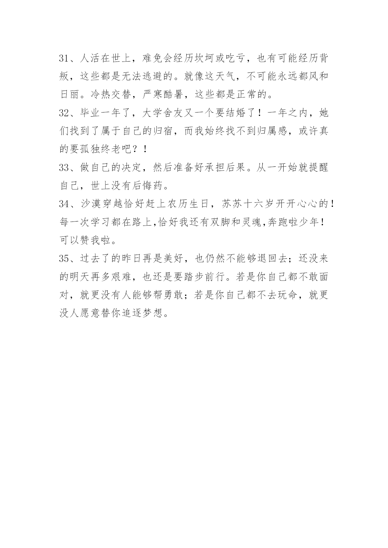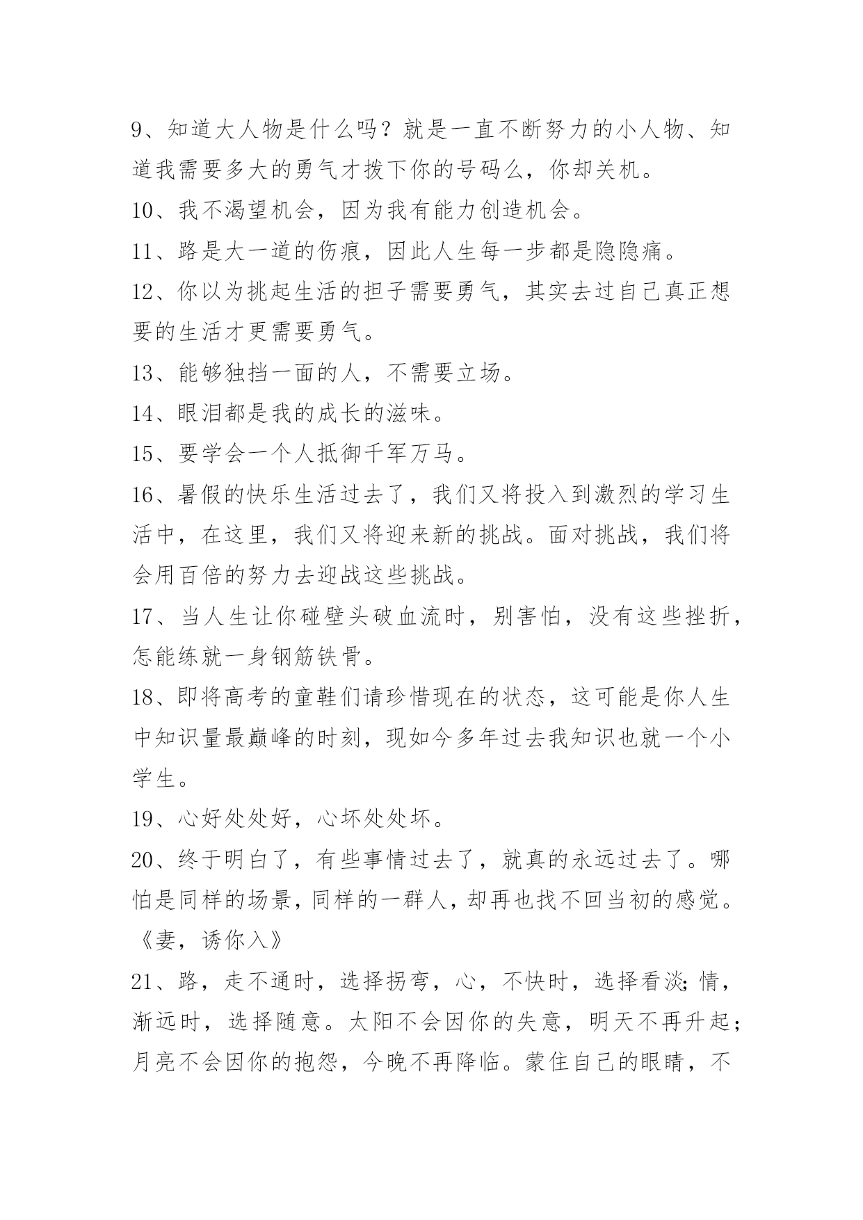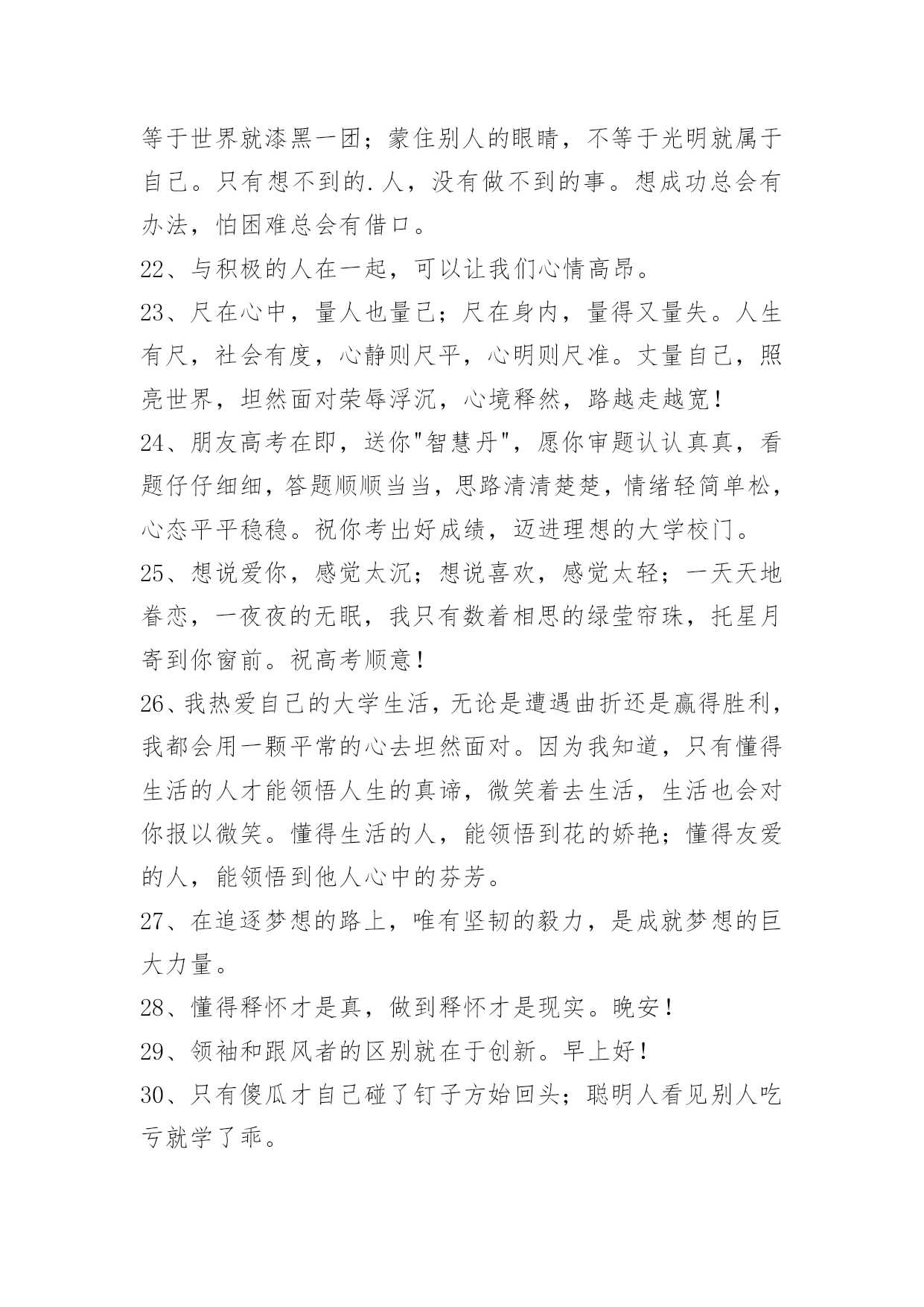 常用励志名句35条2022年常用励志名句35条热爱生活,坚持学习,不断提升,学会理解,学会宽容,学会感恩,一直美丽优雅到老。以下是关于励志名句35条,欢迎参考。1、青春,是一个人的生命聚光点。青春的调色板上,应该涂满汗水和心血;青春的旋律,不光委婉动听,而且应该刚劲有力。2、人生交往,多想我能为他人做什么,越做关系越好;与人交往,只想他人能为我做什么,越想关系越差。3、给予希望的人,一样能破灭所有的努力。4、坚持喝红糖水,泡玫瑰花茶,大姨妈颜色好多了不会有血块。5、爱情你激发了我的斗志,风雨你逼迫了我的坚强。6、眼晴能看到的地方叫视力,眼睛看不到的地方叫眼光,视力只能说明眼前,眼光却能看到未来。没有目标的人,永远为有目标的人打工。我们这一辈子不是别人的楷模,就是别人的借鉴。7、我知道幸福就在路上,只要带上全部的执着与坚强,就能无限地接近梦想。8、成功实在很简略,就是当你坚持不住的时候,再保持一下。9、知道大人物是什么吗?就是一直不断努力的小人物、知道我需要多大的勇气才拨下你的号码么,你却关机。10、我不渴望机会,因为我有能力创造机会。11、路是大一道的伤痕,因此人生每一步都是隐隐痛。12、你以为挑起生活的担子需要勇气,其实去过自己真正想要的生活才更需要勇气。13、能够独挡一面的人,不需要立场。14、眼泪都是我的成长的滋味。15、要学会一个人抵御千军万马。16、暑假的快乐生活过去了,我们又将投入到激烈的学习生活中,在这里,我们又将迎来新的挑战。面对挑战,我们将会用百倍的努力去迎战这些挑战。17、当人生让你碰壁头破血流时,别害怕,没有这些挫折,怎能练就一身钢筋铁骨。18、即将高考的童鞋们请珍惜现在的状态,这可能是你人生中知识量最巅峰的时刻,现如今多年过去我知识也就一个小学生。19、心好处处好,心坏处处坏。20、终于明白了,有些事情过去了,就真的永远过去了。哪怕是同样的场景,同样的一群人,却再也找不回当初的感觉。《妻,诱你入》21、路,走不通时,选择拐弯,心,不快时,选择看淡;情,渐远时,选择随意。太阳不会因你的失意,明天不再升起;月亮不会因你的抱怨,今晚不再降临。蒙住自己的眼睛,不等于世界就漆黑一团;蒙住别人的眼睛,不等于光明就属于自己。只有想不到的.人,没有做不到的事。想成功总会有办法,怕困难总会有借口。22、与积极的人在一起,可以让我们心情高昂。23、尺在心中,量人也量己;尺在身内,量得又量失。人生有尺,社会有度,心静则尺平,心明则尺准。丈量自己,照亮世界,坦然面对荣辱浮沉,心境释然,路越走越宽!24、朋友高考在即,送你"智慧丹",愿你审题认认真真,看题仔仔细细,答题顺顺当当,思路清清楚楚,情绪轻简单松,心态平平稳稳。祝你考出好成绩,迈进理想的大学校门。25、想说爱你,感觉太沉;想说喜欢,感觉太轻;一天天地眷恋,一夜夜的无眠,我只有数着相思的绿莹帘珠,托星月寄到你窗前。祝高考顺意!26、我热爱自己的大学生活,无论是遭遇曲折还是赢得胜利,我都会用一颗平常的心去坦然面对。因为我知道,只有懂得生活的人才能领悟人生的真谛,微笑着去生活,生活也会对你报以微笑。懂得生活的人,能领悟到花的娇艳;懂得友爱的人,能领悟到他人心中的芬芳。27、在追逐梦想的路上,唯有坚韧的毅力,是成就梦想的巨大力量。28、懂得释怀才是真,做到释怀才是现实。晚安!29、领袖和跟风者的区别就在于创新。早上好!30、只有傻瓜才自己碰了钉子方始回头;聪明人看见别人吃亏就学了乖。31、人活在世上,难免会经历坎坷或吃亏,也有可能经历背叛,这些都是无法逃避的。就像这天气,不可能永远都风和日丽。冷热交替,严寒酷暑,这些都是正常的。32、毕业一年了,大学舍友又一个要结婚了!一年之内,她们找到了属于自己的归宿,而我始终找不到归属感,或许真的要孤独终老吧?!33、做自己的决定,然后准备好承担后果。从一开始就提醒自己,世上没有后悔药。34、沙漠穿越恰好赶上农历生日,苏苏十六岁开开心心的!每一次学习都在路上,恰好我还有双脚和灵魂,奔跑啦少年!可以赞我啦。35、过去了的昨日再是美好,也仍然不能够退回去;还没来的明天再多艰难,也还是要踏步前行。若是你自己都不敢面对,就更没有人能够帮勇敢;若是你自己都不去玩命,就更没人愿意替你追逐梦想。