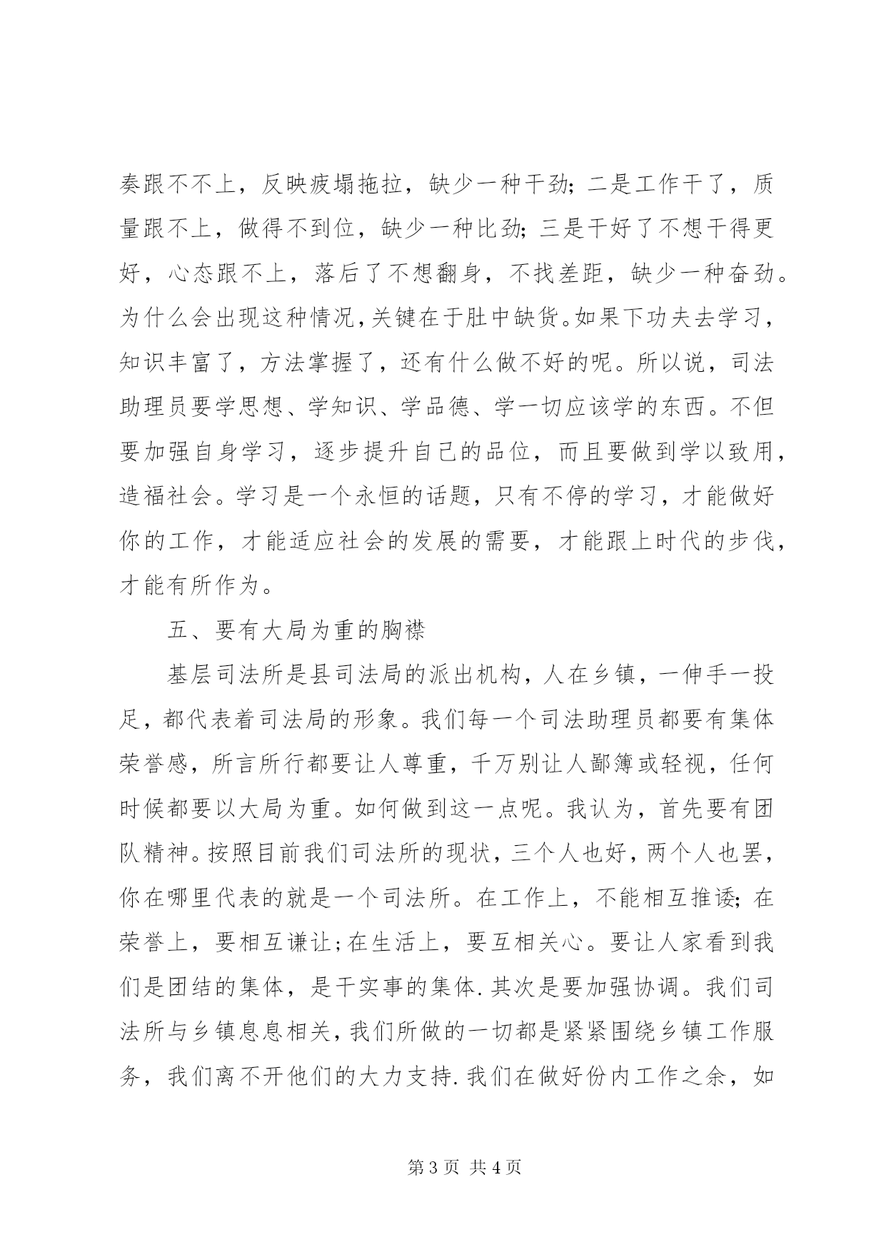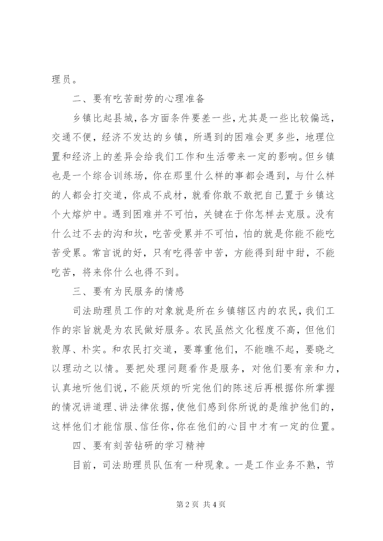 第PAGE\*Arabic\*MERGEFORMAT4页共NUMPAGES\*MERGEFORMAT4页司法助理员工作经验交流材料编者按:本文主要从要正确地进行自我定位;要有吃苦耐劳的心理准备;要有为民服务的情感;要有刻苦钻研的学习精神;要有大局为重的胸襟进行讲述。其中,主要包括:要按照《省司法所工作暂行规定》做好司法所承担的九项工作职能、遇到困难并不可怕,关键在于你怎样去克服。没有什么过不去的沟和坎,吃苦受累并不可怕,怕的就是你能不能吃苦受累、和农民打交道,要尊重他们,不能瞧不起,要晓之以理动之以情、要学思想、学知识、学品德、学一切应该学的东西、要加强自身学习,逐步提升自己的品位,而且要做到学以致用,造福社会、要有集体荣誉感,所言所行都要让人尊重,千万别让人鄙簿或轻视,任何时候都要以大局为重等,具体材料请详见:我做为一名乡镇司法助理员,通过一年多的工作时间,积累了一定的工作经验,我认为想要做一名合格的司法助理员,应该最起码要具备五个方面的素质。一、要正确地进行自我定位司法助理员岗位在各镇的司法所,也就是说,人在乡镇,工作在乡镇,所办的事也是乡镇的事。司法助理员要按照《省司法所工作暂行规定》做好司法所承担的九项工作职能,从这些职能可以看出,司法所的主要职责就是围绕乡镇的稳定工作开展,而这些工作的开展和落实完成,承载的主体是谁,就是我们司法助理员。二、要有吃苦耐劳的心理准备乡镇比起县城,各方面条件要差一些,尤其是一些比较偏远,交通不便,经济不发达的乡镇,所遇到的困难会更多些,地理位置和经济上的差异会给我们工作和生活带来一定的影响。但乡镇也是一个综合训练场,你在那里什么样的事都会遇到,与什么样的人都会打交道,你成不成材,就看你敢不敢把自己置于乡镇这个大熔炉中。遇到困难并不可怕,关键在于你怎样去克服。没有什么过不去的沟和坎,吃苦受累并不可怕,怕的就是你能不能吃苦受累。常言说的好,只有吃得苦中苦,方能得到甜中甜,不能吃苦,将来你什么也得不到。三、要有为民服务的情感司法助理员工作的对象就是所在乡镇辖区内的农民,我们工作的宗旨就是为农民做好服务。农民虽然文化程度不高,但他们敦厚、朴实。和农民打交道,要尊重他们,不能瞧不起,要晓之以理动之以情。要把处理问题看作是服务,对他们要有亲和力,认真地听他们说,不能厌烦的听完他们的陈述后再根据你所掌握的情况讲道理、讲法律依据,使他们感到你所说的是维护他们的,这样他们才能信服、信任你,你在他们的心目中才有一定的位置。四、要有刻苦钻研的学习精神目前,司法助理员队伍有一种现象。一是工作业务不熟,节奏跟不不上,反映疲塌拖拉,缺少一种干劲;二是工作干了,质量跟不上,做得不到位,缺少一种比劲;三是干好了不想干得更好,心态跟不上,落后了不想翻身,不找差距,缺少一种奋劲。为什么会出现这种情况,关键在于肚中缺货。如果下功夫去学习,知识丰富了,方法掌握了,还有什么做不好的呢。所以说,司法助理员要学思想、学知识、学品德、学一切应该学的东西。不但要加强自身学习,逐步提升自己的品位,而且要做到学以致用,造福社会。学习是一个永恒的话题,只有不停的学习,才能做好你的工作,才能适应社会的发展的需要,才能跟上时代的步伐,才能有所作为。五、要有大局为重的胸襟基层司法所是县司法局的派出机构,人在乡镇,一伸手一投足,都代表着司法局的形象。我们每一个司法助理员都要有集体荣誉感,所言所行都要让人尊重,千万别让人鄙簿或轻视,任何时候都要以大局为重。如何做到这一点呢。我认为,首先要有团队精神。按照目前我们司法所的现状,三个人也好,两个人也罢,你在哪里代表的就是一个司法所。在工作上,不能相互推诿;在荣誉上,要相互谦让;在生活上,要互相关心。要让人家看到我们是团结的集体,是干实事的集体.其次是要加强协调。我们司法所与乡镇息息相关,我们所做的一切都是紧紧围绕乡镇工作服务,我们离不开他们的大力支持.我们在做好份内工作之余,如果涉及到一些突发性事情,乡镇安排我们去做,我们应该服从,不能论份内份外.只有这样,你才能赢得他们的信任,也才能赢得他们的支持和帮助.“有为才有位”,只有你做了事了,才能在他们那里争一席位置。