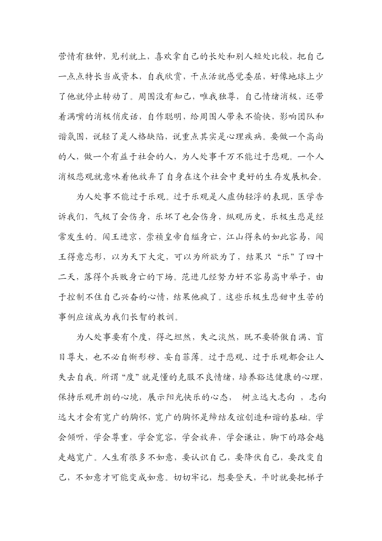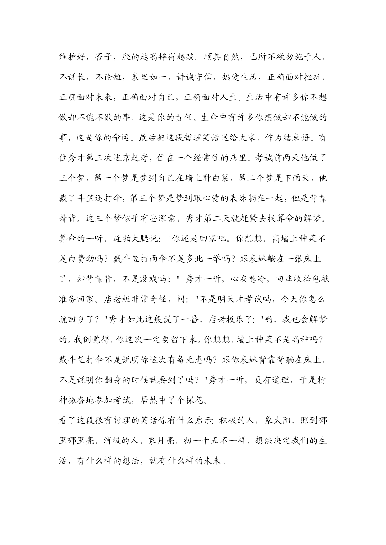 以阳光心态享受生活写给一时失志迷茫的朋友生活像一团麻,时常会有解不开的小疙瘩。生活像一杯酒,包含着人生的酸甜苦辣。过了而立之年的你为什么远离阳光生活,独自闷闷不乐呢。你从小立志高远,心里充满着无限的憧憬和期待,历经十几年的风风雨雨,一路走来坎坎坷坷,几度惊喜,几度消沉,暂短的兴奋,大多的忧郁,始终走不出无限的伤感,几次与红运失之交臂,让你心灰意冷,好像命运在捉弄你。你心情开始沉闷,工作日渐消极,生活越感无趣。机会对每个人都是公平的,那为什么偏偏你就抓不住呢?本人认为,缺乏渊博的知识,缺乏先觉的智慧,缺乏忍让的境界,缺乏阳光的心理,缺乏洒脱的涵养是你屡战屡败的根源。要做堂堂正正的人,要做让人尊敬的人,必须积累知识,增长智慧,必须培养阳光心态,陶冶情操,必须学会辩证的看待问题,退一步海阔天空,相信风雨总有阳光时。为人处事不能过于悲观。过于悲观的人是对前途未来失去信心的体现,是造成前途失意的直接原因。生活中看谁都不顺眼,人家吐口唾沫你认为是啐你,人家说一句不经心的话你认为影射你,人家兴奋激动时你认为是向你耀武扬威,人家敬而远之你认为有意疏离你,你口无遮拦,诋孙毁李,疑心重重,一脑子官司,心眼比芝麻粒还小,这样谁还敢接近你呢?工作中你看谁都不如自己,自己总以为资历比别人深,能力比别人强,经验比别人多,怎么就不受重用呢?自己整天想入非非、怨天忧人。不知道大家是否发现,这样的人还对投机钻营情有独钟,见利就上,喜欢拿自己的长处和别人短处比较,把自己一点点特长当成资本,自我欣赏,干点活就感觉委屈,好像地球上少了他就停止转动了。周围没有知己,唯我独尊,自己情绪消极,还带着满嘴的消极俏皮话,自作聪明,给周围人带来不愉快,影响团队和谐氛围,说轻了是人格缺陷,说重点其实是心理疾病。要做一个高尚的人,做一个有益于社会的人,为人处事千万不能过于悲观。一个人消极悲观就意味着他放弃了自身在这个社会中更好的生存发展机会。为人处事不能过于乐观。过于乐观是人虚伪轻浮的表现,医学告诉我们,气极了会伤身,乐坏了也会伤身,纵观历史,乐极生悲是经常发生的。闯王进京,崇祯皇帝自缢身亡,江山得来的如此容易,闯王得意忘形,以为天下大定,可以为所欲为了,结果只“乐”了四十二天,落得个兵败身亡的下场。范进几经努力好不容易高中举子,由于控制不住自己兴奋的心情,结果他疯了。这些乐极生悲甜中生苦的事例应该成为我们长智的教训。为人处事要有个度,得之坦然,失之淡然,既不要骄傲自满、盲目尊大,也不必自惭形秽、妄自菲薄。过于悲观、过于乐观都会让人失去自我。所谓“度”就是懂的克服不良情绪,培养豁达健康的心理,保持乐观开朗的心境,展示阳光快乐的心态,树立远大志向,志向远大才会有宽广的胸怀,宽广的胸怀是缔结友谊创造和谐的基础。学会倾听,学会尊重,学会宽容,学会放弃,学会谦让,脚下的路会越走越宽广。人生有很多不如意,要认识自己,要降伏自己,要改变自己,不如意才可能变成如意。切切牢记,想要登天,平时就要把梯子维护好,否子,爬的越高摔得越跤。顺其自然,己所不欲勿施于人,不说长,不论短,表里如一,讲诚守信,热爱生活,正确面对挫折,正确面对未来,正确面对自己,正确面对人生。生活中有许多你不想做却不能不做的事,这是你的责任。生命中有许多你想做却不能做的事,这是你的命运。最后把这段哲理笑话送给大家,作为结束语。有位秀才第三次进京赶考,住在一个经常住的店里。考试前两天他做了三个梦,第一个梦是梦到自己在墙上种白菜,第二个梦是下雨天,他戴了斗笠还打伞,第三个梦是梦到跟心爱的表妹躺在一起,但是背靠着背。这三个梦似乎有些深意,秀才第二天就赶紧去找算命的解梦。算命的一听,连拍大腿说:"你还是回家吧。你想想,高墙上种菜不是白费劲吗?戴斗笠打雨伞不是多此一举吗?跟表妹躺在一张床上了,却背靠背,不是没戏吗?"秀才一听,心灰意冷,回店收拾包袱准备回家。店老板非常奇怪,问:"不是明天才考试吗,今天你怎么就回乡了?"秀才如此这般说了一番,店老板乐了:"哟,我也会解梦的。我倒觉得,你这次一定要留下来。你想想,墙上种菜不是高种吗?戴斗笠打伞不是说明你这次有备无患吗?跟你表妹背靠背躺在床上,不是说明你翻身的时候就要到了吗?"秀才一听,更有道理,于是精神振奋地参加考试,居然中了个探花。看了这段很有哲理的笑话你有什么启示:积极的人,象太阳,照到哪里哪里亮,消极的人,象月亮,初一十五不一样。想法决定我们的生活,有什么样的想法,就有什么样的未来。