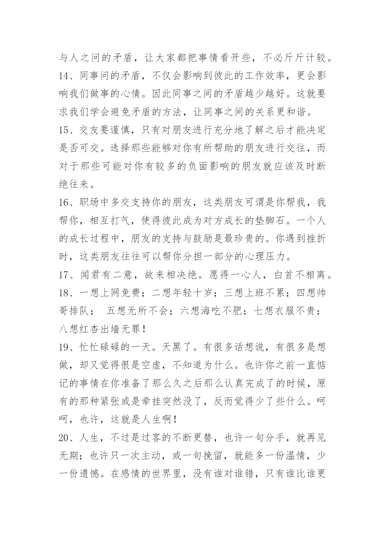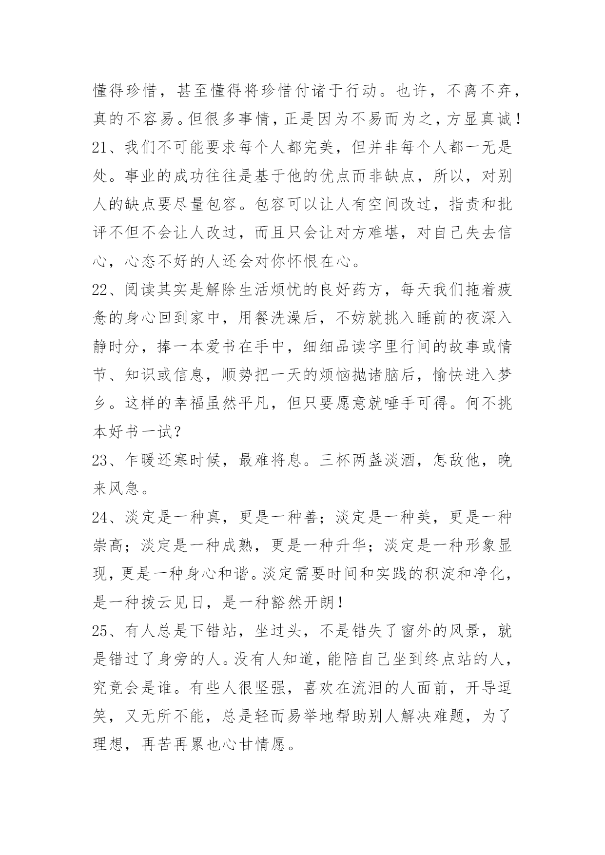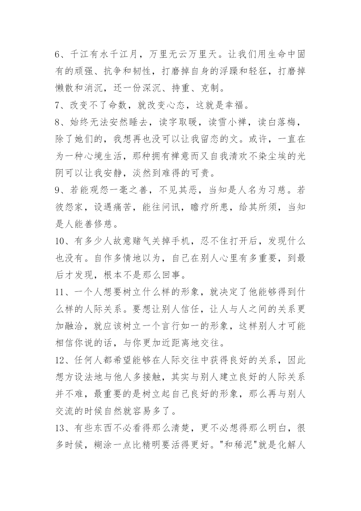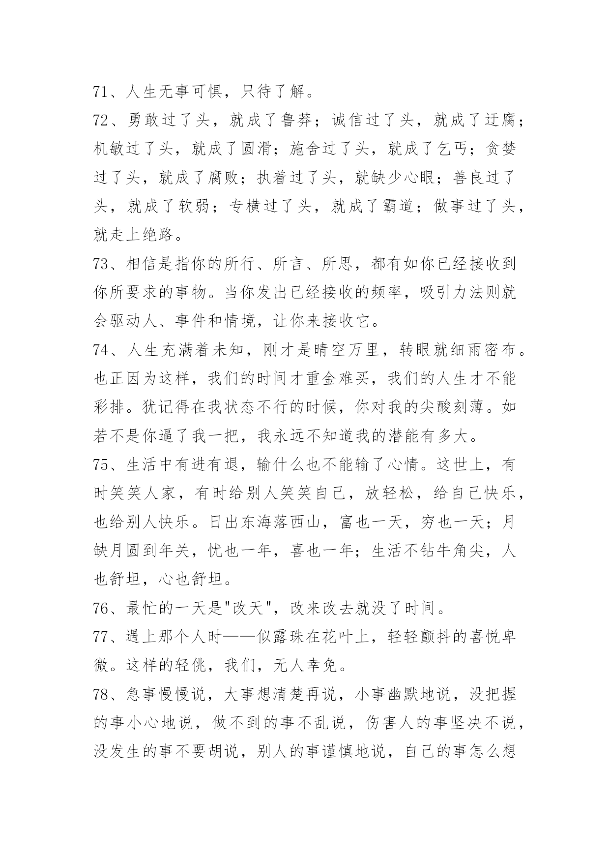 人生的语录88条【热门】2022年人生的语录汇总88条生活得太优裕了,难免懒惰。懒惰听起来刺耳,未必全是人性的顽劣:一,让生活慢下来,等于延长了生命的长度。若一生都在匆忙地赶路,就误过了道旁的风景。二,懒惰只是做事慢慢腾腾,未必是不想或不愿意做事。慢功出细活,懒惰亦可成为佳话。三,人生最重要的是方向正确。若方向错了,懒惰可少犯错误。下面是小编收集整理的人生的语录88条,仅供参考,希望能够帮助到大家。1、你就坐在那里,不要说话,语言是误解的根源。2、不要说,往事不堪回首,渐远渐生凉。曾经无声给予的安暖,依然在岁月的枝头淡然生香。不离不弃的等待里,依旧有相濡以沫的风声,生生不息。即使是落单的文字,也会有沁心的墨香汩汩流出,婉约着那些浅笑,那些悲欢,那些曾经的曾经。3、让人痛的窒息姑娘用友情来拒绝爱情。4、自信与自负仅一步之遥。自信的人身上充满着活力,对自己的能力有一个正确的判断和把握,不断给自己加油鼓励;而自负的人对自己的能力估计得过高而迷失自我,最终导致失败。5、没有荣誉的成功就像没加调料的菜,它虽然能填饱你的肚子,但是很难吃。6、千江有水千江月,万里无云万里天。让我们用生命中固有的顽强、抗争和韧性,打磨掉自身的浮躁和轻狂,打磨掉懒散和消沉,还一份深沉、持重、克制。7、改变不了命数,就改变心态,这就是幸福。8、始终无法安然睡去,读字取暖,读雪小禅,读白落梅,除了她们的,我想再也没可以让我留恋的文。或许,一直在为一种心境生活,那种拥有禅意而又自我清欢不染尘埃的光阴可以让我安静,淡然到难得的可贵。9、若能观怨一毫之善,不见其恶,当知是人名为习慈。若彼怨家,设遇痛苦,能往问讯,瞻疗所患,给其所须,当知是人能善修慈。10、有多少人故意赌气关掉手机,忍不住打开后,发现什么也没有。自作多情地以为,自己在别人心里有多重要,到最后才发现,根本不是那么回事。11、一个人想要树立什么样的形象,就决定了他能够得到什么样的人际关系。要想让别人信任,让人与人之间的关系更加融洽,就应该树立一个言行如一的形象,这样别人才可能相信你说的话,与你更加近距离地交往。12、任何人都希望能够在人际交往中获得良好的关系,因此想方设法地与他人多接触,其实与别人建立良好的人际关系并不难,最重要的是树立起自己良好的形象,那么再与别人交流的时候自然就容易多了。13、有些东西不必看得那么清楚,更不必想得那么明白,很多时候,糊涂一点比精明要活得更好。"和稀泥"就是化解人与人之问的矛盾,让大家都把事情看开些,不必斤斤计较。14、同事问的矛盾,不仅会影响到彼此的工作效率,更会影响我们做事的心情。因此同事之间的矛盾越少越好。这就要求我们学会避免矛盾的方法,让同事之间的关系更和谐。15、交友要谨慎,只有对朋友进行充分地了解之后才能决定是否可交。选择那些能够对你有所帮助的朋友进行交往,而对于那些可能对你有较多的负面影响的朋友就应该及时断绝往来。16、职场中多交支持你的朋友,这类朋友可谓是你帮我,我帮你,相互打气,使得彼此成为对方成长的垫脚石。一个人的成长过程中,朋友的支持与鼓励是最珍贵的。你遇到挫折时,这类朋友往往可以帮你分担一部分的心理压力。17、闻君有二意,故来相决绝。愿得一心人,白首不相离。18、一想上网免费;二想年轻十岁;三想上班不累;四想帅哥排队;五想无所不会;六想海吃不肥;七想衣服不贵;八想红杏出墙无罪!19、忙忙碌碌的一天。天黑了。有很多话想说,有很多是想做,却又觉得很是空虚,不知道为什么。也许你之前一直惦记的事情在你准备了那么久之后那么认真完成了的时候,原有的那种紧张或是牵挂突然没了,反而觉得少了些什么。呵呵,也许,这就是人生啊!20、人生,不过是过客的不断更替,也许一句分手,就再见无期;也许只一次主动,或一句挽留,就能多一份温情,少一份遗憾。在感情的世界里,没有谁对谁错,只有谁比谁更懂得珍惜,甚至懂得将珍惜付诸于行动。也许,不离不弃,真的不容易。但很多事情,正是因为不易而为之,方显真诚!21、我们不可能要求每个人都完美,但并非每个人都一无是处。事业的成功往往是基于他的优点而非缺点,所以,对别人的缺点要尽量包容。包容可以让人有空间改过,指责和批评不但不会让人改过,而且只会让对方难堪,对自己失去信心,心态不好的人还会对你怀恨在心。22、阅读其实是解除生活烦忧的良好药方,每天我们拖着疲惫的身心回到家中,用餐洗澡后,不妨就挑入睡前的夜深入静时分,捧一本爱书在手中,细细品读字里行间的故事或情节、知识或信息,顺势把一天的烦恼抛诸脑后,愉快进入梦乡。这样的幸福虽然平凡,但只要愿意就唾手可得。何不挑本好书一试?23、乍暖还寒时候,最难将息。三杯两盏淡酒,怎敌他,晚来风急。24、淡定是一种真,更是一种善;淡定是一种美,更是一种崇高;淡定是一种成熟,更是一种升华;淡定是一种形象显现,更是一