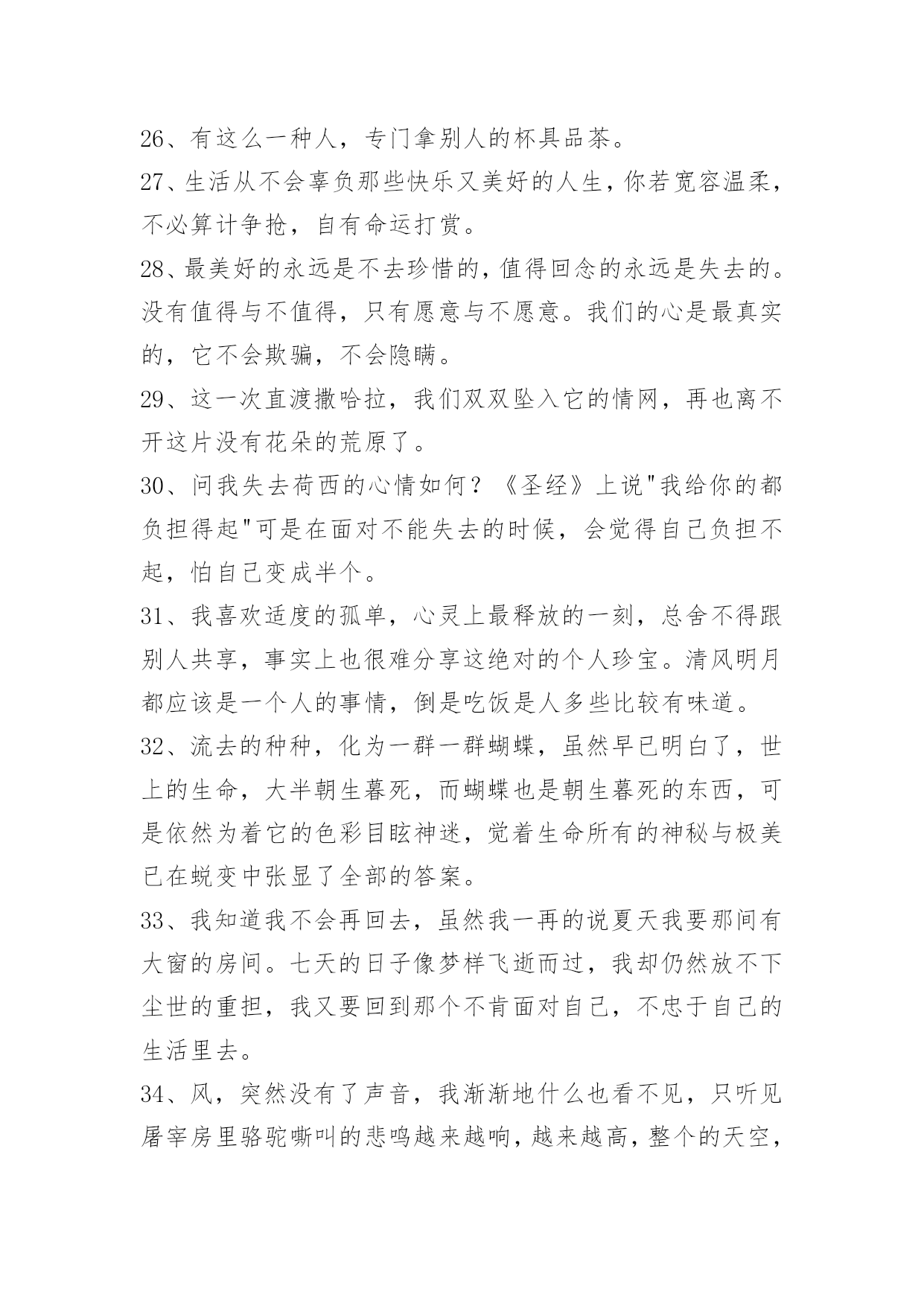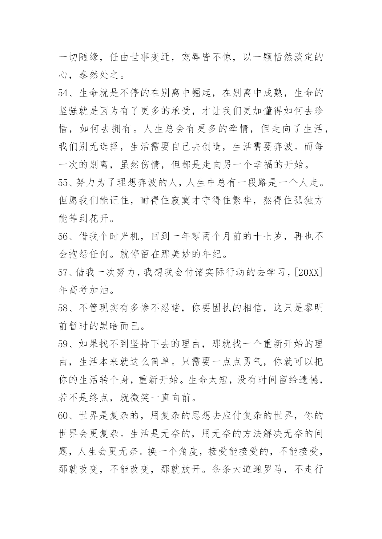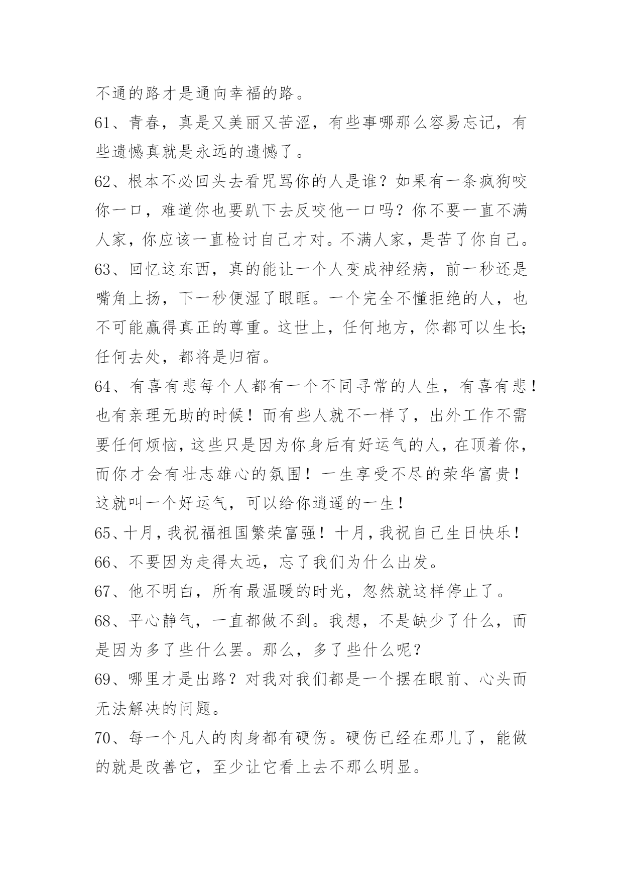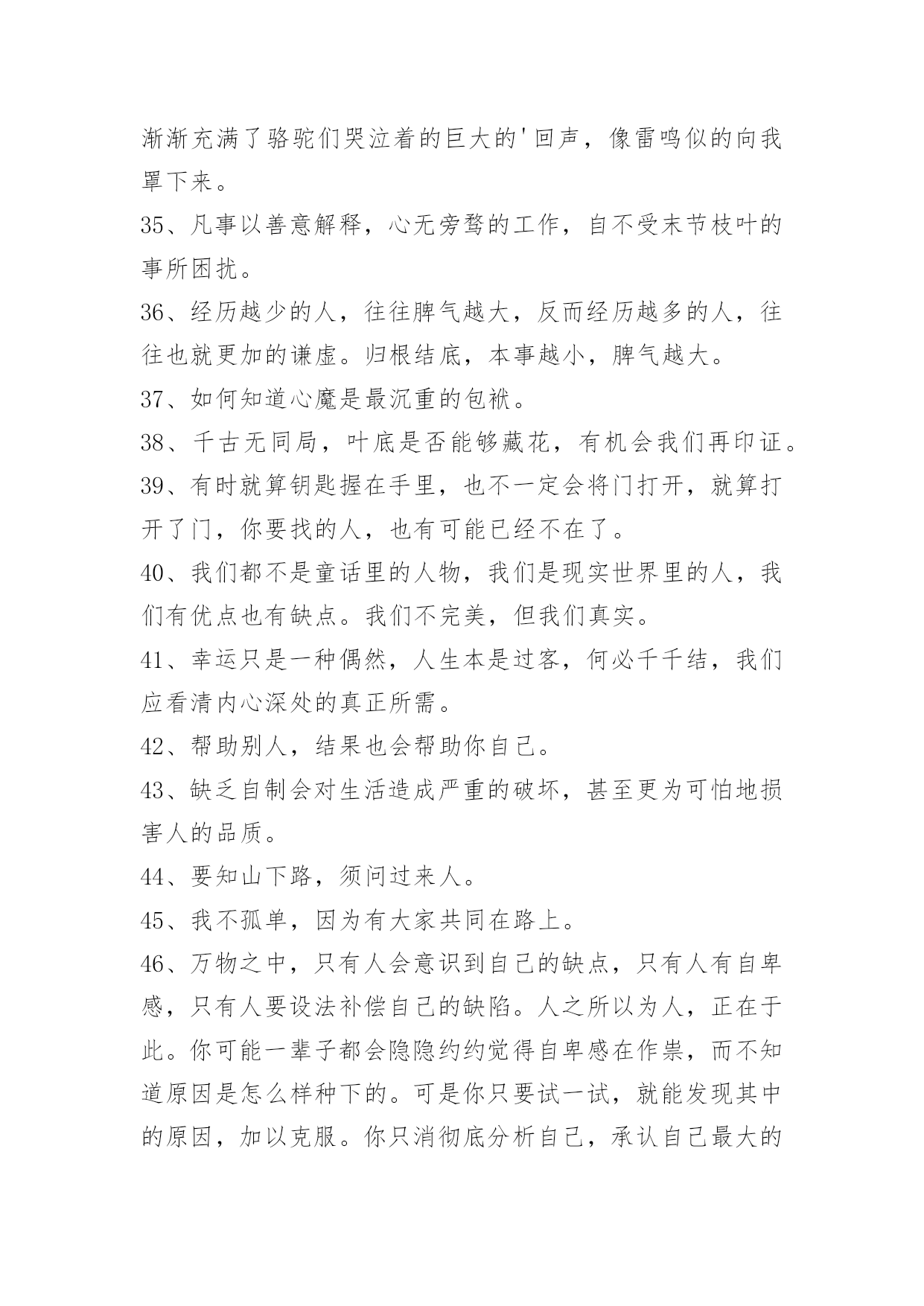 人生的语录88条【热门】2022年人生的语录汇总88条生活得太优裕了,难免懒惰。懒惰听起来刺耳,未必全是人性的顽劣:一,让生活慢下来,等于延长了生命的长度。若一生都在匆忙地赶路,就误过了道旁的风景。二,懒惰只是做事慢慢腾腾,未必是不想或不愿意做事。慢功出细活,懒惰亦可成为佳话。三,人生最重要的是方向正确。若方向错了,懒惰可少犯错误。下面是小编收集整理的人生的语录88条,仅供参考,希望能够帮助到大家。1、你就坐在那里,不要说话,语言是误解的根源。2、不要说,往事不堪回首,渐远渐生凉。曾经无声给予的安暖,依然在岁月的枝头淡然生香。不离不弃的等待里,依旧有相濡以沫的风声,生生不息。即使是落单的文字,也会有沁心的墨香汩汩流出,婉约着那些浅笑,那些悲欢,那些曾经的曾经。3、让人痛的窒息姑娘用友情来拒绝爱情。4、自信与自负仅一步之遥。自信的人身上充满着活力,对自己的能力有一个正确的判断和把握,不断给自己加油鼓励;而自负的人对自己的能力估计得过高而迷失自我,最终导致失败。5、没有荣誉的成功就像没加调料的菜,它虽然能填饱你的肚子,但是很难吃。6、千江有水千江月,万里无云万里天。让我们用生命中固有的顽强、抗争和韧性,打磨掉自身的浮躁和轻狂,打磨掉懒散和消沉,还一份深沉、持重、克制。7、改变不了命数,就改变心态,这就是幸福。8、始终无法安然睡去,读字取暖,读雪小禅,读白落梅,除了她们的,我想再也没可以让我留恋的文。或许,一直在为一种心境生活,那种拥有禅意而又自我清欢不染尘埃的光阴可以让我安静,淡然到难得的可贵。9、若能观怨一毫之善,不见其恶,当知是人名为习慈。若彼怨家,设遇痛苦,能往问讯,瞻疗所患,给其所须,当知是人能善修慈。10、有多少人故意赌气关掉手机,忍不住打开后,发现什么也没有。自作多情地以为,自己在别人心里有多重要,到最后才发现,根本不是那么回事。11、一个人想要树立什么样的形象,就决定了他能够得到什么样的人际关系。要想让别人信任,让人与人之间的关系更加融洽,就应该树立一个言行如一的形象,这样别人才可能相信你说的话,与你更加近距离地交往。12、任何人都希望能够在人际交往中获得良好的关系,因此想方设法地与他人多接触,其实与别人建立良好的人际关系并不难,最重要的是树立起自己良好的形象,那么再与别人交流的时候自然就容易多了。13、有些东西不必看得那么清楚,更不必想得那么明白,很多时候,糊涂一点比精明要活得更好。"和稀泥"就是化解人与人之问的矛盾,让大家都把事情看开些,不必斤斤计较。14、同事问的矛盾,不仅会影响到彼此的工作效率,更会影响我们做事的心情。因此同事之间的矛盾越少越好。这就要求我们学会避免矛盾的方法,让同事之间的关系更和谐。15、交友要谨慎,只有对朋友进行充分地了解之后才能决定是否可交。选择那些能够对你有所帮助的朋友进行交往,而对于那些可能对你有较多的负面影响的朋友就应该及时断绝往来。16、职场中多交支持你的朋友,这类朋友可谓是你帮我,我帮你,相互打气,使得彼此成为对方成长的垫脚石。一个人的成长过程中,朋友的支持与鼓励是最珍贵的。你遇到挫折时,这类朋友往往可以帮你分担一部分的心理压力。17、闻君有二意,故来相决绝。愿得一心人,白首不相离。18、一想上网免费;二想年轻十岁;三想上班不累;四想帅哥排队;五想无所不会;六想海吃不肥;七想衣服不贵;八想红杏出墙无罪!19、忙忙碌碌的一天。天黑了。有很多话想说,有很多是想做,却又觉得很是空虚,不知道为什么。也许你之前一直惦记的事情在你准备了那么久之后那么认真完成了的时候,原有的那种紧张或是牵挂突然没了,反而觉得少了些什么。呵呵,也许,这就是人生啊!20、人生,不过是过客的不断更替,也许一句分手,就再见无期;也许只一次主动,或一句挽留,就能多一份温情,少一份遗憾。在感情的世界里,没有谁对谁错,只有谁比谁更懂得珍惜,甚至懂得将珍惜付诸于行动。也许,不离不弃,真的不容易。但很多事情,正是因为不易而为之,方显真诚!21、我们不可能要求每个人都完美,但并非每个人都一无是处。事业的成功往往是基于他的优点而非缺点,所以,对别人的缺点要尽量包容。包容可以让人有空间改过,指责和批评不但不会让人改过,而且只会让对方难堪,对自己失去信心,心态不好的人还会对你怀恨在心。22、阅读其实是解除生活烦忧的良好药方,每天我们拖着疲惫的身心回到家中,用餐洗澡后,不妨就挑入睡前的夜深入静时分,捧一本爱书在手中,细细品读字里行间的故事或情节、知识或信息,顺势把一天的烦恼抛诸脑后,愉快进入梦乡。这样的幸福虽然平凡,但只要愿意就唾手可得。何不挑本好书一试?23、乍暖还寒时候,最难将息。三杯两盏淡酒,怎敌他,晚来风急。24、淡定是一种真,更是一种善;淡定是一种美,更是一种崇高;淡定是一种成熟,更是一种升华;淡定是一种形象显现,更是一