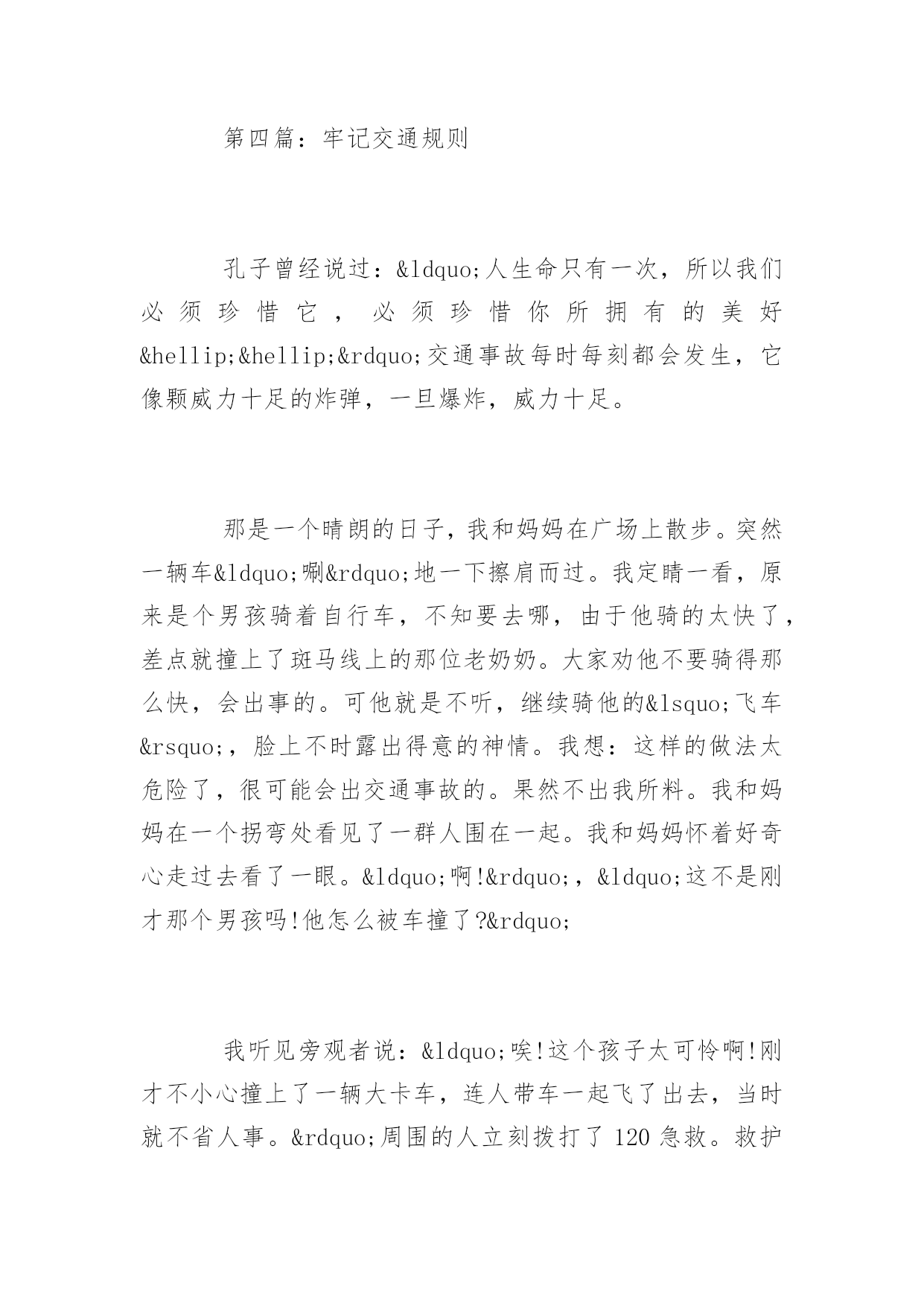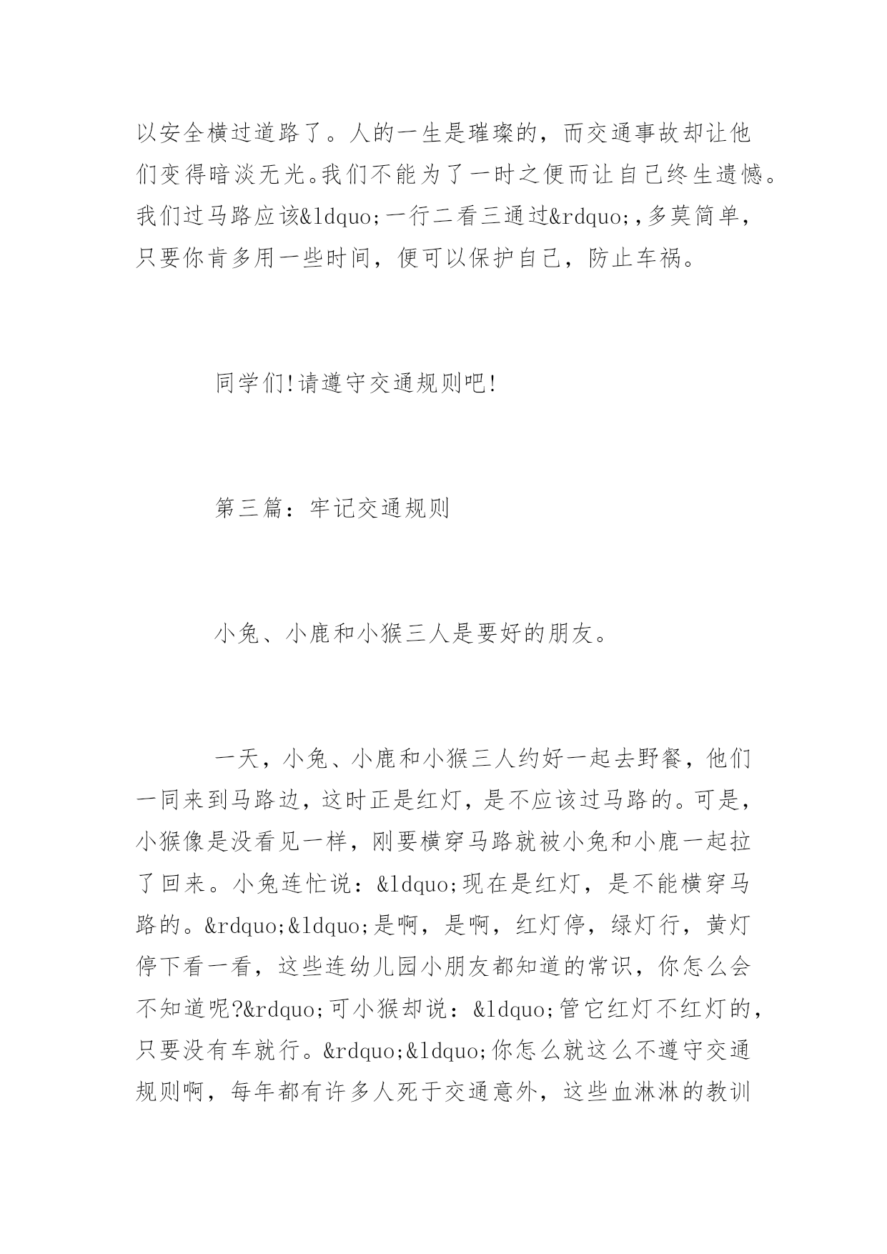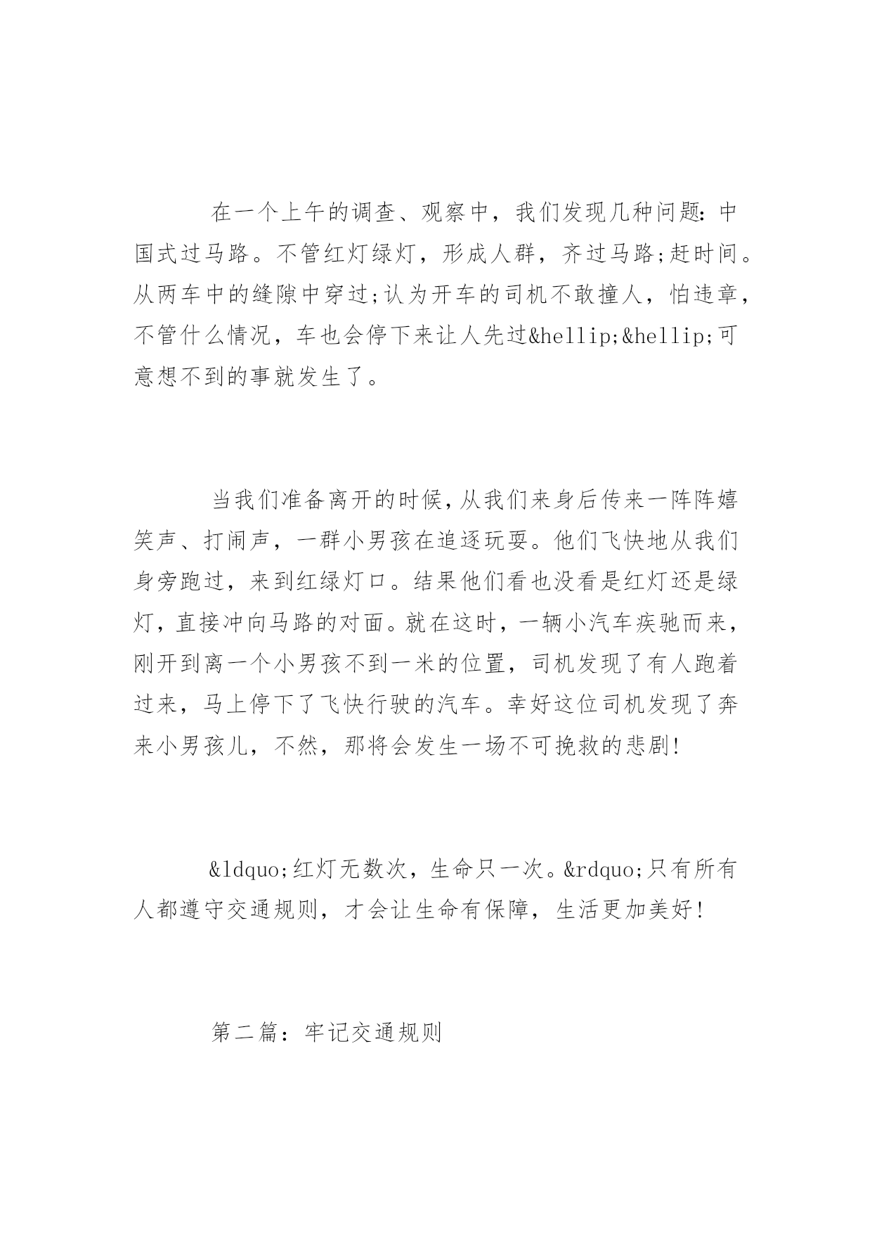 牢记交通规则作文牢记交通规则作文“遵守交通规则”这个词我们几乎随时都能听见,而那些因交通事故所发生的血腥事件是多么惨不忍睹,我们应该从中认识到了遵守交通规则的重要性。小编收集了牢记交通规则作文,欢迎阅读。 第一篇:牢记交通规则古人云:“无规则不成方圆。”规则在我们的生活中无处不在。例如:校规、班规、家规、国规……今天,我和同学们组成一个调研小组,来调查人们遵守交通的情况。我们首先来到了一个车流量较多的红绿灯口,发现这里等红绿灯的人极少,几乎所有人都闯红灯:小学生,老年人,少男少女,上班族等。在一个上午的调查、观察中,我们发现几种问题:中国式过马路。不管红灯绿灯,形成人群,齐过马路;赶时间。从两车中的缝隙中穿过;认为开车的司机不敢撞人,怕违章,不管什么情况,车也会停下来让人先过……可意想不到的事就发生了。当我们准备离开的时候,从我们来身后传来一阵阵嬉笑声、打闹声,一群小男孩在追逐玩耍。他们飞快地从我们身旁跑过,来到红绿灯口。结果他们看也没看是红灯还是绿灯,直接冲向马路的对面。就在这时,一辆小汽车疾驰而来,刚开到离一个小男孩不到一米的位置,司机发现了有人跑着过来,马上停下了飞快行驶的汽车。幸好这位司机发现了奔来小男孩儿,不然,那将会发生一场不可挽救的悲剧!“红灯无数次,生命只一次。”只有所有人都遵守交通规则,才会让生命有保障,生活更加美好!第二篇:牢记交通规则“遵守交通规则”这个词我们几乎随时都能听见,而那些因交通事故所发生的血腥事件是多么惨不忍睹,我们应该从中认识到了遵守交通规则的重要性。中国有13亿人口,3200万人在我们眼中并不算是什么,但我要告诉你,这是我国每年在交通上死亡的人数,并且我国几乎每25秒就发生一件交通事故,你总不能视而不见吧!有多少人因交通事故而丧失生命,又有多少人因交通而使一个完美的家庭家破人亡……马路上是许许多多人民的鲜血,车轮下是一条条年轻的生命,交通使一个无形的杀手,慢慢得像我们逼近。我们应该时时刻刻遵我们上学、放学和外活动,几乎天天要在道路上行走。走路要保证安全,这里面的学问可多着呢!所我要为的家介绍一下“怎样安全横过道路”。横过道路时,要选择有人行横道的地方。在这个地带,机动车的行驶速度一般都要减慢,驾驶员也比较注意行人的动态。在没划有人行横道的地方横过道路,要特别注意避让来往的车辆。须先看左边再看右边,两边都没来坐车时就可以安全横过道路了。人的一生是璀璨的,而交通事故却让他们变得暗淡无光。我们不能为了一时之便而让自己终生遗憾。我们过马路应该“一行二看三通过”,多莫简单,只要你肯多用一些时间,便可以保护自己,防止车祸。同学们!请遵守交通规则吧!第三篇:牢记交通规则小兔、小鹿和小猴三人是要好的朋友。一天,小兔、小鹿和小猴三人约好一起去野餐,他们一同来到马路边,这时正是红灯,是不应该过马路的。可是,小猴像是没看见一样,刚要横穿马路就被小兔和小鹿一起拉了回来。小兔连忙说:“现在是红灯,是不能横穿马路的。”“是啊,是啊,红灯停,绿灯行,黄灯停下看一看,这些连幼儿园小朋友都知道的常识,你怎么会不知道呢?”可小猴却说:“管它红灯不红灯的,只要没有车就行。”“你怎么就这么不遵守交通规则啊,每年都有许多人死于交通意外,这些血淋淋的教训给我们的提醒还不够吗?”小兔大声说。就这样,你一句我一句的,他们三人就吵了起来,吵着吵着,小猴忽然挣脱小兔和小鹿的双手,朝马路对面跑去,突然一辆汽车疾速冲过来,小猴当场被撞倒在地。小兔和小鹿急忙拨打了120,把小猴火速送往医院,小兔和小鹿在手术室外守了整整一夜。第二天,医生告诉她们:“小猴虽然被汽车撞了一下,但是伤得不重,没有生命危险,只要住院养伤就行了。”于是,小兔和小鹿来到小猴的病房里,见小猴醒着,就对他说:“好点没有?疼吗?”见小鹿和小兔如此关心自己,而自己却不听他们劝阻,结果受了伤,心里很是愧疚:“对不起,是我不听劝,还受了伤,又要让你们这么照顾我,真是太对不起了!”可小兔和小鹿却说:“只要你以后再也不闯红灯就行了。”从此以后,小猴懂得了一个道理:马路上不是我们随便嬉戏的地方,要遵守交通法规,按道通行,按线行走,文明出行,文明乘车,不能做任何违反交通规则的事情,否则这种惨痛的教训会再度发生。第四篇:牢记交通规则