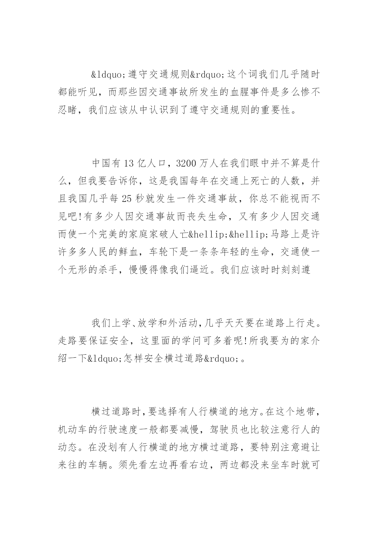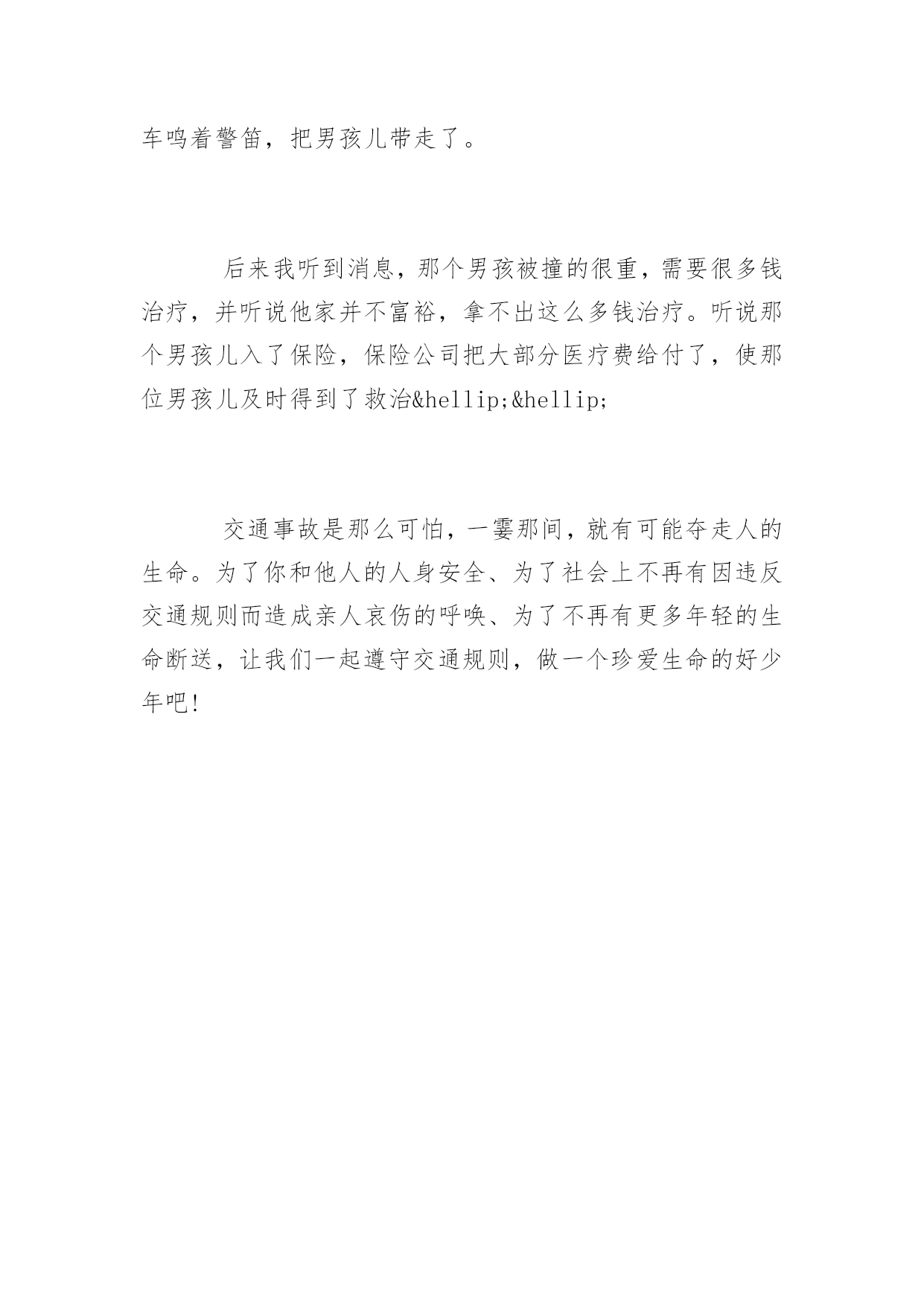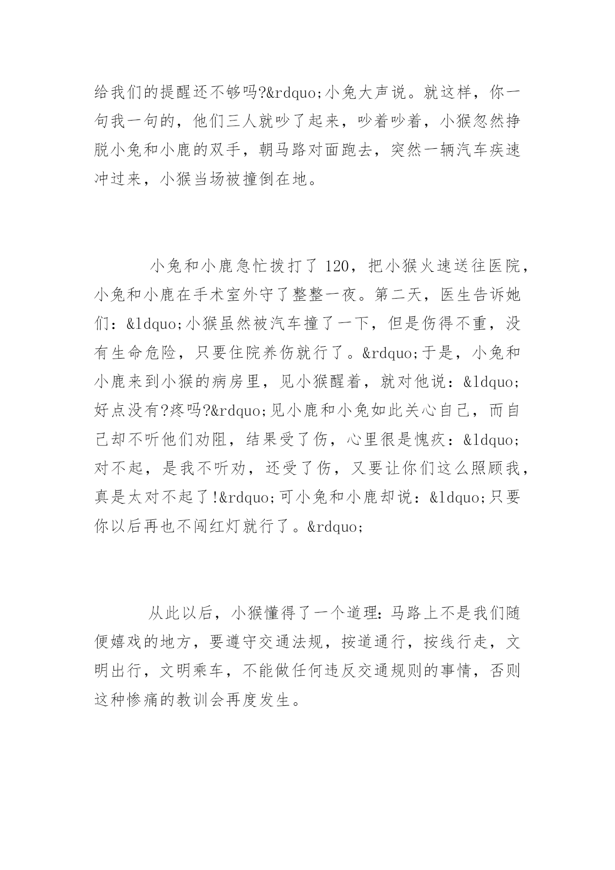 牢记交通规则作文牢记交通规则作文“遵守交通规则”这个词我们几乎随时都能听见,而那些因交通事故所发生的血腥事件是多么惨不忍睹,我们应该从中认识到了遵守交通规则的重要性。小编收集了牢记交通规则作文,欢迎阅读。 第一篇:牢记交通规则古人云:“无规则不成方圆。”规则在我们的生活中无处不在。例如:校规、班规、家规、国规……今天,我和同学们组成一个调研小组,来调查人们遵守交通的情况。我们首先来到了一个车流量较多的红绿灯口,发现这里等红绿灯的人极少,几乎所有人都闯红灯:小学生,老年人,少男少女,上班族等。在一个上午的调查、观察中,我们发现几种问题:中国式过马路。不管红灯绿灯,形成人群,齐过马路;赶时间。从两车中的缝隙中穿过;认为开车的司机不敢撞人,怕违章,不管什么情况,车也会停下来让人先过……可意想不到的事就发生了。当我们准备离开的时候,从我们来身后传来一阵阵嬉笑声、打闹声,一群小男孩在追逐玩耍。他们飞快地从我们身旁跑过,来到红绿灯口。结果他们看也没看是红灯还是绿灯,直接冲向马路的对面。就在这时,一辆小汽车疾驰而来,刚开到离一个小男孩不到一米的位置,司机发现了有人跑着过来,马上停下了飞快行驶的汽车。幸好这位司机发现了奔来小男孩儿,不然,那将会发生一场不可挽救的悲剧!“红灯无数次,生命只一次。”只有所有人都遵守交通规则,才会让生命有保障,生活更加美好!第二篇:牢记交通规则“遵守交通规则”这个词我们几乎随时都能听见,而那些因交通事故所发生的血腥事件是多么惨不忍睹,我们应该从中认识到了遵守交通规则的重要性。中国有13亿人口,3200万人在我们眼中并不算是什么,但我要告诉你,这是我国每年在交通上死亡的人数,并且我国几乎每25秒就发生一件交通事故,你总不能视而不见吧!有多少人因交通事故而丧失生命,又有多少人因交通而使一个完美的家庭家破人亡……马路上是许许多多人民的鲜血,车轮下是一条条年轻的生命,交通使一个无形的杀手,慢慢得像我们逼近。我们应该时时刻刻遵我们上学、放学和外活动,几乎天天要在道路上行走。走路要保证安全,这里面的学问可多着呢!所我要为的家介绍一下“怎样安全横过道路”。横过道路时,要选择有人行横道的地方。在这个地带,机动车的行驶速度一般都要减慢,驾驶员也比较注意行人的动态。在没划有人行横道的地方横过道路,要特别注意避让来往的车辆。须先看左边再看右边,两边都没来坐车时就可以安全横过道路了。人的一生是璀璨的,而交通事故却让他们变得暗淡无光。我们不能为了一时之便而让自己终生遗憾。我们过马路应该“一行二看三通过”,多莫简单,只要你肯多用一些时间,便可以保护自己,防止车祸。同学们!请遵守交通规则吧!第三篇:牢记交通规则小兔、小鹿和小猴三人是要好的朋友。一天,小兔、小鹿和小猴三人约好一起去野餐,他们一同来到马路边,这时正是红灯,是不应该过马路的。可是,小猴像是没看见一样,刚要横穿马路就被小兔和小鹿一起拉了回来。小兔连忙说:“现在是红灯,是不能横穿马路的。”“是啊,是啊,红灯停,绿灯行,黄灯停下看一看,这些连幼儿园小朋友都知道的常识,你怎么会不知道呢?”可小猴却说:“管它红灯不红灯的,只要没有车就行。”“你怎么就这么不遵守交通规则啊,每年都有许多人死于交通意外,这些血淋淋的教训给我们的提醒还不够吗?”小兔大声说。就这样,你一句我一句的,他们三人就吵了起来,吵着吵着,小猴忽然挣脱小兔和小鹿的双手,朝马路对面跑去,突然一辆汽车疾速冲过来,小猴当场被撞倒在地。小兔和小鹿急忙拨打了120,把小猴火速送往医院,小兔和小鹿在手术室外守了整整一夜。第二天,医生告诉她们:“小猴虽然被汽车撞了一下,但是伤得不重,没有生命危险,只要住院养伤就行了。”于是,小兔和小鹿来到小猴的病房里,见小猴醒着,就对他说:“好点没有?疼吗?”见小鹿和小兔如此关心自己,而自己却不听他们劝阻,结果受了伤,心里很是愧疚:“对不起,是我不听劝,还受了伤,又要让你们这么照顾我,真是太对不起了!”可小兔和小鹿却说:“只要你以后再也不闯红灯就行了。”从此以后,小猴懂得了一个道理:马路上不是我们随便嬉戏的地方,要遵守交通法规,按道通行,按线行走,文明出行,文明乘车,不能做任何违反交通规则的事情,否则这种惨痛的教训会再度发生。第四篇:牢记交通规则