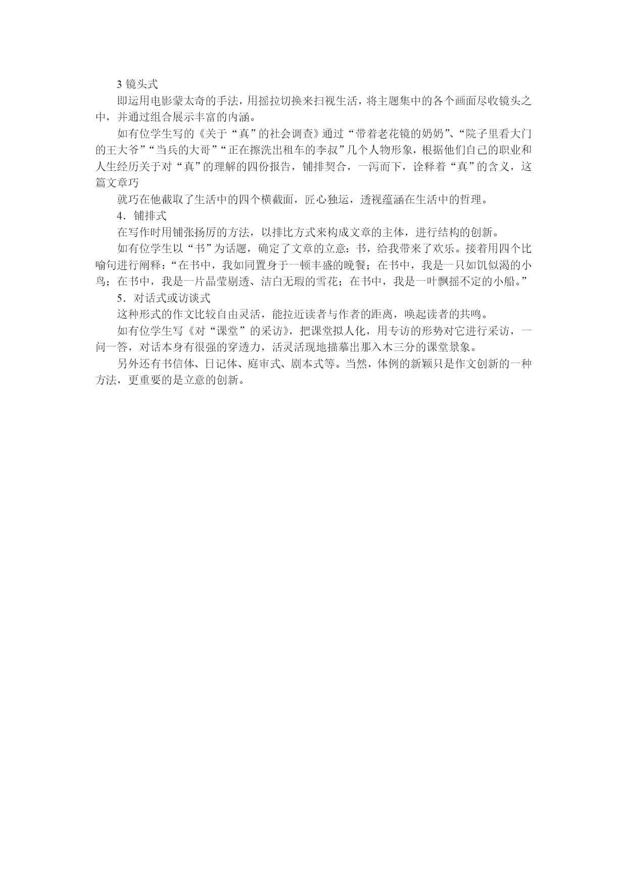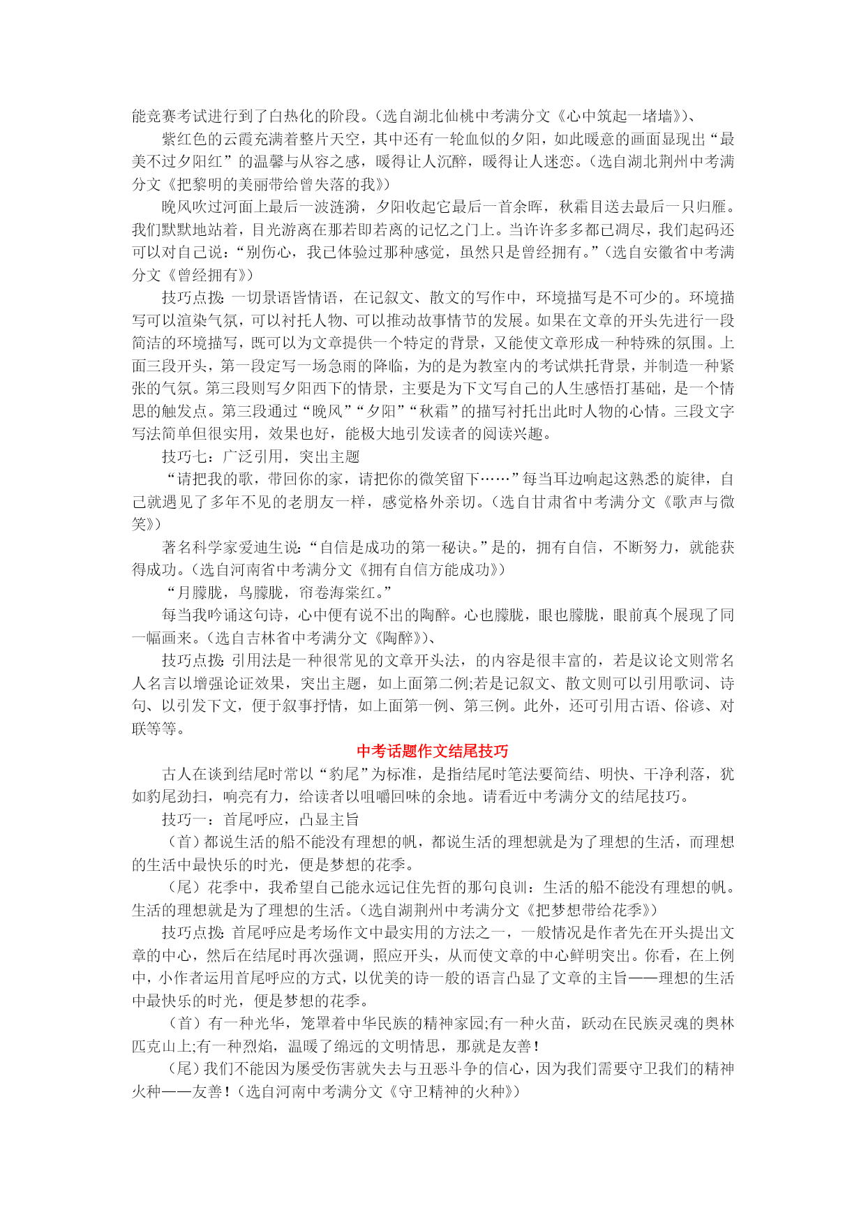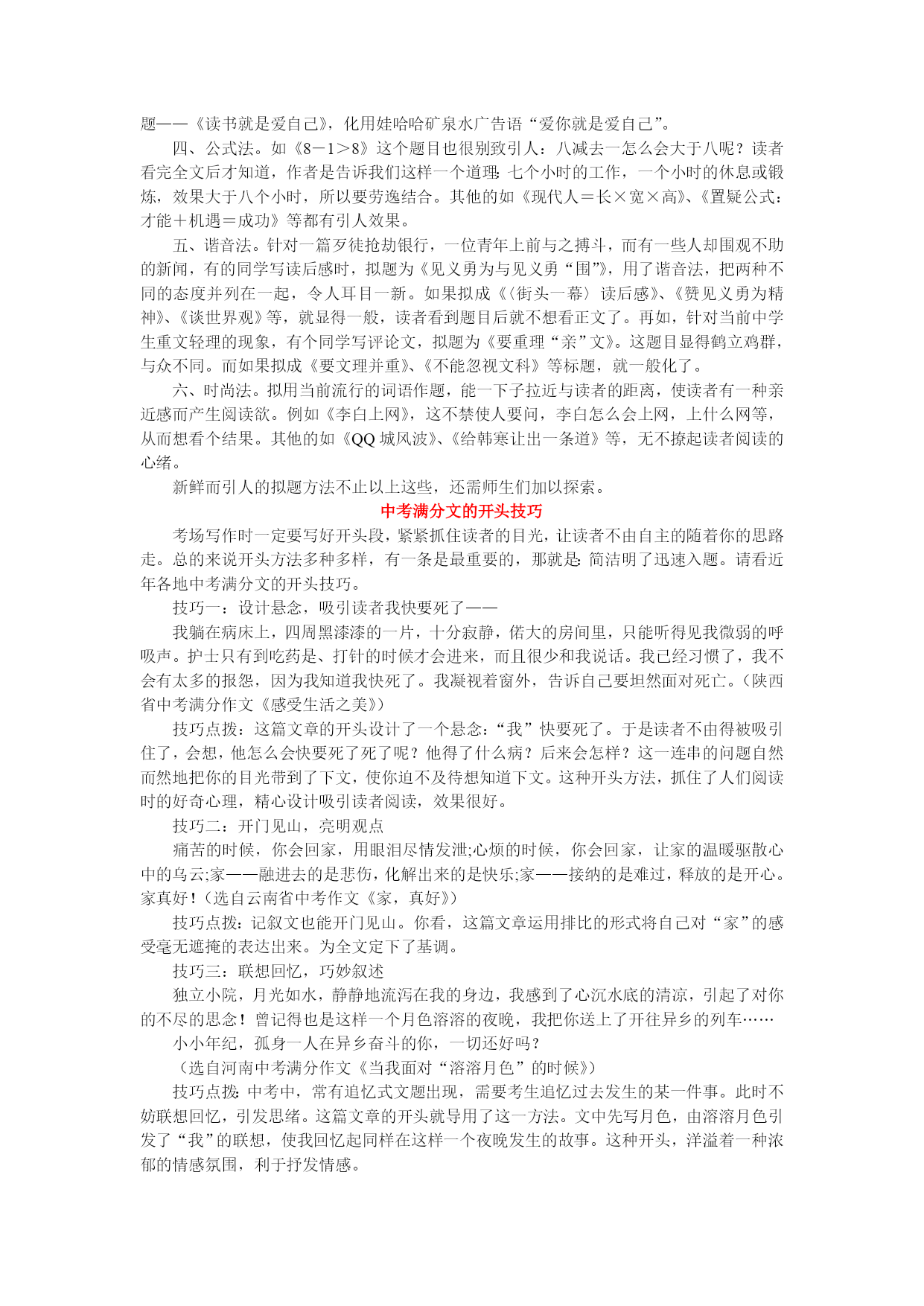 中考话题作文技巧大全中考作文拟题技巧俗话说:“题好一半文。”标题是文章的眼睛,好的标题能使文章文采倍增,令人过目难忘。那么,怎样才能快速拟出一个鲜活新颖的标题呢?下面简单地介绍几种方法。一、反常法。也叫悬念法。就是故意用违背常理逻辑的语句作题目的方法。这种题目能激起读者的兴趣,有想一口气把全文读完弄个水落石出的效果。如《感谢车祸》,“车祸”为什么还要感谢呢?读者急于想从文中看个究竟。其他的如《美丽的谎言》、《拍卖诚信》和《耳朵“挑食”》等,无不使读者心情荡漾。如《蓝树叶》这个题目,既新颖又能吸引读者往下读。树叶一般都是绿色的,怎么会是蓝色的呢?读完文章后才知道,“我”画树叶时因没有绿色蜡笔而向同桌借,但同桌不给,“我”只好把树叶涂成了蓝色。作者安题目时有意用了反常手法。其他的如《欲速可达》、《没有“异想”,哪来“天开”》等都有这个效果。如:以“竞争”为话题——《感谢你的敌人》、《珍惜你的痛苦》、《败了,多好》;以“关注生活”为话题——《往事并不如烟》、《以胖为荣》;以“素质教育”为话题——《真想做个后进生》、《渴望停电》。二、修辞法。用比喻和拟人对偶等修辞手法拟题,也能使人耳目一新,惹人喜爱。①比喻如:以“挫折”为话题——《别抱怨手上的牌》、《不可多得的教师》;以“环保”为话题——《点燃绿色的火焰》、《我想有个美丽的家》;关于“孝”——《请给老人一轮暖阳》;“关注生活”的话题——《我爱曲线的生活》。③对偶如:以环境为话题——《一头白发,满山青葱》;以读书为话题——《读智慧之书,做有用之才》。④拟人如:以“树”为话题——《树的“叹息”》;以“环保”为话题——《地球就诊记》三、引用法。对影片名、歌曲名、古诗名以及成语俗语等进行借用或改造,使之成为文章的题目,这就是借用。这样的题目显得典雅大方,亦庄亦谐,妙趣横生,引人喜爱。可分为直接引用和化用。A、直接引用:引用诗词。如:99年高考“假如记忆可以移植”——《前不见古人,后不见来者》(陈子昂《登幽州台歌》),表示对移植记忆的困惑;2000年高考“答案是丰富多采的”——《横看成岭侧成峰》(苏轼《题西林壁》)。引用歌词。现在的流行音乐中,不少歌曲的歌名、歌词非常优美,借用它们作文章的标题,既显得活泼风趣,又容易把读者带入文章所创设的情境。如:以“宽容”为话题——《一笑而过》(那英);以“素质教育”为话题——《未来的主人翁》(罗大佑);以“家庭”为话题——《我要的幸福》(孙燕姿);以“心愿”为话题——《一千零一个愿望》。引用名句。如:以“素质教育”为话题——《救救孩子》(鲁迅《狂人日记》);以“关注生活”为话题,写生活对人的考验——《让暴风雨来得更猛烈些吧》(高尔基《海燕》);以“友谊”为话题——《百年孤独》(加西亚马尔克斯同名小说);以“亲情”为话题——《滴滴香浓,意犹未尽》(麦氏咖啡广告语)。B、化用。如:以诚信为话题——《若为人生故,诚信不可抛》,化用了诗句“若为自由故,二者皆可抛”;以环境为话题——《都是风沙惹的祸》,化用歌词“都是你惹的祸”;以读书为话题——《读书就是爱自己》,化用娃哈哈矿泉水广告语“爱你就是爱自己”。四、公式法。如《8-1>8》这个题目也很别致引人:八减去一怎么会大于八呢?读者看完全文后才知道,作者是告诉我们这样一个道理:七个小时的工作,一个小时的休息或锻炼,效果大于八个小时,所以要劳逸结合。其他的如《现代人=长×宽×高》、《置疑公式:才能+机遇=成功》等都有引人效果。五、谐音法。针对一篇歹徒抢劫银行,一位青年上前与之搏斗,而有一些人却围观不助的新闻,有的同学写读后感时,拟题为《见义勇为与见义勇“围”》,用了谐音法,把两种不同的态度并列在一起,令人耳目一新。如果拟成《〈街头一幕〉读后感》、《赞见义勇为精神》、《谈世界观》等,就显得一般,读者看到题目后就不想看正文了。再如,针对当前中学生重文轻理的现象,有个同学写评论文,拟题为《要重理“亲”文》。这题目显得鹤立鸡群,与众不同。而如果拟成《要文理并重》、《不能忽视文科》等标题,就一般化了。六、时尚法。拟用当前流行的词语作题,能一下子拉近与读者的距离,使读者有一种亲近感而产生阅读欲。例如《李白上网》,这不禁使人要问,李白怎么会上网,上什么网等,从而想看个结果。其他的如《QQ城风波》、《给韩寒让出一条道》等,无不撩起读者阅读的心绪。新鲜而引人的拟题方法不止以上这些,还需师生们加以探索。中考满分文的开头技巧考场写作时一定要写好开头段,紧紧抓住读者的目光,让读者不由自主的随着你的思路走。总的来说开头方法多种多样,有一条是最重要的,那就是:简洁明了迅速入题。请看近年各地中考满分文的开头技巧。技巧一:设计悬念,吸引读者我快要死了——我躺在病床上,四周黑漆漆的一片,十分寂静,偌大的房间
