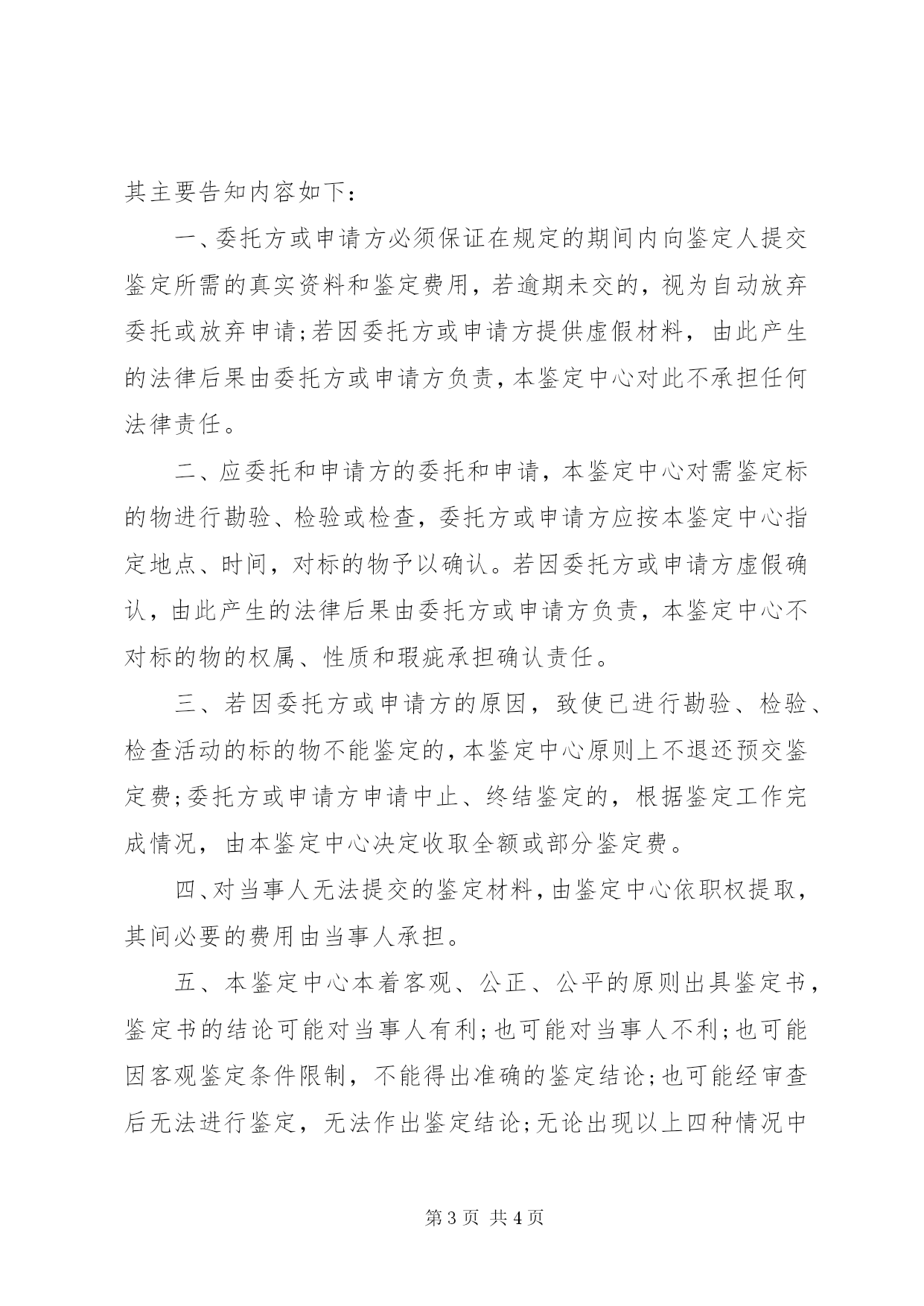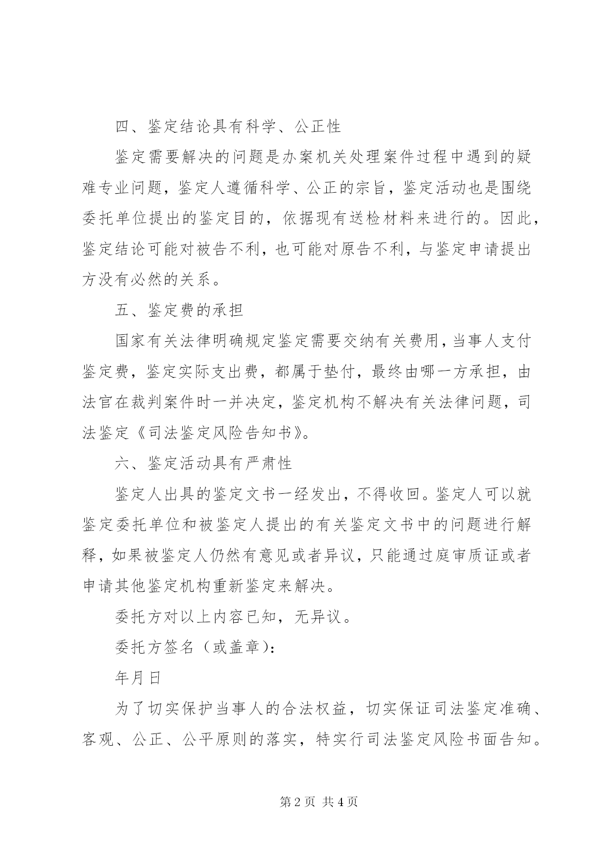 第PAGE\*Arabic\*MERGEFORMAT4页共NUMPAGES\*MERGEFORMAT4页司法鉴定风险告知书司法鉴定风险告知书司法鉴定风险告知书根据我国诉讼法的有关规定,司法鉴定是办案机关为了案件中涉及的专门性问题,指派或者聘请专业人员所从事的一项专门诉讼活动,司法鉴定风险告知书。由于鉴定涉及专业问题,因此有必要将其中的一些情况予以告知、提示:一、鉴定结论属于证据鉴定结论是鉴定专家根据相关学科的专业知识,依据法律规定,客观、公正、科学地提出的专业性意见,属于法律规定证据之一。是否成为定案的根据,取决于法官的审查和判断,鉴定人并无决定权和影响法官采信鉴定结论的能力。如果法官不予采信,根据诉讼法的规定,法官有权启动新的鉴定程序。二、法医学鉴定一般需要检查被鉴定人的身体法医学鉴定除了需要审查送检的鉴定资料之外,一般需要对被鉴定人的身体进行必要的检查或者做必要的辅助检查,特殊情况下才实施书面鉴定。有关费用由被鉴定人先行垫付。请被鉴定人予以配合。三、鉴定可能得出不明确的鉴定结论鉴定结论的提出依赖于委托单位及当事人提交的鉴定材料,有时由于委托方不能按要求补充鉴定材料或或者受客观条件的制约,可能得出不明确的鉴定结论。四、鉴定结论具有科学、公正性鉴定需要解决的问题是办案机关处理案件过程中遇到的疑难专业问题,鉴定人遵循科学、公正的宗旨,鉴定活动也是围绕委托单位提出的鉴定目的,依据现有送检材料来进行的。因此,鉴定结论可能对被告不利,也可能对原告不利,与鉴定申请提出方没有必然的关系。五、鉴定费的承担国家有关法律明确规定鉴定需要交纳有关费用,当事人支付鉴定费,鉴定实际支出费,都属于垫付,最终由哪一方承担,由法官在裁判案件时一并决定,鉴定机构不解决有关法律问题,司法鉴定《司法鉴定风险告知书》。六、鉴定活动具有严肃性鉴定人出具的鉴定文书一经发出,不得收回。鉴定人可以就鉴定委托单位和被鉴定人提出的有关鉴定文书中的问题进行解释,如果被鉴定人仍然有意见或者异议,只能通过庭审质证或者申请其他鉴定机构重新鉴定来解决。委托方对以上内容已知,无异议。委托方签名(或盖章):年月日为了切实保护当事人的合法权益,切实保证司法鉴定准确、客观、公正、公平原则的落实,特实行司法鉴定风险书面告知。其主要告知内容如下:一、委托方或申请方必须保证在规定的期间内向鉴定人提交鉴定所需的真实资料和鉴定费用,若逾期未交的,视为自动放弃委托或放弃申请;若因委托方或申请方提供虚假材料,由此产生的法律后果由委托方或申请方负责,本鉴定中心对此不承担任何法律责任。二、应委托和申请方的委托和申请,本鉴定中心对需鉴定标的物进行勘验、检验或检查,委托方或申请方应按本鉴定中心指定地点、时间,对标的物予以确认。若因委托方或申请方虚假确认,由此产生的法律后果由委托方或申请方负责,本鉴定中心不对标的物的权属、性质和瑕疵承担确认责任。三、若因委托方或申请方的原因,致使已进行勘验、检验、检查活动的标的物不能鉴定的,本鉴定中心原则上不退还预交鉴定费;委托方或申请方申请中止、终结鉴定的,根据鉴定工作完成情况,由本鉴定中心决定收取全额或部分鉴定费。四、对当事人无法提交的鉴定材料,由鉴定中心依职权提取,其间必要的费用由当事人承担。五、本鉴定中心本着客观、公正、公平的原则出具鉴定书,鉴定书的结论可能对当事人有利;也可能对当事人不利;也可能因客观鉴定条件限制,不能得出准确的鉴定结论;也可能经审查后无法进行鉴定,无法作出鉴定结论;无论出现以上四种情况中的任何一种,当事人均不得无理取闹或拒交鉴定费。若当事人确对鉴定结论不服的,应按法律规定的程序申请上级鉴定机构复核鉴定。六、因鉴定客观条件限制,本中心无法进行鉴定的,本鉴定中心可拒绝鉴定。七、以上司法鉴定风险情况,司法鉴定中心均已告知,我已知悉,并同意以上告知内容。告知单位:恩施州司法鉴定中心被告知人签名(章):年月日