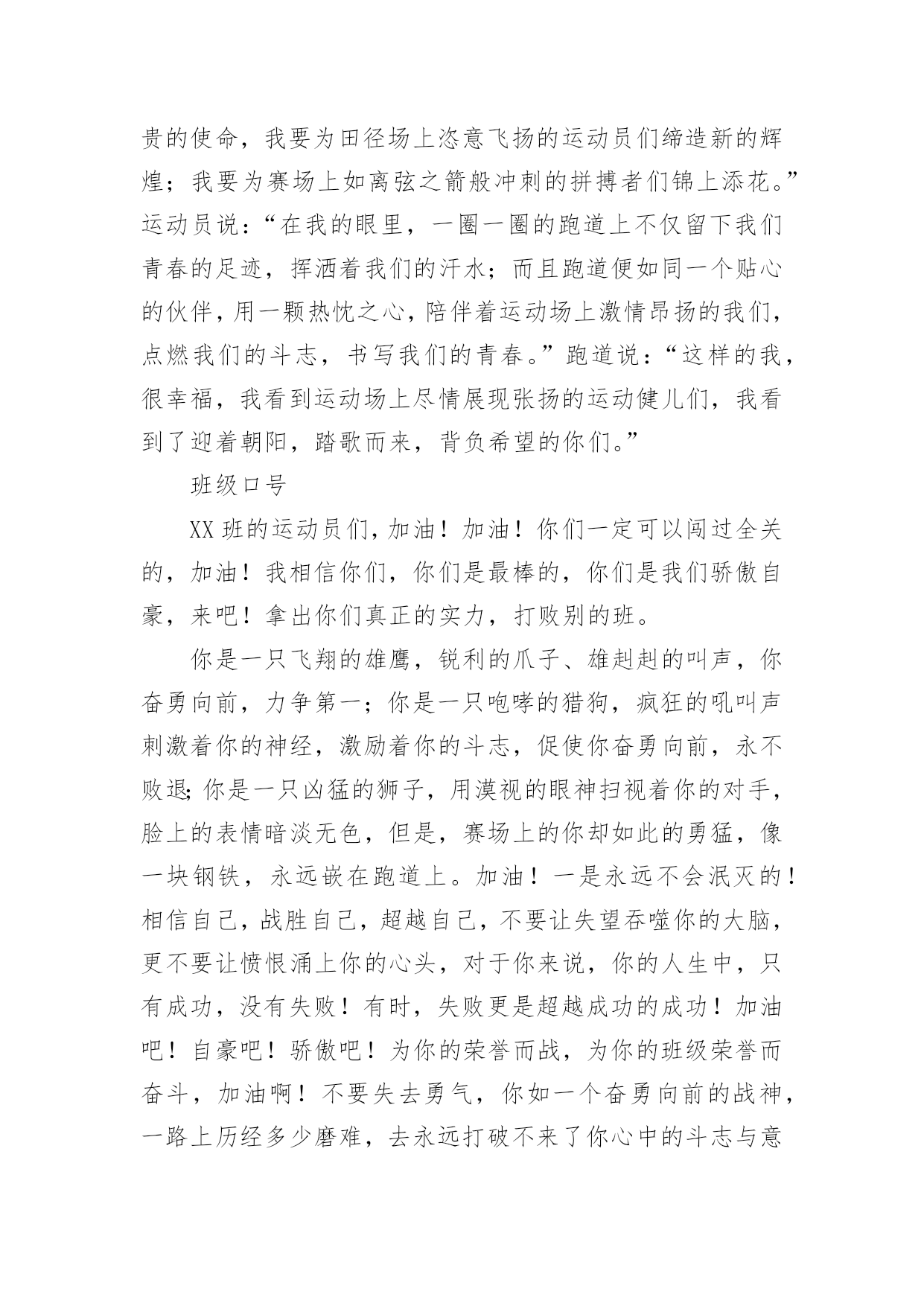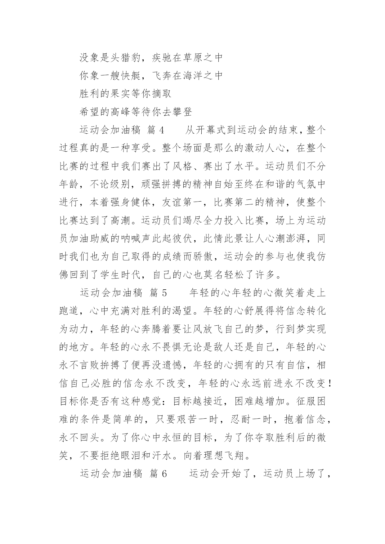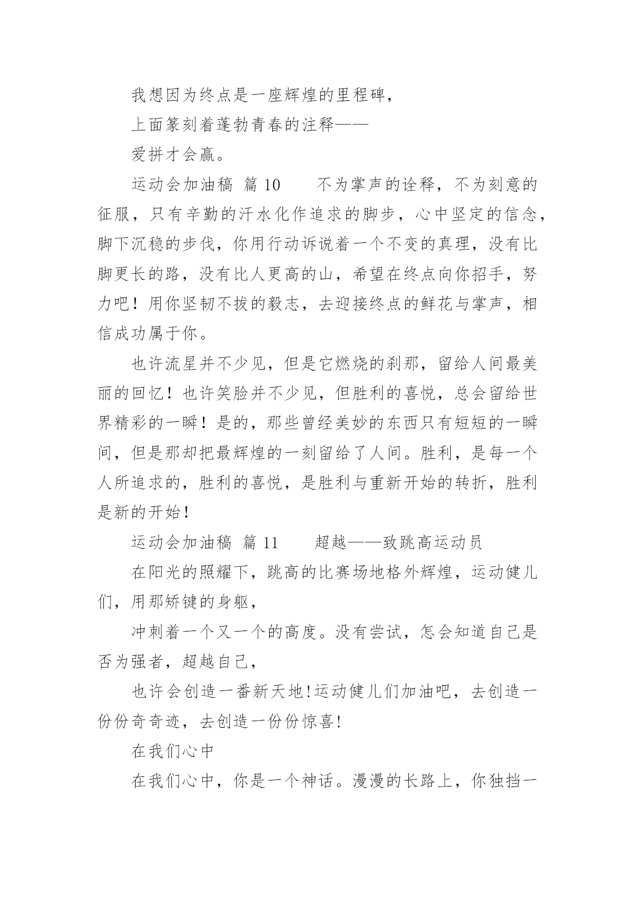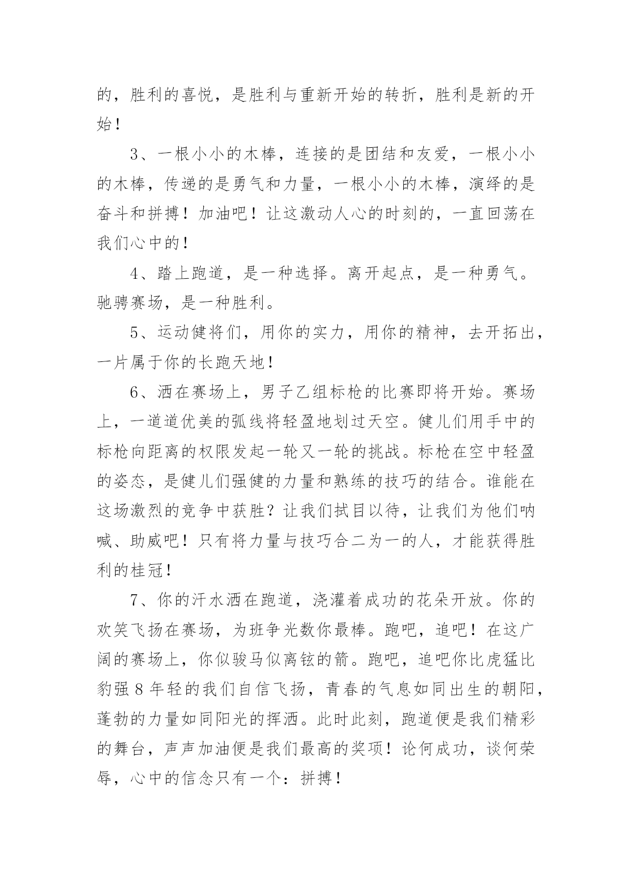 运动会加油稿有关运动会加油稿(精选20篇)在社会一步步向前发展的今天,需要使用加油稿的场合越来越多,加油稿可以给予对方克服困难的勇气和信心。你所见过的加油稿是什么样的呢?下面是小编为大家整理的有关运动会加油稿(精选20篇),希望对大家有所帮助。运动会加油稿篇1一圈又一圈的坚持毅力与精神活跃在会场上湿透的衣衫满头的大汗无限追求奋力追赶我们为你欢呼跳跃我们为你骄傲运动会加油稿篇2避开所有的掌声和目光远离胜利者的灿烂和辉煌如果说生命也是一场竞争我参与也曾把竞争的滋味品尝那么,让我也抬起头甩掉心中的压抑下次运动员我仍会同你较量运动会加油稿篇3你象一颗金星,闪烁在宇宙之中你象一匹骏马,驰骋在战场之中没象是头猎豹,疾驰在草原之中你象一艘快艇,飞奔在海洋之中胜利的果实等你摘取希望的高峰等待你去攀登运动会加油稿篇4从开幕式到运动会的结束,整个过程真的是一种享受。整个场面是那么的激动人心,在整个比赛的过程中我们赛出了风格、赛出了水平。运动员们不分年龄,不论级别,顽强拼搏的精神自始至终在和谐的气氛中进行,本着强身健体,友谊第一,比赛第二的精神,使整个比赛达到了高潮。运动员们竭尽全力投入比赛,场上为运动员加油助威的呐喊声此起彼伏,此情此景让人心潮澎湃,同时我们也为自己取得的成绩而骄傲,运动会的参与也使我仿佛回到了学生时代,自己的心也莫名轻松了许多。运动会加油稿篇5年轻的心年轻的心微笑着走上跑道,心中充满对胜利的渴望。年轻的心舒展得将信念转化为动力,年轻的心奔腾着要让风放飞自己的梦,行到梦实现的地方。年轻的心永不畏惧无论是敌人还是自己,年轻的心永不言败拚搏了便再没遗憾,年轻的心拥有的只有自信,相信自己必胜的信念永不改变,年轻的心永远前进永不改变!目标你是否有这种感觉:目标越接近,困难越增加。征服困难的条件是简单的,只要艰苦一时,忍耐一时,抱着信念,永不回头。为了你心中永恒的目标,为了你夺取胜利后的微笑,不要拒绝眼泪和汗水。向着理想飞翔。运动会加油稿篇6运动会开始了,运动员上场了,他们在赛道上是那样拼搏,是那样努力,是那样坚强,他们给我们留下的是拼搏的精神,留下的是滚烫的汗珠。运动会上,是运动员让我懂得了坚持,坚持是一种美德,是一种品质,更是一种伟大的力量。面对挫折,千万不要将微笑忘记,不要放弃。笑对人生,是一种坚韧不拔的意志改变当前的机遇和生活。滴水穿石,铁杆成针,锲而不舍,金石可镂。坚持是一种伟大的力量,坚持就是希望,坚持到底就是胜利,只要我们坚持这个信念,不断努力,便会感到生活因你的存在而精彩。加油!加油!加油!我们为你欢呼,我们为你喝彩,你们是最棒的!!!运动会加油稿篇7人生如赛场,路途似跑道。在这秋高七爽的季候里,在这阔别都会哗闹的战地,全部的豪情,都在那一阵阵叫嚣声中固结。全部的盼望艘在叫嚣声放飞了。全部的气力也在叫嚣声中固结了。就在鼓动感动的喊声中,运发动们担当了顺次次的挑衅,顺次次逾越了自我。他们以本身的举措,充实显现了本身的气力。显现了真我的风范。显现了本身的刚强拼搏的精力。我们等待运发动们乐成的高兴,我们也随时预备奉上失败的勉励,comeon,everyone!让你们的乐成与我们高兴固结在那一秒钟固结,酿成永久!运动会加油稿篇8在这秋高七爽的季节里,在这远离城市喧嚣的战地,所有的激情,都在那一阵阵呐喊声中凝结;所有的期望艘在呐喊声放飞了;所有的力量也在呐喊声中凝结了。就在激昂的喊声中,运动员们理解了依次次的挑战,依次次超越了自我。他们以自己的行动,充分展现了自己的实力。展现了真我的风采。展现了自己的坚强拼搏的精神。我们期盼运动员们成功的喜悦,我们也随时准备送上失败的鼓励!让你们的成功与我们喜悦凝结在那一秒钟凝结,变成永恒!运动会加油稿篇9你是运动场的心脏,跳动梦想;你是漫长路的精神,激励辉煌;你们是将上下求索的人!风为你加油,云为你助兴,坚定,执着,耐力与希望,在延伸的白色跑道中点点凝聚!力量,信念,拼搏与奋斗,在遥远的终点线上渐渐明亮!时代的强音正在你的脚下踏响。爱拼才会赢——致长跑运动员望着绿茵场上你愈渐沉重的步伐,赛前鼓励你的豪言壮语已变得苍白无力,此刻的我只有沉默,只能在心底为你默默地祈祷和祝福。明知赛场上的五千米是你的极限,你为什么还要义无返顾地去挑战我想因为终点是一座辉煌的里程碑,上面篆刻着蓬勃青春的注释——爱拼才会赢。运动会加油稿篇10不为掌声的诠释,不为刻意的征服,只有辛勤的汗水化作追求的脚步,心中坚定的信念,脚下沉稳的步伐,你用行动诉说着一个不变的真理,没有比脚更长的路,没有比人更高的山,希望在终点向你招手,努力吧!用你坚韧不拔的毅志,去迎接终点的鲜花与掌声,相信成功属于你。也许流星并不少见,但是它燃烧的刹那,留给人间最美丽的回忆!也许笑脸并不少见,但胜利的喜悦,总会留给世界精彩的一瞬!是的,那些曾经美妙的东西