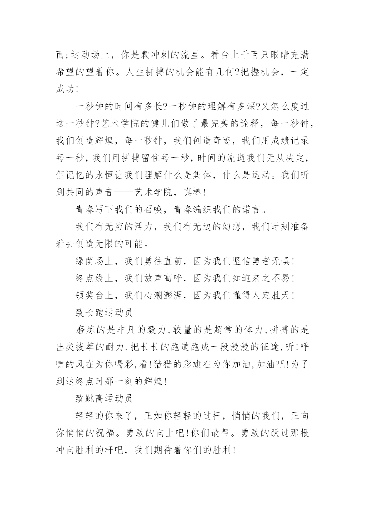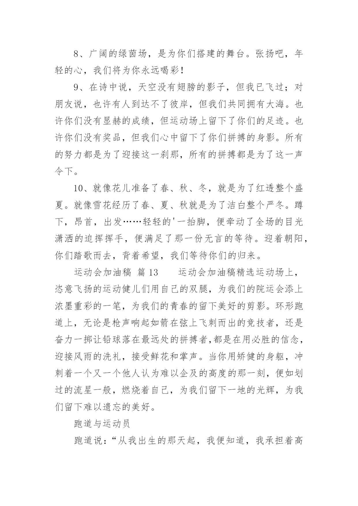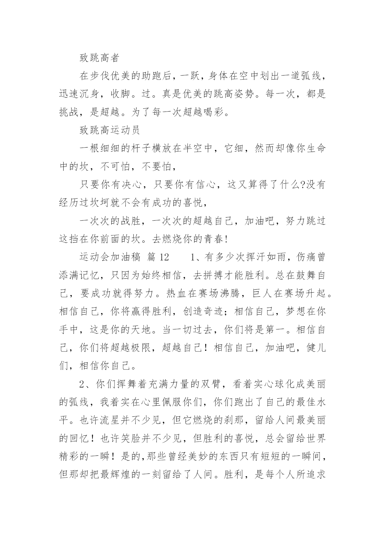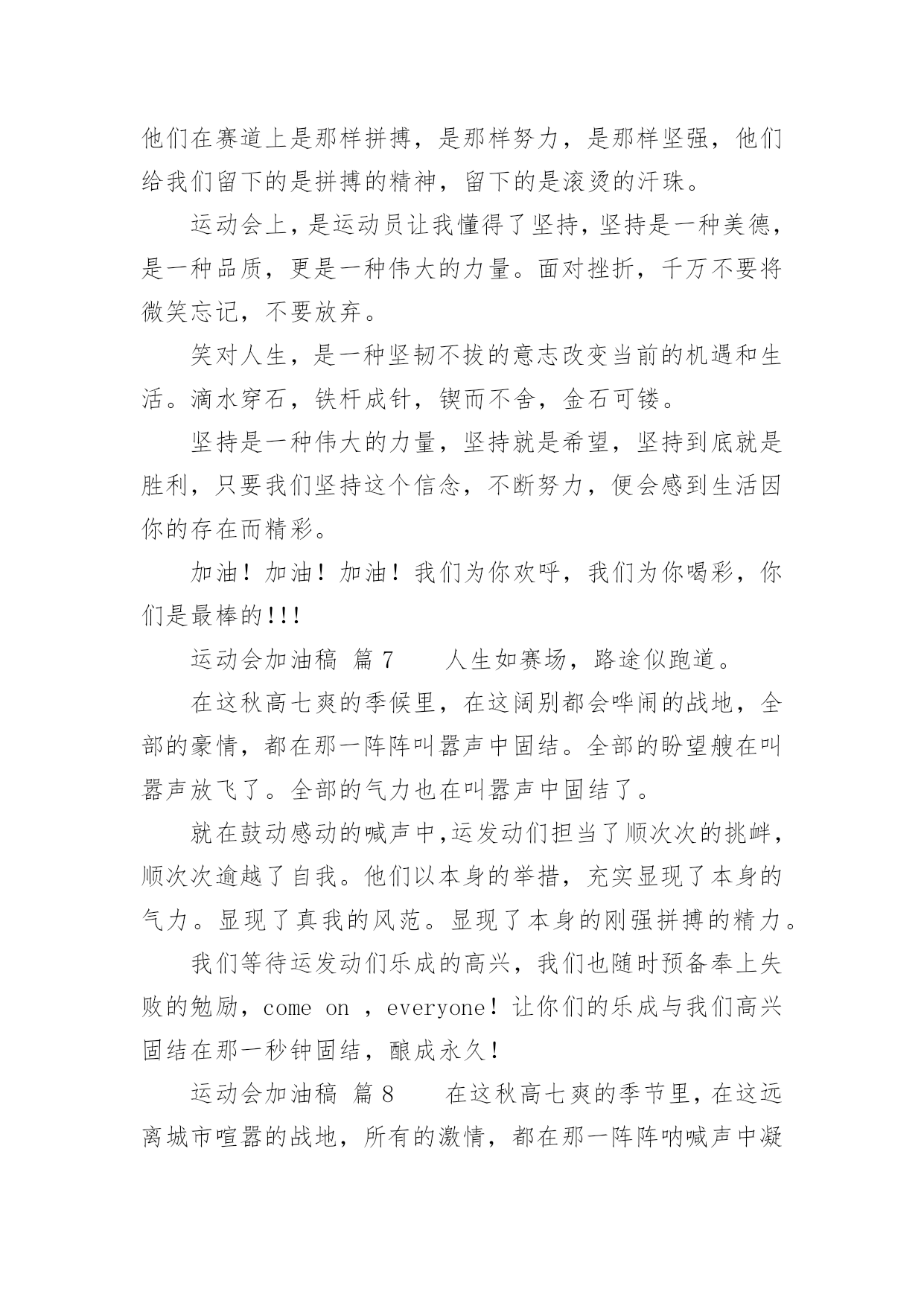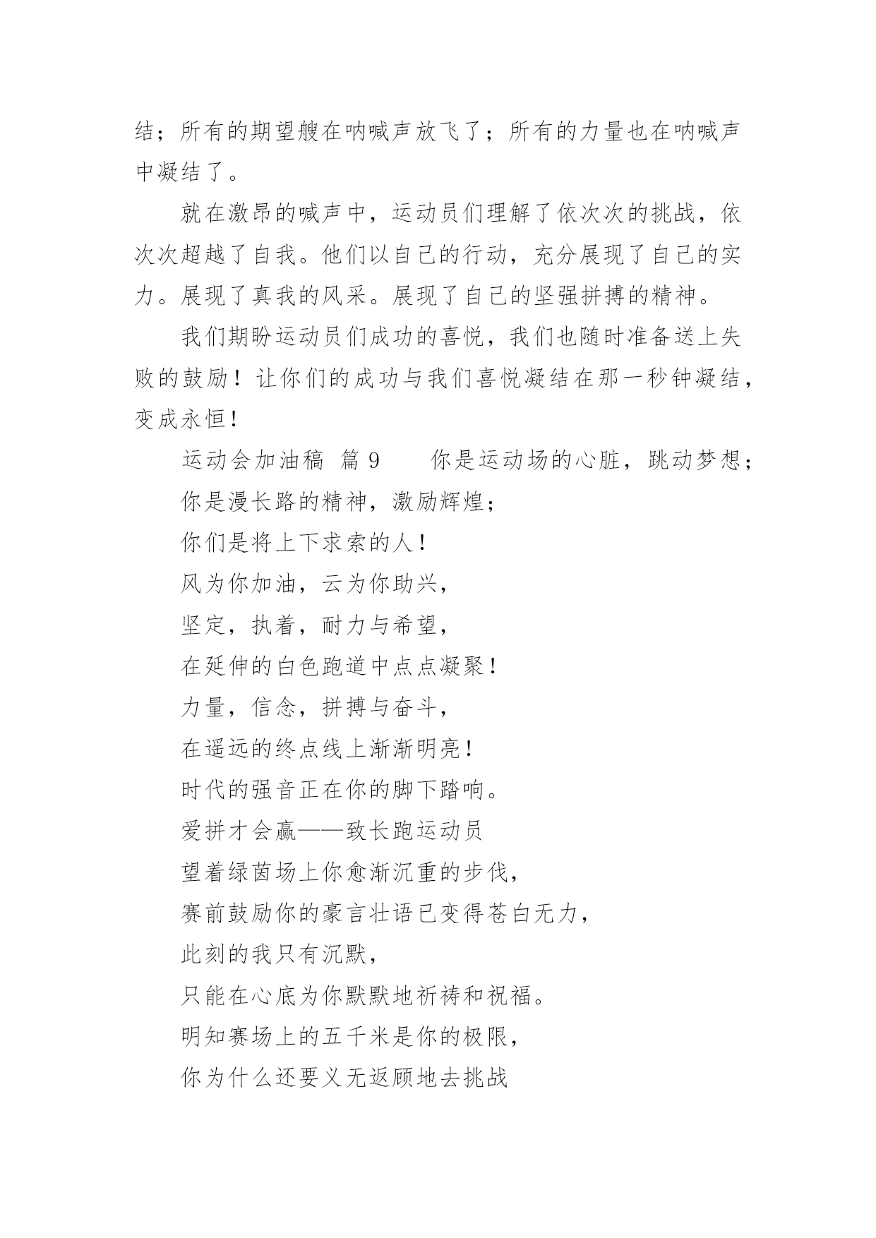 运动会加油稿有关运动会加油稿(精选20篇)在社会一步步向前发展的今天,需要使用加油稿的场合越来越多,加油稿可以给予对方克服困难的勇气和信心。你所见过的加油稿是什么样的呢?下面是小编为大家整理的有关运动会加油稿(精选20篇),希望对大家有所帮助。运动会加油稿篇1一圈又一圈的坚持毅力与精神活跃在会场上湿透的衣衫满头的大汗无限追求奋力追赶我们为你欢呼跳跃我们为你骄傲运动会加油稿篇2避开所有的掌声和目光远离胜利者的灿烂和辉煌如果说生命也是一场竞争我参与也曾把竞争的滋味品尝那么,让我也抬起头甩掉心中的压抑下次运动员我仍会同你较量运动会加油稿篇3你象一颗金星,闪烁在宇宙之中你象一匹骏马,驰骋在战场之中没象是头猎豹,疾驰在草原之中你象一艘快艇,飞奔在海洋之中胜利的果实等你摘取希望的高峰等待你去攀登运动会加油稿篇4从开幕式到运动会的结束,整个过程真的是一种享受。整个场面是那么的激动人心,在整个比赛的过程中我们赛出了风格、赛出了水平。运动员们不分年龄,不论级别,顽强拼搏的精神自始至终在和谐的气氛中进行,本着强身健体,友谊第一,比赛第二的精神,使整个比赛达到了高潮。运动员们竭尽全力投入比赛,场上为运动员加油助威的呐喊声此起彼伏,此情此景让人心潮澎湃,同时我们也为自己取得的成绩而骄傲,运动会的参与也使我仿佛回到了学生时代,自己的心也莫名轻松了许多。运动会加油稿篇5年轻的心年轻的心微笑着走上跑道,心中充满对胜利的渴望。年轻的心舒展得将信念转化为动力,年轻的心奔腾着要让风放飞自己的梦,行到梦实现的地方。年轻的心永不畏惧无论是敌人还是自己,年轻的心永不言败拚搏了便再没遗憾,年轻的心拥有的只有自信,相信自己必胜的信念永不改变,年轻的心永远前进永不改变!目标你是否有这种感觉:目标越接近,困难越增加。征服困难的条件是简单的,只要艰苦一时,忍耐一时,抱着信念,永不回头。为了你心中永恒的目标,为了你夺取胜利后的微笑,不要拒绝眼泪和汗水。向着理想飞翔。运动会加油稿篇6运动会开始了,运动员上场了,他们在赛道上是那样拼搏,是那样努力,是那样坚强,他们给我们留下的是拼搏的精神,留下的是滚烫的汗珠。运动会上,是运动员让我懂得了坚持,坚持是一种美德,是一种品质,更是一种伟大的力量。面对挫折,千万不要将微笑忘记,不要放弃。笑对人生,是一种坚韧不拔的意志改变当前的机遇和生活。滴水穿石,铁杆成针,锲而不舍,金石可镂。坚持是一种伟大的力量,坚持就是希望,坚持到底就是胜利,只要我们坚持这个信念,不断努力,便会感到生活因你的存在而精彩。加油!加油!加油!我们为你欢呼,我们为你喝彩,你们是最棒的!!!运动会加油稿篇7人生如赛场,路途似跑道。在这秋高七爽的季候里,在这阔别都会哗闹的战地,全部的豪情,都在那一阵阵叫嚣声中固结。全部的盼望艘在叫嚣声放飞了。全部的气力也在叫嚣声中固结了。就在鼓动感动的喊声中,运发动们担当了顺次次的挑衅,顺次次逾越了自我。他们以本身的举措,充实显现了本身的气力。显现了真我的风范。显现了本身的刚强拼搏的精力。我们等待运发动们乐成的高兴,我们也随时预备奉上失败的勉励,comeon,everyone!让你们的乐成与我们高兴固结在那一秒钟固结,酿成永久!运动会加油稿篇8在这秋高七爽的季节里,在这远离城市喧嚣的战地,所有的激情,都在那一阵阵呐喊声中凝结;所有的期望艘在呐喊声放飞了;所有的力量也在呐喊声中凝结了。就在激昂的喊声中,运动员们理解了依次次的挑战,依次次超越了自我。他们以自己的行动,充分展现了自己的实力。展现了真我的风采。展现了自己的坚强拼搏的精神。我们期盼运动员们成功的喜悦,我们也随时准备送上失败的鼓励!让你们的成功与我们喜悦凝结在那一秒钟凝结,变成永恒!运动会加油稿篇9你是运动场的心脏,跳动梦想;你是漫长路的精神,激励辉煌;你们是将上下求索的人!风为你加油,云为你助兴,坚定,执着,耐力与希望,在延伸的白色跑道中点点凝聚!力量,信念,拼搏与奋斗,在遥远的终点线上渐渐明亮!时代的强音正在你的脚下踏响。爱拼才会赢——致长跑运动员望着绿茵场上你愈渐沉重的步伐,赛前鼓励你的豪言壮语已变得苍白无力,此刻的我只有沉默,只能在心底为你默默地祈祷和祝福。明知赛场上的五千米是你的极限,你为什么还要义无返顾地去挑战我想因为终点是一座辉煌的里程碑,上面篆刻着蓬勃青春的注释——爱拼才会赢。运动会加油稿篇10不为掌声的诠释,不为刻意的征服,只有辛勤的汗水化作追求的脚步,心中坚定的信念,脚下沉稳的步伐,你用行动诉说着一个不变的真理,没有比脚更长的路,没有比人更高的山,希望在终点向你招手,努力吧!用你坚韧不拔的毅志,去迎接终点的鲜花与掌声,相信成功属于你。也许流星并不少见,但是它燃烧的刹那,留给人间最美丽的回忆!也许笑脸并不少见,但胜利的喜悦,总会留给世界精彩的一瞬!是的,那些曾经美妙的东西