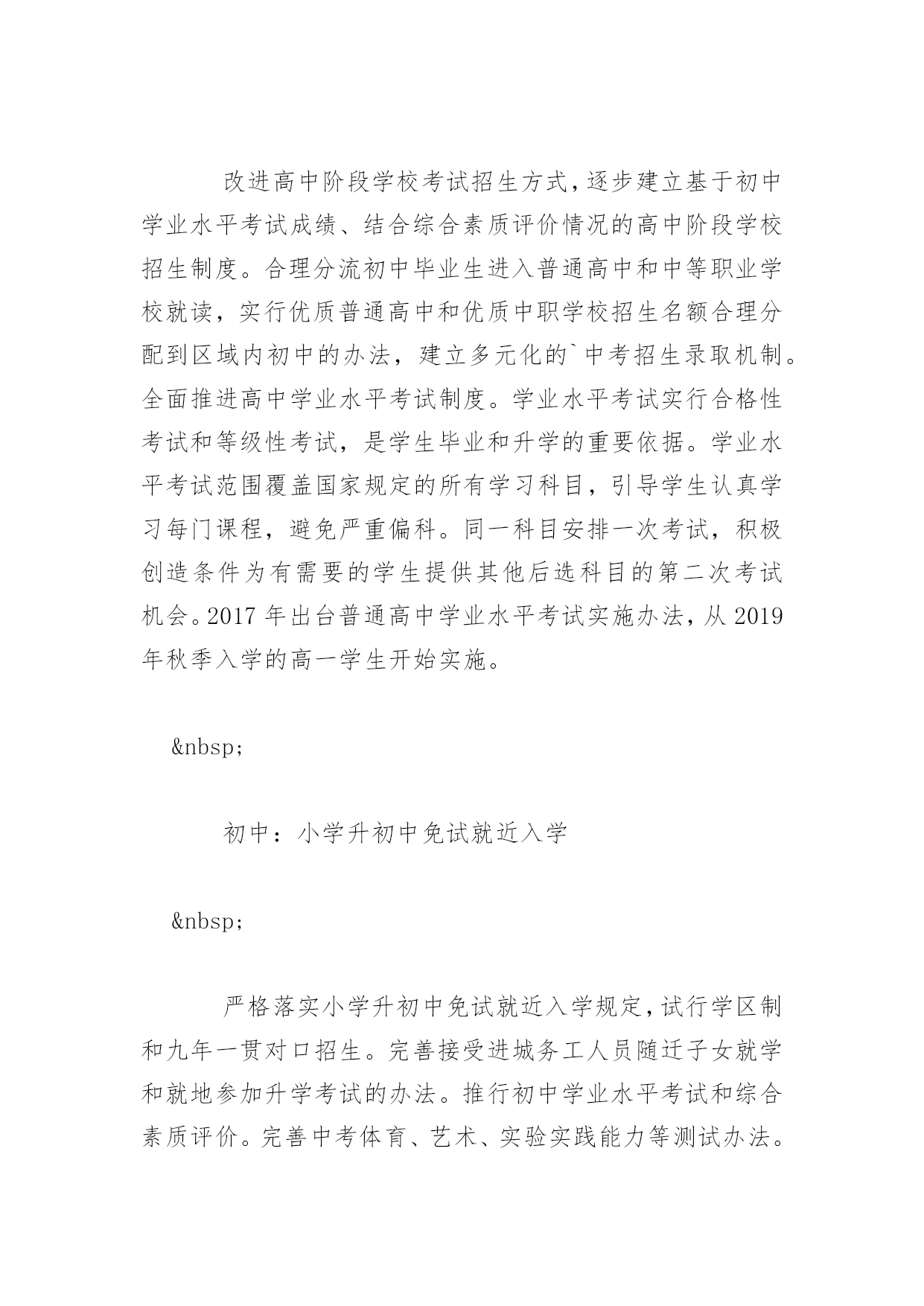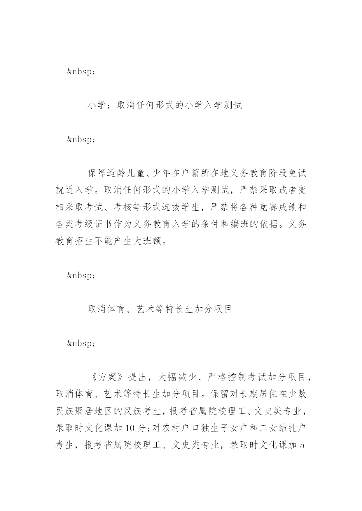 甘肃高考改革启动改革 高考:2019年启动综合改革将取消文理分科 《方案》明确,2019年6月底前,出台甘肃省普通高等学校考试招生综合改革实施方案,从2019年秋季入学的高一学生开始实施,逐步形成符合甘肃实际的普通高校考试招生制度。增强高考与高中学习的关联度,考生总成绩由统一高考的语文、数学、外语3个科目成绩和高中学业水平考试3个科目成绩组成。保持统一高考的语文、数学、外语科目不变,分值不变,不分文理科,外语科目提供两次考试机会。计入总成绩的高中学业水平考试科目,由考生根据报考高校专业要求和自身特长,在思想政治、历史、地理、物理、化学、生物等科目中自主选择3门。 高中:建立多元化中考招生录取机制 改进高中阶段学校考试招生方式,逐步建立基于初中学业水平考试成绩、结合综合素质评价情况的高中阶段学校招生制度。合理分流初中毕业生进入普通高中和中等职业学校就读,实行优质普通高中和优质中职学校招生名额合理分配到区域内初中的办法,建立多元化的`中考招生录取机制。全面推进高中学业水平考试制度。学业水平考试实行合格性考试和等级性考试,是学生毕业和升学的重要依据。学业水平考试范围覆盖国家规定的所有学习科目,引导学生认真学习每门课程,避免严重偏科。同一科目安排一次考试,积极创造条件为有需要的学生提供其他后选科目的第二次考试机会。2017年出台普通高中学业水平考试实施办法,从2019年秋季入学的高一学生开始实施。 初中:小学升初中免试就近入学 严格落实小学升初中免试就近入学规定,试行学区制和九年一贯对口招生。完善接受进城务工人员随迁子女就学和就地参加升学考试的办法。推行初中学业水平考试和综合素质评价。完善中考体育、艺术、实验实践能力等测试办法。 小学:取消任何形式的小学入学测试 保障适龄儿童、少年在户籍所在地义务教育阶段免试就近入学。取消任何形式的小学入学测试,严禁采取或者变相采取考试、考核等形式选拔学生,严禁将各种竞赛成绩和各类考级证书作为义务教育入学的条件和编班的依据。义务教育招生不能产生大班额。 取消体育、艺术等特长生加分项目 《方案》提出,大幅减少、严格控制考试加分项目,取消体育、艺术等特长生加分项目。保留对长期居住在少数民族聚居地区的汉族考生,报考省属院校理工、文史类专业,录取时文化课加10分;对农村户口独生子女户和二女结扎户考生,报考省属院校理工、文史类专业,录取时文化课加5分的地方性加分项目。同时,对革命老区、少数民族地区和贫困地区的考生,采取专项计划、定向招生等政策予以照顾。同时,规范试点高校自主招生办法、考核程序和录取结果。严格控制自主招生规模,高校自主招生考核统一安排在高考结束后进行。