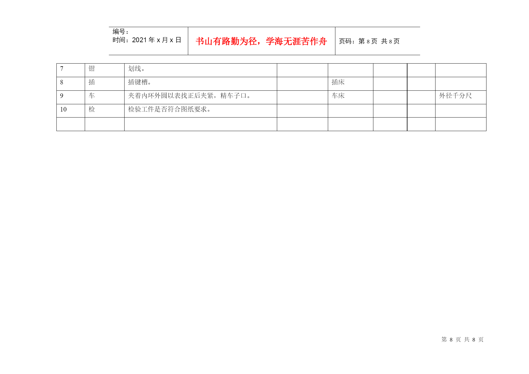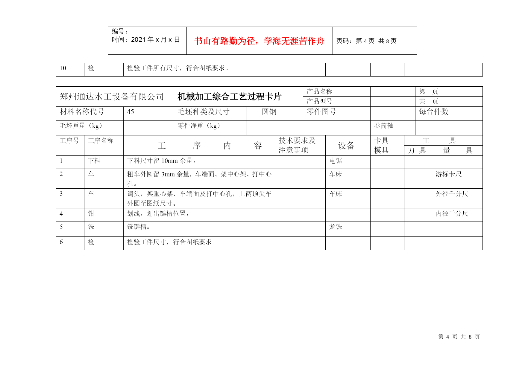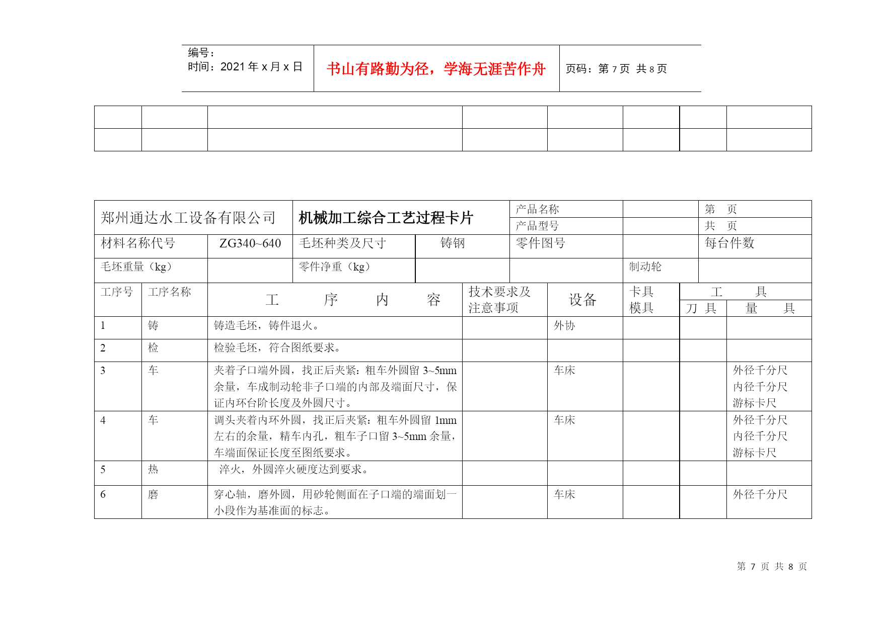 编号:时间:2021年x月x日书山有路勤为径,学海无涯苦作舟页码:第PAGE8页共NUMPAGES8页第PAGE\*MERGEFORMAT8页共NUMPAGES\*MERGEFORMAT8页(3)关键工艺质量经验与手段以及现有的工艺水平启闭机加工工艺郑州通达水工设备有限公司机械加工综合工艺过程卡片产品名称第页产品型号共页材料名称代号HT200毛坯种类及尺寸铸铁零件图号每台件数毛坯重量(kg)零件净重(kg)滑轮工序号工序名称工序内容技术要求及注意事项设备卡具模具工具刀具量具1铸铸造毛坯,铸件退火。外协2检检验毛坯。符合图纸要求。3车用四爪卡盘夹着一侧轮缘,用划针盘找筋板平面及滑轮外圆,找正后夹紧工件:车另一侧轮缘外圆、端面、滑轮绳槽及内孔至图纸尺寸。车床外径千分尺内径千分尺游标卡尺4车调头,夹着另一侧轮缘,以内孔找正,夹紧工件。车滑轮缘外圆及端面至尺寸要求。车床外径千分尺游标卡尺5检检查工件所有尺寸,符合图纸要求。郑州通达水工设备有限公司机械加工综合工艺过程卡片产品名称第页产品型号共页材料名称代号HT200毛坯种类及尺寸铸铁零件图号每台件数毛坯重量(kg)零件净重(kg)卷筒工序号工序名称工序内容技术要求及注意事项设备卡具模具工具刀具量具1铸铸造毛坯,铸件退火。外协2检检验毛坯是否符合图纸要求。3钳清理铸件毛刺。4钳划线,在法兰头及小头划出十字线。5镗以十字线找正,找正后夹紧工件,镗中心孔至图纸要求,铣端面。镗床内径千分尺6车顶尖顶着中心孔,用划针盘找法兰头十字线,分两次找正,找正后,夹紧工件:车端面,总长留10mm余量,精车外圆留4~6mm余量;调头,夹着外圆,用表校正,另一头架中心架,车端面、外径,保证长度至图纸要求。车床外径千分尺内径千分尺游标卡尺7车顶尖顶着中心孔,找正,四爪卡盘夹紧法兰:精车外圆至图纸尺寸要求;车绳槽,保证图纸尺寸。车床外径千分尺游标卡尺郑州通达水工设备有限公司机械加工综合工艺过程卡片产品名称第页产品型号共页材料名称代号毛坯种类及尺寸铸钢零件图号每台件数毛坯重量(kg)零件净重(kg)大齿轮工序号工序名称工序内容技术要求及注意事项设备卡具模具工具刀具量具1铸铸造毛坯,铸件退火。外协2检检验毛坯,符合图纸要求。3车用四爪卡盘夹着无止口一侧外圆,用划针盘找正筋板平面后夹紧工件。车另一侧外圆、止口及内孔至图纸尺寸,车端面为基准面。车床外径千分尺内径千分尺游标卡尺4调头,夹着外圆,以外圆找正后夹紧工件:精车外圆至尺寸要求,车端面保证厚度及两端面的平行度至图纸要求。外径千分尺内径千分尺游标卡尺5检检验外圆及踏面尺寸,符合图纸要求。6滚齿以基准面定位,并以内孔找正后夹紧工件:滚齿,符合图纸要求7检检查齿形,符合图纸要求。车床8钳划线,划出键槽位置。9插以基准面定位夹紧工件插键槽,符合图纸要求插床游标卡尺10检检验工件所有尺寸,符合图纸要求。郑州通达水工设备有限公司机械加工综合工艺过程卡片产品名称第页产品型号共页材料名称代号45毛坯种类及尺寸圆钢零件图号每台件数毛坯重量(kg)零件净重(kg)卷筒轴工序号工序名称工序内容技术要求及注意事项设备卡具模具工具刀具量具1下料下料尺寸留10mm余量。电锯2车粗车外圆留3mm余量,车端面。架中心架、打中心孔。车床游标卡尺3车调头,架重心架、车端面及打中心孔,上两顶尖车外圆至图纸尺寸。车床外径千分尺4钳划线,划出键槽位置。内径千分尺5铣铣键槽。龙铣6检检验工件尺寸,符合图纸要求。郑州通达水工设备有限公司机械加工综合工艺过程卡片产品名称第页产品型号共页材料名称代号毛坯种类及尺寸圆钢零件图号每台件数毛坯重量(kg)零件净重(kg)滑轮轴1件工序号工序名称工序内容技术要求及注意事项设备卡具模具工具刀具量具1下料下料尺寸留10mm余量。电锯2车粗车毛坯,车外圆,直径留3~4mm,车端面;调头,车另一端面,长度留5mm余量。车床内、外千分尺游标卡尺3热调质处理硬度达到图纸要求。4车精车外圆留0.2~0.3mm磨削余量;车两端面,保证长度至图纸要求;钻中心孔;两端打B型中心孔。车床5钳划线,划出止轴板槽及油槽位置。6铣铣两槽及油槽至图纸要求。龙铣7磨磨外圆至直径减铬层厚度。磨床外径千分尺8镀铬镀铬厚度留0.02~0.03mm磨削余量。外协9磨磨外圆至尺寸要求。磨床外径千分尺10钳钻油孔;攻油杯螺孔。钻床11检检验工件尺寸,符合图纸要求。郑州通达水工设备有限公司机械加工综合工艺过程卡片产品名称第页产品型号共页材料名称代号40Cr毛坯种类及尺寸圆钢零件图号每台件数毛坯重量(kg)零件净重(kg)小齿轮1件工序号工序名称工序内容技术要求及注意事项设备卡具模具工