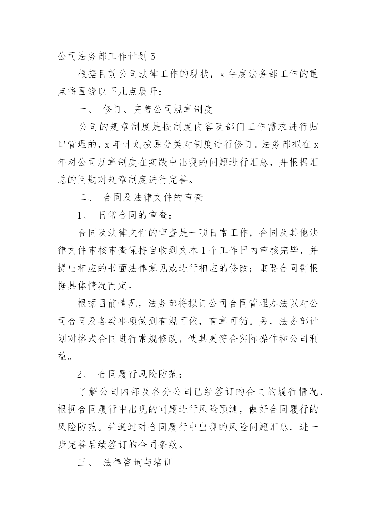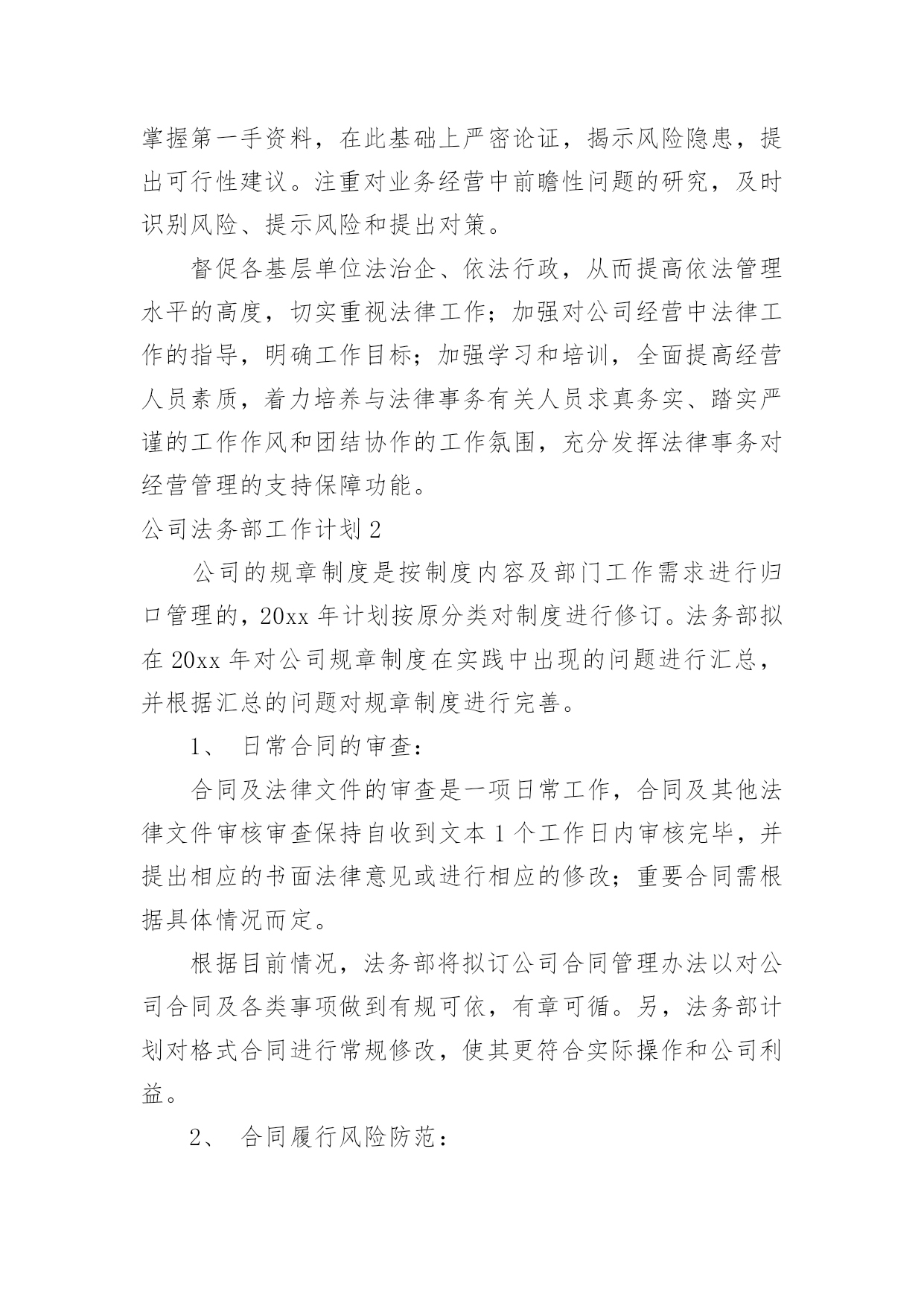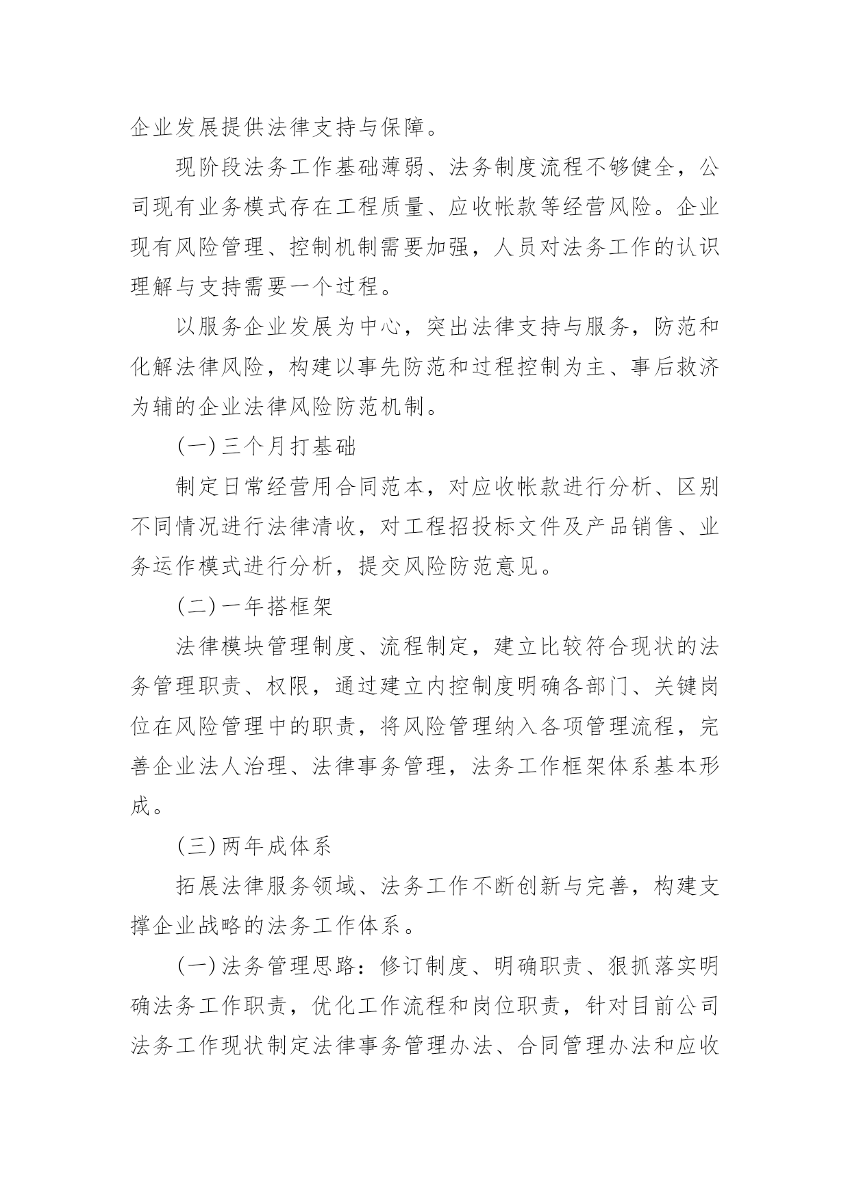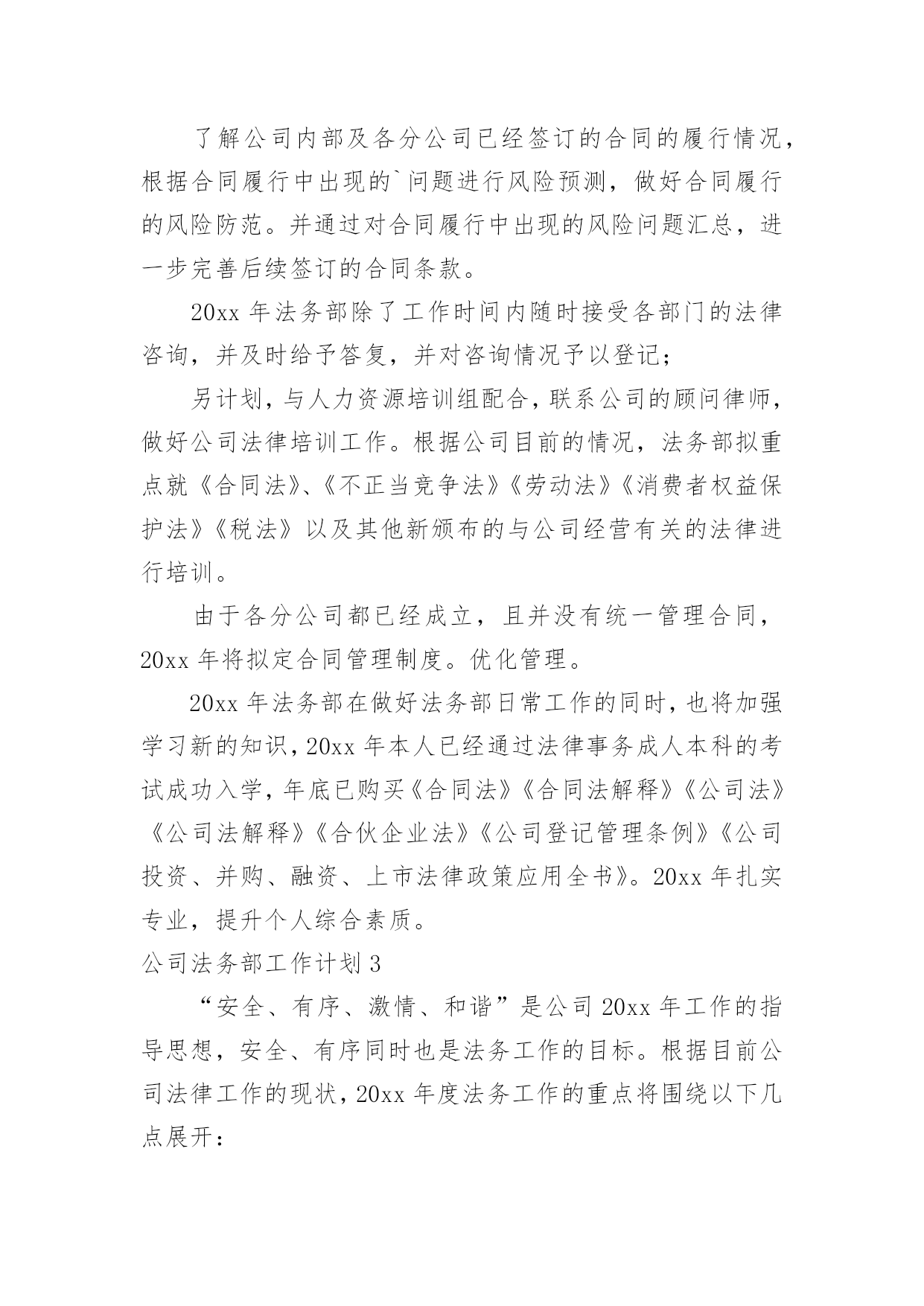 公司法务部工作计划公司法务部工作计划光阴的迅速,一眨眼就过去了,前方等待着我们的是新的机遇和挑战,来为今后的学习制定一份计划。那么计划怎么拟定才能发挥它最大的作用呢?下面是小编为大家收集的公司法务部工作计划,仅供参考,大家一起来看看吧。公司法务部工作计划120xx年,xx法律工作要继续按照公司领导的安排和公司确定的经营目标和工作思路,以“围绕一个中心,落实四个到位,争取两个提升”为指导思想,以推进合规管理,防范、化解法律风险为主线,充分发挥职能作用,为企业经营发展提供高效的法律服务和有力的法律支持。20xx年,建议在公司范围内开展以合同管理为中心的普法教育及培训工作,要以合同管理为主题,密切结合本公司经营管理实际,务实、有效的组织开展,通过活动,在整体上提高员工法律意识和法律素质的同时,积极推进合同管理工作,进而从整体上提高员工依法经营意识和执行操作水平,强化全面风险管理,提高风险防控能力。服务基层要坚持法律审查的独立性,继续做好对合同的审查工作,加大对临摊的监管核查力度,特别要加强对平时管理相对薄弱的业务和环节的法律审查及指导,如有必要做好法律意见书,并督促落实。对公司经营活动中遇到的新问题、新业务、及时提供可行的解决方案,保证经营活动的合法性。充分发挥自身专业优势,通过参与谈判、合同文本起草、发布法律风险提示及法律审查等方式,为经营提供高质量、高效率的`法律服务。加强对合同文本实施工作的指导管理,进一步规范合同文本的使用,不断提升合同质量。按照租赁管理等要求,对合同使用中存在的问题认真整改,同时要把合同的检查作为日常例行工作,并持之以恒,力求关口前移、消除隐患。提高诉讼效益继续加强诉讼论证,提高诉讼效益,杜绝无效益诉讼。继续强化案件管理,全力推进未执结案件的执行,为清收工作提供法律支持,力求胜诉案件执行收回等工作有所突破。改进诉讼管理,要对企业经营,特别是合同案件发生条件及其管理中风险预警进行论证、提出可行的处理办法,为完善合同管理、做好预警反应、及时中止风险提供法律服务。切实防范法律事务工作风险按照法律事务工作自律监管的要求,认真履行自律监管职责,对各公司各部室及分支机构的法律事务工作做好检查,对各项职责范围内的业务做好自查。开展调查研究调研工作要在往年开展的调研工作基础上,改进工作方式,提高调研水平,为领导决策和规范业务操作提供法律支持。加强调研的主动性,多深入基层,了解基层单位在业务经营中遇到的困难和存在的风险隐患,扎实掌握第一手资料,在此基础上严密论证,揭示风险隐患,提出可行性建议。注重对业务经营中前瞻性问题的研究,及时识别风险、提示风险和提出对策。督促各基层单位法治企、依法行政,从而提高依法管理水平的高度,切实重视法律工作;加强对公司经营中法律工作的指导,明确工作目标;加强学习和培训,全面提高经营人员素质,着力培养与法律事务有关人员求真务实、踏实严谨的工作作风和团结协作的工作氛围,充分发挥法律事务对经营管理的支持保障功能。公司法务部工作计划2公司的规章制度是按制度内容及部门工作需求进行归口管理的,20xx年计划按原分类对制度进行修订。法务部拟在20xx年对公司规章制度在实践中出现的问题进行汇总,并根据汇总的问题对规章制度进行完善。1、日常合同的审查:合同及法律文件的审查是一项日常工作,合同及其他法律文件审核审查保持自收到文本1个工作日内审核完毕,并提出相应的书面法律意见或进行相应的修改;重要合同需根据具体情况而定。根据目前情况,法务部将拟订公司合同管理办法以对公司合同及各类事项做到有规可依,有章可循。另,法务部计划对格式合同进行常规修改,使其更符合实际操作和公司利益。2、合同履行风险防范:了解公司内部及各分公司已经签订的合同的履行情况,根据合同履行中出现的`问题进行风险预测,做好合同履行的风险防范。并通过对合同履行中出现的风险问题汇总,进一步完善后续签订的合同条款。20xx年法务部除了工作时间内随时接受各部门的法律咨询,并及时给予答复,并对咨询情况予以登记;另计划,与人力资源培训组配合,联系公司的顾问律师,做好公司法律培训工作。根据公司目前的情况,法务部拟重点就《合同法》、《不正当竞争法》《劳动法》《消费者权益保护法》《税法》以及其他新颁布的与公司经营有关的法律进行培训。由于各分公司都已经成立,且并没有统一管理合同,20xx年将拟定合同管理制度。优化管理。20xx年法务部在做好法务部日常工作的同时,也将加强学习新的知识,20xx年本人已经通过法律事务成人本科的考试成功入学,年底已购买《合同法》《合同法解释》《公司法》《公司法解释》《合伙企业法》《公司登记管理条例》《公司投资、并购、融资、上市法律政策应用全书》。20xx年扎实专业,提升个人综合素质。公司法务部工作计划3“安全、有序、激情、和谐”是公司20xx年
