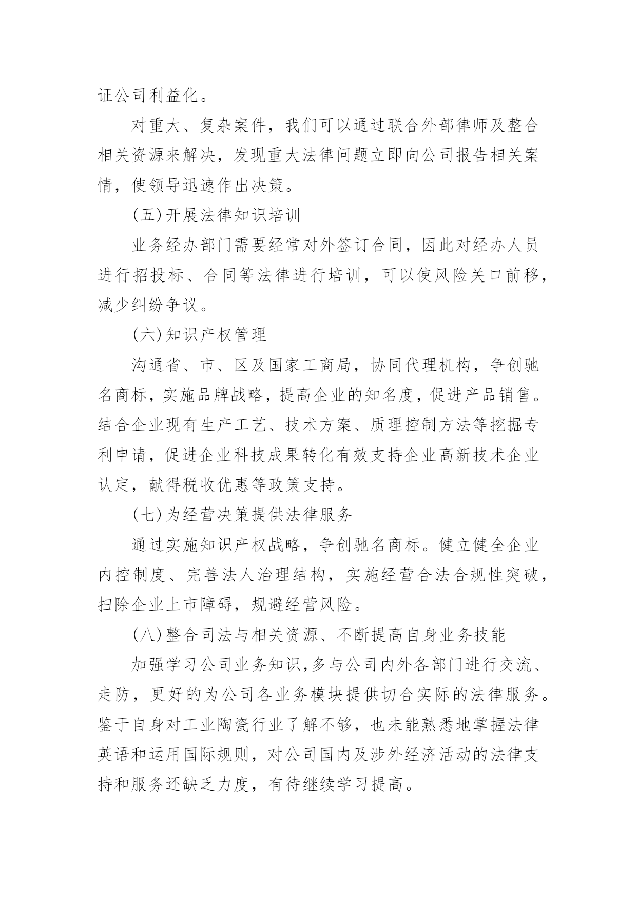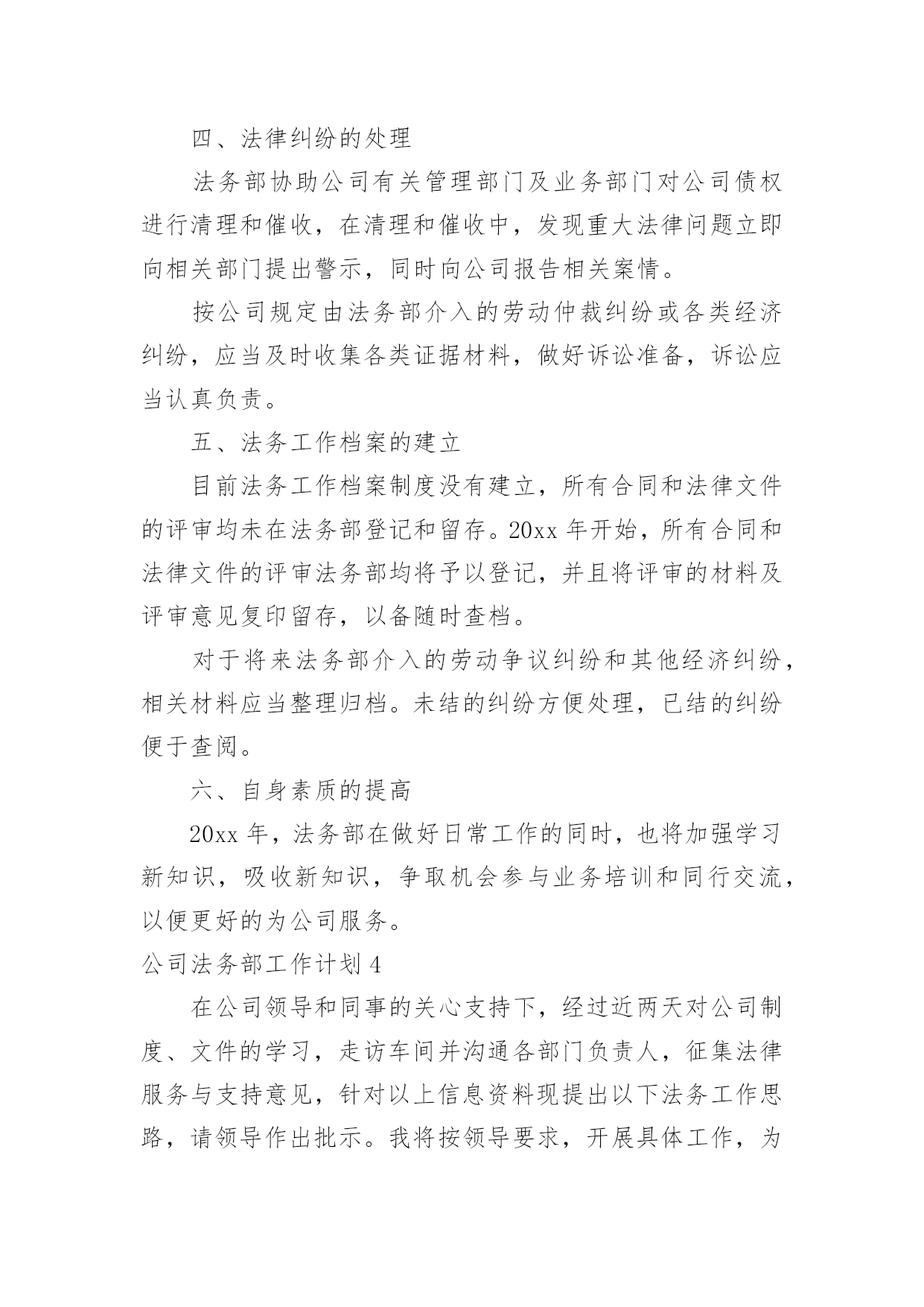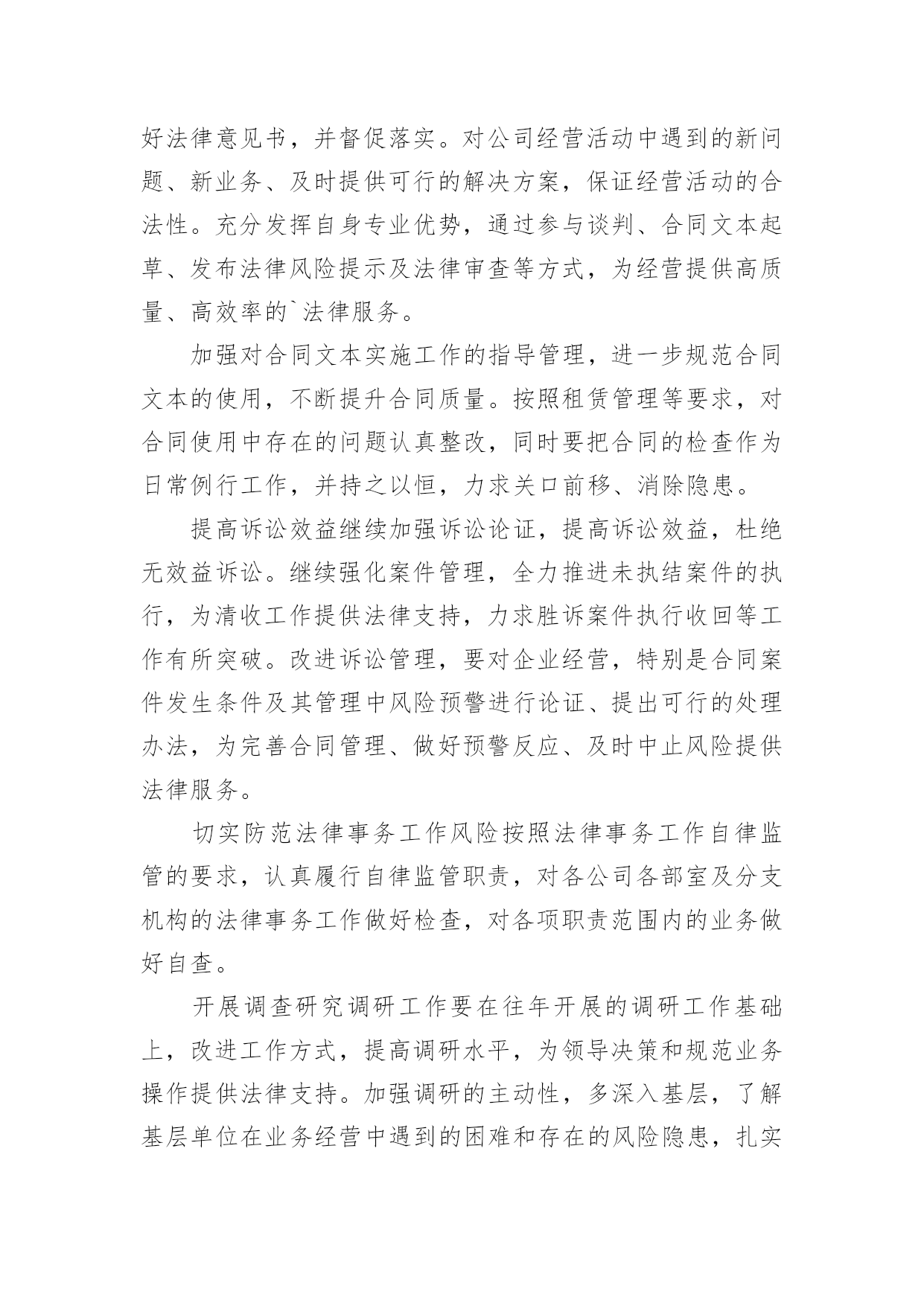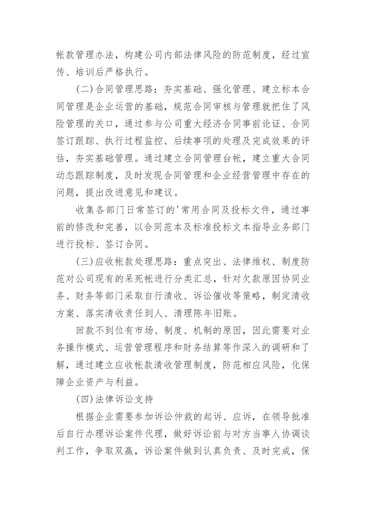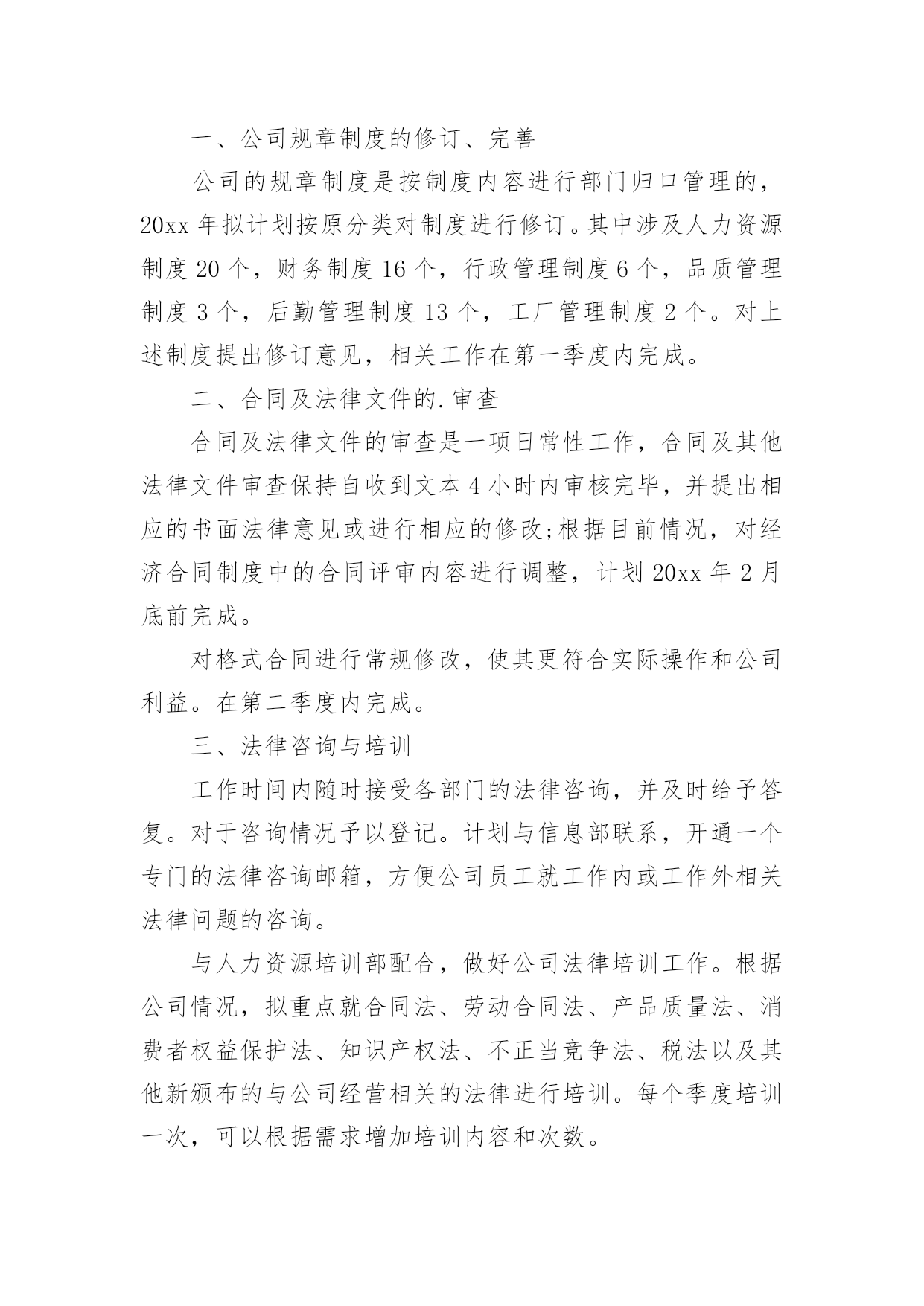公司法务部工作计划公司法务部工作计划光阴的迅速,一眨眼就过去了,前方等待着我们的是新的机遇和挑战,来为今后的学习制定一份计划。那么计划怎么拟定才能发挥它最大的作用呢?下面是小编为大家收集的公司法务部工作计划,仅供参考,大家一起来看看吧。公司法务部工作计划120xx年,xx法律工作要继续按照公司领导的安排和公司确定的经营目标和工作思路,以“围绕一个中心,落实四个到位,争取两个提升”为指导思想,以推进合规管理,防范、化解法律风险为主线,充分发挥职能作用,为企业经营发展提供高效的法律服务和有力的法律支持。20xx年,建议在公司范围内开展以合同管理为中心的普法教育及培训工作,要以合同管理为主题,密切结合本公司经营管理实际,务实、有效的组织开展,通过活动,在整体上提高员工法律意识和法律素质的同时,积极推进合同管理工作,进而从整体上提高员工依法经营意识和执行操作水平,强化全面风险管理,提高风险防控能力。服务基层要坚持法律审查的独立性,继续做好对合同的审查工作,加大对临摊的监管核查力度,特别要加强对平时管理相对薄弱的业务和环节的法律审查及指导,如有必要做好法律意见书,并督促落实。对公司经营活动中遇到的新问题、新业务、及时提供可行的解决方案,保证经营活动的合法性。充分发挥自身专业优势,通过参与谈判、合同文本起草、发布法律风险提示及法律审查等方式,为经营提供高质量、高效率的`法律服务。加强对合同文本实施工作的指导管理,进一步规范合同文本的使用,不断提升合同质量。按照租赁管理等要求,对合同使用中存在的问题认真整改,同时要把合同的检查作为日常例行工作,并持之以恒,力求关口前移、消除隐患。提高诉讼效益继续加强诉讼论证,提高诉讼效益,杜绝无效益诉讼。继续强化案件管理,全力推进未执结案件的执行,为清收工作提供法律支持,力求胜诉案件执行收回等工作有所突破。改进诉讼管理,要对企业经营,特别是合同案件发生条件及其管理中风险预警进行论证、提出可行的处理办法,为完善合同管理、做好预警反应、及时中止风险提供法律服务。切实防范法律事务工作风险按照法律事务工作自律监管的要求,认真履行自律监管职责,对各公司各部室及分支机构的法律事务工作做好检查,对各项职责范围内的业务做好自查。开展调查研究调研工作要在往年开展的调研工作基础上,改进工作方式,提高调研水平,为领导决策和规范业务操作提供法律支持。加强调研的主动性,多深入基层,了解基层单位在业务经营中遇到的困难和存在的风险隐患,扎实掌握第一手资料,在此基础上严密论证,揭示风险隐患,提出可行性建议。注重对业务经营中前瞻性问题的研究,及时识别风险、提示风险和提出对策。督促各基层单位法治企、依法行政,从而提高依法管理水平的高度,切实重视法律工作;加强对公司经营中法律工作的指导,明确工作目标;加强学习和培训,全面提高经营人员素质,着力培养与法律事务有关人员求真务实、踏实严谨的工作作风和团结协作的工作氛围,充分发挥法律事务对经营管理的支持保障功能。公司法务部工作计划2公司的规章制度是按制度内容及部门工作需求进行归口管理的,20xx年计划按原分类对制度进行修订。法务部拟在20xx年对公司规章制度在实践中出现的问题进行汇总,并根据汇总的问题对规章制度进行完善。1、日常合同的审查:合同及法律文件的审查是一项日常工作,合同及其他法律文件审核审查保持自收到文本1个工作日内审核完毕,并提出相应的书面法律意见或进行相应的修改;重要合同需根据具体情况而定。根据目前情况,法务部将拟订公司合同管理办法以对公司合同及各类事项做到有规可依,有章可循。另,法务部计划对格式合同进行常规修改,使其更符合实际操作和公司利益。2、合同履行风险防范:了解公司内部及各分公司已经签订的合同的履行情况,根据合同履行中出现的`问题进行风险预测,做好合同履行的风险防范。并通过对合同履行中出现的风险问题汇总,进一步完善后续签订的合同条款。20xx年法务部除了工作时间内随时接受各部门的法律咨询,并及时给予答复,并对咨询情况予以登记;另计划,与人力资源培训组配合,联系公司的顾问律师,做好公司法律培训工作。根据公司目前的情况,法务部拟重点就《合同法》、《不正当竞争法》《劳动法》《消费者权益保护法》《税法》以及其他新颁布的与公司经营有关的法律进行培训。由于各分公司都已经成立,且并没有统一管理合同,20xx年将拟定合同管理制度。优化管理。20xx年法务部在做好法务部日常工作的同时,也将加强学习新的知识,20xx年本人已经通过法律事务成人本科的考试成功入学,年底已购买《合同法》《合同法解释》《公司法》《公司法解释》《合伙企业法》《公司登记管理条例》《公司投资、并购、融资、上市法律政策应用全书》。20xx年扎实专业,提升个人综合素质。公司法务部工作计划3“安全、有序、激情、和谐”是公司20xx年