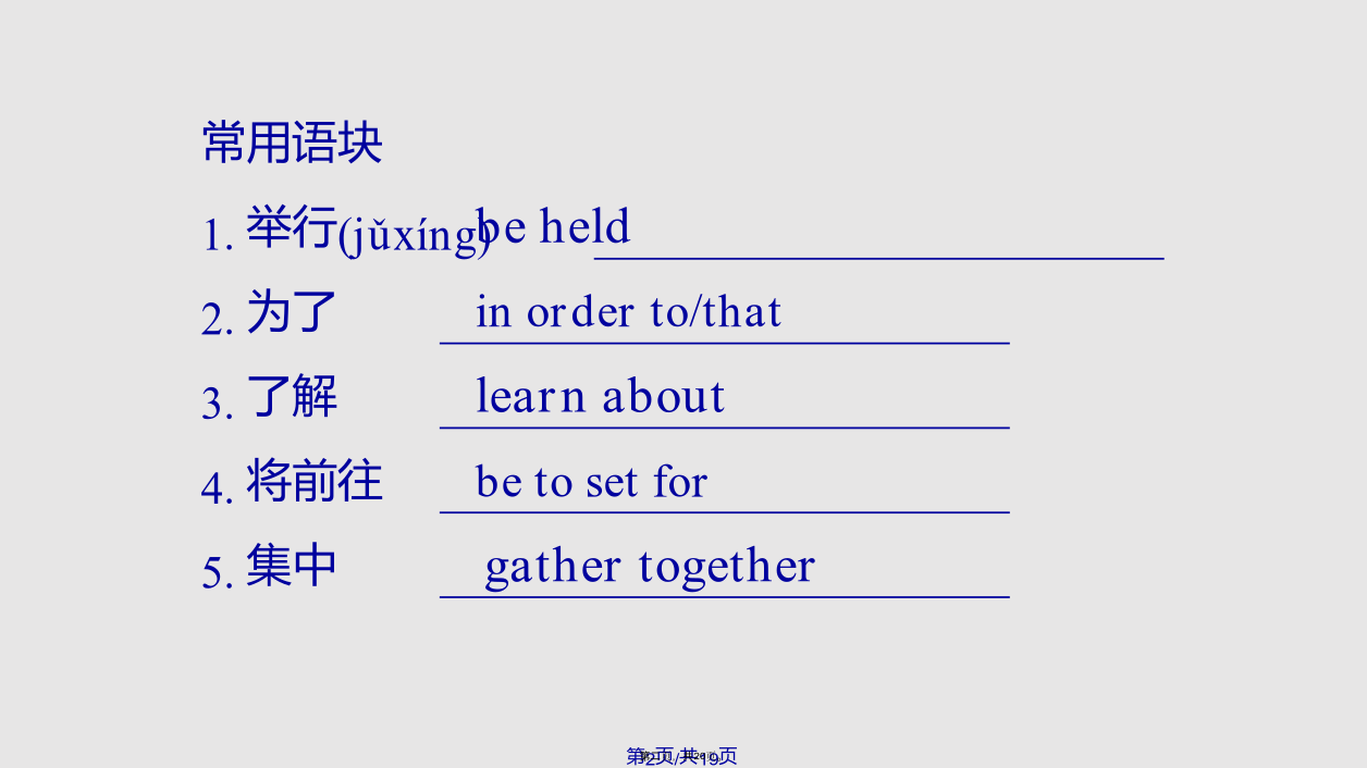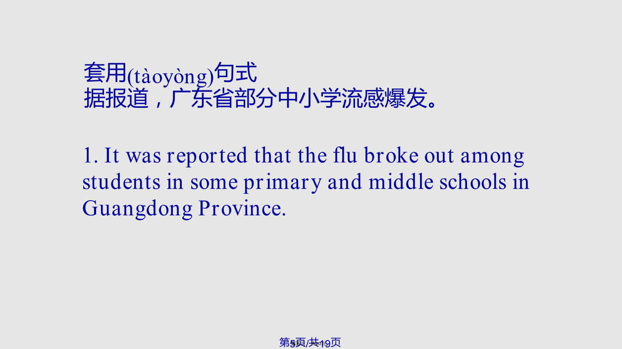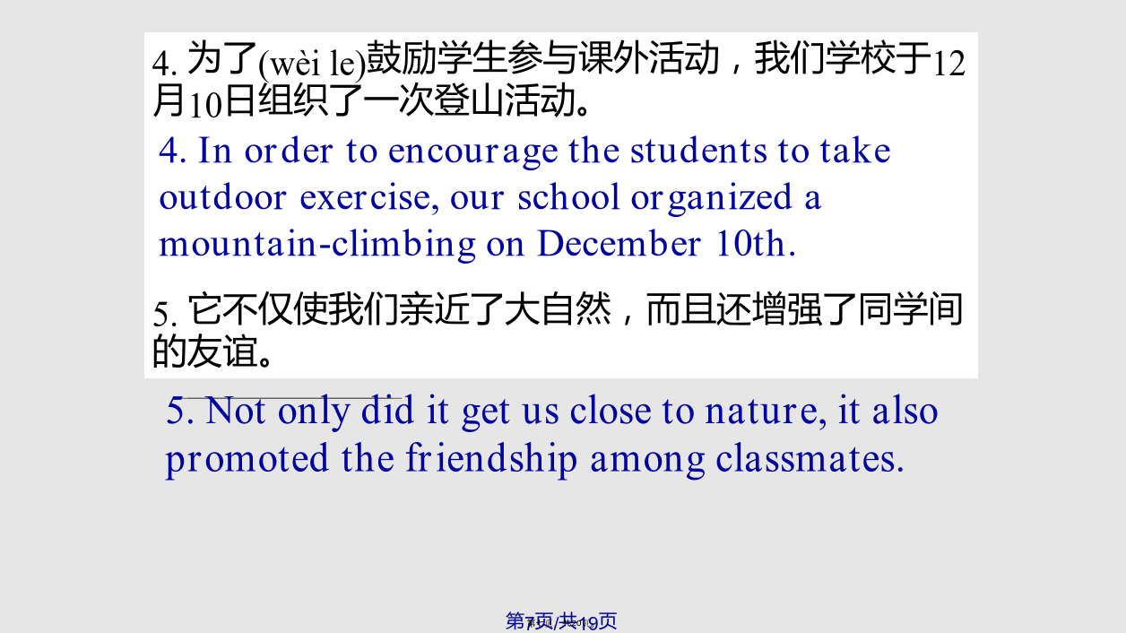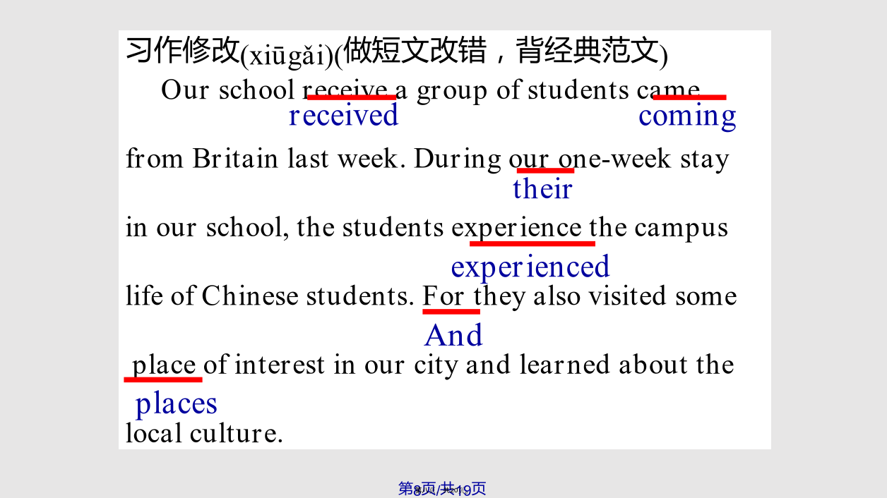 文体概述作为传递信息的文学体裁,新闻报道的第一句往往为全文的中心句(topicsentence),因此这个句子中常包含四大元素:时间(when)、地点(where)、人物(who)、事件(what),而在下文则要补充事件的过程和细节(xìjié),常包括原因(why)和具体过程(how)等。文章语言要平实客观,不必追求过分花哨的词汇和过于复杂的句型。常用语块1.举行(jǔxíng)_________________________2.为了_________________________3.了解_________________________4.将前往_________________________5.集中_________________________6.根据_______________________7.被……给予深刻印象_______________________8.应……的邀请(yāoqǐng)_______________________9.使……陷入沉思_______________________10.参观旅游景点_______________________11.回访(huífǎng)________________________12.极端天气________________________13.人口老龄化________________________14.严重雾霾________________________15.主办城市________________________套用(tàoyòng)句式据报道,广东省部分中小学流感爆发。3.专家建议避免(bìmiǎn)到拥挤的公共场所。4.为了(wèile)鼓励学生参与课外活动,我们学校于12月10日组织了一次登山活动。5.它不仅使我们亲近了大自然,而且还增强了同学间的友谊。习作修改(xiūgǎi)(做短文改错,背经典范文)OurschoolreceiveagroupofstudentscamefromBritainlastweek.Duringourone-weekstayinourschool,thestudentsexperiencethecampuslifeofChinesestudents.Fortheyalsovisitedsomeplaceofinterestinourcityandlearnedaboutthelocalculture.TheBritishstudentsnotonlyimpressedbythekindnessofChinesestudents,butalsocleanofthecity.AttheinvitationofaBritishschool,38studentsinHuawenMiddleSchoolaretosettoBritainforaexchangevisitnextMarch.1.receive→received由句尾的lastweek可知要用一般过去(guòqù)时。2.came→coming此处come为非谓语动词,与逻辑主语students是主动关系。3.our→their从上下文可知,代指英国学生一周的来访。4.experience→experienced此处是英国学生来访期间的事,故用一般过去(guòqù)时。或根据上下文也可知。5.For→And此处没有表原因的含义,而是递进关系。6.place→places由前面的some可知用复数,placesofinterest意为“名胜古迹”。7.在Britishstudents后加were因固定短语beimpressedby意为“对……印象深刻”。8.clean→cleanness由前面的kindness可知用名词形式,作介词by的宾语。9.to→for词组setforplace意为“动身前往某地”。10.a→an因为exchange以元音音素(yīnsù)开头。课堂练习希望中学(HopeHighSchool)近期举行了一次义卖活动(ACharitySaleActivity)。假定(jiǎdìng)你叫李华,是校英语报的记者。请写一篇短文报道此次活动。要点如下:1.活动的时间和地点。2.活动的经过。3.你的评价。注意:1.词数100左右。2.可以适当增加细节,以使行文连贯。OntheafternoonofMay20th,acharitysaleactivitywasheldonourschoolplayground.Inordertoorganizeameaningfulactivity,wemadefullpreparatio
