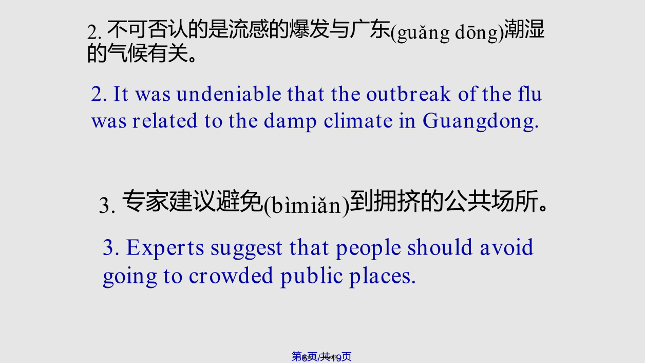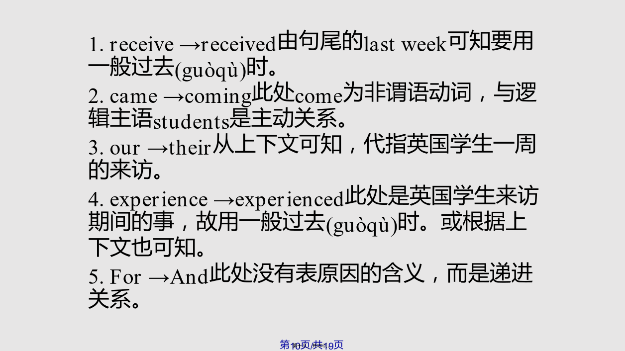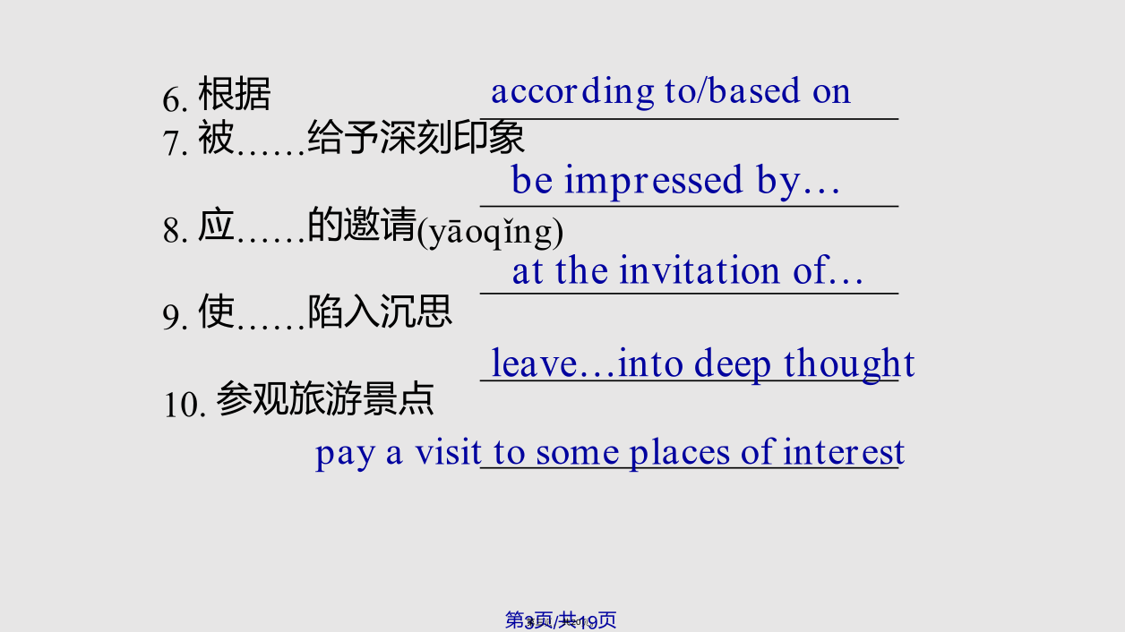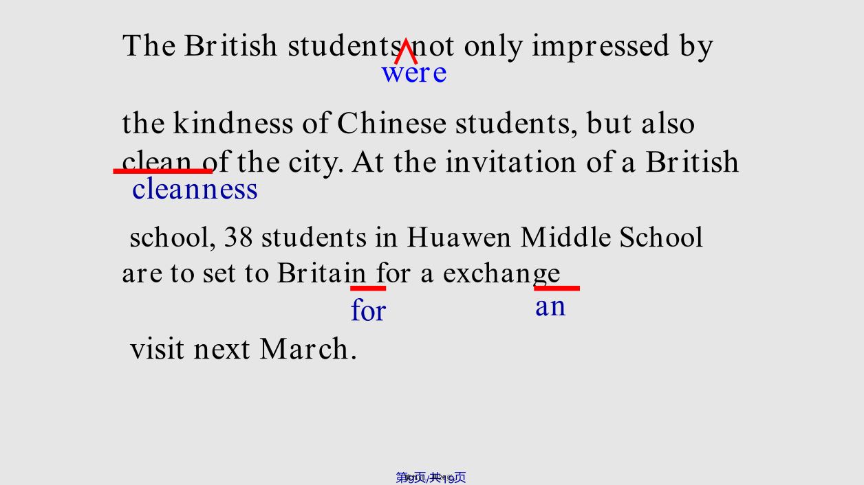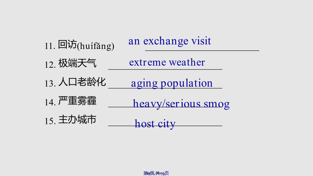 文体概述作为传递信息的文学体裁,新闻报道的第一句往往为全文的中心句(topicsentence),因此这个句子中常包含四大元素:时间(when)、地点(where)、人物(who)、事件(what),而在下文则要补充事件的过程和细节(xìjié),常包括原因(why)和具体过程(how)等。文章语言要平实客观,不必追求过分花哨的词汇和过于复杂的句型。常用语块1.举行(jǔxíng)_________________________2.为了_________________________3.了解_________________________4.将前往_________________________5.集中_________________________6.根据_______________________7.被……给予深刻印象_______________________8.应……的邀请(yāoqǐng)_______________________9.使……陷入沉思_______________________10.参观旅游景点_______________________11.回访(huífǎng)________________________12.极端天气________________________13.人口老龄化________________________14.严重雾霾________________________15.主办城市________________________套用(tàoyòng)句式据报道,广东省部分中小学流感爆发。3.专家建议避免(bìmiǎn)到拥挤的公共场所。4.为了(wèile)鼓励学生参与课外活动,我们学校于12月10日组织了一次登山活动。5.它不仅使我们亲近了大自然,而且还增强了同学间的友谊。习作修改(xiūgǎi)(做短文改错,背经典范文)OurschoolreceiveagroupofstudentscamefromBritainlastweek.Duringourone-weekstayinourschool,thestudentsexperiencethecampuslifeofChinesestudents.Fortheyalsovisitedsomeplaceofinterestinourcityandlearnedaboutthelocalculture.TheBritishstudentsnotonlyimpressedbythekindnessofChinesestudents,butalsocleanofthecity.AttheinvitationofaBritishschool,38studentsinHuawenMiddleSchoolaretosettoBritainforaexchangevisitnextMarch.1.receive→received由句尾的lastweek可知要用一般过去(guòqù)时。2.came→coming此处come为非谓语动词,与逻辑主语students是主动关系。3.our→their从上下文可知,代指英国学生一周的来访。4.experience→experienced此处是英国学生来访期间的事,故用一般过去(guòqù)时。或根据上下文也可知。5.For→And此处没有表原因的含义,而是递进关系。6.place→places由前面的some可知用复数,placesofinterest意为“名胜古迹”。7.在Britishstudents后加were因固定短语beimpressedby意为“对……印象深刻”。8.clean→cleanness由前面的kindness可知用名词形式,作介词by的宾语。9.to→for词组setforplace意为“动身前往某地”。10.a→an因为exchange以元音音素(yīnsù)开头。课堂练习希望中学(HopeHighSchool)近期举行了一次义卖活动(ACharitySaleActivity)。假定(jiǎdìng)你叫李华,是校英语报的记者。请写一篇短文报道此次活动。要点如下:1.活动的时间和地点。2.活动的经过。3.你的评价。注意:1.词数100左右。2.可以适当增加细节,以使行文连贯。OntheafternoonofMay20th,acharitysaleactivitywasheldonourschoolplayground.Inordertoorganizeameaningfulactivity,wemadefullpreparatio
