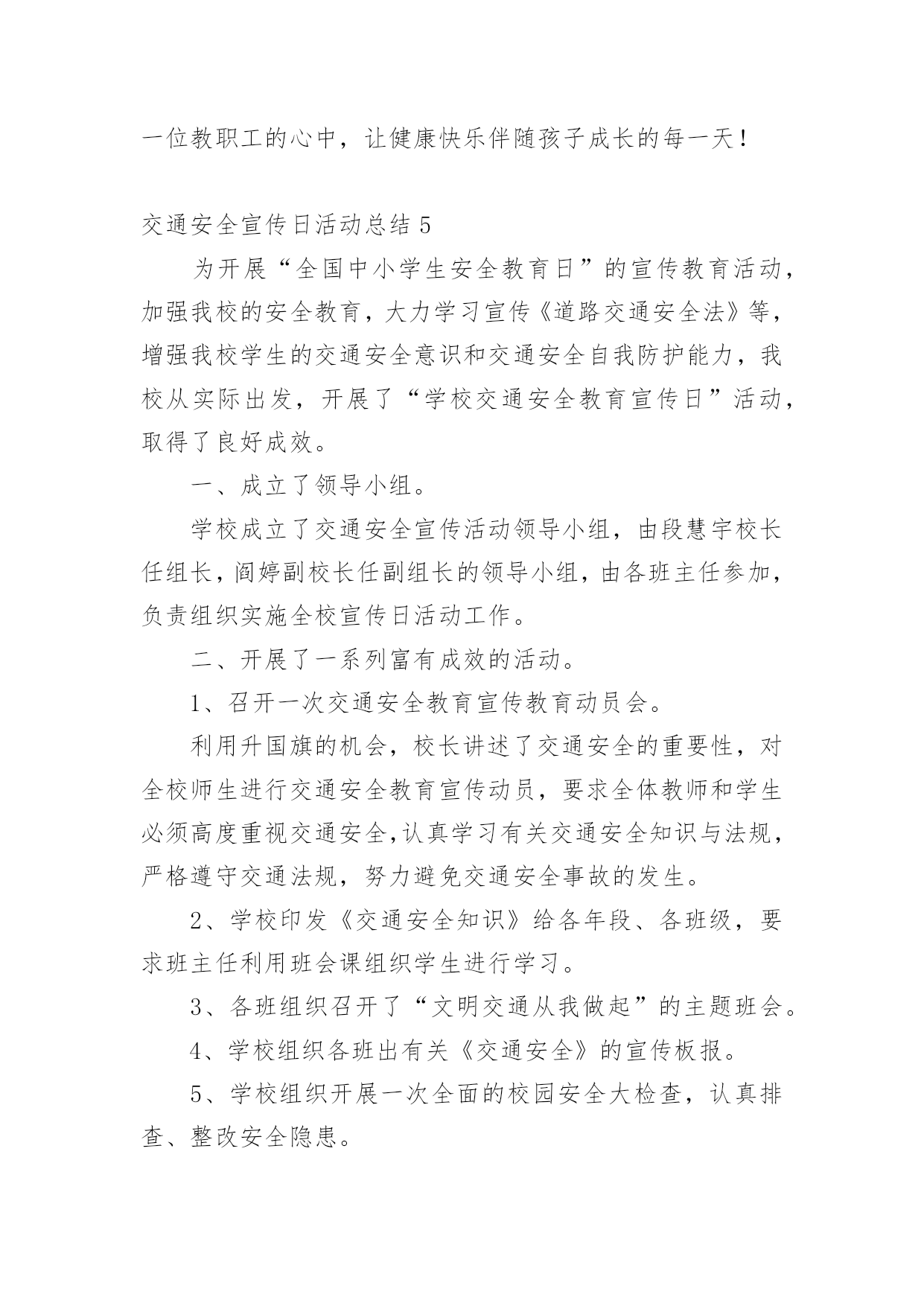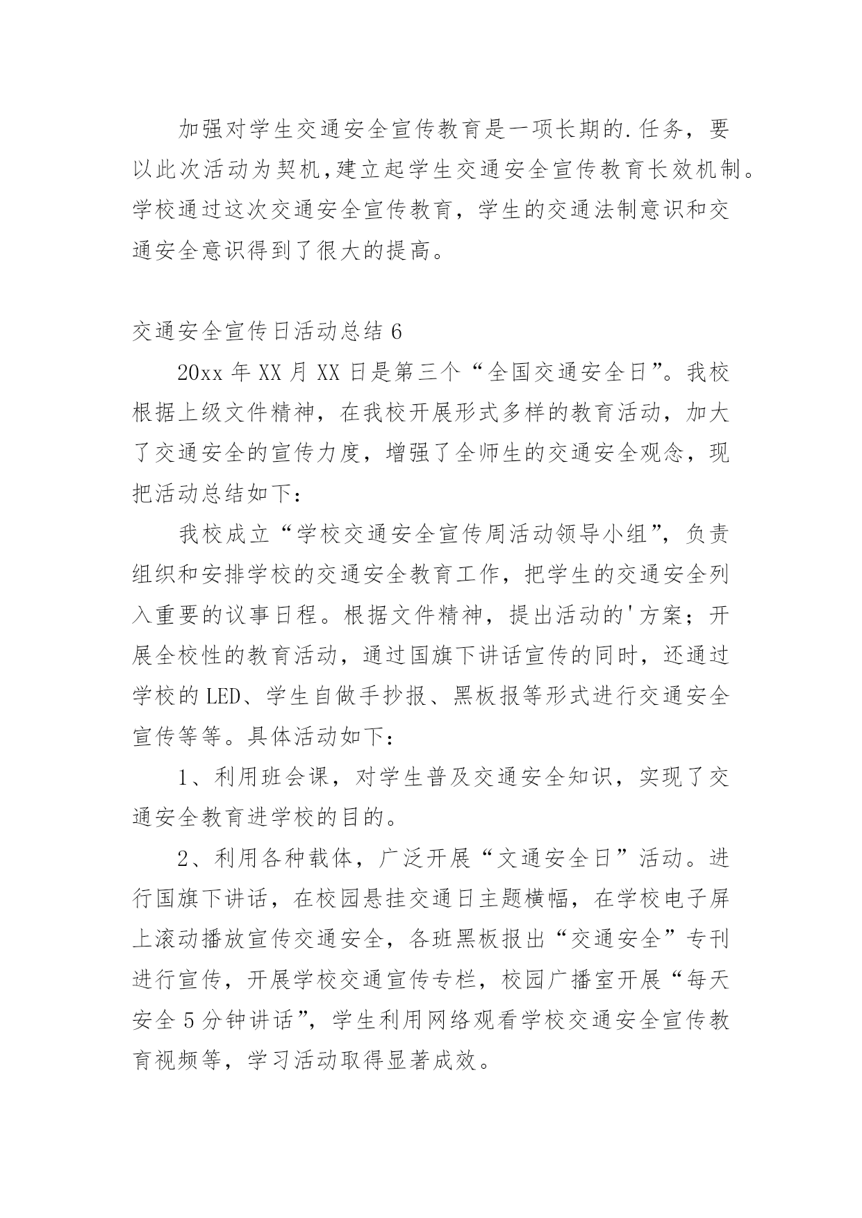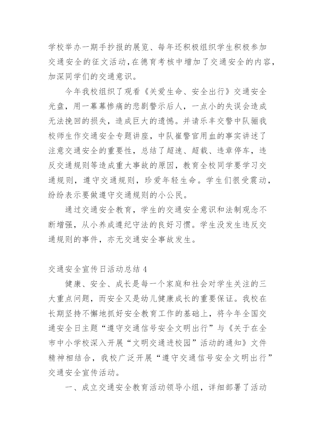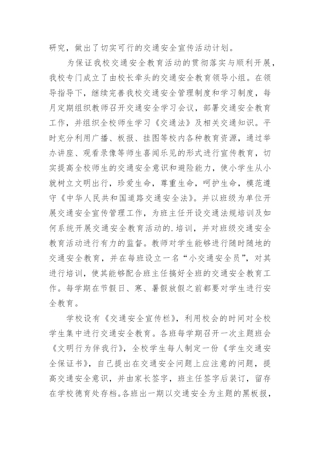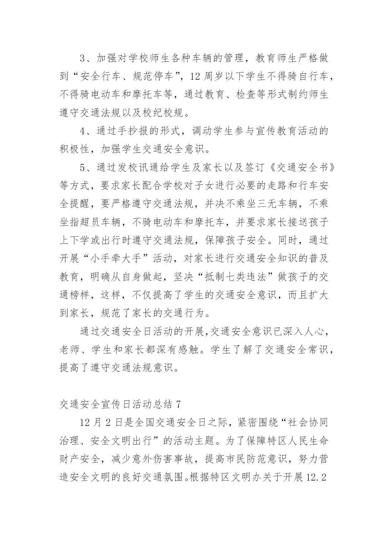 交通安全宣传日活动总结交通安全宣传日活动总结合集15篇总结就是把一个时段的学习、工作或其完成情况进行一次全面系统的总结,它有助于我们寻找工作和事物发展的规律,从而掌握并运用这些规律,是时候写一份总结了。你所见过的总结应该是什么样的?以下是小编为大家整理的交通安全宣传日活动总结,希望对大家有所帮助。交通安全宣传日活动总结1为进一步提高我校交通安全意识,提高自我防范能力,减少意外伤害事故发生。我校交通安全宣传教育活动,使师生能自觉提高交通法规意识、安全意识和文明意识,共同打造和谐、安全、畅通的道路交通环境。现将本次活动有关情况总结如下:一、加强领导,组织机构健全。学校成立了以校长为组长的交通安全宣传工作领导小组,小组成员分工职责明确,既分工又合作。召开教师会,对交通安全展进行了广泛的宣传发动和详细部署布置,同时,以班级为单位,各班主任学校把交通安全工作列入一切工作的首位来抓,形成全体教师共同参与,齐抓共管的局面。二、形式多样,活动内容丰富多彩。1、利用例会对教职员工进行了一次交通安全教育,严禁教师无证驾驶机动车,酒后驾车等违法行为,做好教师自驾车进入校门口停车区域的安全管理,避开学生入校离校时间段进出校门,确保校园交通安全。2、充分利用周一升国旗时间,举行以了一次以“遵守交通规则安全文明出行”为主题的国旗下讲话,对全校师生进行交通安全知识教育,积极营造浓厚的交通安全知识宣传教育氛围。3、制作了一期交通安全知识宣传专心栏,加强交通安全知识宣传,积极倡导关爱生命,自觉遵守交通规则,做一个安全文明的小公民,收到了良好的效果。4、各班召开一次以“珍爱生命,安全出行”为主题的主题班会。让学生讲述我们日常生活中存在的易发生交通安全事故的危险地带,发动学生自己来分析应如何避免交通安全事故的发生,以丰富多彩的活动加强安全教育。教师紧扣交通安全活动主题,将安全教育融入到学生的一日生活中。让不学生明白遵守交通规则的重要性,并以此敲响安全警钟,让学生牢记安全守则,听从尊重交警,做一个遵守交通规则的好学生。做到了班班有安全教育,人人懂得安全,时时注意安全。5、在LED播放一条以“学生出入车辆缓行”为主题的'交通安全宣传警示。大力营造宣传氛围,及时向师生和家长传递遵守交通安全的重要性。要求家长配合学校对学生进行必要的走路和乘车安全提醒,严格遵守交通法规。这样,不仅提高我校的交通安全意识,而且能辐射家长,规范家长的交通行为。6、学校充分利用校园广播站、网站、校讯通、黑板报、手抄报等形式,向全校学生进行交通安全知识宣传教育,提高交通安全教育实效性和普及率。各班级出一期交通安全教育黑板报。大队部通过宣传板块展示安全常识,以图文并茂、喜闻乐见的形式让全校师生都来了解、学习有关安全方面的知识。7、进行一次学校门口交通安全专项整治,做好校门口减速带、标志牌等交通安全设施的排查、设置与维护。8、印发以交通安全为主题“致学生家长关注交通安全的一封信”由各班主任发送到每一位学生家长(监护人),切实加强家校联系。要求家长要结合一封信的内容,做好子女的交通安全教育,确保孩子的安全,切实履行家长的监护职责。9、利用每天上、下午放学前最后一节课,开展“每天三分钟”安全教育,并经常通过电子显示屏、板报等,教育孩子珍爱生命、注意安全,小学生必须有家长或其他专门保护人员陪护才能学骑自行车,不得私自骑车上路。10、观看一场安全教育片:学校要求各班主任利用多媒体组织学生观看安全教育片,通过影片让学生心中想安全、学安全、懂安全。交通安全宣传日活动总结211月27日,在12月2日第五个“全国交通安全日”来临之际,喀左县交警大队组织校车办、巧语口才表演艺术学校师生、学生家长共同开展了“小手拉大手、全家安全一起走”交通安全教育宣传活动。今年的活动主题是“社会协同治理、安全文明出行”。活动中,县交警大队民警通过讲解图片、提问、播放动漫视频等形式,给孩子们上了一堂生动的交通安全课。随后,在交通岗现场给孩子们示范如何安全过马路,并耐心解答孩子们对交通安全相关知识的提问。通过此次活动,增强了学生和家长们的'交通安全意识,使孩子们意识到遵守交通安全的重要性,从而起到了“教育一个学生、带动一个家庭、文明整个社会”的良好社会效果。活动结束后,交警大队还给孩子们准备了小礼物。交通安全宣传日活动总结3随着经济的发展,交通车辆日流量的增多,学生的道路交通安全问题越来越突出。长期以来,由于小学生的道路交通意识相对淡薄,导致交通事故时有发生。据相关机构统计,中国平均每天约有12位少年儿童在交通事故中失去宝贵的生命。为贯彻落实公安部、教育部《关于加强中小学校交通安全工作的通知》精神,根据宣文联发[xx]2号《关于在全市开展交通安全宣传进校园活动的通知》精神和乐丰乡人民政府、中心学校的通知要求,为进一步搞好我校的交通安全教