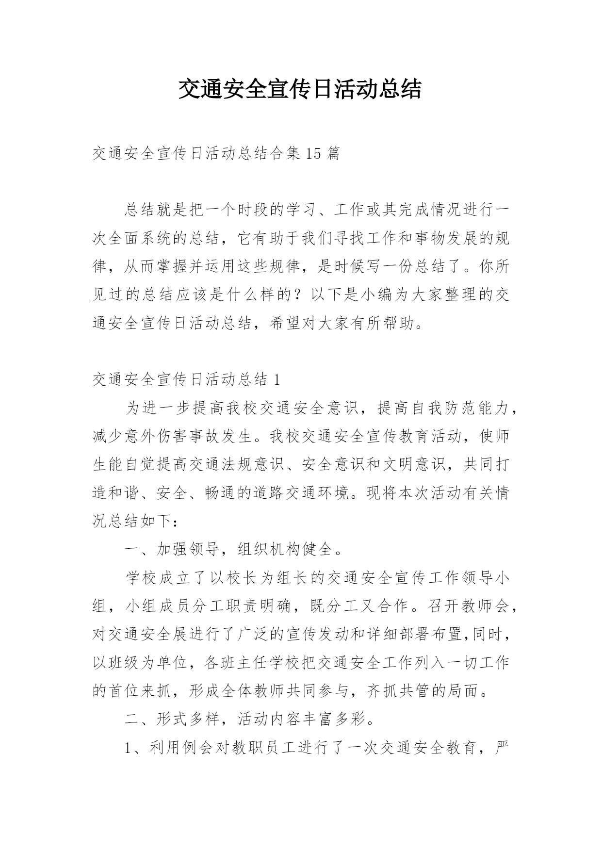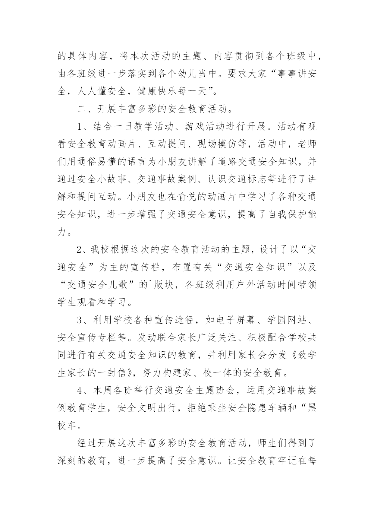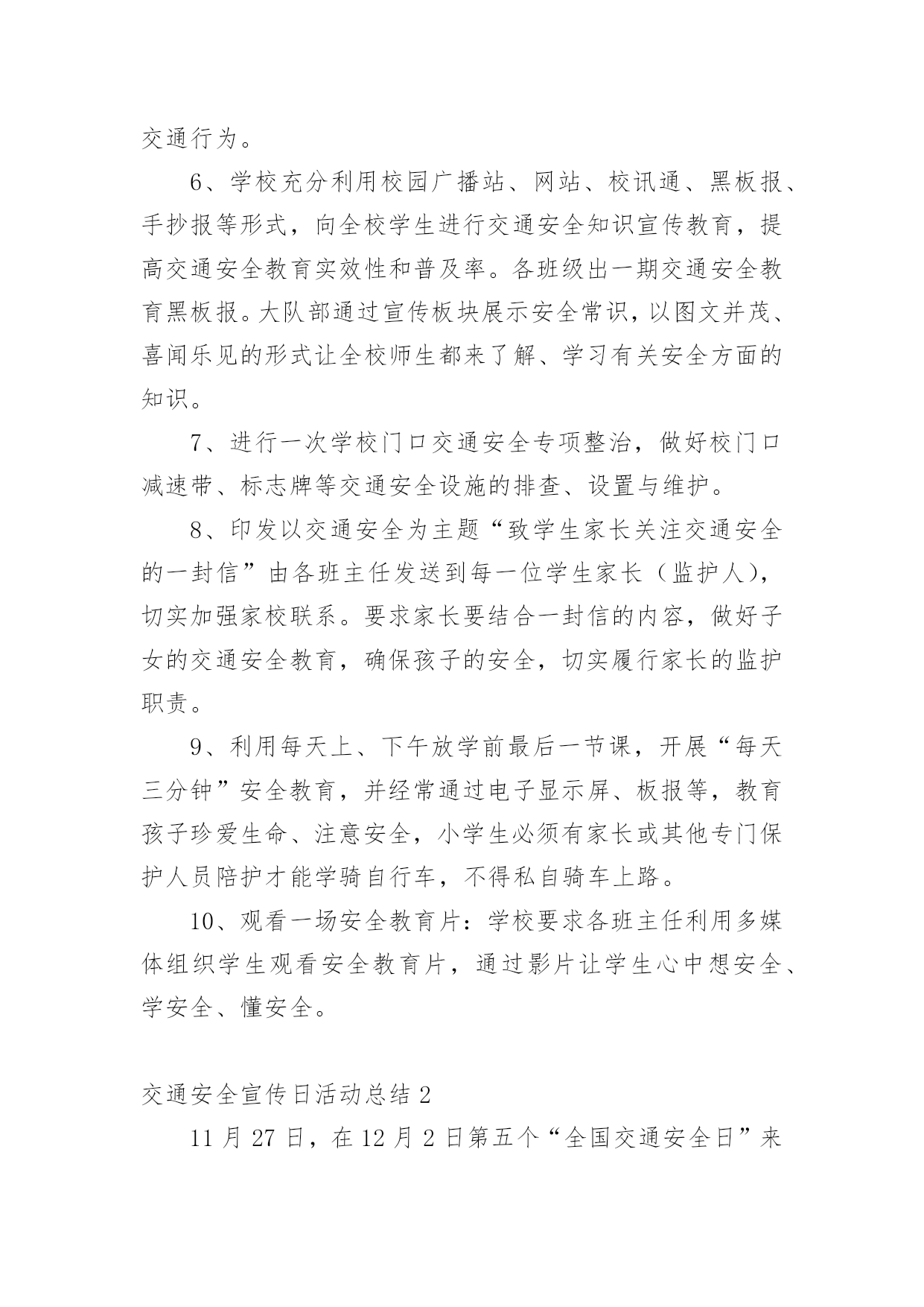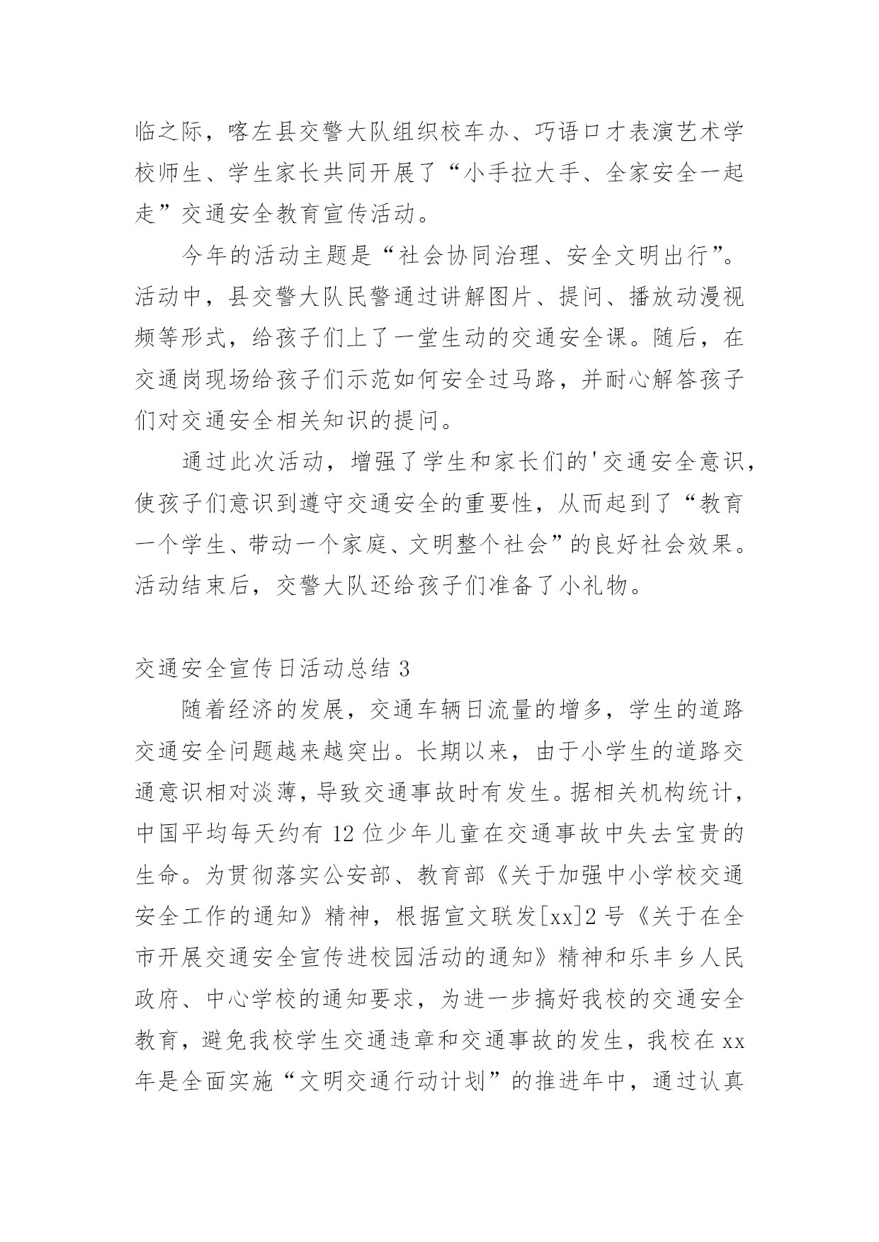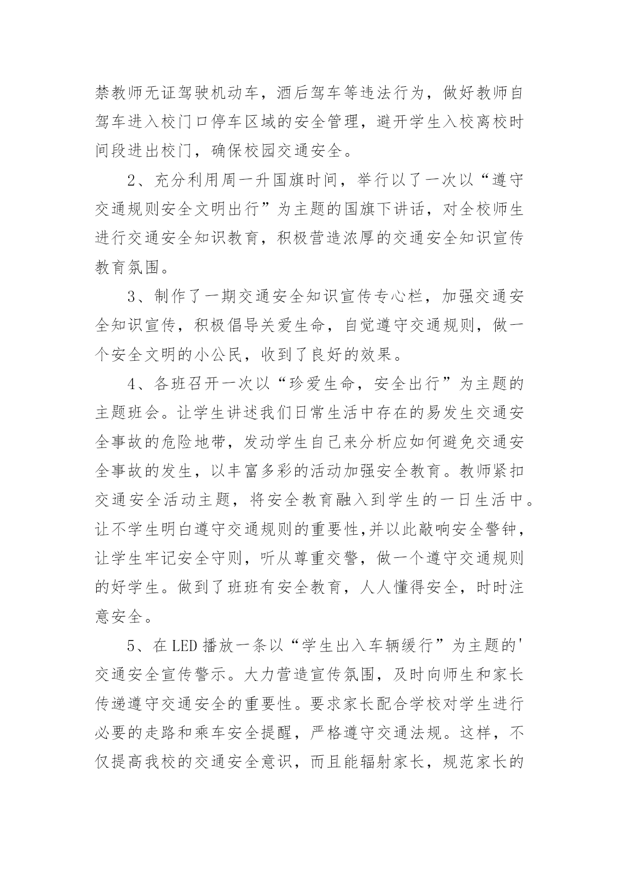 交通安全宣传日活动总结交通安全宣传日活动总结合集15篇总结就是把一个时段的学习、工作或其完成情况进行一次全面系统的总结,它有助于我们寻找工作和事物发展的规律,从而掌握并运用这些规律,是时候写一份总结了。你所见过的总结应该是什么样的?以下是小编为大家整理的交通安全宣传日活动总结,希望对大家有所帮助。交通安全宣传日活动总结1为进一步提高我校交通安全意识,提高自我防范能力,减少意外伤害事故发生。我校交通安全宣传教育活动,使师生能自觉提高交通法规意识、安全意识和文明意识,共同打造和谐、安全、畅通的道路交通环境。现将本次活动有关情况总结如下:一、加强领导,组织机构健全。学校成立了以校长为组长的交通安全宣传工作领导小组,小组成员分工职责明确,既分工又合作。召开教师会,对交通安全展进行了广泛的宣传发动和详细部署布置,同时,以班级为单位,各班主任学校把交通安全工作列入一切工作的首位来抓,形成全体教师共同参与,齐抓共管的局面。二、形式多样,活动内容丰富多彩。1、利用例会对教职员工进行了一次交通安全教育,严禁教师无证驾驶机动车,酒后驾车等违法行为,做好教师自驾车进入校门口停车区域的安全管理,避开学生入校离校时间段进出校门,确保校园交通安全。2、充分利用周一升国旗时间,举行以了一次以“遵守交通规则安全文明出行”为主题的国旗下讲话,对全校师生进行交通安全知识教育,积极营造浓厚的交通安全知识宣传教育氛围。3、制作了一期交通安全知识宣传专心栏,加强交通安全知识宣传,积极倡导关爱生命,自觉遵守交通规则,做一个安全文明的小公民,收到了良好的效果。4、各班召开一次以“珍爱生命,安全出行”为主题的主题班会。让学生讲述我们日常生活中存在的易发生交通安全事故的危险地带,发动学生自己来分析应如何避免交通安全事故的发生,以丰富多彩的活动加强安全教育。教师紧扣交通安全活动主题,将安全教育融入到学生的一日生活中。让不学生明白遵守交通规则的重要性,并以此敲响安全警钟,让学生牢记安全守则,听从尊重交警,做一个遵守交通规则的好学生。做到了班班有安全教育,人人懂得安全,时时注意安全。5、在LED播放一条以“学生出入车辆缓行”为主题的'交通安全宣传警示。大力营造宣传氛围,及时向师生和家长传递遵守交通安全的重要性。要求家长配合学校对学生进行必要的走路和乘车安全提醒,严格遵守交通法规。这样,不仅提高我校的交通安全意识,而且能辐射家长,规范家长的交通行为。6、学校充分利用校园广播站、网站、校讯通、黑板报、手抄报等形式,向全校学生进行交通安全知识宣传教育,提高交通安全教育实效性和普及率。各班级出一期交通安全教育黑板报。大队部通过宣传板块展示安全常识,以图文并茂、喜闻乐见的形式让全校师生都来了解、学习有关安全方面的知识。7、进行一次学校门口交通安全专项整治,做好校门口减速带、标志牌等交通安全设施的排查、设置与维护。8、印发以交通安全为主题“致学生家长关注交通安全的一封信”由各班主任发送到每一位学生家长(监护人),切实加强家校联系。要求家长要结合一封信的内容,做好子女的交通安全教育,确保孩子的安全,切实履行家长的监护职责。9、利用每天上、下午放学前最后一节课,开展“每天三分钟”安全教育,并经常通过电子显示屏、板报等,教育孩子珍爱生命、注意安全,小学生必须有家长或其他专门保护人员陪护才能学骑自行车,不得私自骑车上路。10、观看一场安全教育片:学校要求各班主任利用多媒体组织学生观看安全教育片,通过影片让学生心中想安全、学安全、懂安全。交通安全宣传日活动总结211月27日,在12月2日第五个“全国交通安全日”来临之际,喀左县交警大队组织校车办、巧语口才表演艺术学校师生、学生家长共同开展了“小手拉大手、全家安全一起走”交通安全教育宣传活动。今年的活动主题是“社会协同治理、安全文明出行”。活动中,县交警大队民警通过讲解图片、提问、播放动漫视频等形式,给孩子们上了一堂生动的交通安全课。随后,在交通岗现场给孩子们示范如何安全过马路,并耐心解答孩子们对交通安全相关知识的提问。通过此次活动,增强了学生和家长们的'交通安全意识,使孩子们意识到遵守交通安全的重要性,从而起到了“教育一个学生、带动一个家庭、文明整个社会”的良好社会效果。活动结束后,交警大队还给孩子们准备了小礼物。交通安全宣传日活动总结3随着经济的发展,交通车辆日流量的增多,学生的道路交通安全问题越来越突出。长期以来,由于小学生的道路交通意识相对淡薄,导致交通事故时有发生。据相关机构统计,中国平均每天约有12位少年儿童在交通事故中失去宝贵的生命。为贯彻落实公安部、教育部《关于加强中小学校交通安全工作的通知》精神,根据宣文联发[xx]2号《关于在全市开展交通安全宣传进校园活动的通知》精神和乐丰乡人民政府、中心学校的通知要求,为进一步搞好我校的交通安全教