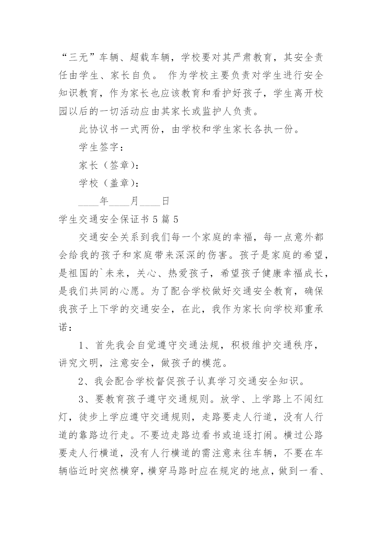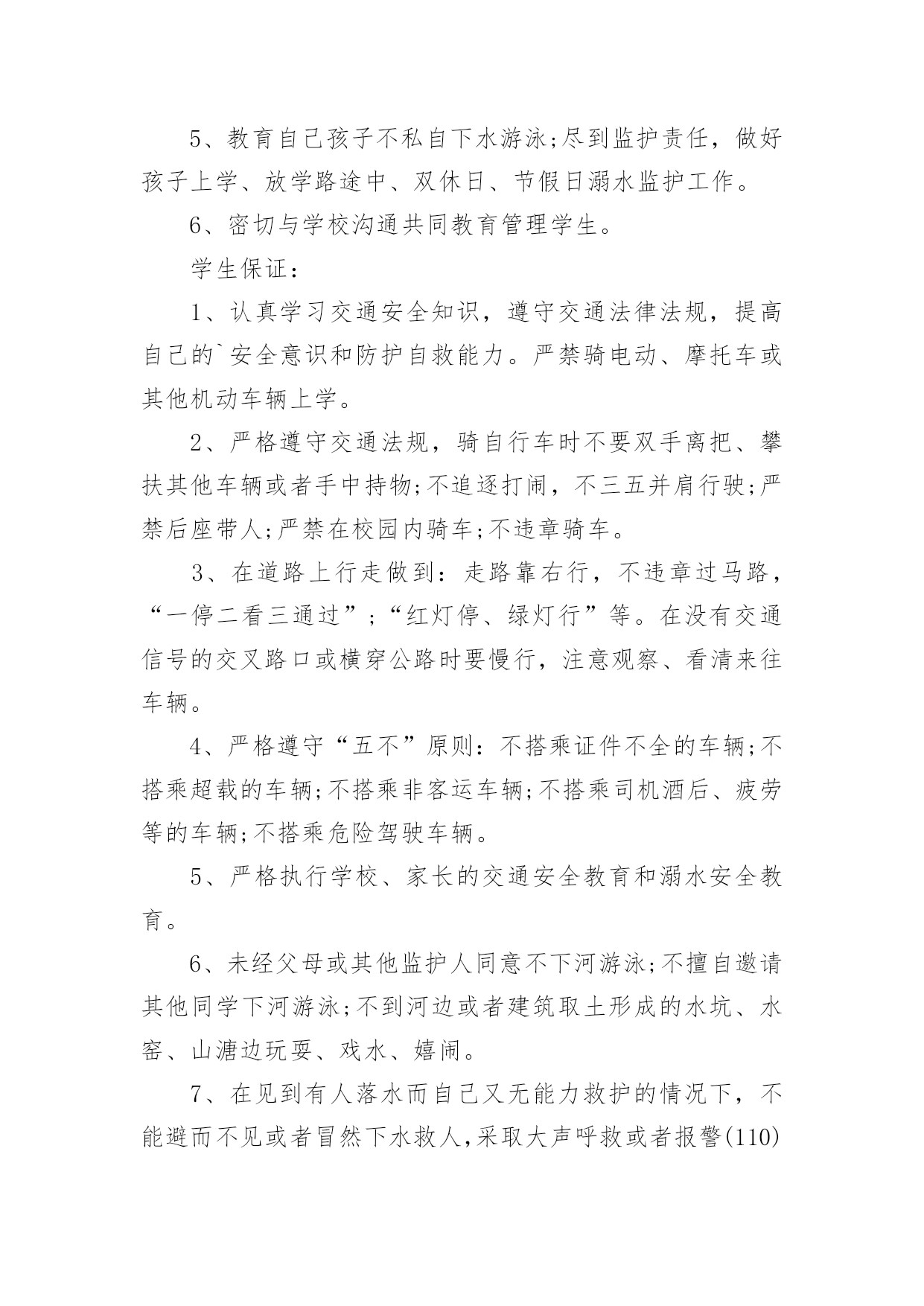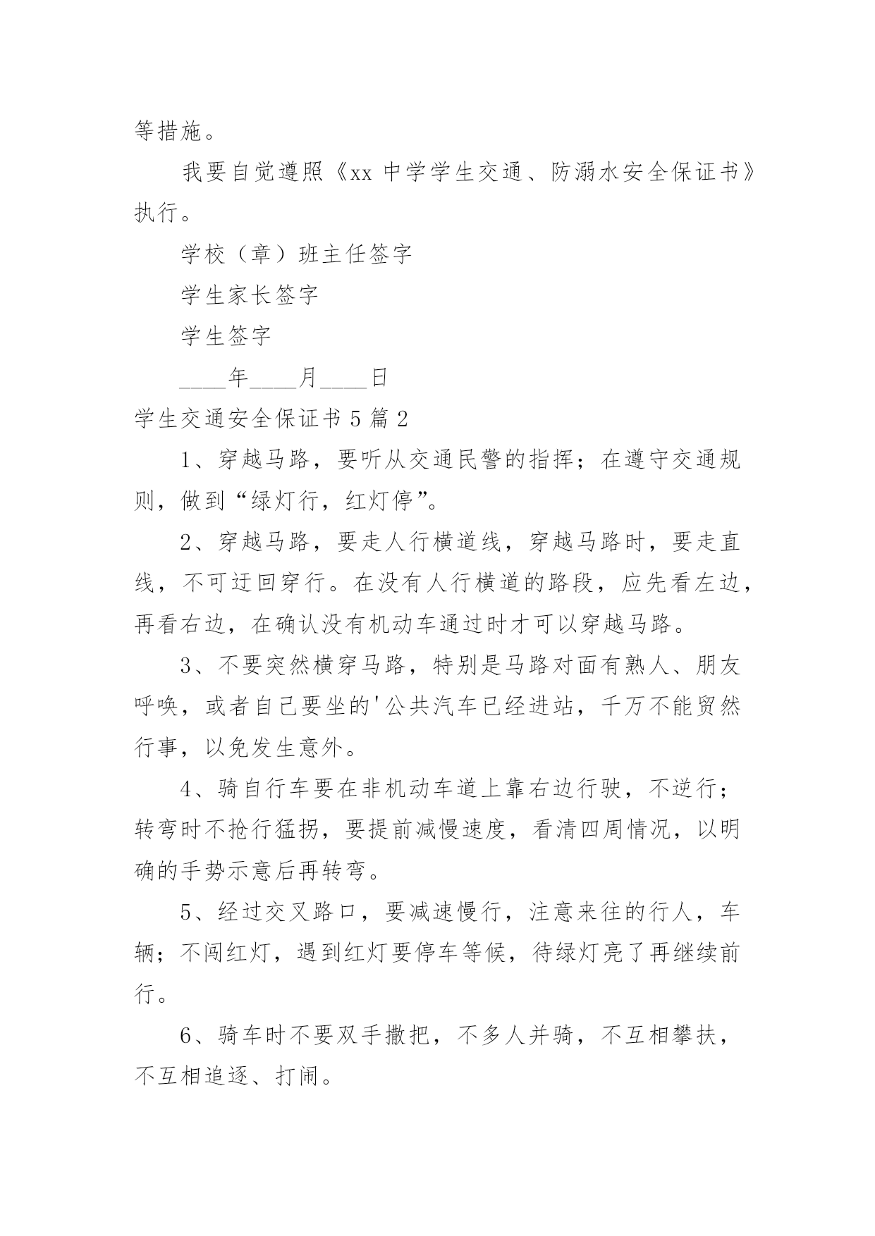 学生交通安全保证书学生交通安全保证书5篇在日常生活和工作中,保证书不再是罕见的东西,保证书是个人信用的保证。那么大家知道标准正式的保证书格式吗?以下是小编帮大家整理的学生交通安全保证书5篇,欢迎阅读,希望大家能够喜欢。学生交通安全保证书5篇1安全无小事,交通安全、防溺水安全从我做起。为增强学生交通、防溺水安全意识和遵守交通法律法规自觉性和提高抵御溺水能力,预防和减少道路交通、溺水事故,保障学生上学、放学路上的交通安全、溺水安全,我们愿意作出以下保证:家长保证:1、对孩子履行监护人的义务,保障孩子在校外的交通安全和溺水安全。2、配合学校加强对孩子交通、溺水安全教育,提高子女防交通、防溺水安全意识。3、加强对孩子交通安全管理,发现孩子的不良交通行为及时教育和纠正。4、指导孩子正确骑行自行车,严格禁止孩子骑电动、摩托车等机动车上学、放学。特别是严禁孩子飚车。5、教育自己孩子不私自下水游泳;尽到监护责任,做好孩子上学、放学路途中、双休日、节假日溺水监护工作。6、密切与学校沟通共同教育管理学生。学生保证:1、认真学习交通安全知识,遵守交通法律法规,提高自己的`安全意识和防护自救能力。严禁骑电动、摩托车或其他机动车辆上学。2、严格遵守交通法规,骑自行车时不要双手离把、攀扶其他车辆或者手中持物;不追逐打闹,不三五并肩行驶;严禁后座带人;严禁在校园内骑车;不违章骑车。3、在道路上行走做到:走路靠右行,不违章过马路,“一停二看三通过”;“红灯停、绿灯行”等。在没有交通信号的交叉路口或横穿公路时要慢行,注意观察、看清来往车辆。4、严格遵守“五不”原则:不搭乘证件不全的车辆;不搭乘超载的车辆;不搭乘非客运车辆;不搭乘司机酒后、疲劳等的车辆;不搭乘危险驾驶车辆。5、严格执行学校、家长的交通安全教育和溺水安全教育。6、未经父母或其他监护人同意不下河游泳;不擅自邀请其他同学下河游泳;不到河边或者建筑取土形成的水坑、水窑、山溏边玩耍、戏水、嬉闹。7、在见到有人落水而自己又无能力救护的情况下,不能避而不见或者冒然下水救人,采取大声呼救或者报警(110)等措施。我要自觉遵照《xx中学学生交通、防溺水安全保证书》执行。学校(章)班主任签字学生家长签字学生签字____年____月____日学生交通安全保证书5篇21、穿越马路,要听从交通民警的指挥;在遵守交通规则,做到“绿灯行,红灯停”。2、穿越马路,要走人行横道线,穿越马路时,要走直线,不可迂回穿行。在没有人行横道的路段,应先看左边,再看右边,在确认没有机动车通过时才可以穿越马路。3、不要突然横穿马路,特别是马路对面有熟人、朋友呼唤,或者自己要坐的'公共汽车已经进站,千万不能贸然行事,以免发生意外。4、骑自行车要在非机动车道上靠右边行驶,不逆行;转弯时不抢行猛拐,要提前减慢速度,看清四周情况,以明确的手势示意后再转弯。5、经过交叉路口,要减速慢行,注意来往的行人,车辆;不闯红灯,遇到红灯要停车等候,待绿灯亮了再继续前行。6、骑车时不要双手撒把,不多人并骑,不互相攀扶,不互相追逐、打闹。7、骑车时不攀扶机动车辆,不载过重的东西,不骑车带人,不在骑车时戴耳机听音乐。8、乘公共汽车要停稳后上下车,在车上要抓好扶手,头、手等身体部位不能伸出窗外,管好身边物品,防止扒窃;乘高速汽车要系安全带;坚决拒绝乘坐无牌、无证、无保险车辆,不乘坐载货汽车、三轮汽车、拖拉机、农用车等非客运车辆,改装拼装车辆以及超载车辆。学校(章)班主任签字学生家长签字学生签字____年____月____日学生交通安全保证书5篇3为认真贯切落实诸城市教育局和中心校对学校交通安全工作的要求,推动平安校园创建工作深入开展,努力营造安全、稳定、和谐的育人环境。_____初中学生、家长签订交通安全保证书,具体内容如下:1、家长要认真教育孩子,自觉遵守交通法规,养成良好的行为习惯.不在公路上踢球、游玩、戏闹。放学途中不准购物、串门、并排走,时时处处注意交通安全。2、教育孩子乘车时要遵守秩序,注意乘车安全。认真学习道路交通安全法律法规和安全常识,强化自身交通法制观念,积极参加学校组织的交通安全教育活动。3、家长作为孩子的第一监护人,必须保证孩子不乘坐农用车、报废车、拖拉机和无牌、无证或不合手续的报废车及个别家长私自组织的无运营手续的违规车辆。4、家长要教育孩子文明乘车,不拥挤,不抢座,不打架,自觉遵守乘车纪律,确保乘车期间的人身安全。拒绝乘坐超载车辆。对运载学生的可疑车辆及时向班主任及学校领导汇报或向有关部门进行举报。5、家长要督促孩子准时上学,学生不能乘车,但有条件的家长可亲自接送,学校严禁学生独自骑自行车上学。如果家长违背学校规定,纵容学生违纪、独自骑自行车上学,那么发生的一切问题均有家长负责。6、自觉遵守交通法律法规,骑车时靠右行,不并行,不撒把,不飙车,