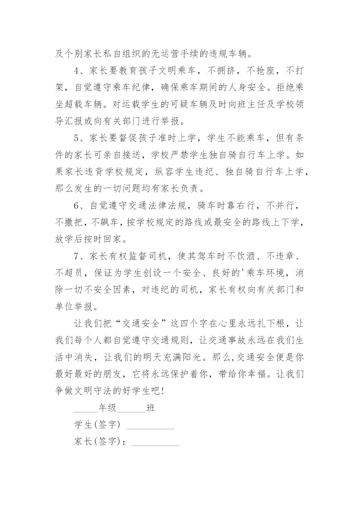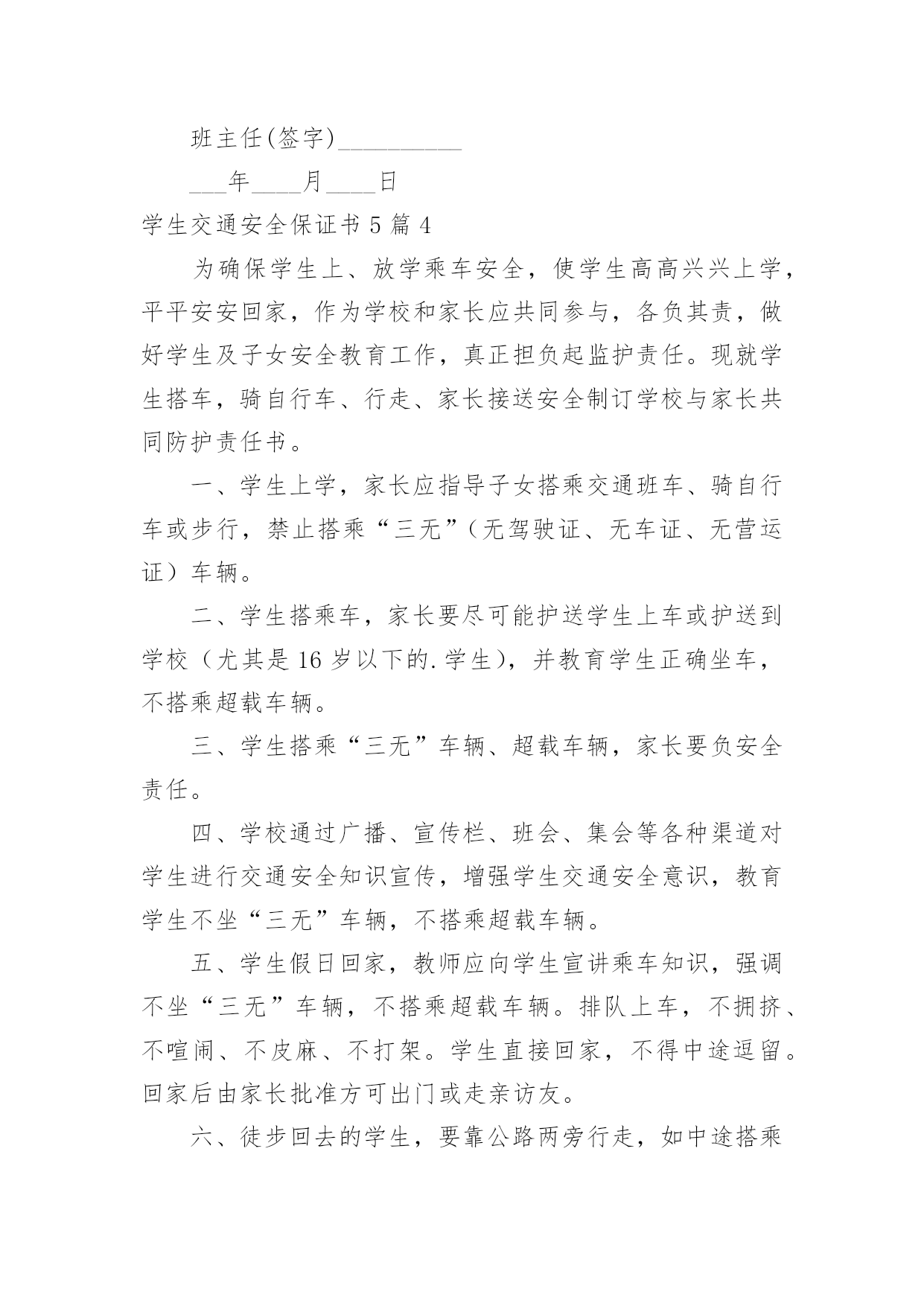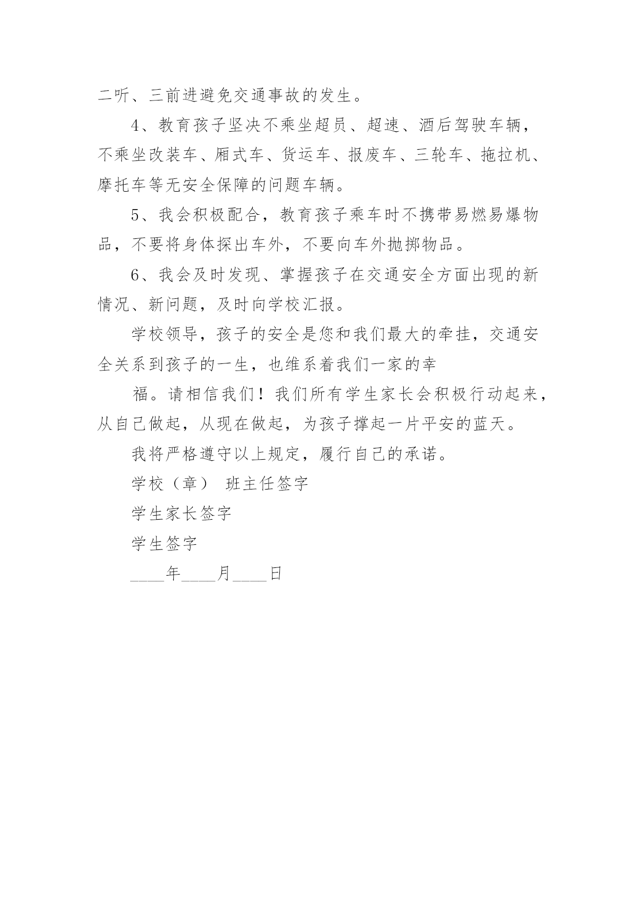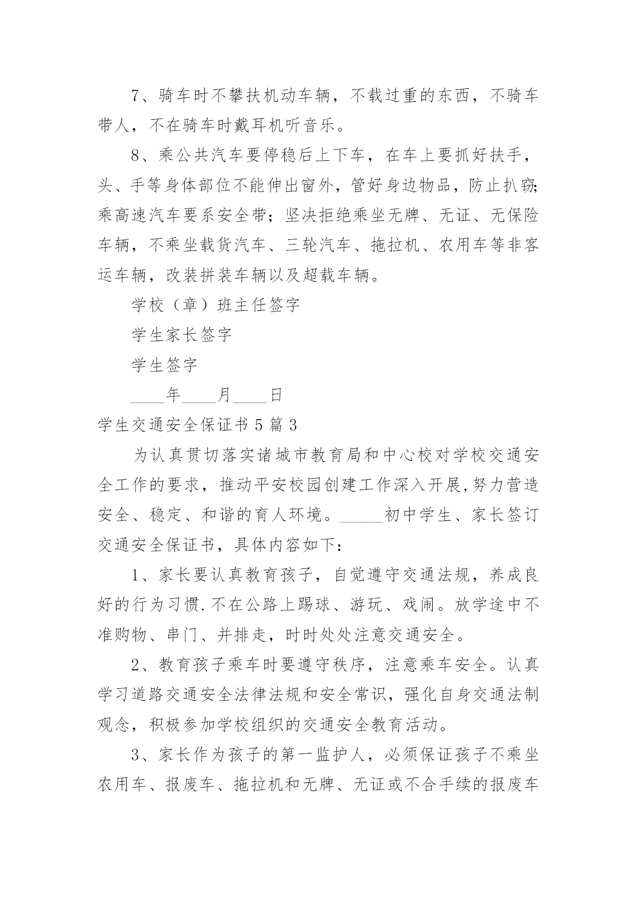 学生交通安全保证书学生交通安全保证书5篇在日常生活和工作中,保证书不再是罕见的东西,保证书是个人信用的保证。那么大家知道标准正式的保证书格式吗?以下是小编帮大家整理的学生交通安全保证书5篇,欢迎阅读,希望大家能够喜欢。学生交通安全保证书5篇1安全无小事,交通安全、防溺水安全从我做起。为增强学生交通、防溺水安全意识和遵守交通法律法规自觉性和提高抵御溺水能力,预防和减少道路交通、溺水事故,保障学生上学、放学路上的交通安全、溺水安全,我们愿意作出以下保证:家长保证:1、对孩子履行监护人的义务,保障孩子在校外的交通安全和溺水安全。2、配合学校加强对孩子交通、溺水安全教育,提高子女防交通、防溺水安全意识。3、加强对孩子交通安全管理,发现孩子的不良交通行为及时教育和纠正。4、指导孩子正确骑行自行车,严格禁止孩子骑电动、摩托车等机动车上学、放学。特别是严禁孩子飚车。5、教育自己孩子不私自下水游泳;尽到监护责任,做好孩子上学、放学路途中、双休日、节假日溺水监护工作。6、密切与学校沟通共同教育管理学生。学生保证:1、认真学习交通安全知识,遵守交通法律法规,提高自己的`安全意识和防护自救能力。严禁骑电动、摩托车或其他机动车辆上学。2、严格遵守交通法规,骑自行车时不要双手离把、攀扶其他车辆或者手中持物;不追逐打闹,不三五并肩行驶;严禁后座带人;严禁在校园内骑车;不违章骑车。3、在道路上行走做到:走路靠右行,不违章过马路,“一停二看三通过”;“红灯停、绿灯行”等。在没有交通信号的交叉路口或横穿公路时要慢行,注意观察、看清来往车辆。4、严格遵守“五不”原则:不搭乘证件不全的车辆;不搭乘超载的车辆;不搭乘非客运车辆;不搭乘司机酒后、疲劳等的车辆;不搭乘危险驾驶车辆。5、严格执行学校、家长的交通安全教育和溺水安全教育。6、未经父母或其他监护人同意不下河游泳;不擅自邀请其他同学下河游泳;不到河边或者建筑取土形成的水坑、水窑、山溏边玩耍、戏水、嬉闹。7、在见到有人落水而自己又无能力救护的情况下,不能避而不见或者冒然下水救人,采取大声呼救或者报警(110)等措施。我要自觉遵照《xx中学学生交通、防溺水安全保证书》执行。学校(章)班主任签字学生家长签字学生签字____年____月____日学生交通安全保证书5篇21、穿越马路,要听从交通民警的指挥;在遵守交通规则,做到“绿灯行,红灯停”。2、穿越马路,要走人行横道线,穿越马路时,要走直线,不可迂回穿行。在没有人行横道的路段,应先看左边,再看右边,在确认没有机动车通过时才可以穿越马路。3、不要突然横穿马路,特别是马路对面有熟人、朋友呼唤,或者自己要坐的'公共汽车已经进站,千万不能贸然行事,以免发生意外。4、骑自行车要在非机动车道上靠右边行驶,不逆行;转弯时不抢行猛拐,要提前减慢速度,看清四周情况,以明确的手势示意后再转弯。5、经过交叉路口,要减速慢行,注意来往的行人,车辆;不闯红灯,遇到红灯要停车等候,待绿灯亮了再继续前行。6、骑车时不要双手撒把,不多人并骑,不互相攀扶,不互相追逐、打闹。7、骑车时不攀扶机动车辆,不载过重的东西,不骑车带人,不在骑车时戴耳机听音乐。8、乘公共汽车要停稳后上下车,在车上要抓好扶手,头、手等身体部位不能伸出窗外,管好身边物品,防止扒窃;乘高速汽车要系安全带;坚决拒绝乘坐无牌、无证、无保险车辆,不乘坐载货汽车、三轮汽车、拖拉机、农用车等非客运车辆,改装拼装车辆以及超载车辆。学校(章)班主任签字学生家长签字学生签字____年____月____日学生交通安全保证书5篇3为认真贯切落实诸城市教育局和中心校对学校交通安全工作的要求,推动平安校园创建工作深入开展,努力营造安全、稳定、和谐的育人环境。_____初中学生、家长签订交通安全保证书,具体内容如下:1、家长要认真教育孩子,自觉遵守交通法规,养成良好的行为习惯.不在公路上踢球、游玩、戏闹。放学途中不准购物、串门、并排走,时时处处注意交通安全。2、教育孩子乘车时要遵守秩序,注意乘车安全。认真学习道路交通安全法律法规和安全常识,强化自身交通法制观念,积极参加学校组织的交通安全教育活动。3、家长作为孩子的第一监护人,必须保证孩子不乘坐农用车、报废车、拖拉机和无牌、无证或不合手续的报废车及个别家长私自组织的无运营手续的违规车辆。4、家长要教育孩子文明乘车,不拥挤,不抢座,不打架,自觉遵守乘车纪律,确保乘车期间的人身安全。拒绝乘坐超载车辆。对运载学生的可疑车辆及时向班主任及学校领导汇报或向有关部门进行举报。5、家长要督促孩子准时上学,学生不能乘车,但有条件的家长可亲自接送,学校严禁学生独自骑自行车上学。如果家长违背学校规定,纵容学生违纪、独自骑自行车上学,那么发生的一切问题均有家长负责。6、自觉遵守交通法律法规,骑车时靠右行,不并行,不撒把,不飙车,