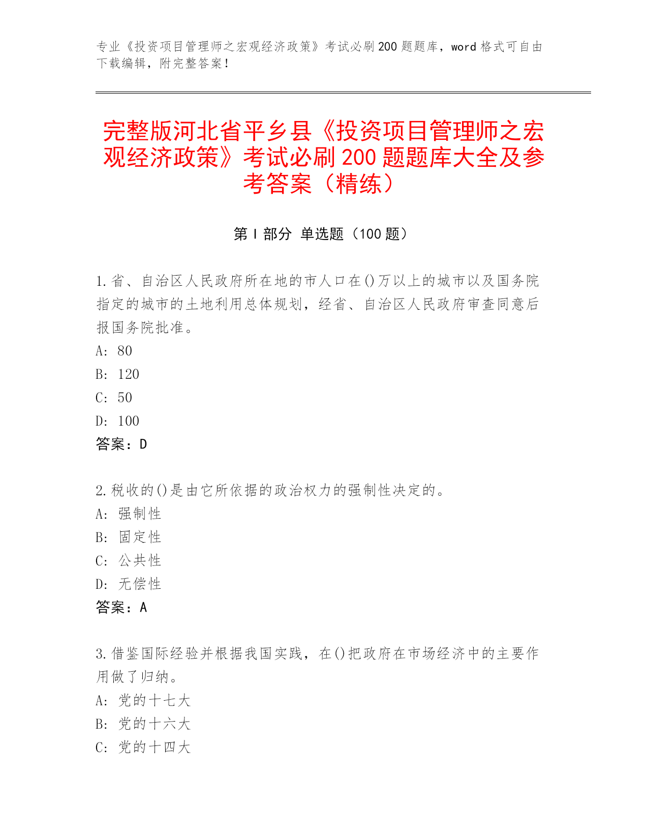 河北省平乡县《投资项目管理师之宏观经济政策》考试必刷200题通关秘籍题库含答案(预热题)