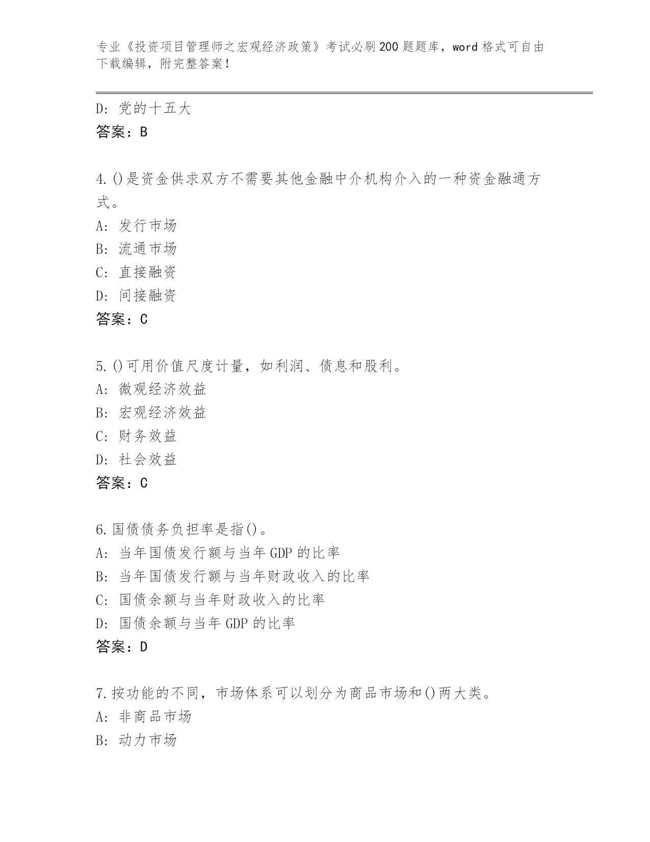 完整版河北省丰润区《投资项目管理师之宏观经济政策》资格考试必刷200题大全含答案(精练)