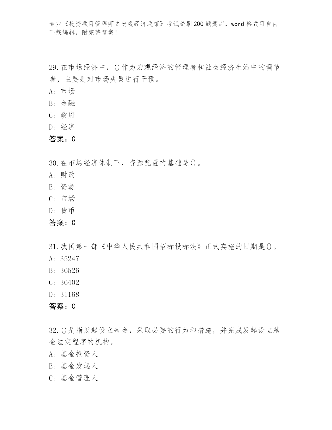 河北省平乡县整理《投资项目管理师之宏观经济政策》资格考试必背200题题库【原创题】