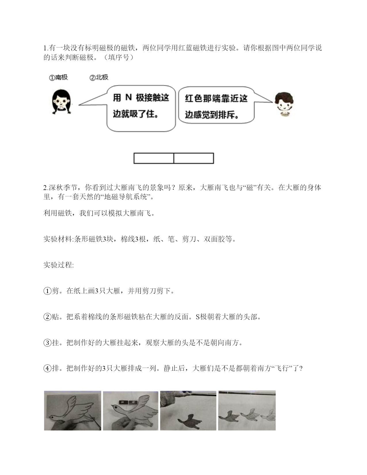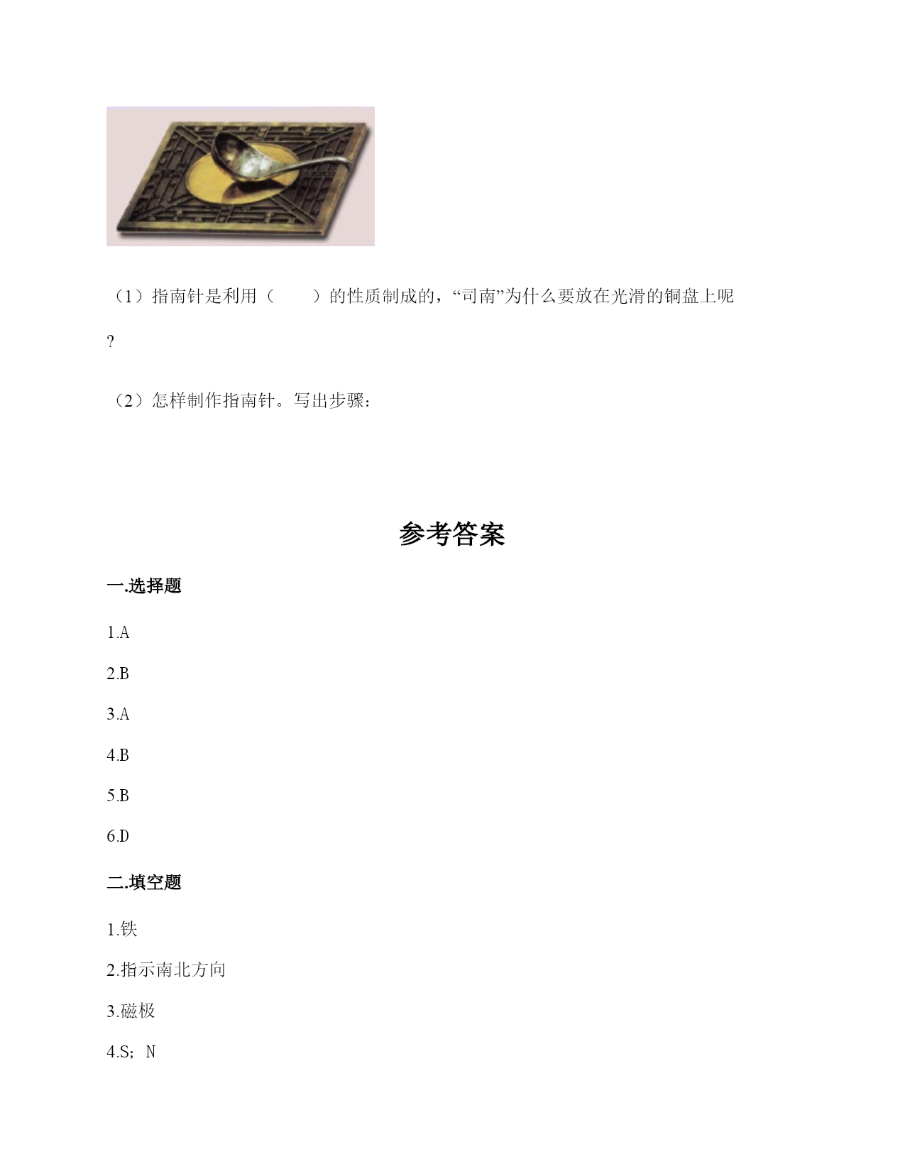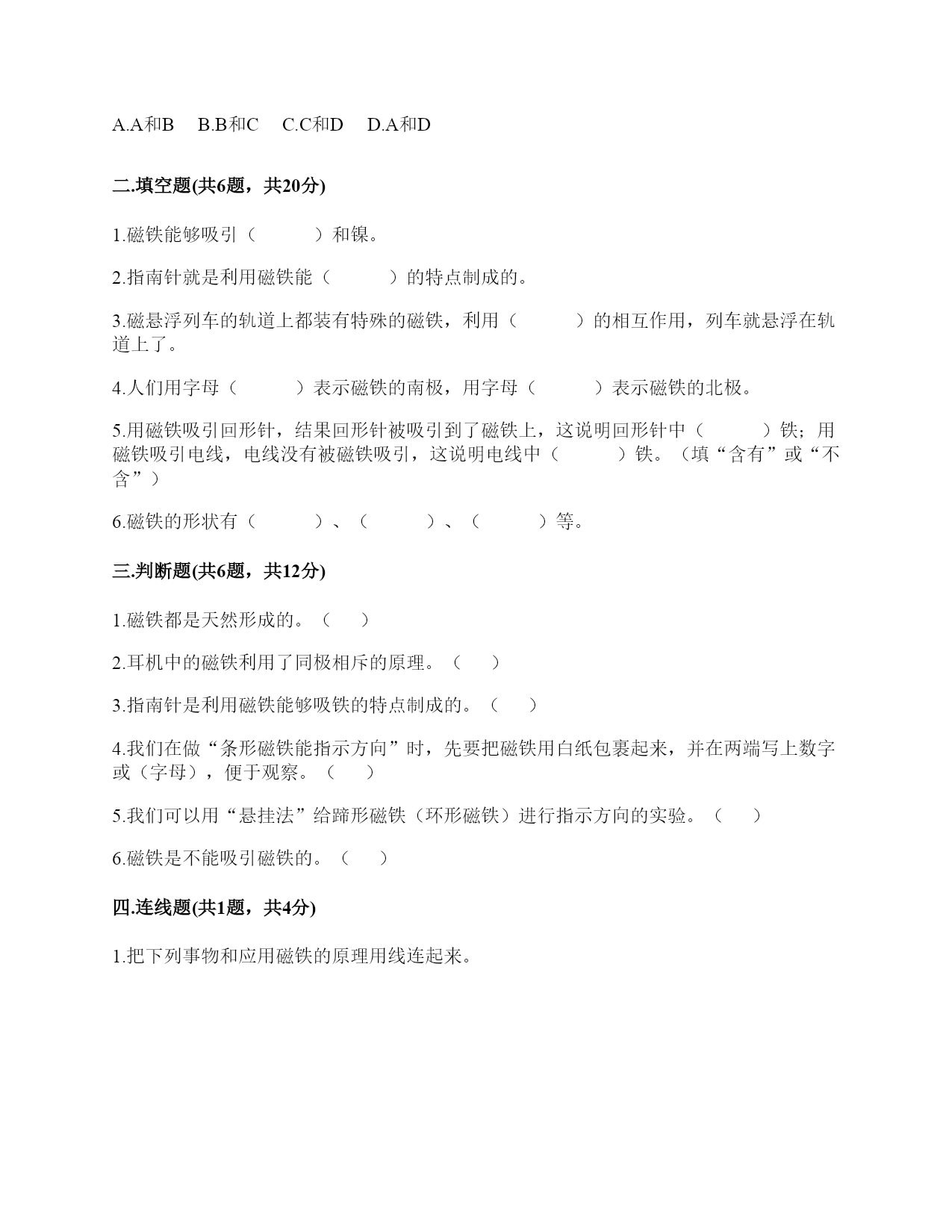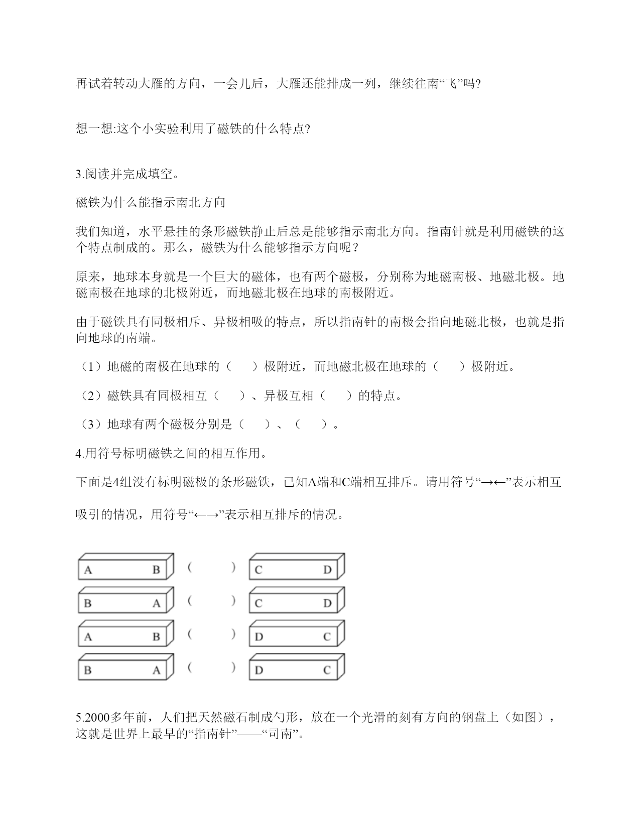小学科学《磁铁》练习题一.选择题(共6题,共12分)1.指南针的外壳所用的材质不可能是()。A.铁B.铜C.塑料2.现在很多门都会装上门吸,门吸利用的是磁铁磁极间()的性质。A.同极相互排斥B.异极相互吸引C.异极相互排斥3.磁铁上磁力最强的部分叫()。A.磁极B.磁力C.磁性4.磁铁上()的磁力最强。A.中间B.磁极C.外边D.里边5.()中的物品不都是制作水浮式指南针时所需要的材料。A.磁铁、指南针B.碗、A4纸C.钢针、水6.如图的条形磁铁磁力最强的部分是()。A.A和BB.B和CC.C和DD.A和D二.填空题(共6题,共20分)1.磁铁能够吸引()和镍。2.指南针就是利用磁铁能()的特点制成的。3.磁悬浮列车的轨道上都装有特殊的磁铁,利用()的相互作用,列车就悬浮在轨道上了。4.人们用字母()表示磁铁的南极,用字母()表示磁铁的北极。5.用磁铁吸引回形针,结果回形针被吸引到了磁铁上,这说明回形针中()铁;用磁铁吸引电线,电线没有被磁铁吸引,这说明电线中()铁。(填“含有”或“不含”)6.磁铁的形状有()、()、()等。三.判断题(共6题,共12分)1.磁铁都是天然形成的。()2.耳机中的磁铁利用了同极相斥的原理。()3.指南针是利用磁铁能够吸铁的特点制成的。()4.我们在做“条形磁铁能指示方向”时,先要把磁铁用白纸包裹起来,并在两端写上数字或(字母),便于观察。()5.我们可以用“悬挂法”给蹄形磁铁(环形磁铁)进行指示方向的实验。()6.磁铁是不能吸引磁铁的。()四.连线题(共1题,共4分)1.把下列事物和应用磁铁的原理用线连起来。五.简答题(共5题,共27分)1.请写出4种不同形状的磁铁的名称。2.磁铁宝宝相遇记有一天,两个磁铁宝宝在路上相遇了。他们两个都伸出右手,想和对方握握手。突然,一股力量把他俩推开,他们摔了个大跟斗。“妈妈,他推我,呜呜……”。磁铁宝宝哭着向妈妈告状。妈妈笑着说:“孩子,这是因为我们身体的特点造成的。”“什么特点呀?”磁铁宝宝好奇地问。妈妈说:“我们都有两个磁极,同极相斥、异极相吸。你俩都伸出右手,相互排斥,当然会摔大跟跟头。想一想,你们应该怎样握手呢?”两个磁铁宝宝想了想,再次伸出手,一股力量把两只小手紧紧地吸在了一起。解释文中划“()”的句子的发生现象。()3.简单说一说制作一个水浮式指南针的基本步骤有哪些?4.如何判断蹄形磁铁的磁极?5.你认为磁铁跟我们的生活有着怎样的关系?六.综合题(共5题,共34分)1.有一块没有标明磁极的磁铁,两位同学用红蓝磁铁进行实验。请你根据图中两位同学说的话来判断磁极。(填序号)2.深秋季节,你看到过大雁南飞的景象吗?原来,大雁南飞也与“磁”有关。在大雁的身体里,有一套天然的“地磁导航系统”。利用磁铁,我们可以模拟大雁南飞。实验材料:条形磁铁3块,棉线3根,纸、笔、剪刀、双面胶等。实验过程:①剪。在纸上画3只大雁,并用剪刀剪下。②贴。把系着棉线的条形磁铁粘在大雁的反面。S极朝着大雁的头部。③挂。把制作好的大雁挂起来,观察大雁的头是不是朝向南方。④排。把制作好的3只大雁排成一列。静止后,大雁们是不是都朝着南方“飞行”了?再试着转动大雁的方向,一会儿后,大雁还能排成一列,继续往南“飞”吗?想一想:这个小实验利用了磁铁的什么特点?3.阅读并完成填空。磁铁为什么能指示南北方向我们知道,水平悬挂的条形磁铁静止后总是能够指示南北方向。指南针就是利用磁铁的这个特点制成的。那么,磁铁为什么能够指示方向呢?原来,地球本身就是一个巨大的磁体,也有两个磁极,分别称为地磁南极、地磁北极。地磁南极在地球的北极附近,而地磁北极在地球的南极附近。由于磁铁具有同极相斥、异极相吸的特点,所以指南针的南极会指向地磁北极,也就是指向地球的南端。(1)地磁的南极在地球的()极附近,而地磁北极在地球的()极附近。(2)磁铁具有同极相互()、异极互相()的特点。(3)地球有两个磁极分别是()、()。4.用符号标明磁铁之间的相互作用。下面是4组没有标明磁极的条形磁铁,已知A端和C端相互排斥。请用符号“→←”表示相互吸引的情况,用符号“←→”表示相互排斥的情况。5.2000多年前,人们把天然磁石制成勺形,放在一个光滑的刻有方向的钢盘上(如图),这就是世界上最早的“指南针”——“司南”。(1)指南针是利用()的性质制成的,“司南”为什么要放在光滑的铜盘上呢?(2)怎样制作指南针。写出步骤:参考答案一.选择题1.A2.B3.A4.B5.B6.D二.填空题1.铁2.指示南北方向3.磁极4.S;N5.含有;不含6.条形磁铁;蹄形磁铁;