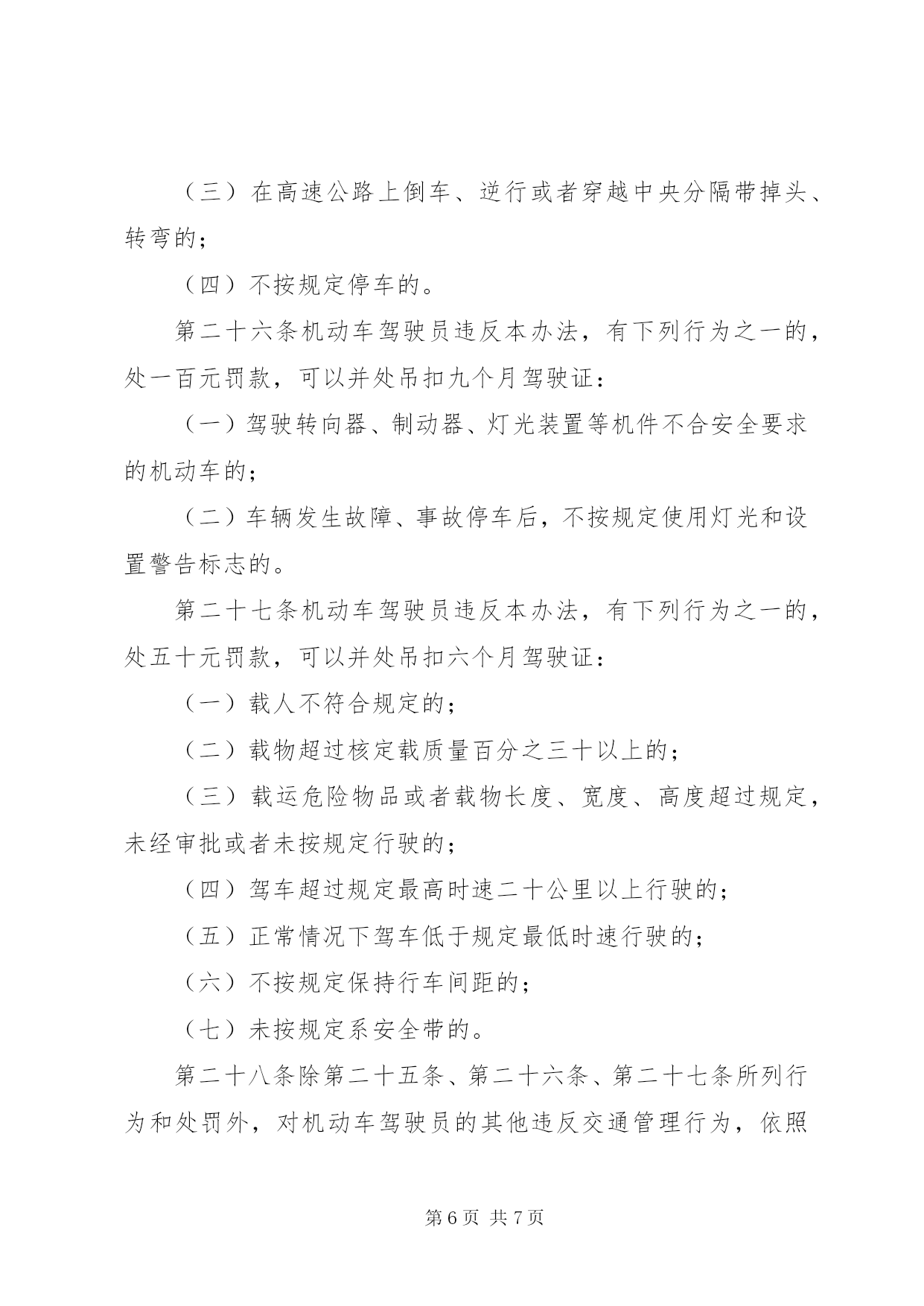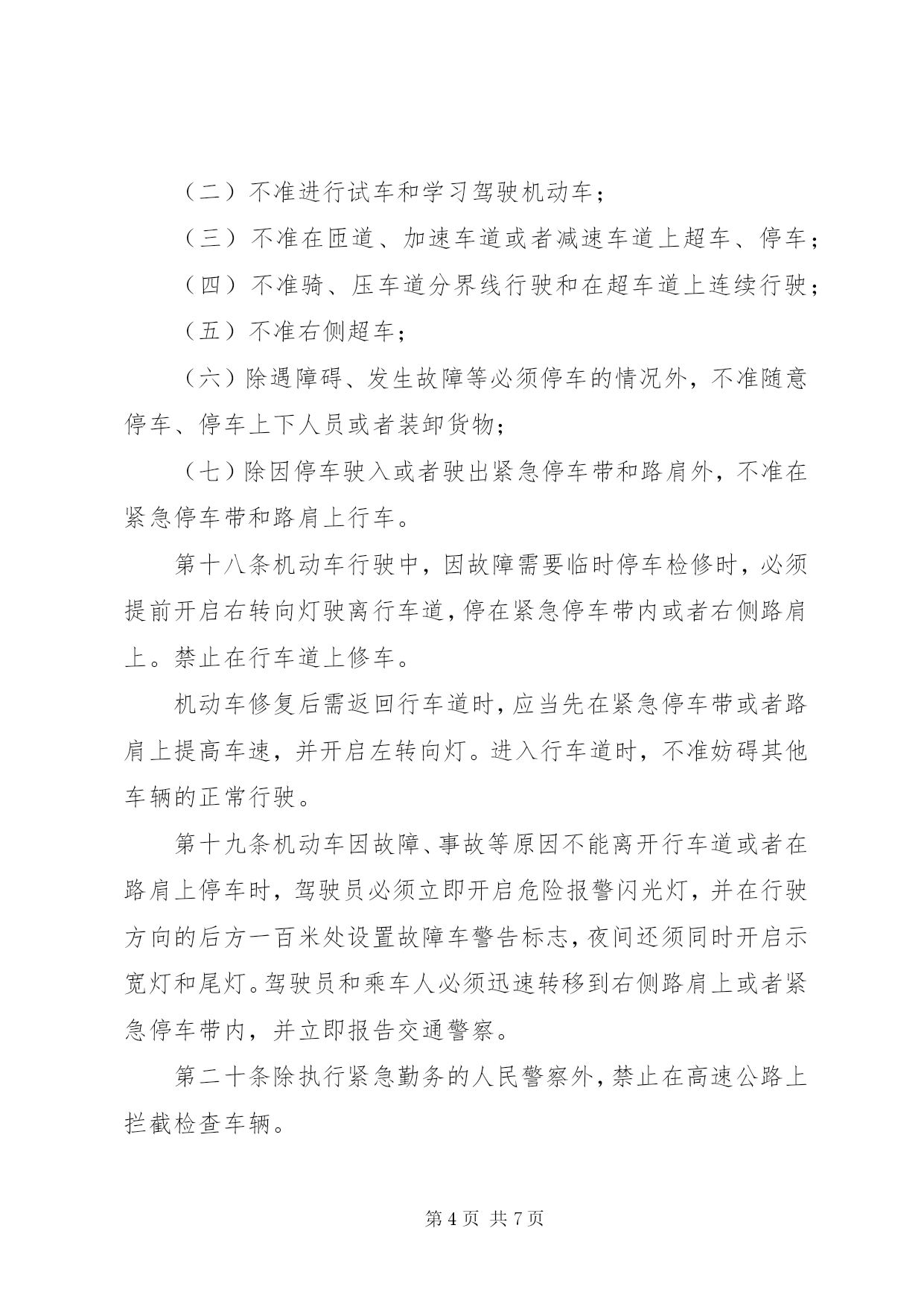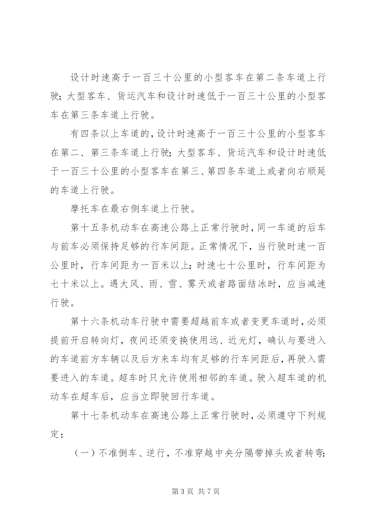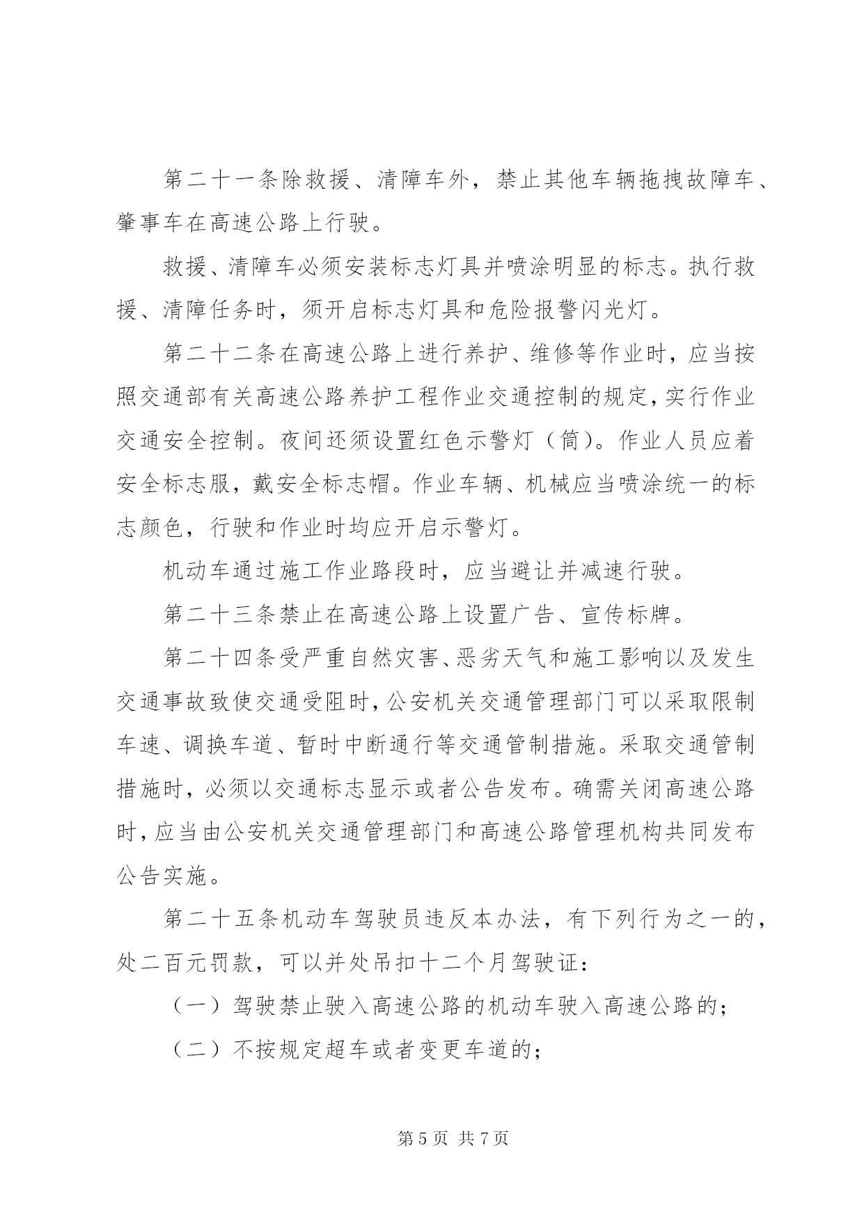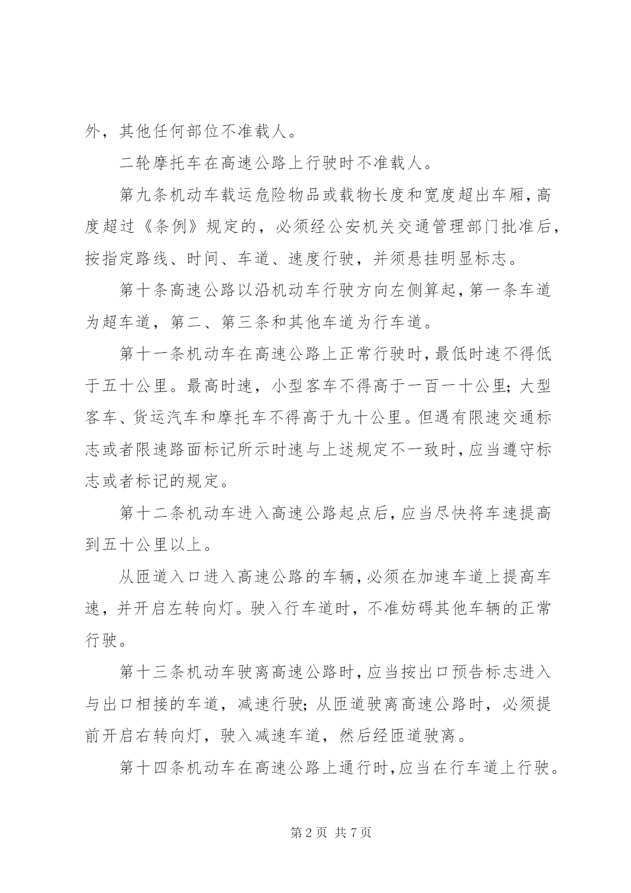 第PAGE\*Arabic\*MERGEFORMAT7页共NUMPAGES\*MERGEFORMAT7页管理高速公路交通制度第一条为了保障高速公路的交通安全和畅通,根据《中华人民共和国道路交通管理条例》(以下简称《条例》)第九十条的规定,制定本办法。第二条本办法所称的高速公路,是指经国家公路主管部门验收认定,符合高速公路工程技术标准,并设置完善的交通安全设施、管理设施和服务设施,专供机动车高速行驶的公路。第三条凡进入高速公路的机动车、乘车人以及进行养护等作业人员,必须遵守本办法。本办法未规定的,应当遵守《条例》的有关规定。第四条行人、非机动车、拖拉机、农用运输车、电瓶车、轮式专用机械车、全挂牵引车,以及设计最高时速低于七十公里的机动车辆,不得进入高速公路。高速公路养护等作业人员和专用的机动车不适用前款规定。实习驾驶员不准驾驶车辆进入高速公路。第五条进入高速公路的车辆应当配备故障车警告标志牌。第六条规定安装安全带的车辆,其驾驶员和前排乘车人必须系安全带。第七条机动车行驶中,乘车人不准站立,不准向车外抛洒物品。第八条货运机动车除驾驶室和车厢经核准设有的固定座位外,其他任何部位不准载人。二轮摩托车在高速公路上行驶时不准载人。第九条机动车载运危险物品或载物长度和宽度超出车厢,高度超过《条例》规定的,必须经公安机关交通管理部门批准后,按指定路线、时间、车道、速度行驶,并须悬挂明显标志。第十条高速公路以沿机动车行驶方向左侧算起,第一条车道为超车道,第二、第三条和其他车道为行车道。第十一条机动车在高速公路上正常行驶时,最低时速不得低于五十公里。最高时速,小型客车不得高于一百一十公里;大型客车、货运汽车和摩托车不得高于九十公里。但遇有限速交通标志或者限速路面标记所示时速与上述规定不一致时,应当遵守标志或者标记的规定。第十二条机动车进入高速公路起点后,应当尽快将车速提高到五十公里以上。从匝道入口进入高速公路的车辆,必须在加速车道上提高车速,并开启左转向灯。驶入行车道时,不准妨碍其他车辆的正常行驶。第十三条机动车驶离高速公路时,应当按出口预告标志进入与出口相接的车道,减速行驶;从匝道驶离高速公路时,必须提前开启右转向灯,驶入减速车道,然后经匝道驶离。第十四条机动车在高速公路上通行时,应当在行车道上行驶。设计时速高于一百三十公里的小型客车在第二条车道上行驶;大型客车、货运汽车和设计时速低于一百三十公里的小型客车在第三条车道上行驶。有四条以上车道的,设计时速高于一百三十公里的小型客车在第二、第三条车道上行驶;大型客车、货运汽车和设计时速低于一百三十公里的小型客车在第三、第四条车道上或者向右顺延的车道上行驶。摩托车在最右侧车道上行驶。第十五条机动车在高速公路上正常行驶时,同一车道的后车与前车必须保持足够的行车间距。正常情况下,当行驶时速一百公里时,行车间距为一百米以上;时速七十公里时,行车间距为七十米以上。遇大风、雨、雪、雾天或者路面结冰时,应当减速行驶。第十六条机动车行驶中需要超越前车或者变更车道时,必须提前开启转向灯,夜间还须变换使用远、近光灯,确认与要进入的车道前方车辆以及后方来车均有足够的行车间距后,再驶入需要进入的车道。超车时只允许使用相邻的车道。驶入超车道的机动车在超车后,应当立即驶回行车道。第十七条机动车在高速公路上正常行驶时,必须遵守下列规定:(一)不准倒车、逆行,不准穿越中央分隔带掉头或者转弯;(二)不准进行试车和学习驾驶机动车;(三)不准在匝道、加速车道或者减速车道上超车、停车;(四)不准骑、压车道分界线行驶和在超车道上连续行驶;(五)不准右侧超车;(六)除遇障碍、发生故障等必须停车的情况外,不准随意停车、停车上下人员或者装卸货物;(七)除因停车驶入或者驶出紧急停车带和路肩外,不准在紧急停车带和路肩上行车。第十八条机动车行驶中,因故障需要临时停车检修时,必须提前开启右转向灯驶离行车道,停在紧急停车带内或者右侧路肩上。禁止在行车道上修车。机动车修复后需返回行车道时,应当先在紧急停车带或者路肩上提高车速,并开启左转向灯。进入行车道时,不准妨碍其他车辆的正常行驶。第十九条机动车因故障、事故等原因不能离开行车道或者在路肩上停车时,驾驶员必须立即开启危险报警闪光灯,并在行驶方向的后方一百米处设置故障车警告标志,夜间还须同时开启示宽灯和尾灯。驾驶员和乘车人必须迅速转移到右侧路肩上或者紧急停车带内,并立即报告交通警察。第二十条除执行紧急勤务的人民警察外,禁止在高速公路上拦截检查车辆。第二十一条除救援、清障车外,禁止其他车辆拖拽故障车、肇事车在高速公路上行驶。救援、清障车必须安装标志灯具并喷涂明显的标志。执行救援、清障任务时,须开启标志灯具和危险报警闪光灯。第二十二条在高速公路上进行养护、维修等作业时,应当按照交通部有关高