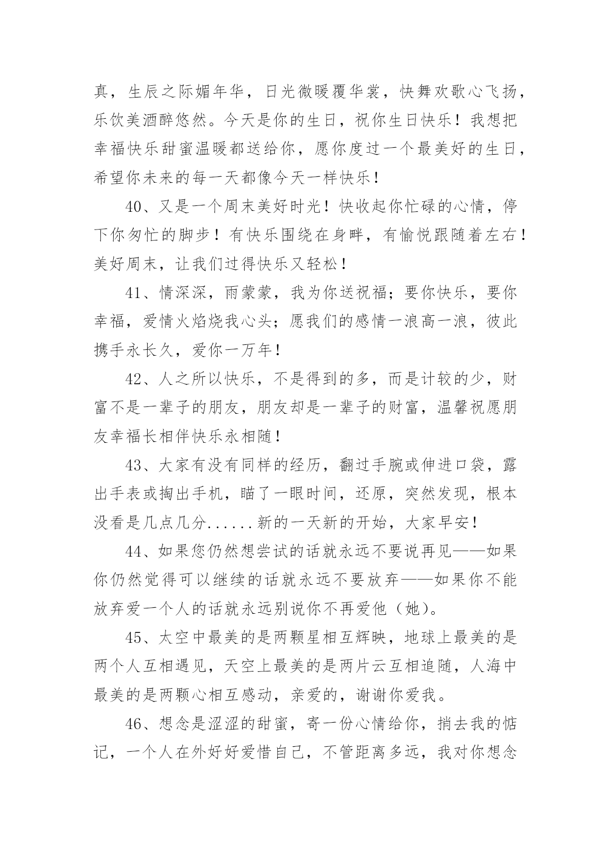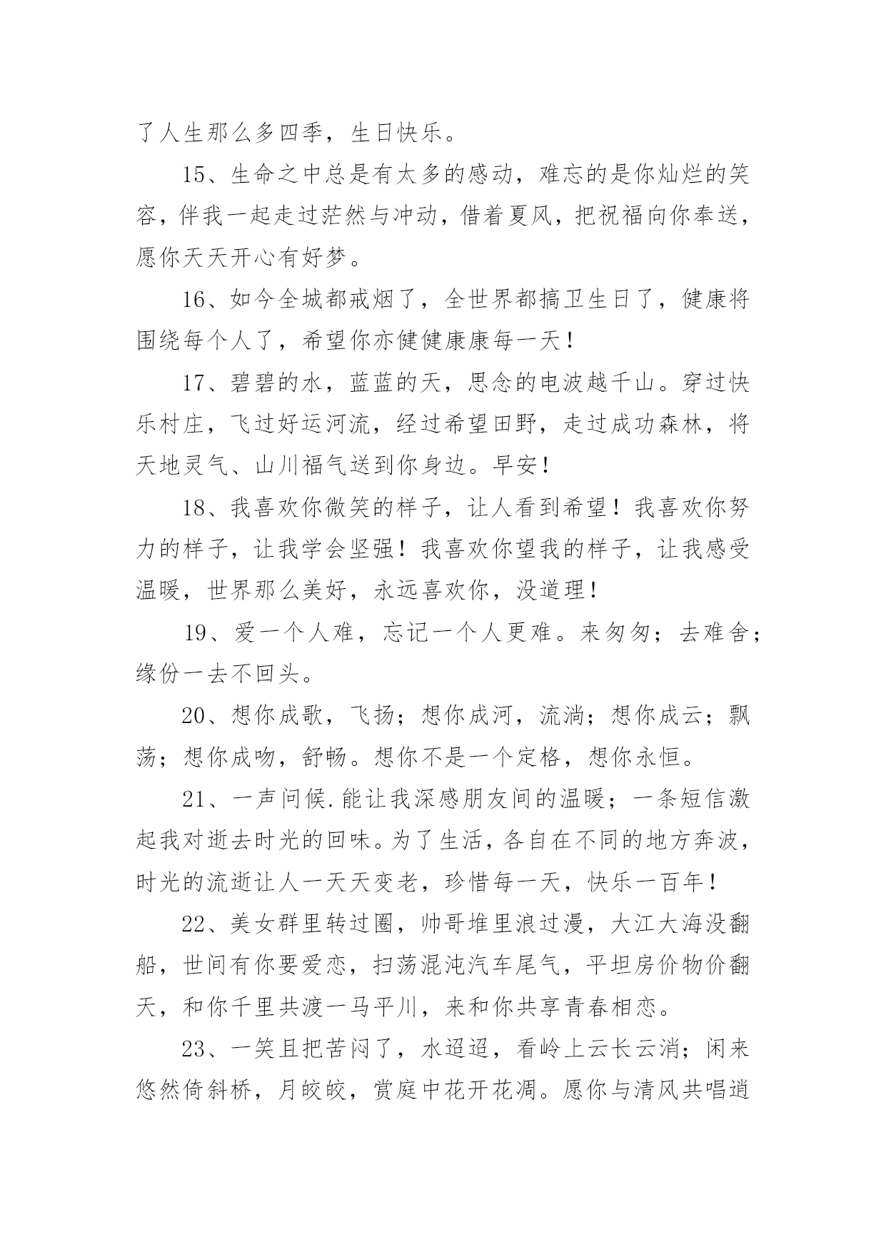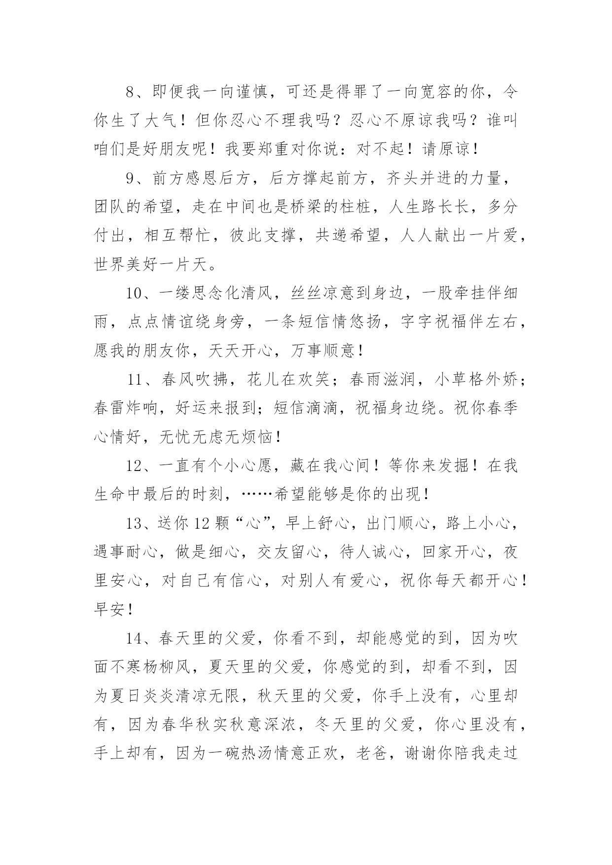 高考简短祝福语高考简短祝福语50句1、圣诞到来意非凡,耶稣诞辰在今天。世界从此不一般,痛苦远去人平安。圣诞老人礼物送,男女老少笑开颜。祝你吉祥又如意,事事顺利福无边。祝圣诞快乐!2、寂静的夜,愿月亮为你祈祷,星星为你唱摇篮曲,清风为你催眠,床为你带来放松,枕头带你进入梦乡,我的祝福送你好梦,晚安!3、又到暖春时节,心中的思念纠结。对你的挂念如春雨,绵绵不停歇;对你的关心如春风,吹拂着你的一切。亲爱的,我只盼你的幸福之花永不谢!4、早睡早起,规律作息;水果蔬菜,红枣枸杞;舒畅心情,不发脾气。转眼春季,发条信息,字字句句,祝你身体如绿树健硕,心情比花儿灿烂。5、玫瑰火了,巧克力火了,我也急上火了。别担心,再抠也不能抠你。不差钱,一毛钱的祝福送给你了,祝你快乐每一天!6、有人在吗?我是快递,麻烦你查收一下:一辈子的平安与幸福,蒸蒸日上的前途与事业,甜蜜的爱情与好心情,永远垂青你的好运气,请一定要收好啊!7、周末到,悠闲享,健康身体要关照;莫烦恼,莫忧伤,莫让心情多烦躁;笑脸展,享悠闲,轻松自在逍遥显;愿舒坦,愿开怀,幸福快乐无边界。8、即便我一向谨慎,可还是得罪了一向宽容的你,令你生了大气!但你忍心不理我吗?忍心不原谅我吗?谁叫咱们是好朋友呢!我要郑重对你说:对不起!请原谅!9、前方感恩后方,后方撑起前方,齐头并进的力量,团队的希望,走在中间也是桥梁的柱桩,人生路长长,多分付出,相互帮忙,彼此支撑,共递希望,人人献出一片爱,世界美好一片天。10、一缕思念化清风,丝丝凉意到身边,一股牵挂伴细雨,点点情谊绕身旁,一条短信情悠扬,字字祝福伴左右,愿我的朋友你,天天开心,万事顺意!11、春风吹拂,花儿在欢笑;春雨滋润,小草格外娇;春雷炸响,好运来报到;短信滴滴,祝福身边绕。祝你春季心情好,无忧无虑无烦恼!12、一直有个小心愿,藏在我心间!等你来发掘!在我生命中最后的时刻,……希望能够是你的出现!13、送你12颗“心”,早上舒心,出门顺心,路上小心,遇事耐心,做是细心,交友留心,待人诚心,回家开心,夜里安心,对自己有信心,对别人有爱心,祝你每天都开心!早安!14、春天里的父爱,你看不到,却能感觉的到,因为吹面不寒杨柳风,夏天里的父爱,你感觉的到,却看不到,因为夏日炎炎清凉无限,秋天里的父爱,你手上没有,心里却有,因为春华秋实秋意深浓,冬天里的父爱,你心里没有,手上却有,因为一碗热汤情意正欢,老爸,谢谢你陪我走过了人生那么多四季,生日快乐。15、生命之中总是有太多的感动,难忘的是你灿烂的笑容,伴我一起走过茫然与冲动,借着夏风,把祝福向你奉送,愿你天天开心有好梦。16、如今全城都戒烟了,全世界都搞卫生日了,健康将围绕每个人了,希望你亦健健康康每一天!17、碧碧的水,蓝蓝的天,思念的电波越千山。穿过快乐村庄,飞过好运河流,经过希望田野,走过成功森林,将天地灵气、山川福气送到你身边。早安!18、我喜欢你微笑的样子,让人看到希望!我喜欢你努力的样子,让我学会坚强!我喜欢你望我的样子,让我感受温暖,世界那么美好,永远喜欢你,没道理!19、爱一个人难,忘记一个人更难。来匆匆;去难舍;缘份一去不回头。20、想你成歌,飞扬;想你成河,流淌;想你成云;飘荡;想你成吻,舒畅。想你不是一个定格,想你永恒。21、一声问候.能让我深感朋友间的温暖;一条短信激起我对逝去时光的回味。为了生活,各自在不同的地方奔波,时光的流逝让人一天天变老,珍惜每一天,快乐一百年!22、美女群里转过圈,帅哥堆里浪过漫,大江大海没翻船,世间有你要爱恋,扫荡混沌汽车尾气,平坦房价物价翻天,和你千里共渡一马平川,来和你共享青春相恋。23、一笑且把苦闷了,水迢迢,看岭上云长云消;闲来悠然倚斜桥,月皎皎,赏庭中花开花凋。愿你与清风共唱逍遥调,万丈红尘心不老,快乐无烦恼。早安24、不该捕风捉影地猜测,不该莫名其妙地妒忌,不该肆无忌惮的生气,不该怨天尤人的埋怨,求你不要轻而易举地放弃,不要毫不犹豫地拒绝,一切只因爱你,真爱无罪,原来我吧!25、这一季的花开得格外娇艳,你可知,那是因为我用情感在浇灌只等你的生日赠与你,愿你喜欢。26、懒人委员质量检测协会认定,你成为年度新三好青年!希望你再接再厉,继续保持吃得好,睡得好,玩得好的优良作风!27、驾着星期号航船,从星期一慵懒港口出发,经过星期二忙碌沙滩,驶向星期三焦急领海,穿越星期四期盼海峡,进入星期五快乐公海。愿你周末玩得精彩。28、我的祝福越过世界最长的城墙—中国万里长城,走过世界最古老的东西贸易通道—丝绸之路,来到你的身边,你千万要收到,否则它这些跋涉都变得毫无意义!29、春节长假乐开怀,阖家欢乐展笑颜;喜气环绕在身旁,调整心态收收心;带着快乐的激情,载上幸福的氛围;为工作燃起斗志,为梦想继续奋斗。祝朋友节后愉快!30、寿与七伴:寿与众伴远离孤独;寿