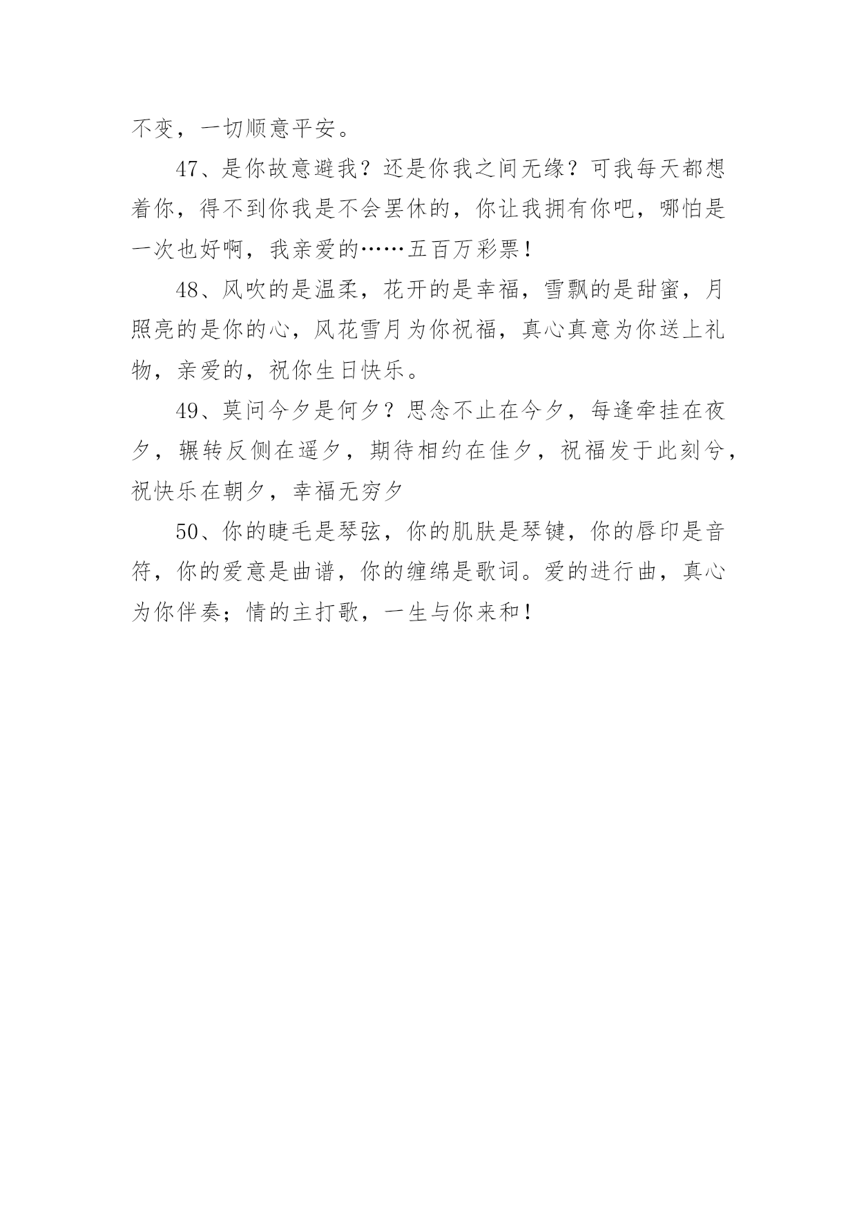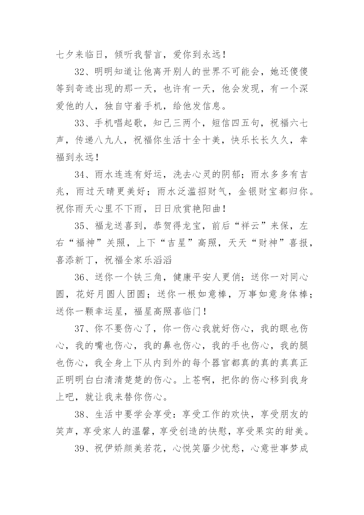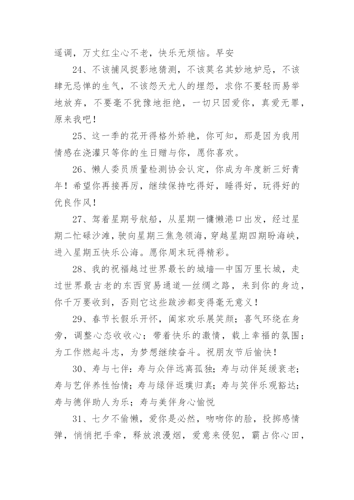 高考简短祝福语高考简短祝福语50句1、圣诞到来意非凡,耶稣诞辰在今天。世界从此不一般,痛苦远去人平安。圣诞老人礼物送,男女老少笑开颜。祝你吉祥又如意,事事顺利福无边。祝圣诞快乐!2、寂静的夜,愿月亮为你祈祷,星星为你唱摇篮曲,清风为你催眠,床为你带来放松,枕头带你进入梦乡,我的祝福送你好梦,晚安!3、又到暖春时节,心中的思念纠结。对你的挂念如春雨,绵绵不停歇;对你的关心如春风,吹拂着你的一切。亲爱的,我只盼你的幸福之花永不谢!4、早睡早起,规律作息;水果蔬菜,红枣枸杞;舒畅心情,不发脾气。转眼春季,发条信息,字字句句,祝你身体如绿树健硕,心情比花儿灿烂。5、玫瑰火了,巧克力火了,我也急上火了。别担心,再抠也不能抠你。不差钱,一毛钱的祝福送给你了,祝你快乐每一天!6、有人在吗?我是快递,麻烦你查收一下:一辈子的平安与幸福,蒸蒸日上的前途与事业,甜蜜的爱情与好心情,永远垂青你的好运气,请一定要收好啊!7、周末到,悠闲享,健康身体要关照;莫烦恼,莫忧伤,莫让心情多烦躁;笑脸展,享悠闲,轻松自在逍遥显;愿舒坦,愿开怀,幸福快乐无边界。8、即便我一向谨慎,可还是得罪了一向宽容的你,令你生了大气!但你忍心不理我吗?忍心不原谅我吗?谁叫咱们是好朋友呢!我要郑重对你说:对不起!请原谅!9、前方感恩后方,后方撑起前方,齐头并进的力量,团队的希望,走在中间也是桥梁的柱桩,人生路长长,多分付出,相互帮忙,彼此支撑,共递希望,人人献出一片爱,世界美好一片天。10、一缕思念化清风,丝丝凉意到身边,一股牵挂伴细雨,点点情谊绕身旁,一条短信情悠扬,字字祝福伴左右,愿我的朋友你,天天开心,万事顺意!11、春风吹拂,花儿在欢笑;春雨滋润,小草格外娇;春雷炸响,好运来报到;短信滴滴,祝福身边绕。祝你春季心情好,无忧无虑无烦恼!12、一直有个小心愿,藏在我心间!等你来发掘!在我生命中最后的时刻,……希望能够是你的出现!13、送你12颗“心”,早上舒心,出门顺心,路上小心,遇事耐心,做是细心,交友留心,待人诚心,回家开心,夜里安心,对自己有信心,对别人有爱心,祝你每天都开心!早安!14、春天里的父爱,你看不到,却能感觉的到,因为吹面不寒杨柳风,夏天里的父爱,你感觉的到,却看不到,因为夏日炎炎清凉无限,秋天里的父爱,你手上没有,心里却有,因为春华秋实秋意深浓,冬天里的父爱,你心里没有,手上却有,因为一碗热汤情意正欢,老爸,谢谢你陪我走过了人生那么多四季,生日快乐。15、生命之中总是有太多的感动,难忘的是你灿烂的笑容,伴我一起走过茫然与冲动,借着夏风,把祝福向你奉送,愿你天天开心有好梦。16、如今全城都戒烟了,全世界都搞卫生日了,健康将围绕每个人了,希望你亦健健康康每一天!17、碧碧的水,蓝蓝的天,思念的电波越千山。穿过快乐村庄,飞过好运河流,经过希望田野,走过成功森林,将天地灵气、山川福气送到你身边。早安!18、我喜欢你微笑的样子,让人看到希望!我喜欢你努力的样子,让我学会坚强!我喜欢你望我的样子,让我感受温暖,世界那么美好,永远喜欢你,没道理!19、爱一个人难,忘记一个人更难。来匆匆;去难舍;缘份一去不回头。20、想你成歌,飞扬;想你成河,流淌;想你成云;飘荡;想你成吻,舒畅。想你不是一个定格,想你永恒。21、一声问候.能让我深感朋友间的温暖;一条短信激起我对逝去时光的回味。为了生活,各自在不同的地方奔波,时光的流逝让人一天天变老,珍惜每一天,快乐一百年!22、美女群里转过圈,帅哥堆里浪过漫,大江大海没翻船,世间有你要爱恋,扫荡混沌汽车尾气,平坦房价物价翻天,和你千里共渡一马平川,来和你共享青春相恋。23、一笑且把苦闷了,水迢迢,看岭上云长云消;闲来悠然倚斜桥,月皎皎,赏庭中花开花凋。愿你与清风共唱逍遥调,万丈红尘心不老,快乐无烦恼。早安24、不该捕风捉影地猜测,不该莫名其妙地妒忌,不该肆无忌惮的生气,不该怨天尤人的埋怨,求你不要轻而易举地放弃,不要毫不犹豫地拒绝,一切只因爱你,真爱无罪,原来我吧!25、这一季的花开得格外娇艳,你可知,那是因为我用情感在浇灌只等你的生日赠与你,愿你喜欢。26、懒人委员质量检测协会认定,你成为年度新三好青年!希望你再接再厉,继续保持吃得好,睡得好,玩得好的优良作风!27、驾着星期号航船,从星期一慵懒港口出发,经过星期二忙碌沙滩,驶向星期三焦急领海,穿越星期四期盼海峡,进入星期五快乐公海。愿你周末玩得精彩。28、我的祝福越过世界最长的城墙—中国万里长城,走过世界最古老的东西贸易通道—丝绸之路,来到你的身边,你千万要收到,否则它这些跋涉都变得毫无意义!29、春节长假乐开怀,阖家欢乐展笑颜;喜气环绕在身旁,调整心态收收心;带着快乐的激情,载上幸福的氛围;为工作燃起斗志,为梦想继续奋斗。祝朋友节后愉快!30、寿与七伴:寿与众伴远离孤独;寿