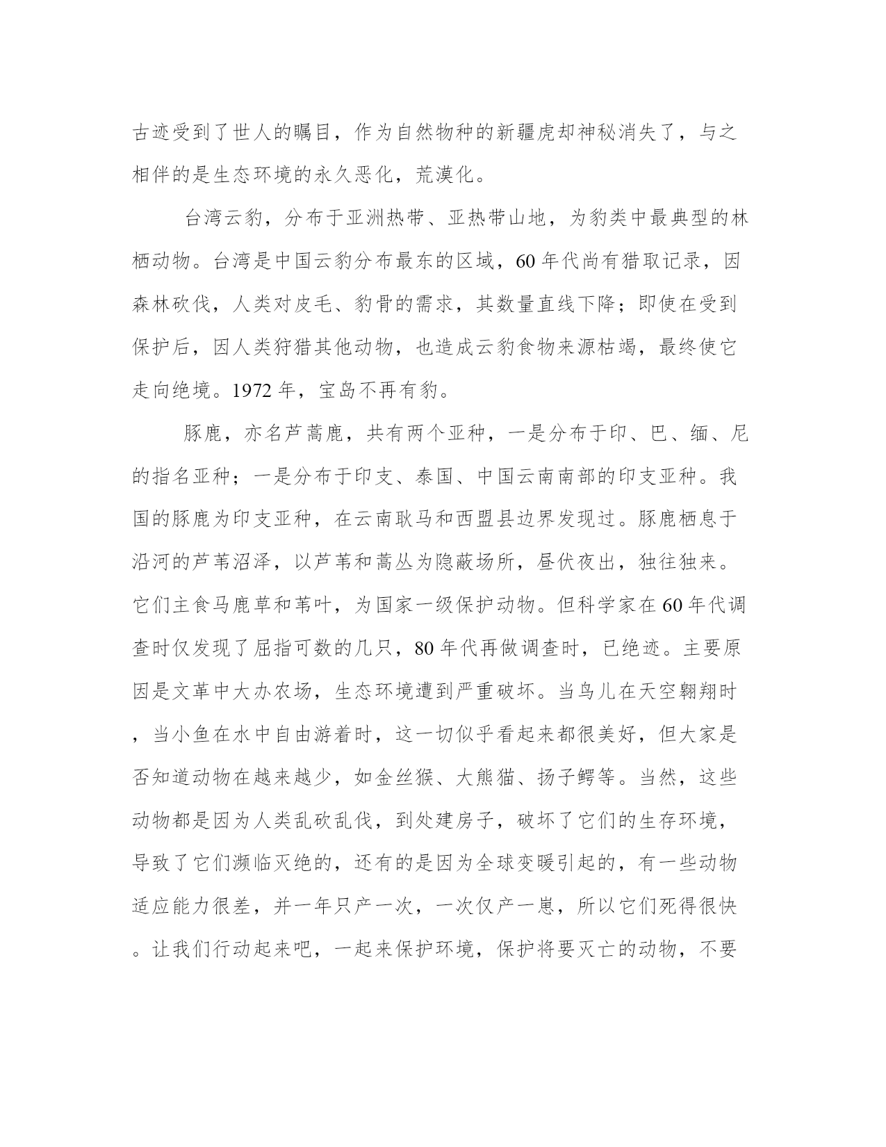 有关绿色环保的倡议书我是一个普通的小学生,不过,我非常关心现在的环境。你们也知道,地球是我们的家园,环境与我们的生活息息相关。人类大量的消耗水资源和污染环境,已经把一个美丽的地球毁的不象样了。水渐渐少了,动植物濒临灭绝……这一切都是因为人类不注意保护环境造成的。由于森林资源稀少和野外动植物栖息地的破坏,以及乱捕滥猎、乱采滥挖等违法行为屡禁不止,我国很多珍贵稀有动植物都处于濒危状态。初步统计显示,我国处于濒危状态的动植物物种为15%至20%,远高于10%至15%的世界水平。人们到处砍伐树木,现在全世界平均一年砍掉1100万公顷森林,这是几个多么大的数字啊!人们还随手丢垃圾,那发臭的河面上漂浮着垃圾、那肮脏的树枝上挂着塑料袋、那黑黑的草地上堆着果皮和纸屑。环境遭到了很大的破坏,清清的小河、绿绿的森林、蓝蓝的天空都消失的无影无踪了,地球渐渐被毁灭,人类也渐渐死亡。可是,地球一次又一次地原谅我们,希望我们珍惜人类赖以生存的地球妈妈。新疆虎,1916年由瑞典探险家斯文发现于罗布泊、库尔勒,为虎中的一支独立亚种,体长约3米,体重约230公斤。他在罗布泊探险一书中对虎的遗骸被蚁类吞噬的情景进行了记述。斯文当时向全世界公布了两个奇迹,一是楼兰古迹,一是新疆虎。作为人文遗址的楼兰古迹受到了世人的瞩目,作为自然物种的新疆虎却神秘消失了,与之相伴的是生态环境的永久恶化,荒漠化。台湾云豹,分布于亚洲热带、亚热带山地,为豹类中最典型的林栖动物。台湾是中国云豹分布最东的区域,60年代尚有猎取记录,因森林砍伐,人类对皮毛、豹骨的需求,其数量直线下降;即使在受到保护后,因人类狩猎其他动物,也造成云豹食物来源枯竭,最终使它走向绝境。1972年,宝岛不再有豹。豚鹿,亦名芦蒿鹿,共有两个亚种,一是分布于印、巴、缅、尼的指名亚种;一是分布于印支、泰国、中国云南南部的印支亚种。我国的豚鹿为印支亚种,在云南耿马和西盟县边界发现过。豚鹿栖息于沿河的芦苇沼泽,以芦苇和蒿丛为隐蔽场所,昼伏夜出,独往独来。它们主食马鹿草和苇叶,为国家一级保护动物。但科学家在60年代调查时仅发现了屈指可数的几只,80年代再做调查时,已绝迹。主要原因是文革中大办农场,生态环境遭到严重破坏。当鸟儿在天空翱翔时,当小鱼在水中自由游着时,这一切似乎看起来都很美好,但大家是否知道动物在越来越少,如金丝猴、大熊猫、扬子鳄等。当然,这些动物都是因为人类乱砍乱伐,到处建房子,破坏了它们的生存环境,导致了它们濒临灭绝的,还有的是因为全球变暖引起的,有一些动物适应能力很差,并一年只产一次,一次仅产一崽,所以它们死得很快。让我们行动起来吧,一起来保护环境,保护将要灭亡的动物,不要让我们的下一辈看不见我们看见过的动物,让我们呼吁:“保护环境与保护动物息息相关!”