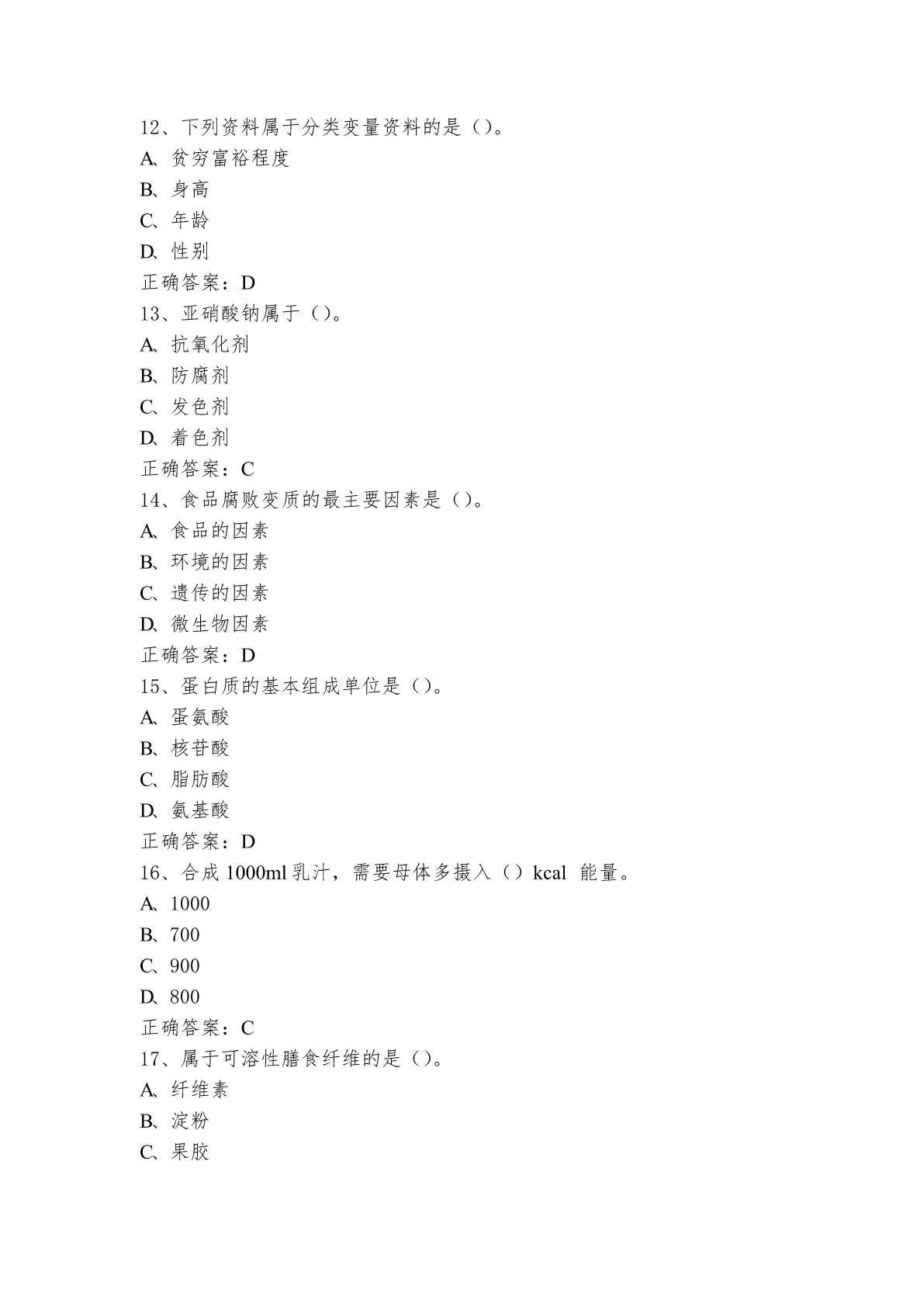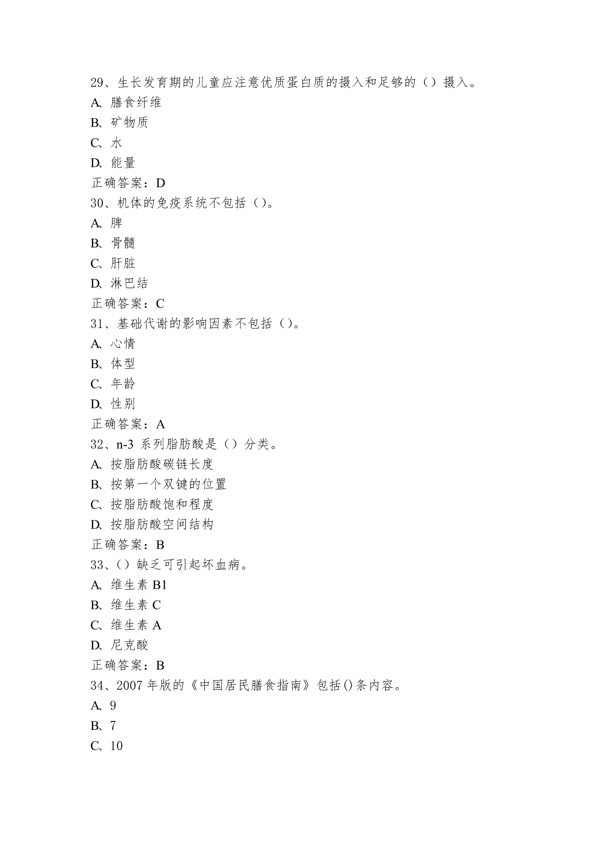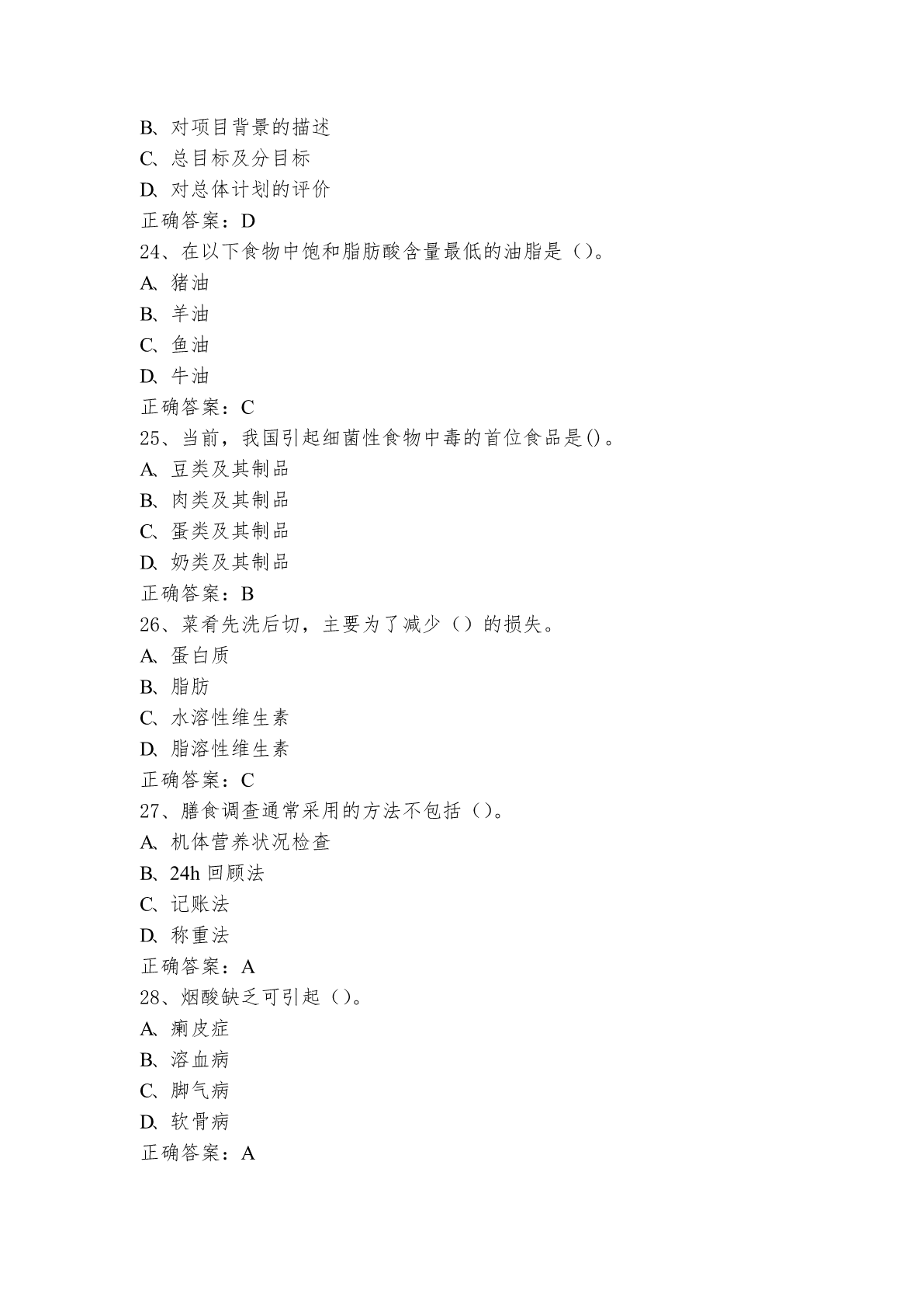 公共营养师练习题库(含答案)一、单选题(共60题,每题1分,共60分)1、一个人吃()为1个人日。A、晚餐B、中餐C、早餐D、三餐正确答案:D2、在职业交往活动中,符合仪表端庄具体要求的是()。A、饰品俏丽B、着装华贵C、出个性化D、适当化妆正确答案:D3、下列食物中含铁量较多、吸收率最高的是()。A、大米B、奶类C、黑豆D、肉类正确答案:D4、下列防腐剂不影响尿中蛋白质和糖定性实验的是()。A、氯仿B、浓盐酸C、甲苯D、混合防腐剂正确答案:D5、植物类食品中蛋白质含量最高的是()。A、小麦B、玉米C、大豆D、大米正确答案:C6、富含蛋白质的食品腐败变质最灵敏的鉴别指标是()。A、感官指标B、物理指标C、化学指标D、微生物指标正确答案:A7、孕妇易缺乏的微量元素有()。A、锰、铁、锌B、铁、碘、锌C、钙、铁、碘D、铜、碘、锌正确答案:B8、维生素B1缺乏课引起()。A、佝偻症B、瘌皮症C、脚气病D、克仃病正确答案:B9、能直接被小肠吸收的碳水化物是()。A、单糖B、双糖C、麦芽糖D、糖原正确答案:A10、反映食物蛋白质消耗吸收后,被机体利用程度的指标是蛋白质()。A、真消化率B、生物价C、氨基酸评分D、消化率正确答案:B11、坚果是以种为公用部,下列品种属于坚果的是()。A、杏干B、腰果C、桃D、蜜枣正确答案:B12、下列资料属于分类变量资料的是()。A、贫穷富裕程度B、身高C、年龄D、性别正确答案:D13、亚硝酸钠属于()。A、抗氧化剂B、防腐剂C、发色剂D、着色剂正确答案:C14、食品腐败变质的最主要因素是()。A、食品的因素B、环境的因素C、遗传的因素D、微生物因素正确答案:D15、蛋白质的基本组成单位是()。A、蛋氨酸B、核苷酸C、脂肪酸D、氨基酸正确答案:D16、合成1000ml乳汁,需要母体多摄入()kcal能量。A、1000B、700C、900D、800正确答案:C17、属于可溶性膳食纤维的是()。A、纤维素B、淀粉C、果胶D、木质素正确答案:C18、下列关于人乳和牛乳中脂肪的比较,正确的是()。A、人乳中脂肪的种类比牛乳多,而总的含量比牛乳少B、人乳中脂肪的种类比牛乳少,而总的含量比牛乳多C、人乳中脂肪的种类和含量均比牛乳多D、人乳中脂肪的种类和含量均比牛乳少正确答案:C19、地中海膳食结构的代表国家是()。A、发展中国家B、意大利希腊C、欧美发达国家D、日本正确答案:B20、乳中的()可促进肠道对钙的吸收。A、乳清蛋白B、酪蛋白C、乳糖D、短链脂肪酸正确答案:C21、考虑营养需要及产妇的身体状况,正常分娩后适宜进食()。A、半流质食物,如蛋花汤B、流质食物,如果汁C、豆浆D、固体食物,如肉、煮鸡蛋、饼干等正确答案:A22、维生素E中,以()的生物活性最高。A、Y-生育酚B、α-生育酚C、α-三烯生育酚D、β-生育酚正确答案:B23、营养改善项目总体计划内容不包括()。A、时间安排B、对项目背景的描述C、总目标及分目标D、对总体计划的评价正确答案:D24、在以下食物中饱和脂肪酸含量最低的油脂是()。A、猪油B、羊油C、鱼油D、牛油正确答案:C25、当前,我国引起细菌性食物中毒的首位食品是()。A、豆类及其制品B、肉类及其制品C、蛋类及其制品D、奶类及其制品正确答案:B26、菜肴先洗后切,主要为了减少()的损失。A、蛋白质B、脂肪C、水溶性维生素D、脂溶性维生素正确答案:C27、膳食调查通常采用的方法不包括()。A、机体营养状况检查B、24h回顾法C、记账法D、称重法正确答案:A28、烟酸缺乏可引起()。A、瘌皮症B、溶血病C、脚气病D、软骨病正确答案:A29、生长发育期的儿童应注意优质蛋白质的摄入和足够的()摄入。A、膳食纤维B、矿物质C、水D、能量正确答案:D30、机体的免疫系统不包括()。A、脾B、骨髓C、肝脏D、淋巴结正确答案:C31、基础代谢的影响因素不包括()。A、心情B、体型C、年龄D、性别正确答案:A32、n-3系列脂肪酸是()分类。A、按脂肪酸碳链长度B、按第一个双键的位置C、按脂肪酸饱和程度D、按脂肪酸空间结构正确答案:B33、()缺乏可引起坏血病。A、维生素B1B、维生素CC、维生素AD、尼克酸正确答案:B34、2007年版的《中国居民膳食指南》包括()条内容。A、9B、7C、10