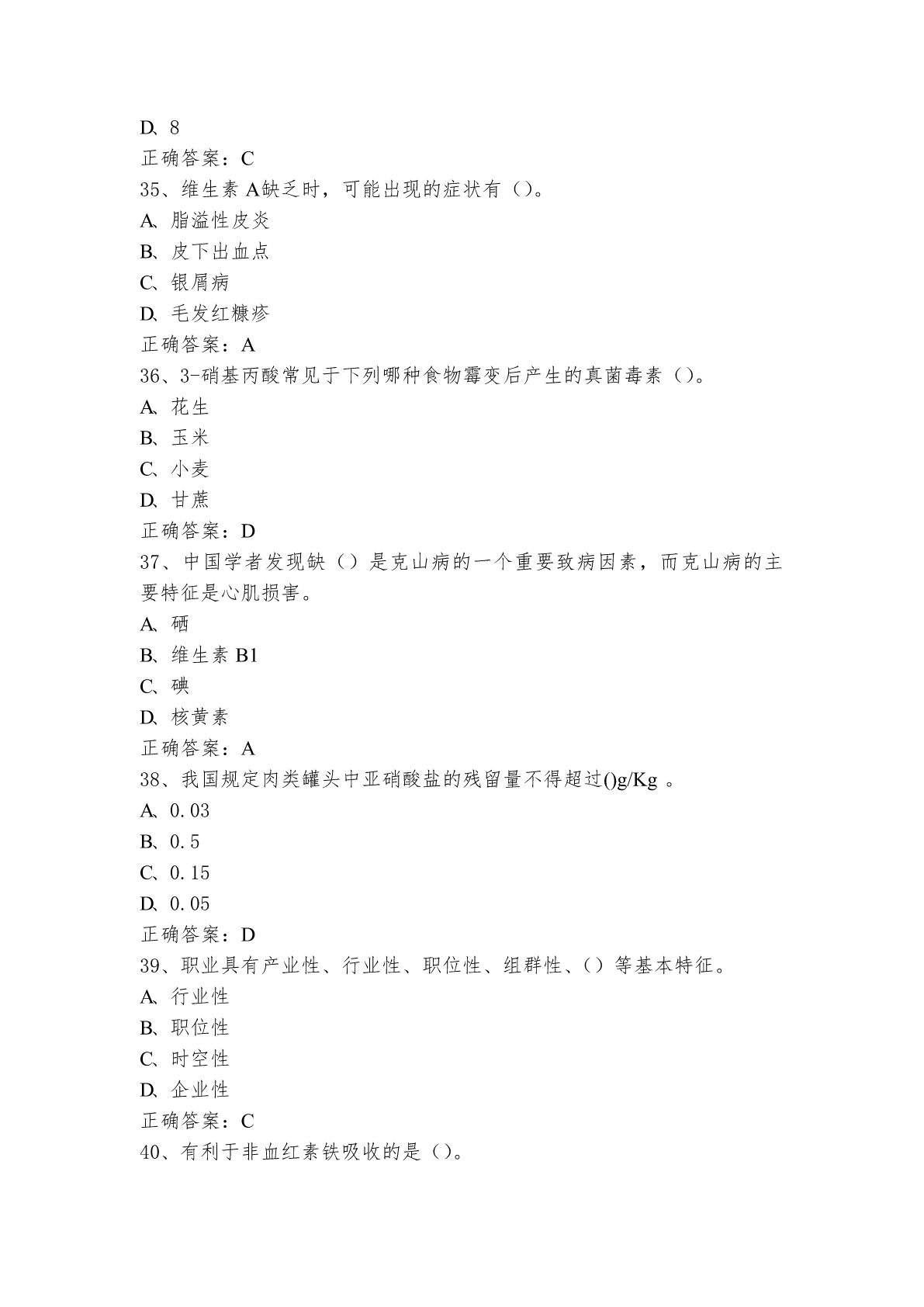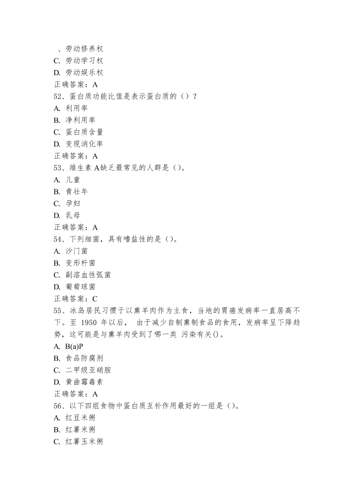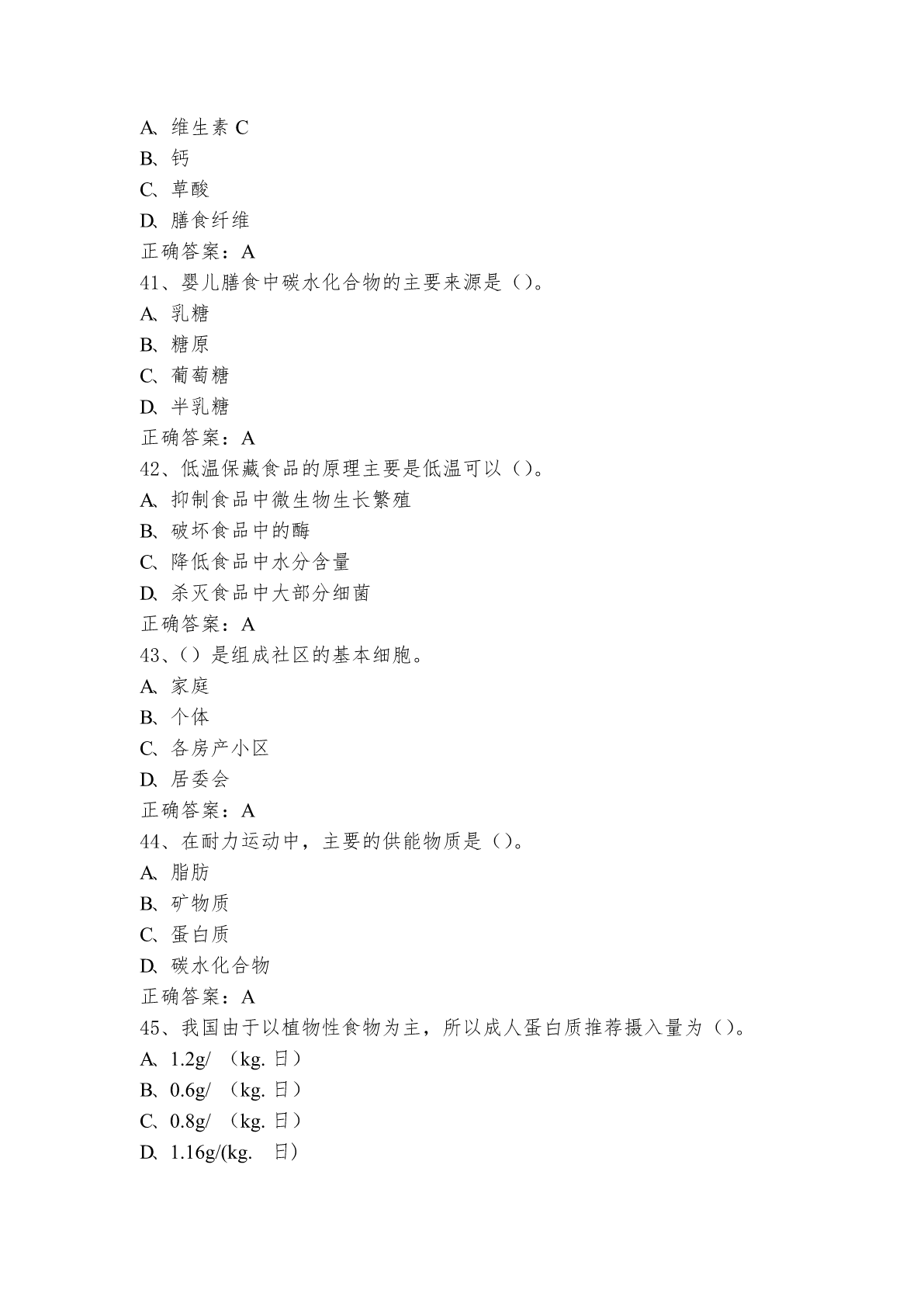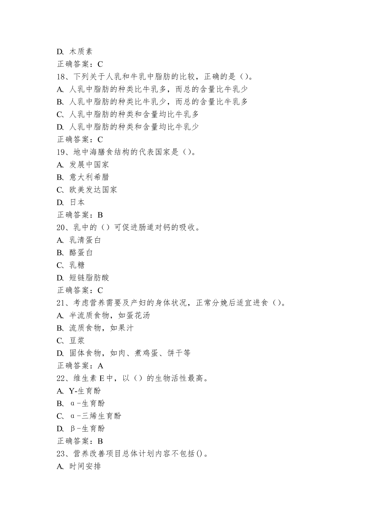 公共营养师练习题库(含答案)一、单选题(共60题,每题1分,共60分)1、一个人吃()为1个人日。A、晚餐B、中餐C、早餐D、三餐正确答案:D2、在职业交往活动中,符合仪表端庄具体要求的是()。A、饰品俏丽B、着装华贵C、出个性化D、适当化妆正确答案:D3、下列食物中含铁量较多、吸收率最高的是()。A、大米B、奶类C、黑豆D、肉类正确答案:D4、下列防腐剂不影响尿中蛋白质和糖定性实验的是()。A、氯仿B、浓盐酸C、甲苯D、混合防腐剂正确答案:D5、植物类食品中蛋白质含量最高的是()。A、小麦B、玉米C、大豆D、大米正确答案:C6、富含蛋白质的食品腐败变质最灵敏的鉴别指标是()。A、感官指标B、物理指标C、化学指标D、微生物指标正确答案:A7、孕妇易缺乏的微量元素有()。A、锰、铁、锌B、铁、碘、锌C、钙、铁、碘D、铜、碘、锌正确答案:B8、维生素B1缺乏课引起()。A、佝偻症B、瘌皮症C、脚气病D、克仃病正确答案:B9、能直接被小肠吸收的碳水化物是()。A、单糖B、双糖C、麦芽糖D、糖原正确答案:A10、反映食物蛋白质消耗吸收后,被机体利用程度的指标是蛋白质()。A、真消化率B、生物价C、氨基酸评分D、消化率正确答案:B11、坚果是以种为公用部,下列品种属于坚果的是()。A、杏干B、腰果C、桃D、蜜枣正确答案:B12、下列资料属于分类变量资料的是()。A、贫穷富裕程度B、身高C、年龄D、性别正确答案:D13、亚硝酸钠属于()。A、抗氧化剂B、防腐剂C、发色剂D、着色剂正确答案:C14、食品腐败变质的最主要因素是()。A、食品的因素B、环境的因素C、遗传的因素D、微生物因素正确答案:D15、蛋白质的基本组成单位是()。A、蛋氨酸B、核苷酸C、脂肪酸D、氨基酸正确答案:D16、合成1000ml乳汁,需要母体多摄入()kcal能量。A、1000B、700C、900D、800正确答案:C17、属于可溶性膳食纤维的是()。A、纤维素B、淀粉C、果胶D、木质素正确答案:C18、下列关于人乳和牛乳中脂肪的比较,正确的是()。A、人乳中脂肪的种类比牛乳多,而总的含量比牛乳少B、人乳中脂肪的种类比牛乳少,而总的含量比牛乳多C、人乳中脂肪的种类和含量均比牛乳多D、人乳中脂肪的种类和含量均比牛乳少正确答案:C19、地中海膳食结构的代表国家是()。A、发展中国家B、意大利希腊C、欧美发达国家D、日本正确答案:B20、乳中的()可促进肠道对钙的吸收。A、乳清蛋白B、酪蛋白C、乳糖D、短链脂肪酸正确答案:C21、考虑营养需要及产妇的身体状况,正常分娩后适宜进食()。A、半流质食物,如蛋花汤B、流质食物,如果汁C、豆浆D、固体食物,如肉、煮鸡蛋、饼干等正确答案:A22、维生素E中,以()的生物活性最高。A、Y-生育酚B、α-生育酚C、α-三烯生育酚D、β-生育酚正确答案:B23、营养改善项目总体计划内容不包括()。A、时间安排B、对项目背景的描述C、总目标及分目标D、对总体计划的评价正确答案:D24、在以下食物中饱和脂肪酸含量最低的油脂是()。A、猪油B、羊油C、鱼油D、牛油正确答案:C25、当前,我国引起细菌性食物中毒的首位食品是()。A、豆类及其制品B、肉类及其制品C、蛋类及其制品D、奶类及其制品正确答案:B26、菜肴先洗后切,主要为了减少()的损失。A、蛋白质B、脂肪C、水溶性维生素D、脂溶性维生素正确答案:C27、膳食调查通常采用的方法不包括()。A、机体营养状况检查B、24h回顾法C、记账法D、称重法正确答案:A28、烟酸缺乏可引起()。A、瘌皮症B、溶血病C、脚气病D、软骨病正确答案:A29、生长发育期的儿童应注意优质蛋白质的摄入和足够的()摄入。A、膳食纤维B、矿物质C、水D、能量正确答案:D30、机体的免疫系统不包括()。A、脾B、骨髓C、肝脏D、淋巴结正确答案:C31、基础代谢的影响因素不包括()。A、心情B、体型C、年龄D、性别正确答案:A32、n-3系列脂肪酸是()分类。A、按脂肪酸碳链长度B、按第一个双键的位置C、按脂肪酸饱和程度D、按脂肪酸空间结构正确答案:B33、()缺乏可引起坏血病。A、维生素B1B、维生素CC、维生素AD、尼克酸正确答案:B34、2007年版的《中国居民膳食指南》包括()条内容。A、9B、7C、10