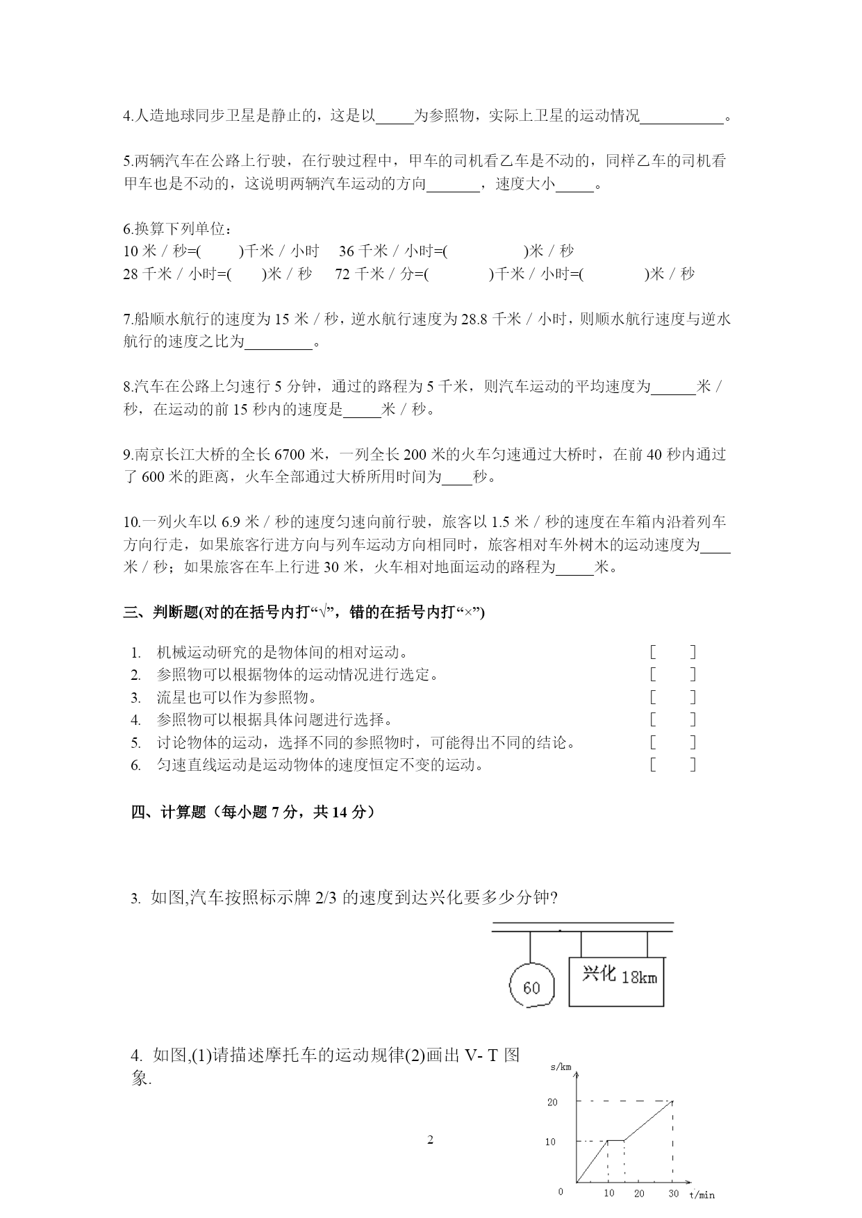 PAGE\*MERGEFORMAT3第二章简单的运动练习题一、选择题3.火车在平坦的大平原上向前行驶,坐在车上的旅客看到两边的树木和庄稼都向车后面退去,这时参照物应该是:[]A.两边的树木B.铁轨C.大平原D.火车4.某车站并排停着两列待发的列车甲和乙。经过一段时间以后甲车内一个人看见车外树木向东移动,乙车内的人通过车窗看到甲车没动,如果以地面为参照物,上面的甲乙两车的运动说明:[]A.甲列车向西运动,乙列车静止不动B.甲列车向西运动,乙列车向东运动C.乙列车向西运动,甲列车不动D.甲乙两列车同时同速向西运动5.在匀速直线运动中,下面的各种说法不正确的是:[]A.在相等的时间间隔内,通过的路程总是相等的B.在任何相等的时间间隔内,通过的路程总是相等的C.从速度单位中可以看出,凡是每秒内通过的路程相等的运动都是匀速直线运动D.匀速直线运动是运动方向不变且运动快慢不变的运动6.甲乙两个物体都做匀速直线运动,关于它们之间的运动路程之比,下列说法正确的是:[]A.只与两者的运动速度大小相关B.只与两者各自的运动时间相关C.与开始运动时所在的位置有关D.与各自运动的速度与运动时间的乘积有关7.一个物体通过400米的路程,在前一半的路程中所用的时间是10秒钟;如果在后一半路程中运动的速度为40米/秒,则在这一段运动的总过程中的平均速度为[]A.20米/秒B.40米/秒C.30米/秒D.26.7米/秒8.某物体在运动中,通过路程S1所用的时间为t1,接着以速度V2通过路程为S2,那么物体在它运动的全过程中的平均速度为:[]二、填空题4.人造地球同步卫星是静止的,这是以_____为参照物,实际上卫星的运动情况___________。5.两辆汽车在公路上行驶,在行驶过程中,甲车的司机看乙车是不动的,同样乙车的司机看甲车也是不动的,这说明两辆汽车运动的方向_______,速度大小_____。6.换算下列单位:10米/秒=()千米/小时36千米/小时=()米/秒28千米/小时=()米/秒72千米/分=()千米/小时=()米/秒7.船顺水航行的速度为15米/秒,逆水航行速度为28.8千米/小时,则顺水航行速度与逆水航行的速度之比为_________。8.汽车在公路上匀速行5分钟,通过的路程为5千米,则汽车运动的平均速度为______米/秒,在运动的前15秒内的速度是_____米/秒。9.南京长江大桥的全长6700米,一列全长200米的火车匀速通过大桥时,在前40秒内通过了600米的距离,火车全部通过大桥所用时间为____秒。10.一列火车以6.9米/秒的速度匀速向前行驶,旅客以1.5米/秒的速度在车箱内沿着列车方向行走,如果旅客行进方向与列车运动方向相同时,旅客相对车外树木的运动速度为____米/秒;如果旅客在车上行进30米,火车相对地面运动的路程为_____米。三、判断题(对的在括号内打“√”,错的在括号内打“×”)1.2.3.4.5.6.机械运动研究的是物体间的相对运动。[]参照物可以根据物体的运动情况进行选定。[]流星也可以作为参照物。[]参照物可以根据具体问题进行选择。[]讨论物体的运动,选择不同的参照物时,可能得出不同的结论。[]匀速直线运动是运动物体的速度恒定不变的运动。[]四、计算题(每小题7分,共14分)3.如图,汽车按照标示牌2/3的速度到达兴化要多少分钟?4.如图,(1)请描述摩托车的运动规律(2)画出v-t图象.5.一只船在甲乙两码头之间往返一次的平均速度为24m/s,已知水流速度是5m/s,求船在静水中的速度.附加题:商场里的自动扶梯向上匀速运动时,某人以2的速度沿扶梯逐级走上楼,数得走了24级;以同样速度沿向上运动的扶梯走下楼,数得走了72级,扶梯运行的速度是,若该扶梯是停止的,人沿扶梯上楼要走级。