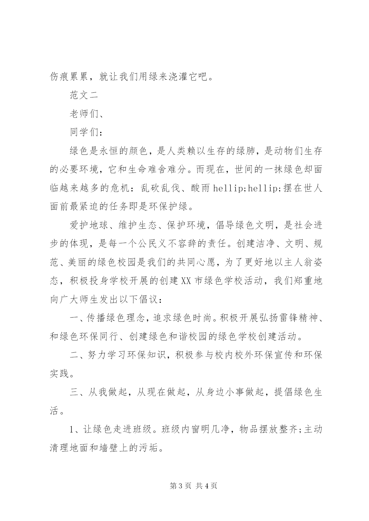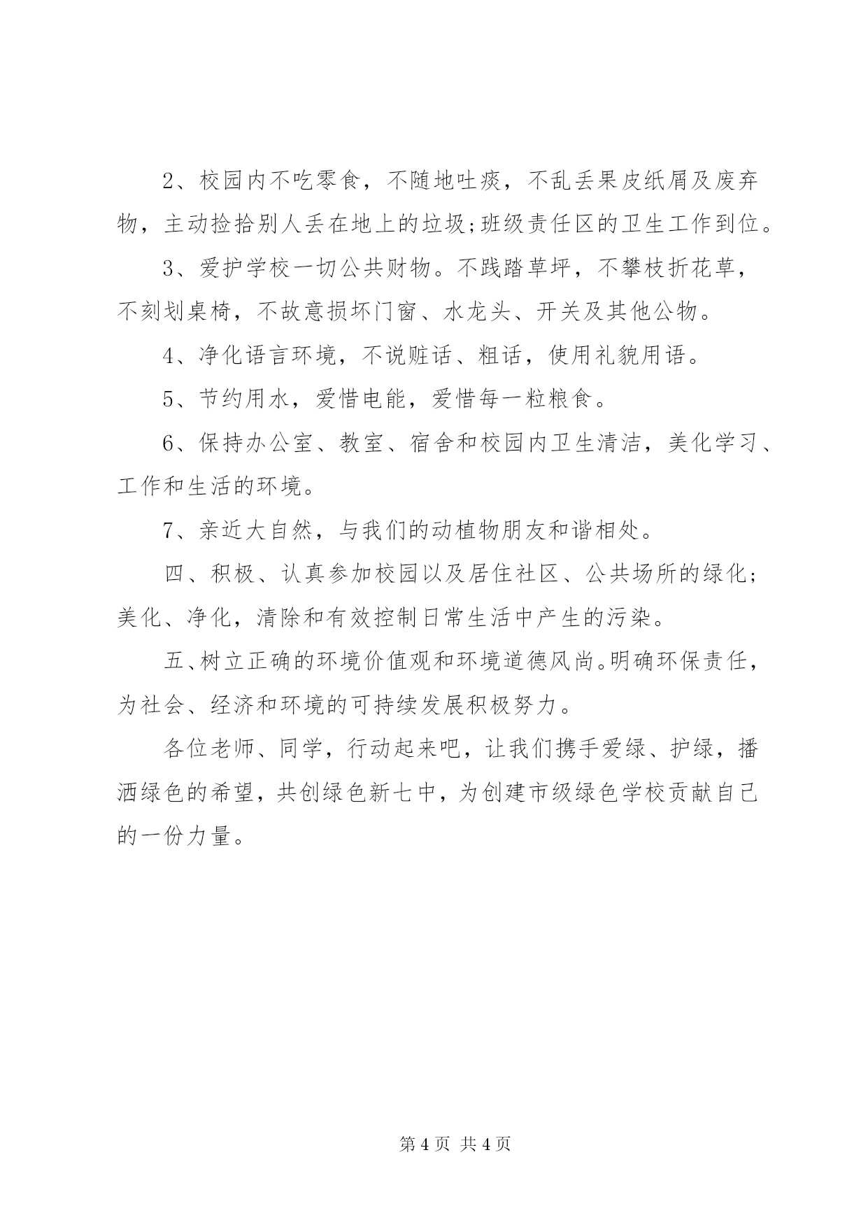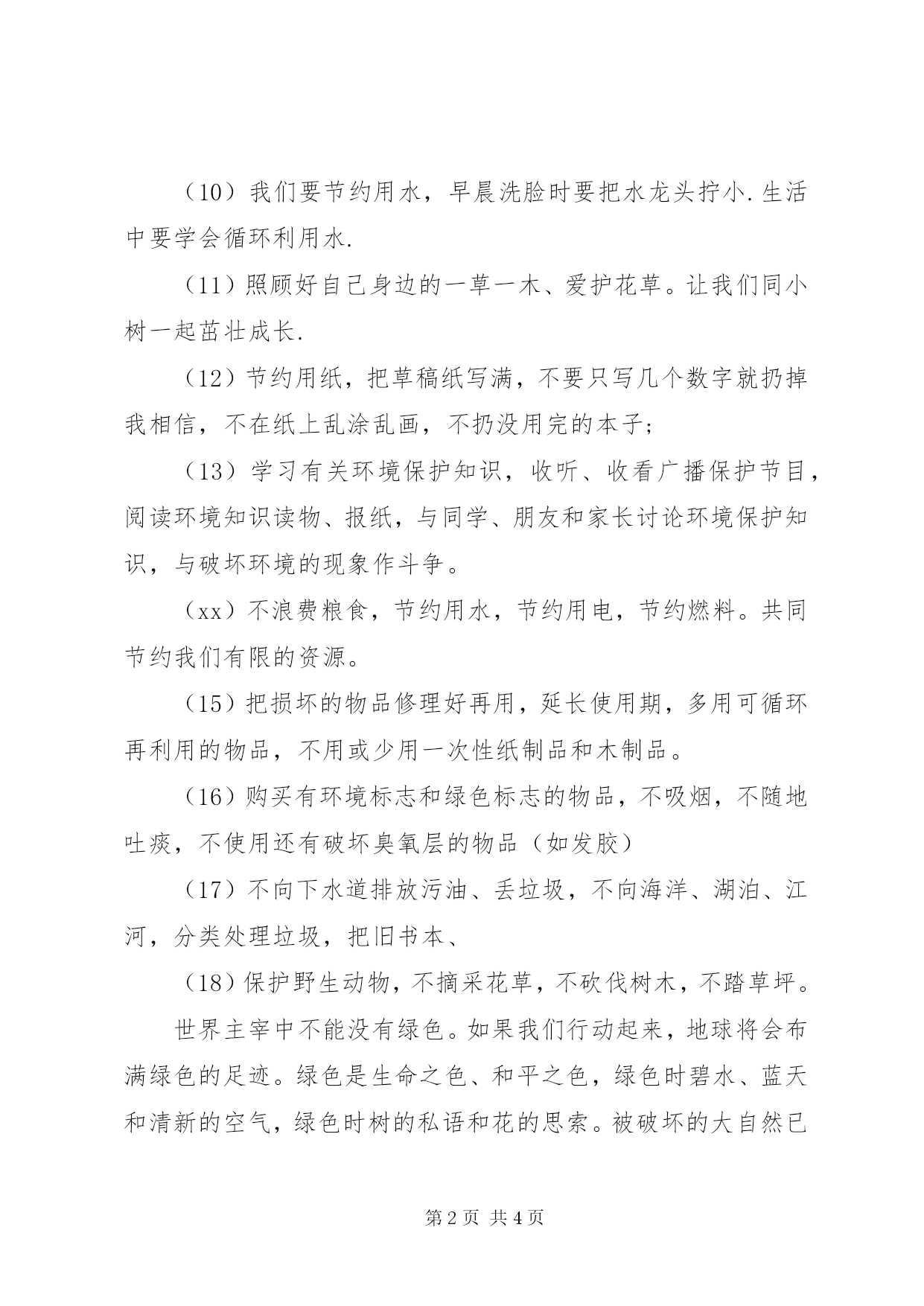 第PAGE\*Arabic\*MERGEFORMAT4页共NUMPAGES\*MERGEFORMAT4页社区环保倡议书范文范文一各位师生们。大家好。地球,这位人类的母亲,这个生命的摇篮,是那么的美丽壮观,和蔼可亲。但是近几年来由于人们对生态环境的破坏、绿洲的不重视,我们生存的地球犹如一位生命垂危的老人,奄奄一息hellip;hellip;这令人震惊的严重现象和历史教训,怎能不引起大家的认真思考呢。环境保护刻不容缓啊。为了我们共同的家园地球,我提出了一下几条建议:(1)洗完手后拧紧水龙头;(2)洗手、洗澡、洗菜的水用来冲厕所或浇花;(3)尽可能少的使用一次性塑料袋、一次性快餐盒和一次性筷子;(4)房间里没有人时记得关电灯、电视;(5)看电视时音量不宜太大;(6)报纸、饮料罐卖给废品回收部门,少用塑料包装袋。(7)多植树造林,少滥砍滥伐hellip;hellip;(8)不用一次性筷子,因为快餐筷的材料是树木.(9)提醒爸爸妈妈买菜时不用塑料方便袋,以减少白色垃圾.(10)我们要节约用水,早晨洗脸时要把水龙头拧小.生活中要学会循环利用水.(11)照顾好自己身边的一草一木、爱护花草。让我们同小树一起茁壮成长.(12)节约用纸,把草稿纸写满,不要只写几个数字就扔掉我相信,不在纸上乱涂乱画,不扔没用完的本子;(13)学习有关环境保护知识,收听、收看广播保护节目,阅读环境知识读物、报纸,与同学、朋友和家长讨论环境保护知识,与破坏环境的现象作斗争。(xx)不浪费粮食,节约用水,节约用电,节约燃料。共同节约我们有限的资源。(15)把损坏的物品修理好再用,延长使用期,多用可循环再利用的物品,不用或少用一次性纸制品和木制品。(16)购买有环境标志和绿色标志的物品,不吸烟,不随地吐痰,不使用还有破坏臭氧层的物品(如发胶)(17)不向下水道排放污油、丢垃圾,不向海洋、湖泊、江河,分类处理垃圾,把旧书本、(18)保护野生动物,不摘采花草,不砍伐树木,不踏草坪。世界主宰中不能没有绿色。如果我们行动起来,地球将会布满绿色的足迹。绿色是生命之色、和平之色,绿色时碧水、蓝天和清新的空气,绿色时树的私语和花的思索。被破坏的大自然已伤痕累累,就让我们用绿来浇灌它吧。范文二老师们、同学们:绿色是永恒的颜色,是人类赖以生存的绿肺,是动物们生存的必要环境,它和生命难舍难分。而现在,世间的一抹绿色却面临越来越多的危机:乱砍乱伐、酸雨hellip;hellip;摆在世人面前最紧迫的任务即是环保护绿。爱护地球、维护生态、保护环境,倡导绿色文明,是社会进步的体现,是每一个公民义不容辞的责任。创建洁净、文明、规范、美丽的绿色校园是我们的共同心愿,为了更好地以主人翁姿态,积极投身学校开展的创建XX市绿色学校活动,我们郑重地向广大师生发出以下倡议:一、传播绿色理念,追求绿色时尚。积极开展弘扬雷锋精神、和绿色环保同行、创建绿色和谐校园的绿色学校创建活动。二、努力学习环保知识,积极参与校内校外环保宣传和环保实践。三、从我做起,从现在做起,从身边小事做起,提倡绿色生活。1、让绿色走进班级。班级内窗明几净,物品摆放整齐;主动清理地面和墙壁上的污垢。2、校园内不吃零食,不随地吐痰,不乱丢果皮纸屑及废弃物,主动捡拾别人丢在地上的垃圾;班级责任区的卫生工作到位。3、爱护学校一切公共财物。不践踏草坪,不攀枝折花草,不刻划桌椅,不故意损坏门窗、水龙头、开关及其他公物。4、净化语言环境,不说赃话、粗话,使用礼貌用语。5、节约用水,爱惜电能,爱惜每一粒粮食。6、保持办公室、教室、宿舍和校园内卫生清洁,美化学习、工作和生活的环境。7、亲近大自然,与我们的动植物朋友和谐相处。四、积极、认真参加校园以及居住社区、公共场所的绿化;美化、净化,清除和有效控制日常生活中产生的污染。五、树立正确的环境价值观和环境道德风尚。明确环保责任,为社会、经济和环境的可持续发展积极努力。各位老师、同学,行动起来吧,让我们携手爱绿、护绿,播洒绿色的希望,共创绿色新七中,为创建市级绿色学校贡献自己的一份力量。