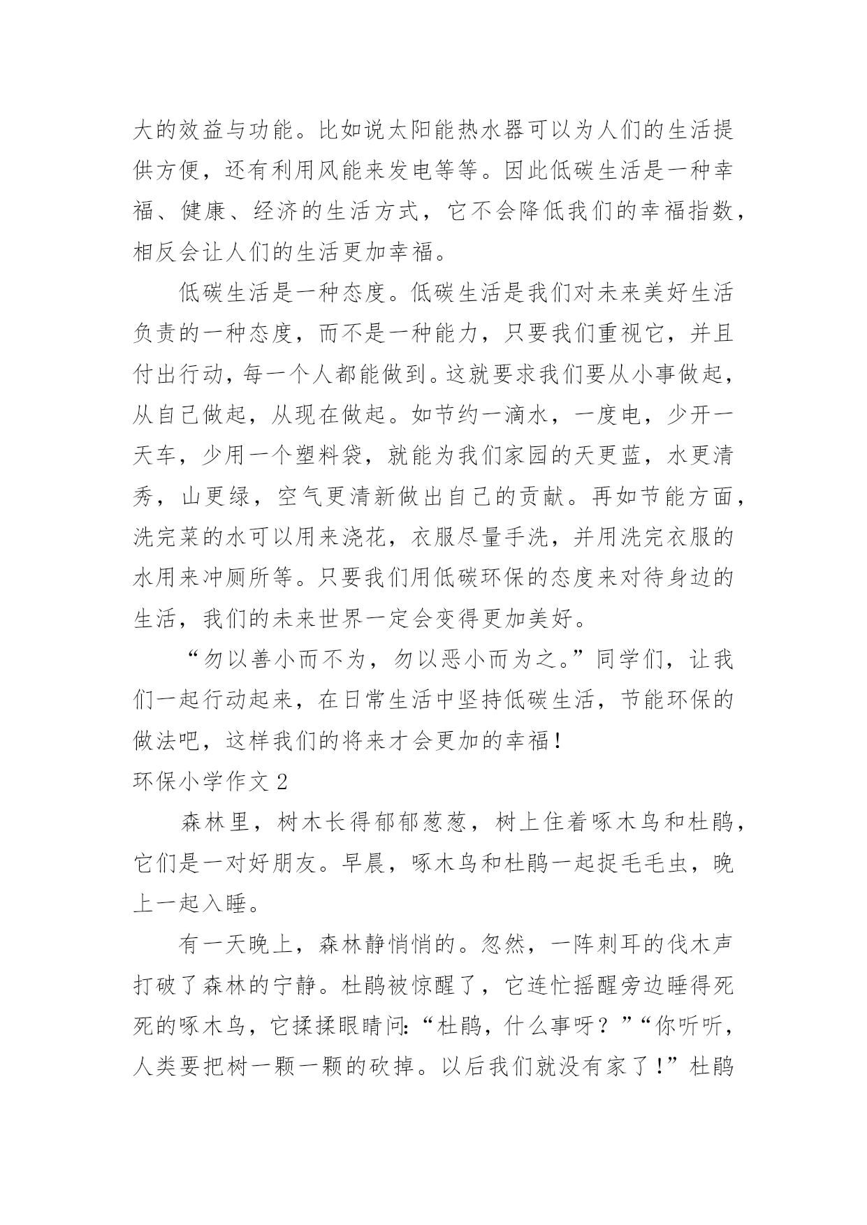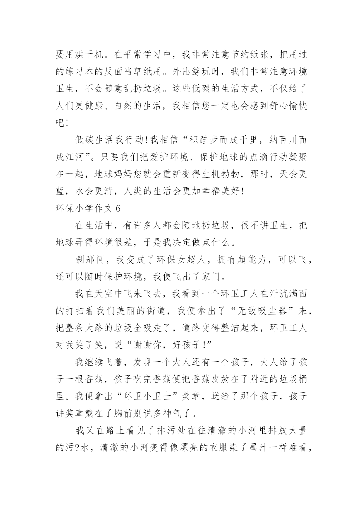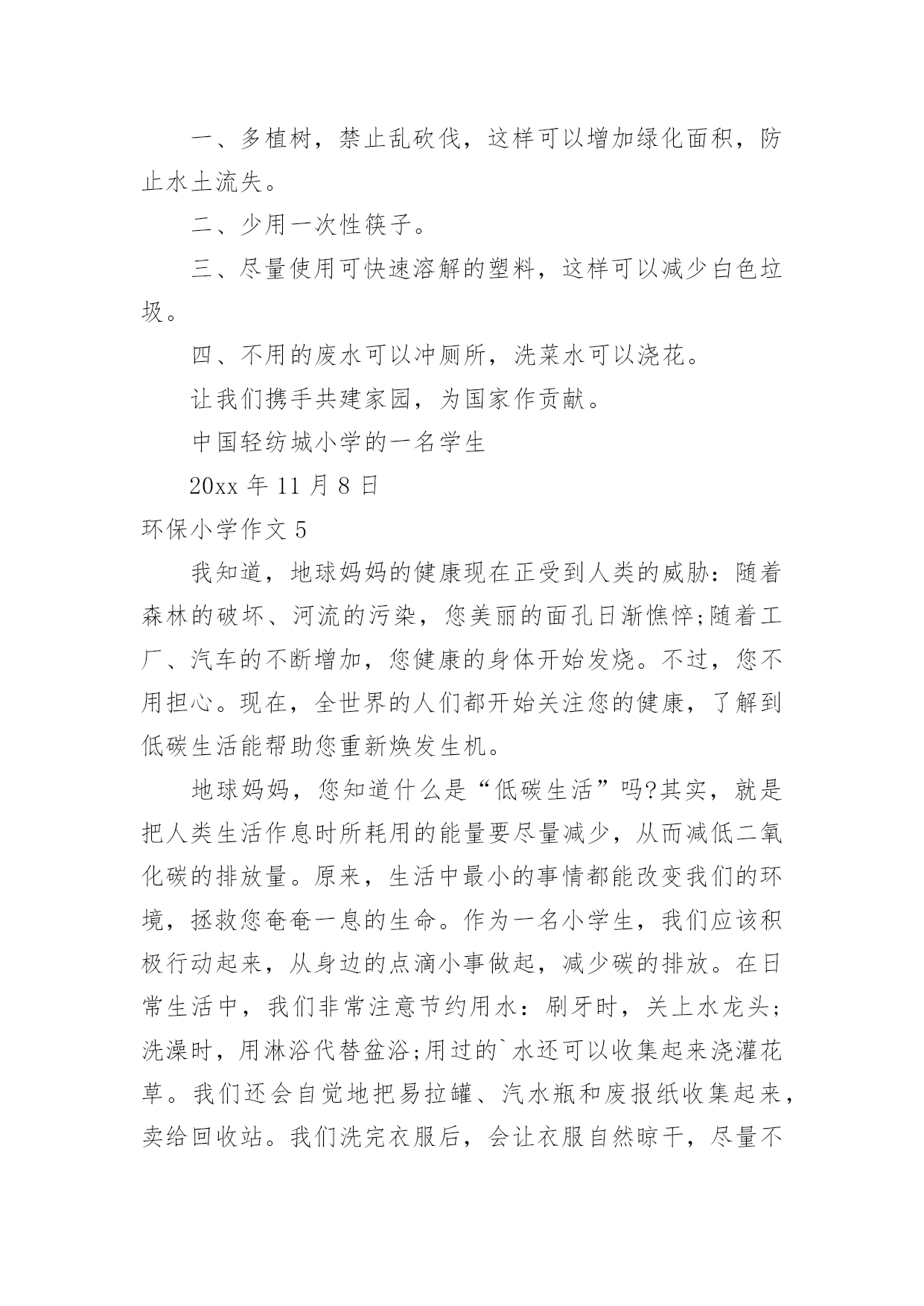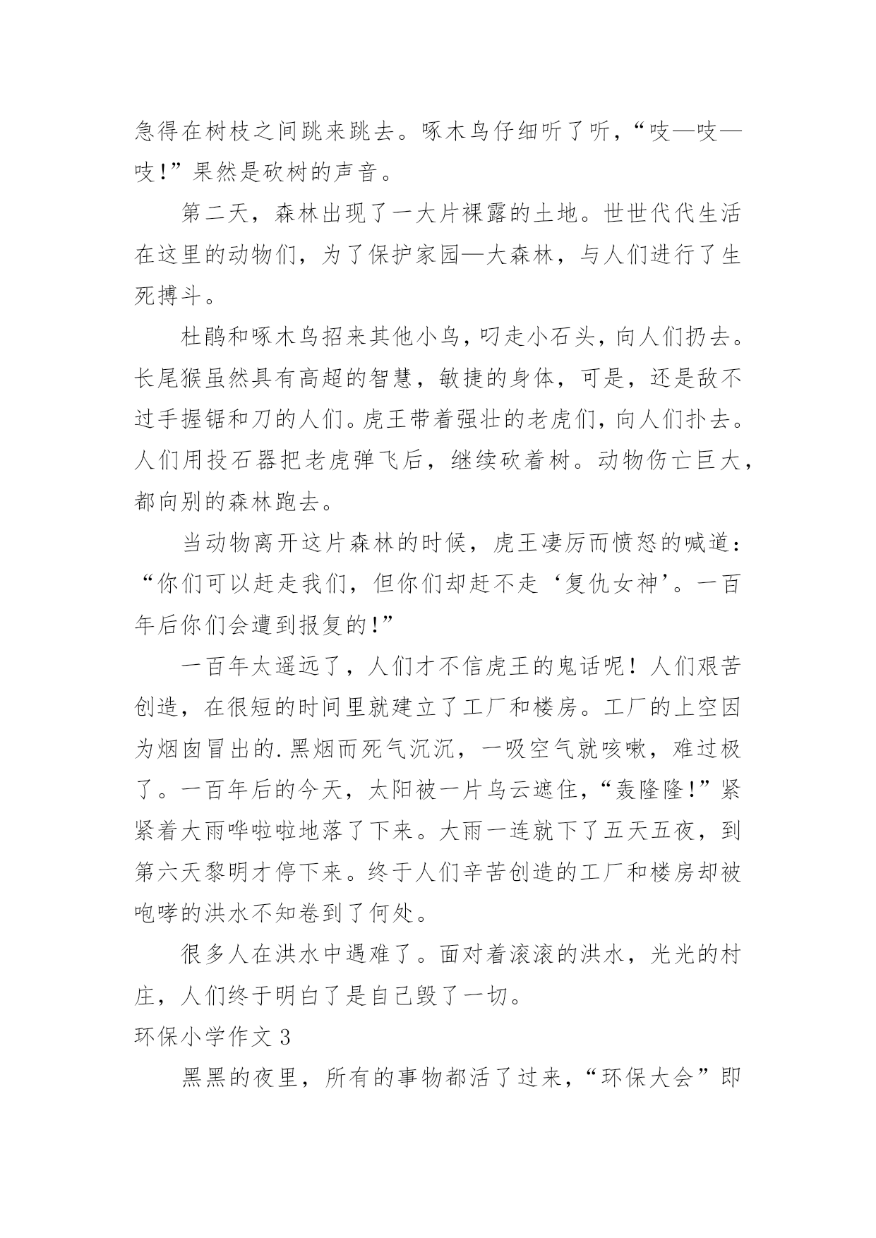 环保小学作文环保小学作文无论是身处学校还是步入社会,大家都写过作文吧,作文是从内部言语向外部言语的过渡,即从经过压缩的简要的、自己能明白的语言,向开展的、具有规范语法结构的、能为他人所理解的外部语言形式的转化。你知道作文怎样才能写的好吗?以下是小编帮大家整理的环保小学作文,希望对大家有所帮助。环保小学作文1低碳生活代表着更健康,更自然,更安全的生活,同时也是一种低成本、低代价的生活方式。中国改革开放以来,人们的生活水平越来越好。无论是家里的餐桌上还是身穿的衣服,都发生了翻天覆地的变化。但是环境却受到了污染,如干净的河水变成了臭水沟,漂亮的小湖,也变成了人们的'垃圾湖……因此提倡人们坚持低碳生活,节能环保的做法迫在眉睫!低碳生活是一种新的生活方式。保护环境,从我做起。洗衣服时,少放洗衣粉漂洗,衣服更干净。空调尽量少开,用电风扇或者扇子代替,多开窗多通风,有利于节约能源。尽量少用电梯,建议多走楼梯,既省电,又能锻炼身体。同时要充分大自然的太阳能,风能等可再生资源,发挥它们最大的效益与功能。比如说太阳能热水器可以为人们的生活提供方便,还有利用风能来发电等等。因此低碳生活是一种幸福、健康、经济的生活方式,它不会降低我们的幸福指数,相反会让人们的生活更加幸福。低碳生活是一种态度。低碳生活是我们对未来美好生活负责的一种态度,而不是一种能力,只要我们重视它,并且付出行动,每一个人都能做到。这就要求我们要从小事做起,从自己做起,从现在做起。如节约一滴水,一度电,少开一天车,少用一个塑料袋,就能为我们家园的天更蓝,水更清秀,山更绿,空气更清新做出自己的贡献。再如节能方面,洗完菜的水可以用来浇花,衣服尽量手洗,并用洗完衣服的水用来冲厕所等。只要我们用低碳环保的态度来对待身边的生活,我们的未来世界一定会变得更加美好。“勿以善小而不为,勿以恶小而为之。”同学们,让我们一起行动起来,在日常生活中坚持低碳生活,节能环保的做法吧,这样我们的将来才会更加的幸福!环保小学作文2森林里,树木长得郁郁葱葱,树上住着啄木鸟和杜鹃,它们是一对好朋友。早晨,啄木鸟和杜鹃一起捉毛毛虫,晚上一起入睡。有一天晚上,森林静悄悄的。忽然,一阵刺耳的伐木声打破了森林的宁静。杜鹃被惊醒了,它连忙摇醒旁边睡得死死的啄木鸟,它揉揉眼睛问:“杜鹃,什么事呀?”“你听听,人类要把树一颗一颗的砍掉。以后我们就没有家了!”杜鹃急得在树枝之间跳来跳去。啄木鸟仔细听了听,“吱—吱—吱!”果然是砍树的声音。第二天,森林出现了一大片裸露的土地。世世代代生活在这里的动物们,为了保护家园—大森林,与人们进行了生死搏斗。杜鹃和啄木鸟招来其他小鸟,叼走小石头,向人们扔去。长尾猴虽然具有高超的智慧,敏捷的身体,可是,还是敌不过手握锯和刀的人们。虎王带着强壮的老虎们,向人们扑去。人们用投石器把老虎弹飞后,继续砍着树。动物伤亡巨大,都向别的森林跑去。当动物离开这片森林的时候,虎王凄厉而愤怒的喊道:“你们可以赶走我们,但你们却赶不走‘复仇女神’。一百年后你们会遭到报复的!”一百年太遥远了,人们才不信虎王的鬼话呢!人们艰苦创造,在很短的时间里就建立了工厂和楼房。工厂的上空因为烟囱冒出的.黑烟而死气沉沉,一吸空气就咳嗽,难过极了。一百年后的今天,太阳被一片乌云遮住,“轰隆隆!”紧紧着大雨哗啦啦地落了下来。大雨一连就下了五天五夜,到第六天黎明才停下来。终于人们辛苦创造的工厂和楼房却被咆哮的洪水不知卷到了何处。很多人在洪水中遇难了。面对着滚滚的洪水,光光的村庄,人们终于明白了是自己毁了一切。环保小学作文3黑黑的夜里,所有的事物都活了过来,“环保大会”即将拉开帷幕。路边的垃圾桶首先抱怨道:“唉!最近我老是吃不饱,也不知道那些人类怎么想的。明明我就站在他们旁边,但是他们却净往地上扔垃圾,也不肯把垃圾给我,我饿得慌啊,真希望他们能改改!”“是呀,是呀!”这时,一旁的水泥路也发话了,“他们每天都把垃圾弄到我身上,虽说有清洁工人在打扫,但这里刚扫完,那里就扔来了,前一分钟扫干净了,后一分钟又脏了……总也扫不完。那些垃圾常年堆积在这里,都发臭了,我好好的一条路就这样给糟蹋了,咳!”这时,森林派来的.树木大使也到了。他满怀忧愁地说:“现在的人一点都不懂得节约,就知道无节制的索取,榨干资源……不过他们也遭报应了,沙尘暴也越来越频繁,不是我们树木不尽职,我们是势单力薄,挡也挡不住呀!这可都是他们自己造成的啊!”水管也气愤地说:“说到索取,说到浪费,这人类是真讨厌!每次洗完手,水还在那哗哗流,可他们却好像没看见似的。还有,洗澡那就更浪费水,明明在抹肥皂了,可是他们还是把水开着。鄱阳湖都已经变成草园啦!可他们还在浪费水!”听完了这些,会议主席发话了:“好了,大家静一静。保护地球,创造优美和谐的生存环境是我们每个人的责任。人类是有很多错,但并不是