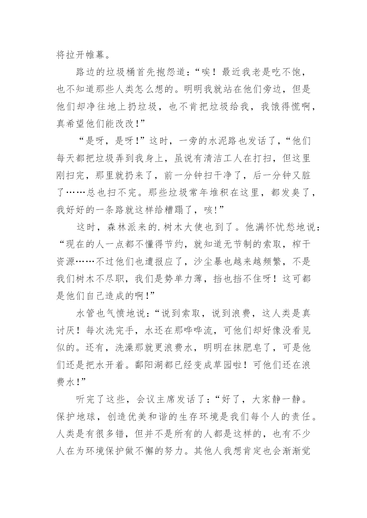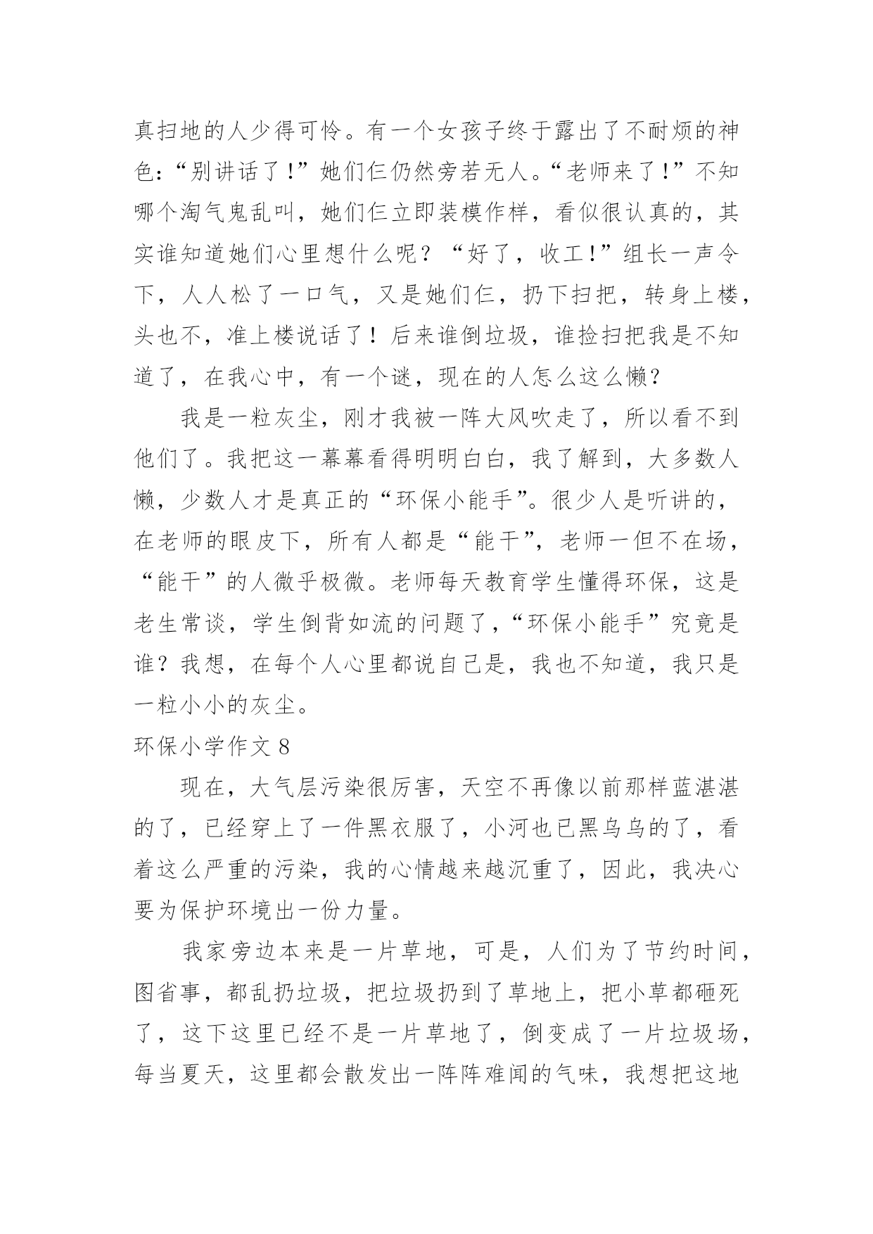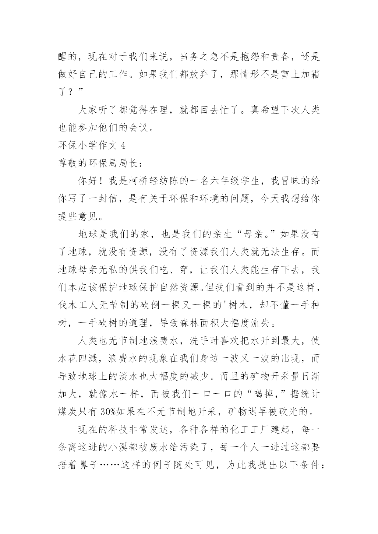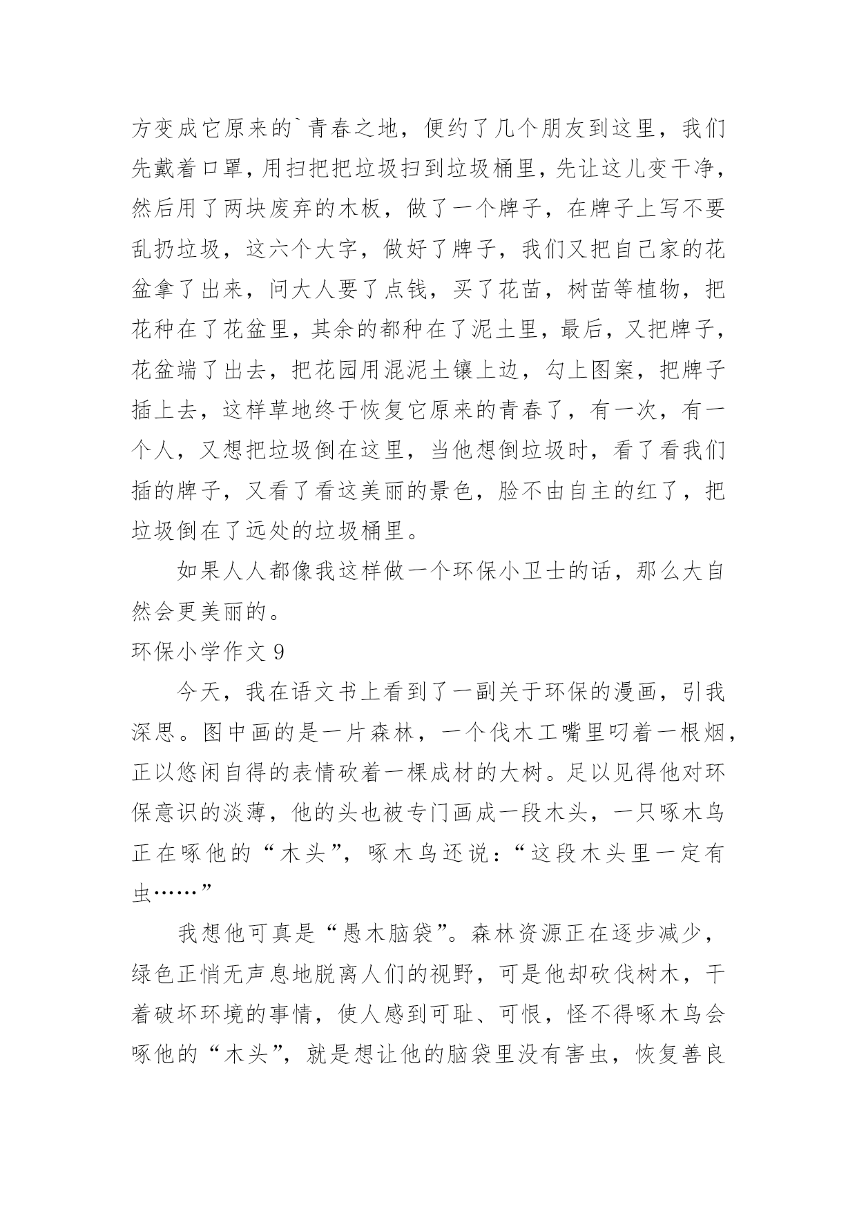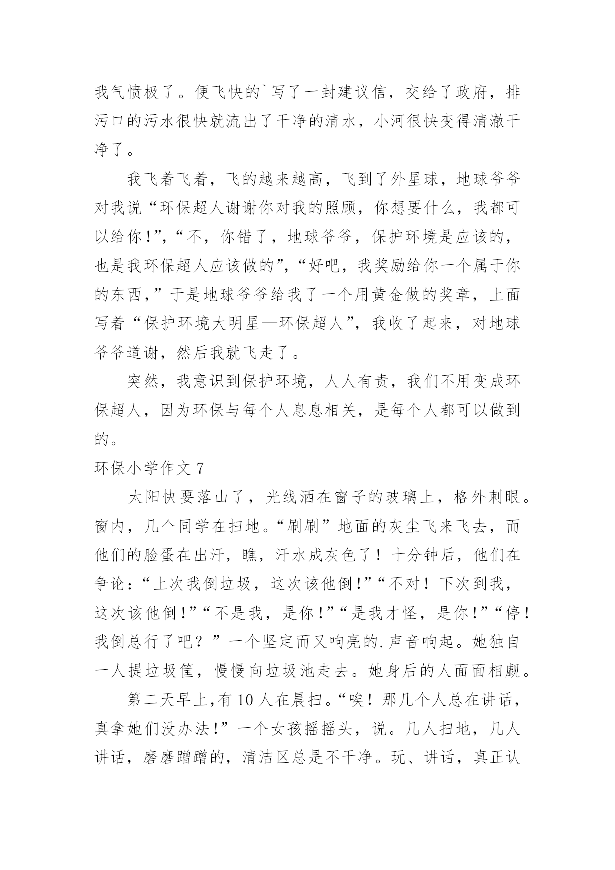 环保小学作文环保小学作文无论是身处学校还是步入社会,大家都写过作文吧,作文是从内部言语向外部言语的过渡,即从经过压缩的简要的、自己能明白的语言,向开展的、具有规范语法结构的、能为他人所理解的外部语言形式的转化。你知道作文怎样才能写的好吗?以下是小编帮大家整理的环保小学作文,希望对大家有所帮助。环保小学作文1低碳生活代表着更健康,更自然,更安全的生活,同时也是一种低成本、低代价的生活方式。中国改革开放以来,人们的生活水平越来越好。无论是家里的餐桌上还是身穿的衣服,都发生了翻天覆地的变化。但是环境却受到了污染,如干净的河水变成了臭水沟,漂亮的小湖,也变成了人们的'垃圾湖……因此提倡人们坚持低碳生活,节能环保的做法迫在眉睫!低碳生活是一种新的生活方式。保护环境,从我做起。洗衣服时,少放洗衣粉漂洗,衣服更干净。空调尽量少开,用电风扇或者扇子代替,多开窗多通风,有利于节约能源。尽量少用电梯,建议多走楼梯,既省电,又能锻炼身体。同时要充分大自然的太阳能,风能等可再生资源,发挥它们最大的效益与功能。比如说太阳能热水器可以为人们的生活提供方便,还有利用风能来发电等等。因此低碳生活是一种幸福、健康、经济的生活方式,它不会降低我们的幸福指数,相反会让人们的生活更加幸福。低碳生活是一种态度。低碳生活是我们对未来美好生活负责的一种态度,而不是一种能力,只要我们重视它,并且付出行动,每一个人都能做到。这就要求我们要从小事做起,从自己做起,从现在做起。如节约一滴水,一度电,少开一天车,少用一个塑料袋,就能为我们家园的天更蓝,水更清秀,山更绿,空气更清新做出自己的贡献。再如节能方面,洗完菜的水可以用来浇花,衣服尽量手洗,并用洗完衣服的水用来冲厕所等。只要我们用低碳环保的态度来对待身边的生活,我们的未来世界一定会变得更加美好。“勿以善小而不为,勿以恶小而为之。”同学们,让我们一起行动起来,在日常生活中坚持低碳生活,节能环保的做法吧,这样我们的将来才会更加的幸福!环保小学作文2森林里,树木长得郁郁葱葱,树上住着啄木鸟和杜鹃,它们是一对好朋友。早晨,啄木鸟和杜鹃一起捉毛毛虫,晚上一起入睡。有一天晚上,森林静悄悄的。忽然,一阵刺耳的伐木声打破了森林的宁静。杜鹃被惊醒了,它连忙摇醒旁边睡得死死的啄木鸟,它揉揉眼睛问:“杜鹃,什么事呀?”“你听听,人类要把树一颗一颗的砍掉。以后我们就没有家了!”杜鹃急得在树枝之间跳来跳去。啄木鸟仔细听了听,“吱—吱—吱!”果然是砍树的声音。第二天,森林出现了一大片裸露的土地。世世代代生活在这里的动物们,为了保护家园—大森林,与人们进行了生死搏斗。杜鹃和啄木鸟招来其他小鸟,叼走小石头,向人们扔去。长尾猴虽然具有高超的智慧,敏捷的身体,可是,还是敌不过手握锯和刀的人们。虎王带着强壮的老虎们,向人们扑去。人们用投石器把老虎弹飞后,继续砍着树。动物伤亡巨大,都向别的森林跑去。当动物离开这片森林的时候,虎王凄厉而愤怒的喊道:“你们可以赶走我们,但你们却赶不走‘复仇女神’。一百年后你们会遭到报复的!”一百年太遥远了,人们才不信虎王的鬼话呢!人们艰苦创造,在很短的时间里就建立了工厂和楼房。工厂的上空因为烟囱冒出的.黑烟而死气沉沉,一吸空气就咳嗽,难过极了。一百年后的今天,太阳被一片乌云遮住,“轰隆隆!”紧紧着大雨哗啦啦地落了下来。大雨一连就下了五天五夜,到第六天黎明才停下来。终于人们辛苦创造的工厂和楼房却被咆哮的洪水不知卷到了何处。很多人在洪水中遇难了。面对着滚滚的洪水,光光的村庄,人们终于明白了是自己毁了一切。环保小学作文3黑黑的夜里,所有的事物都活了过来,“环保大会”即将拉开帷幕。路边的垃圾桶首先抱怨道:“唉!最近我老是吃不饱,也不知道那些人类怎么想的。明明我就站在他们旁边,但是他们却净往地上扔垃圾,也不肯把垃圾给我,我饿得慌啊,真希望他们能改改!”“是呀,是呀!”这时,一旁的水泥路也发话了,“他们每天都把垃圾弄到我身上,虽说有清洁工人在打扫,但这里刚扫完,那里就扔来了,前一分钟扫干净了,后一分钟又脏了……总也扫不完。那些垃圾常年堆积在这里,都发臭了,我好好的一条路就这样给糟蹋了,咳!”这时,森林派来的.树木大使也到了。他满怀忧愁地说:“现在的人一点都不懂得节约,就知道无节制的索取,榨干资源……不过他们也遭报应了,沙尘暴也越来越频繁,不是我们树木不尽职,我们是势单力薄,挡也挡不住呀!这可都是他们自己造成的啊!”水管也气愤地说:“说到索取,说到浪费,这人类是真讨厌!每次洗完手,水还在那哗哗流,可他们却好像没看见似的。还有,洗澡那就更浪费水,明明在抹肥皂了,可是他们还是把水开着。鄱阳湖都已经变成草园啦!可他们还在浪费水!”听完了这些,会议主席发话了:“好了,大家静一静。保护地球,创造优美和谐的生存环境是我们每个人的责任。人类是有很多错,但并不是
