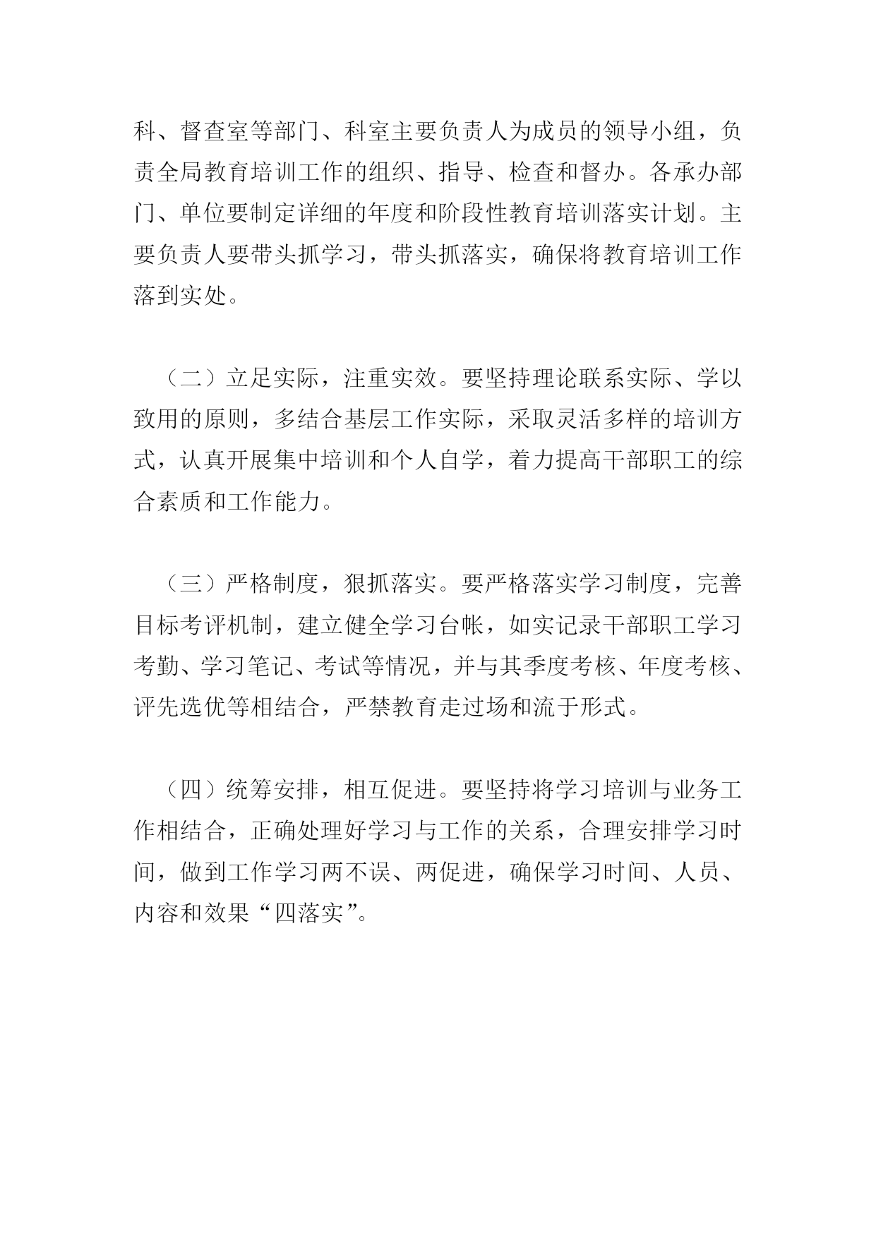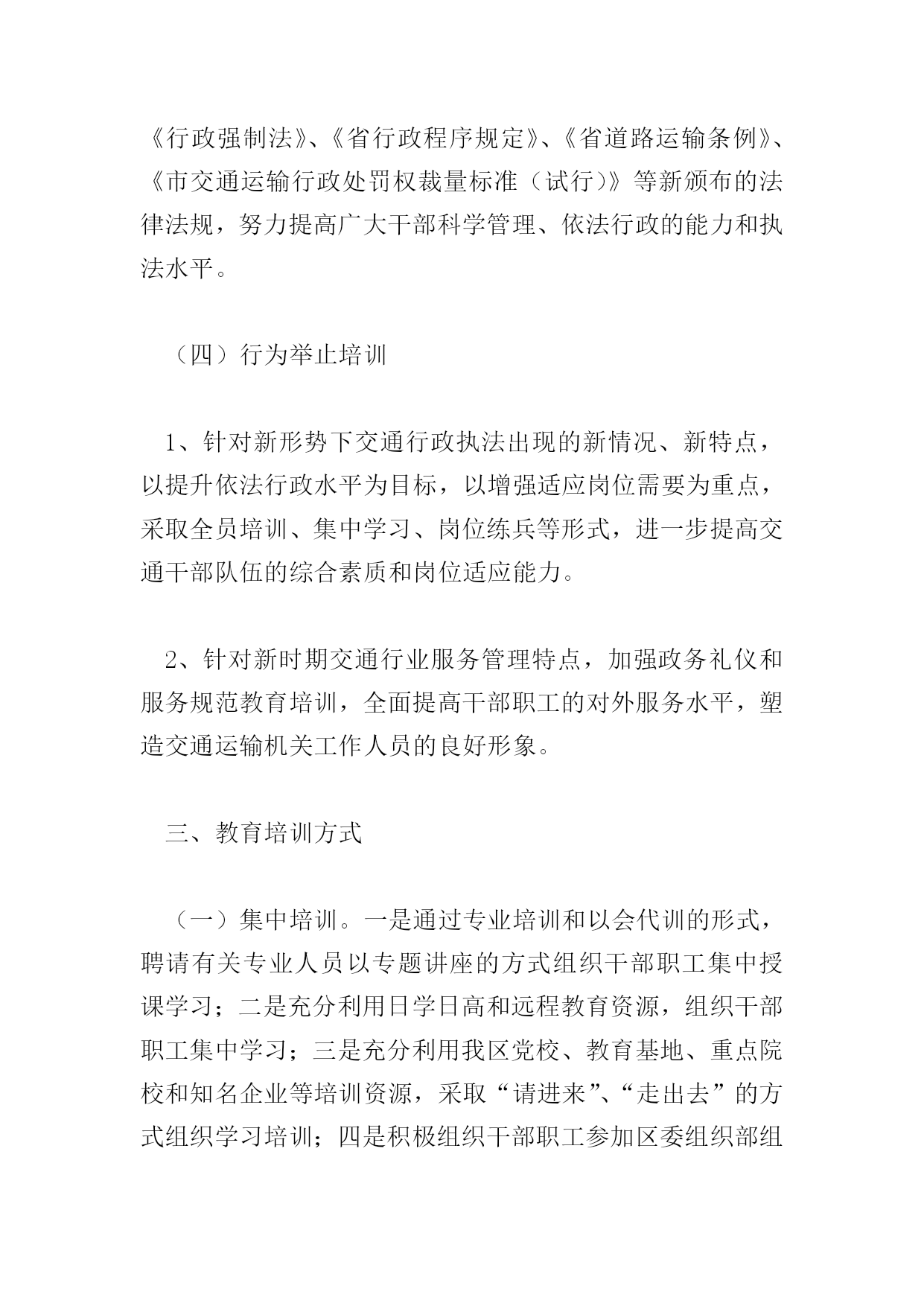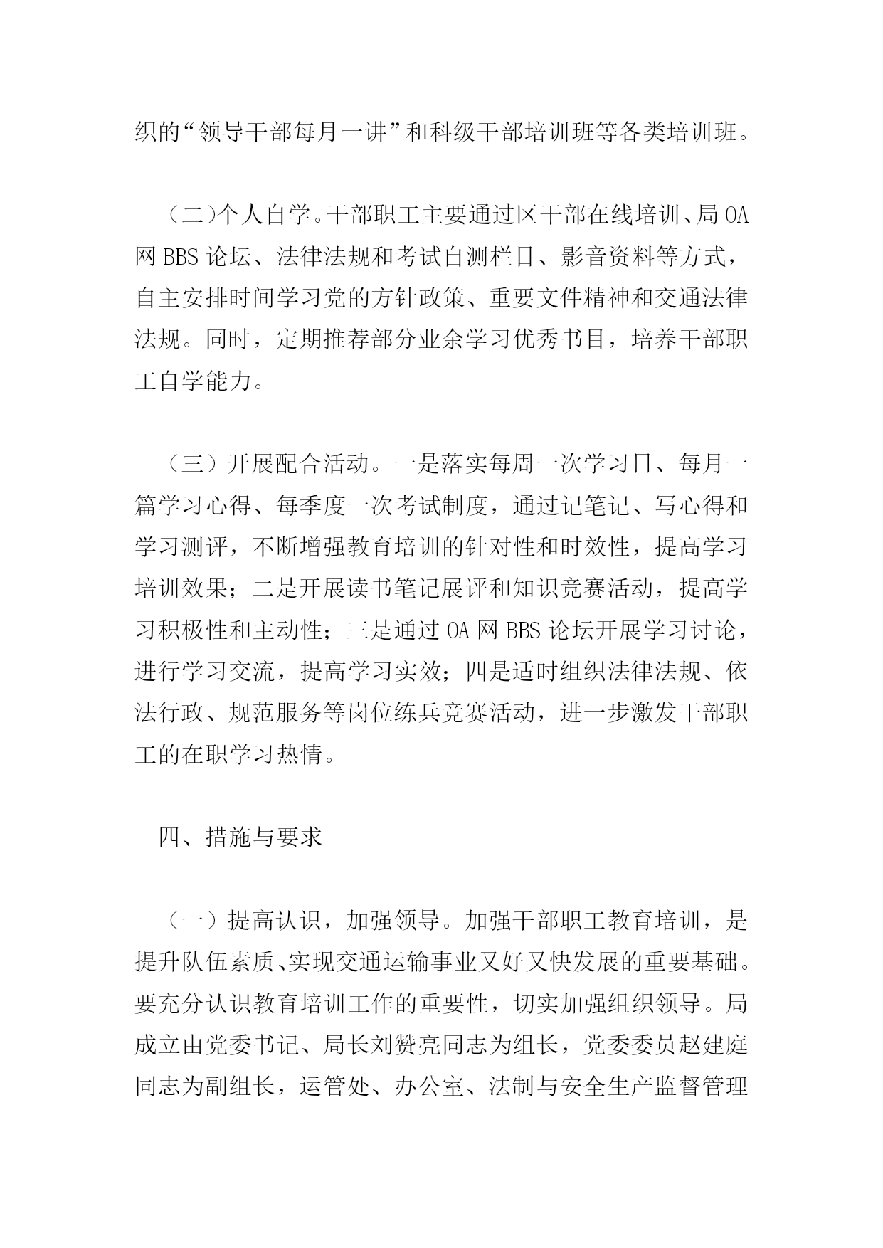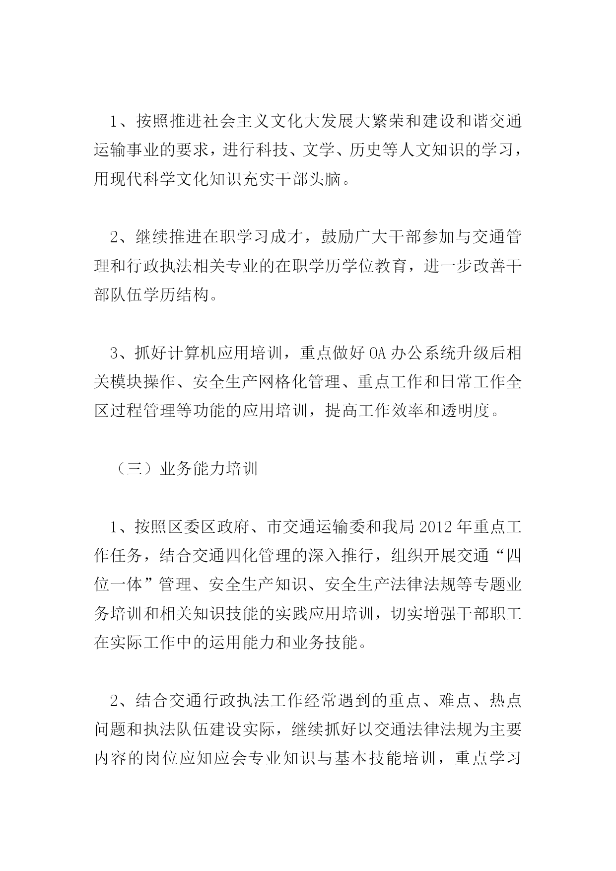 交通局职工培训打算2012年,我局干部职工教育培训工作总体思路:以创建学习开题机关为牵引,以党员干部为重点,以执法队伍和服务窗口建设为突破口,认真研究解决新形势下干部职工教育培训工作中的新情况、新问题,加强组织领导,强化职责意识,狠抓计划落实,形成长效机制,丰富形式内容,确保质量效果,着力提升干部职工的综合素质能力,努力在武装头脑、指导实践、学以致用、推动工作上取得新成效。一、指导思想和总体目标指导思想:坚持以邓小平理论、“三个代表”重要思想和科学发展观为指导,全面学习贯彻党的十七届五中、六中全会和十八大精神,紧紧围绕区委、区政府经济社会发展战略和关于加强干部职工教育培训工作的有关要求,进一步强化服务宗旨、岗位职责、标准质量和行业形象意识,为开创交通运输工作新局面提供坚实的素质保障和充足的智力支持。总体目标:突出抓好政治思想、业务知识、专业技能和综合性教育等基础性培训;充分利用和发挥干部在线学习、远程教育等教育培训平台作用,不断提高干部职工和基层组织的组教施训能力;大力倡导干部职工在职学习和岗位成才,积极营造良好的学习氛围;继续拓展教育渠道,适时采取请进来、走出去等方法,进一步增强教育的针对性和实效性,全面提升全局干部职工队伍的整体素质和依法行政水平。二、教育培训的主要内容(一)思想品德教育1、坚持把政治理论学习放在首要位置,深入开展中国特色社会主义理论体系、党的最新理论成果、国家的路线、方针、政策等学习培训,夯实理论基础,增强政治理论素养,切实在以科学发展观理论武装头脑、指导工作、解决问题上取得新进展。2、突出社会主义核心价值观教育,大力开展思想品德、职业道德、社会公德、家庭美德教育,强化爱岗敬业、奉献精神、公仆意识、集体观念等教育培养,进一步提高全局干部职工践行社会主义核心价值的自信和自觉。3、继续把反腐倡廉作为党员干部警示教育的主要内容,加强对《党章》、党史和党规、党纪教育,进一步增强广大党员干部的党性观念、宗旨意识和廉洁自律的自觉性,提高党员干部职工队伍的拒腐防变能力。(二)文化知识教育1、按照推进社会主义文化大发展大繁荣和建设和谐交通运输事业的要求,进行科技、文学、历史等人文知识的学习,用现代科学文化知识充实干部头脑。2、继续推进在职学习成才,鼓励广大干部参加与交通管理和行政执法相关专业的在职学历学位教育,进一步改善干部队伍学历结构。3、抓好计算机应用培训,重点做好OA办公系统升级后相关模块操作、安全生产网格化管理、重点工作和日常工作全区过程管理等功能的应用培训,提高工作效率和透明度。(三)业务能力培训1、按照区委区政府、市交通运输委和我局2012年重点工作任务,结合交通四化管理的深入推行,组织开展交通“四位一体”管理、安全生产知识、安全生产法律法规等专题业务培训和相关知识技能的实践应用培训,切实增强干部职工在实际工作中的运用能力和业务技能。2、结合交通行政执法工作经常遇到的重点、难点、热点问题和执法队伍建设实际,继续抓好以交通法律法规为主要内容的岗位应知应会专业知识与基本技能培训,重点学习《行政强制法》、《省行政程序规定》、《省道路运输条例》、《市交通运输行政处罚权裁量标准(试行)》等新颁布的法律法规,努力提高广大干部科学管理、依法行政的能力和执法水平。(四)行为举止培训1、针对新形势下交通行政执法出现的新情况、新特点,以提升依法行政水平为目标,以增强适应岗位需要为重点,采取全员培训、集中学习、岗位练兵等形式,进一步提高交通干部队伍的综合素质和岗位适应能力。2、针对新时期交通行业服务管理特点,加强政务礼仪和服务规范教育培训,全面提高干部职工的对外服务水平,塑造交通运输机关工作人员的良好形象。三、教育培训方式(一)集中培训。一是通过专业培训和以会代训的形式,聘请有关专业人员以专题讲座的方式组织干部职工集中授课学习;二是充分利用日学日高和远程教育资源,组织干部职工集中学习;三是充分利用我区党校、教育基地、重点院校和知名企业等培训资源,采取“请进来”、“走出去”的方式组织学习培训;四是积极组织干部职工参加区委组织部组织的“领导干部每月一讲”和科级干部培训班等各类培训班。(二)个人自学。干部职工主要通过区干部在线培训、局OA网BBS论坛、法律法规和考试自测栏目、影音资料等方式,自主安排时间学习党的方针政策、重要文件精神和交通法律法规。同时,定期推荐部分业余学习优秀书目,培养干部职工自学能力。(三)开展配合活动。一是落实每周一次学习日、每月一篇学习心得、每季度一次考试制度,通过记笔记、写心得和学习测评,不断增强教育培训的针对性和时效性,提高学习培