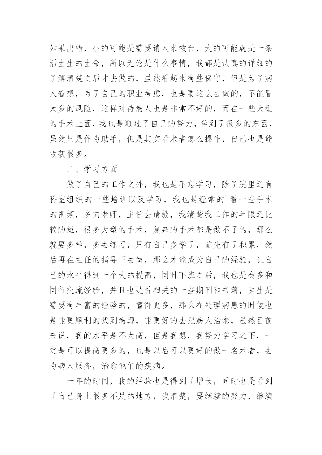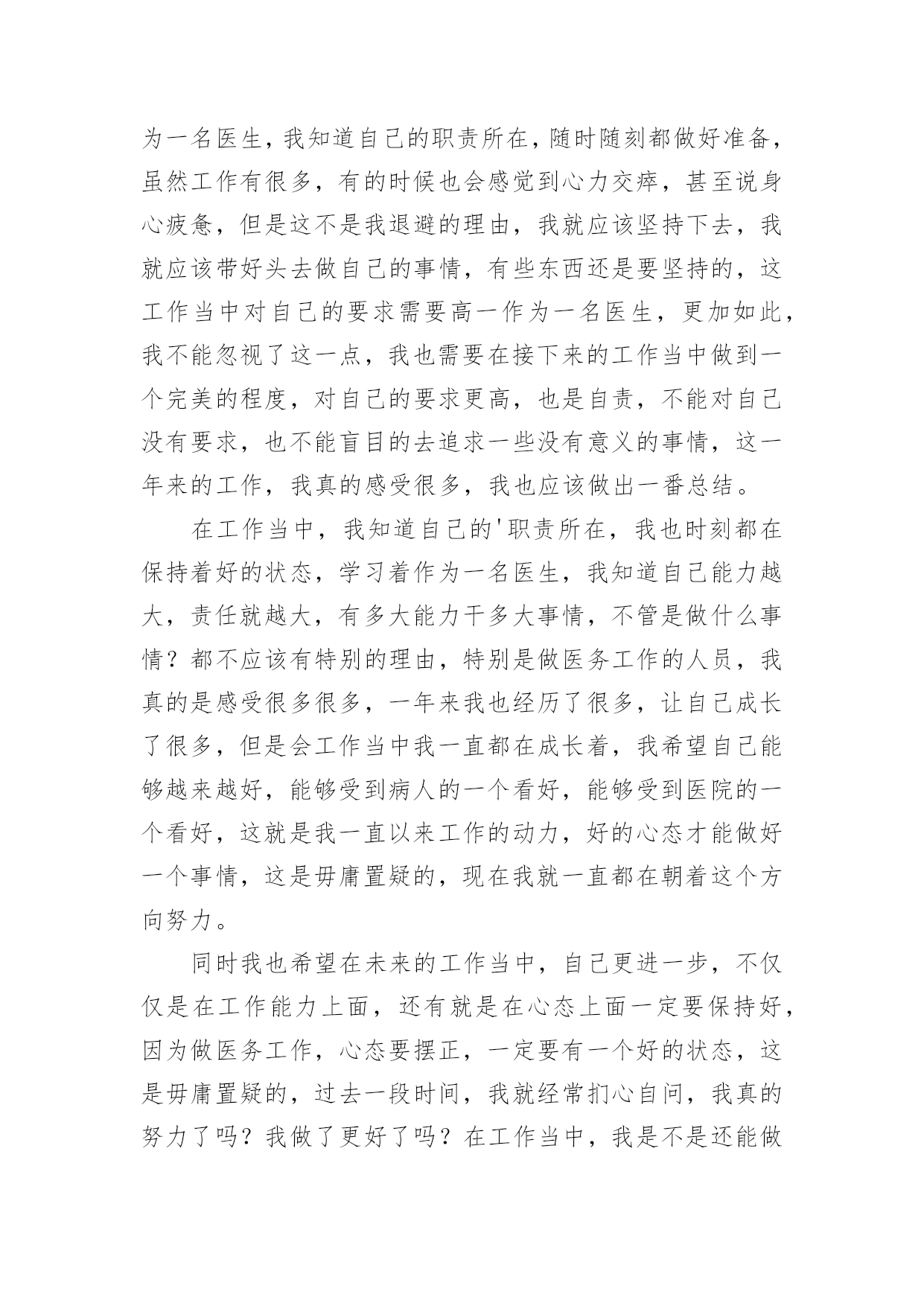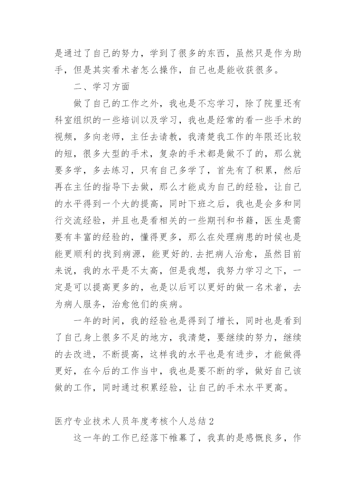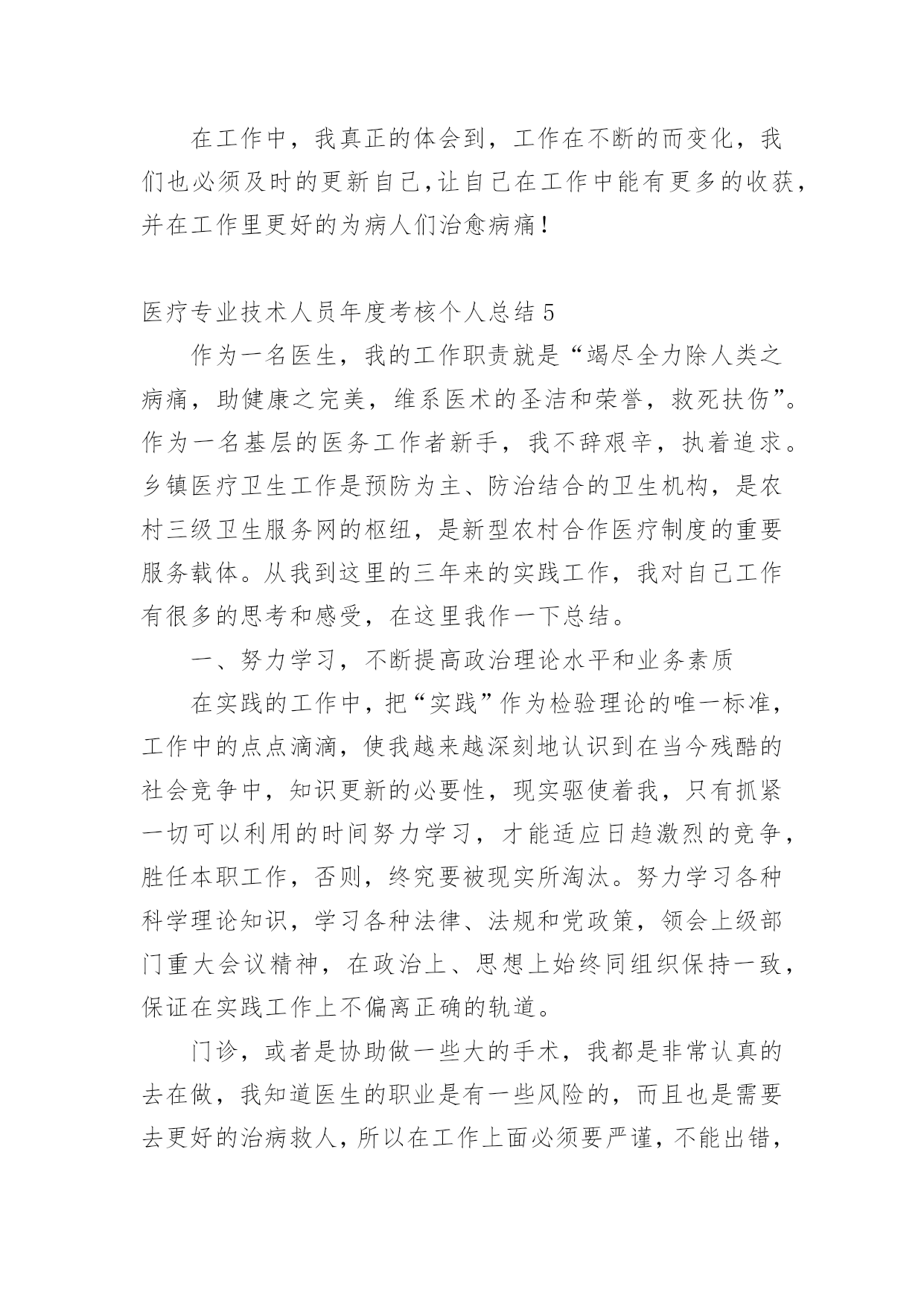 医疗专业技术人员年度考核个人总结总结是事后对某一时期、某一项目或某些工作进行回顾和分析,从而做出带有规律性的结论,它可使零星的、肤浅的、表面的感性认知上升到全面的、系统的、本质的理性认识上来,让我们来为自己写一份总结吧。那么我们该怎么去写总结呢?下面是小编精心整理的医疗专业技术人员年度考核个人总结,希望能够帮助到大家。医疗专业技术人员年度考核个人总结1回顾过去的工作,我作为医生,也是认真的去做好了工作,同时自己也是通过工作让自己得到了成长,获得了更多的经验,我也是对于过去一年的工作来总结下。一、工作方面在这一个年度里头,我也是按照领导的一个要求,去做好我该做的本职事情,无论是上手术,或者门诊,或者是协助做一些大的手术,我都是非常认真的去在做,我知道医生的职业是有一些风险的,而且也是需要去更好的治病救人,所以在工作上面必须要严谨,不能出错,如果出错,小的可能是需要请人来救台,大的可能就是一条活生生的生命,所以无论是什么事情,我都是认真的详细的了解清楚之后才去做的,虽然看起来有些保守,但是为了病人着想,为了自己的职业考虑,也是要这么去做的,不能冒太多的风险,这样对待病人也是非常不好的,而在一些大型的手术上面,我也是通过了自己的努力,学到了很多的东西,虽然只是作为助手,但是其实看术者怎么操作,自己也是能收获很多。二、学习方面做了自己的工作之外,我也是不忘学习,除了院里还有科室组织的一些培训以及学习,我也是经常的看一些手术的视频,多向老师,主任去请教,我清楚我工作的年限还比较的短,很多大型的手术,复杂的手术都是做不了的,那么就要多学,多去练习,只有自己多学了,首先有了积累,然后再在主任的指导下去做,那么才能成为自己的经验,让自己的水平得到一个大的提高,同时下班之后,我也是会多和同行交流经验,并且也是看相关的一些期刊和书籍,医生是需要有丰富的经验的,懂得更多,那么在处理病患的时候也是能更顺利的找到病源,能更好的.去把病人治愈,虽然目前来说,我的水平是不太高,但是我想,我努力学习之下,一定是可以提高更多的,也是以后可以更好的做一名术者,去为病人服务,治愈他们的疾病。一年的时间,我的经验也是得到了增长,同时也是看到了自己身上很多不足的地方,我清楚,要继续的努力,继续的去改进,不断提高,这样我的水平也是有进步,才能做得更好,在今后的工作当中,我也是要不断的学,做好自己该做的工作,同时通过积累经验,让自己的手术水平更高。医疗专业技术人员年度考核个人总结2这一年的工作已经落下帷幕了,我真的是感慨良多,作为一名医生,我知道自己的职责所在,随时随刻都做好准备,虽然工作有很多,有的时候也会感觉到心力交瘁,甚至说身心疲惫,但是这不是我退避的理由,我就应该坚持下去,我就应该带好头去做自己的事情,有些东西还是要坚持的,这工作当中对自己的要求需要高一作为一名医生,更加如此,我不能忽视了这一点,我也需要在接下来的工作当中做到一个完美的程度,对自己的要求更高,也是自责,不能对自己没有要求,也不能盲目的去追求一些没有意义的事情,这一年来的工作,我真的感受很多,我也应该做出一番总结。在工作当中,我知道自己的'职责所在,我也时刻都在保持着好的状态,学习着作为一名医生,我知道自己能力越大,责任就越大,有多大能力干多大事情,不管是做什么事情?都不应该有特别的理由,特别是做医务工作的人员,我真的是感受很多很多,一年来我也经历了很多,让自己成长了很多,但是会工作当中我一直都在成长着,我希望自己能够越来越好,能够受到病人的一个看好,能够受到医院的一个看好,这就是我一直以来工作的动力,好的心态才能做好一个事情,这是毋庸置疑的,现在我就一直都在朝着这个方向努力。同时我也希望在未来的工作当中,自己更进一步,不仅仅是在工作能力上面,还有就是在心态上面一定要保持好,因为做医务工作,心态要摆正,一定要有一个好的状态,这是毋庸置疑的,过去一段时间,我就经常扪心自问,我真的努力了吗?我做了更好了吗?在工作当中,我是不是还能做到更好呢?这些问题都在让我一步步的努力着,我相信自己能够在这个过程当中坚持下去,有些事情不是说说而已,是要用实际行动去证明的,这给了我很大的动力,在下一阶段的工作当中,我会为自己而努力,我也会自己主动的去追求,更加深层次的东西,工作能力上面我一直都在努力着,我也在提升着,我知道作为医务人员,首先要对自己要求高方方面面都比较严格,这样才能做好自己的本职工作,服务好每一位病人,保持好自己的状态,积极的工作为医院打造一个好的工作气氛,这也是我一直来努力的方向,未来虽然很长,但是这一刻我的心是非常紧张的,也是需要有一个好的发泄,努力的工作,就是证明自己最好的一个方式。医疗专业技术人员年度考核个人总结3作为一名医生,我的工作职责就是“竭尽全力除人类之病痛,助健康之完美,维系医术的圣