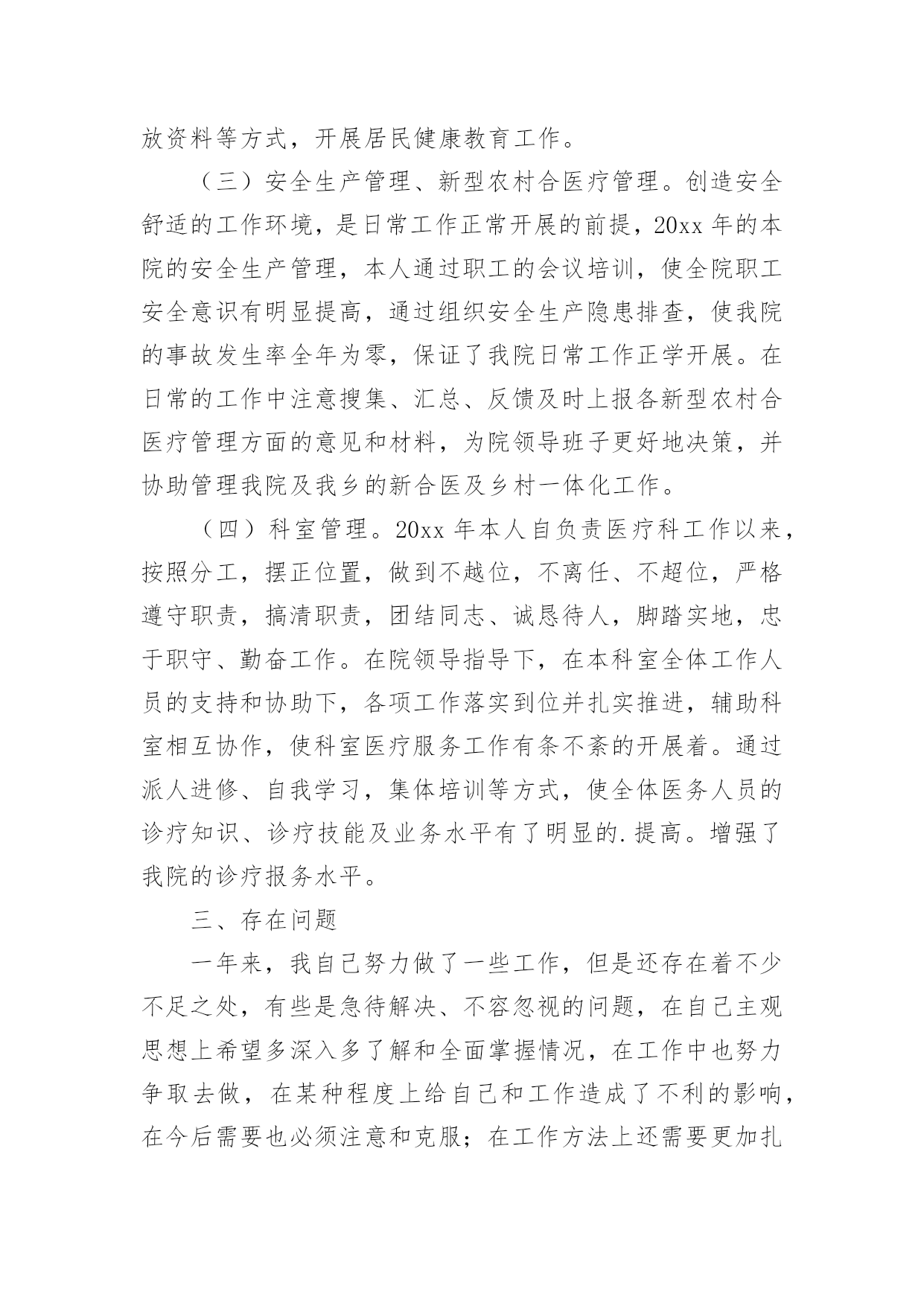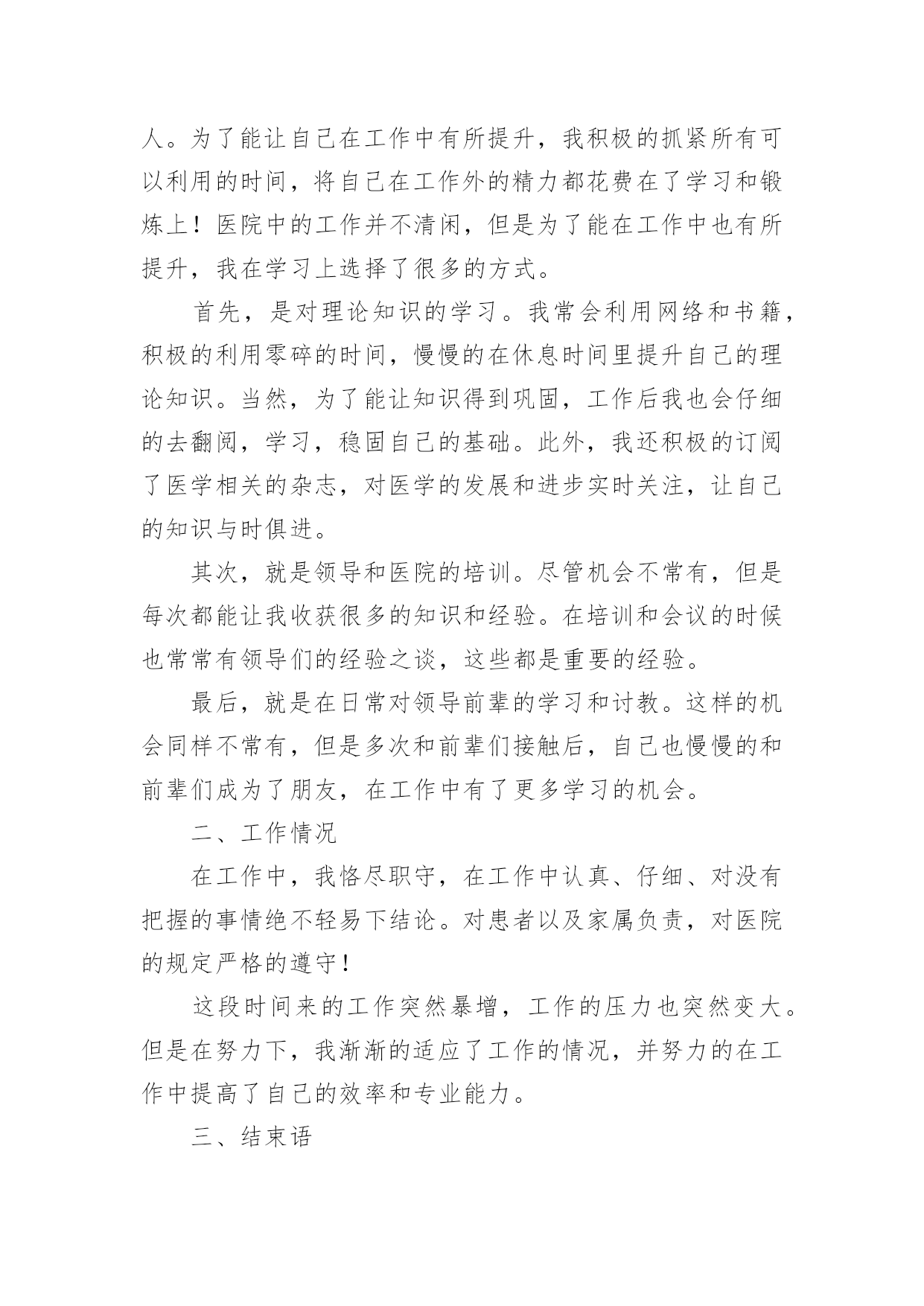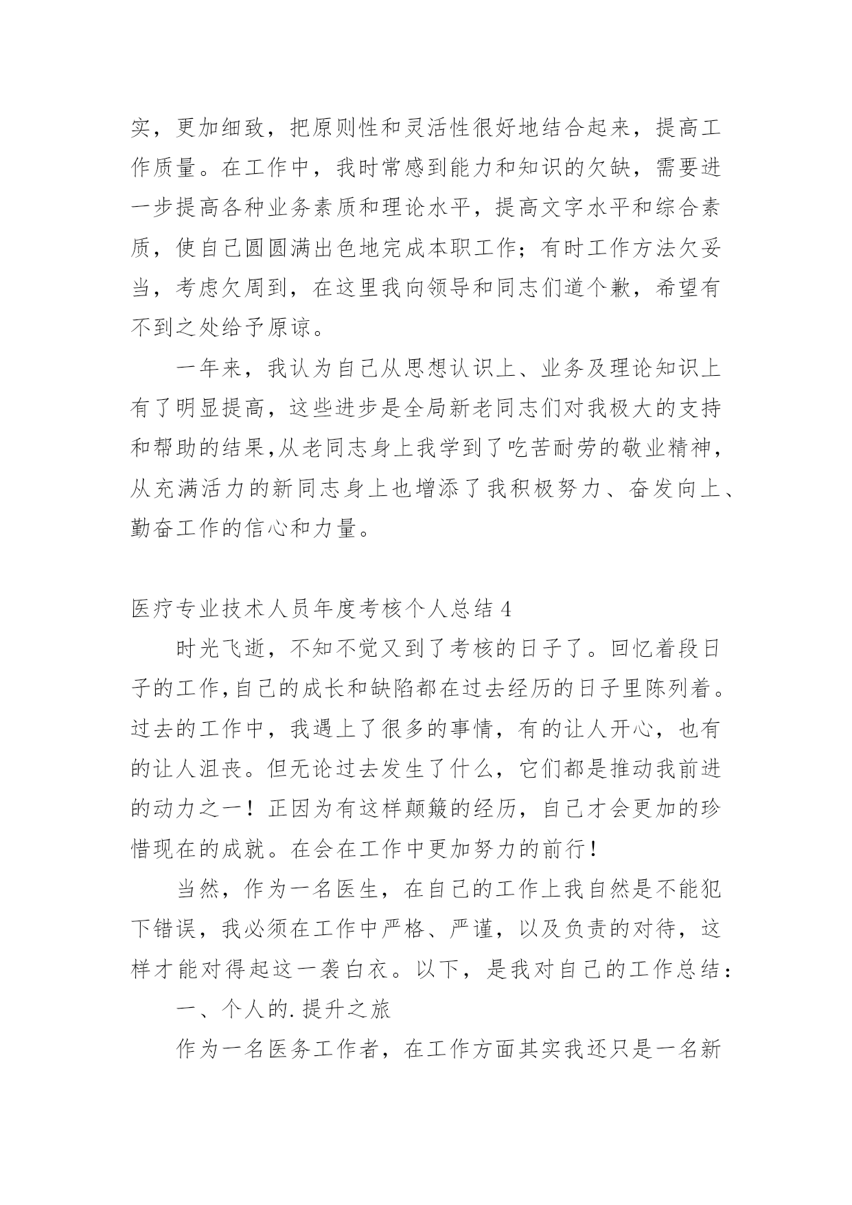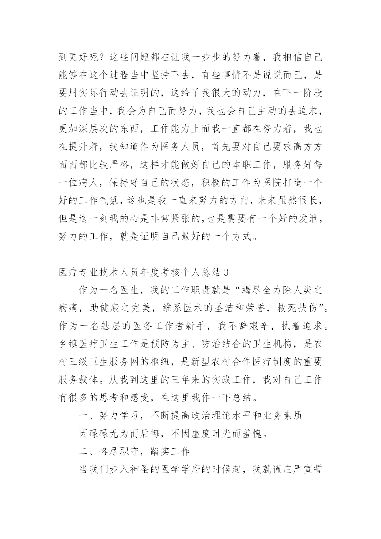 医疗专业技术人员年度考核个人总结总结是事后对某一时期、某一项目或某些工作进行回顾和分析,从而做出带有规律性的结论,它可使零星的、肤浅的、表面的感性认知上升到全面的、系统的、本质的理性认识上来,让我们来为自己写一份总结吧。那么我们该怎么去写总结呢?下面是小编精心整理的医疗专业技术人员年度考核个人总结,希望能够帮助到大家。医疗专业技术人员年度考核个人总结1回顾过去的工作,我作为医生,也是认真的去做好了工作,同时自己也是通过工作让自己得到了成长,获得了更多的经验,我也是对于过去一年的工作来总结下。一、工作方面在这一个年度里头,我也是按照领导的一个要求,去做好我该做的本职事情,无论是上手术,或者门诊,或者是协助做一些大的手术,我都是非常认真的去在做,我知道医生的职业是有一些风险的,而且也是需要去更好的治病救人,所以在工作上面必须要严谨,不能出错,如果出错,小的可能是需要请人来救台,大的可能就是一条活生生的生命,所以无论是什么事情,我都是认真的详细的了解清楚之后才去做的,虽然看起来有些保守,但是为了病人着想,为了自己的职业考虑,也是要这么去做的,不能冒太多的风险,这样对待病人也是非常不好的,而在一些大型的手术上面,我也是通过了自己的努力,学到了很多的东西,虽然只是作为助手,但是其实看术者怎么操作,自己也是能收获很多。二、学习方面做了自己的工作之外,我也是不忘学习,除了院里还有科室组织的一些培训以及学习,我也是经常的看一些手术的视频,多向老师,主任去请教,我清楚我工作的年限还比较的短,很多大型的手术,复杂的手术都是做不了的,那么就要多学,多去练习,只有自己多学了,首先有了积累,然后再在主任的指导下去做,那么才能成为自己的经验,让自己的水平得到一个大的提高,同时下班之后,我也是会多和同行交流经验,并且也是看相关的一些期刊和书籍,医生是需要有丰富的经验的,懂得更多,那么在处理病患的时候也是能更顺利的找到病源,能更好的.去把病人治愈,虽然目前来说,我的水平是不太高,但是我想,我努力学习之下,一定是可以提高更多的,也是以后可以更好的做一名术者,去为病人服务,治愈他们的疾病。一年的时间,我的经验也是得到了增长,同时也是看到了自己身上很多不足的地方,我清楚,要继续的努力,继续的去改进,不断提高,这样我的水平也是有进步,才能做得更好,在今后的工作当中,我也是要不断的学,做好自己该做的工作,同时通过积累经验,让自己的手术水平更高。医疗专业技术人员年度考核个人总结2这一年的工作已经落下帷幕了,我真的是感慨良多,作为一名医生,我知道自己的职责所在,随时随刻都做好准备,虽然工作有很多,有的时候也会感觉到心力交瘁,甚至说身心疲惫,但是这不是我退避的理由,我就应该坚持下去,我就应该带好头去做自己的事情,有些东西还是要坚持的,这工作当中对自己的要求需要高一作为一名医生,更加如此,我不能忽视了这一点,我也需要在接下来的工作当中做到一个完美的程度,对自己的要求更高,也是自责,不能对自己没有要求,也不能盲目的去追求一些没有意义的事情,这一年来的工作,我真的感受很多,我也应该做出一番总结。在工作当中,我知道自己的'职责所在,我也时刻都在保持着好的状态,学习着作为一名医生,我知道自己能力越大,责任就越大,有多大能力干多大事情,不管是做什么事情?都不应该有特别的理由,特别是做医务工作的人员,我真的是感受很多很多,一年来我也经历了很多,让自己成长了很多,但是会工作当中我一直都在成长着,我希望自己能够越来越好,能够受到病人的一个看好,能够受到医院的一个看好,这就是我一直以来工作的动力,好的心态才能做好一个事情,这是毋庸置疑的,现在我就一直都在朝着这个方向努力。同时我也希望在未来的工作当中,自己更进一步,不仅仅是在工作能力上面,还有就是在心态上面一定要保持好,因为做医务工作,心态要摆正,一定要有一个好的状态,这是毋庸置疑的,过去一段时间,我就经常扪心自问,我真的努力了吗?我做了更好了吗?在工作当中,我是不是还能做到更好呢?这些问题都在让我一步步的努力着,我相信自己能够在这个过程当中坚持下去,有些事情不是说说而已,是要用实际行动去证明的,这给了我很大的动力,在下一阶段的工作当中,我会为自己而努力,我也会自己主动的去追求,更加深层次的东西,工作能力上面我一直都在努力着,我也在提升着,我知道作为医务人员,首先要对自己要求高方方面面都比较严格,这样才能做好自己的本职工作,服务好每一位病人,保持好自己的状态,积极的工作为医院打造一个好的工作气氛,这也是我一直来努力的方向,未来虽然很长,但是这一刻我的心是非常紧张的,也是需要有一个好的发泄,努力的工作,就是证明自己最好的一个方式。医疗专业技术人员年度考核个人总结3作为一名医生,我的工作职责就是“竭尽全力除人类之病痛,助健康之完美,维系医术的圣