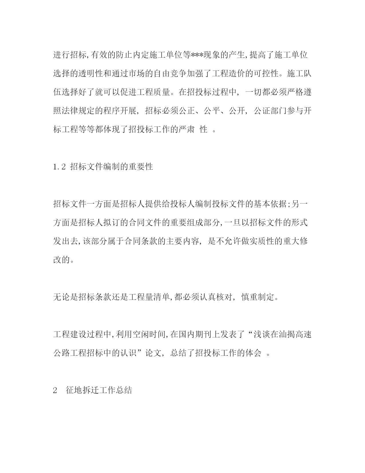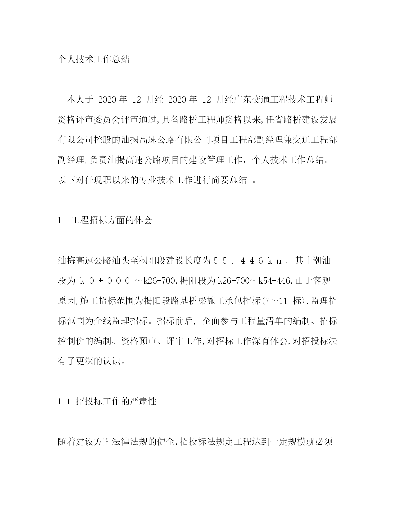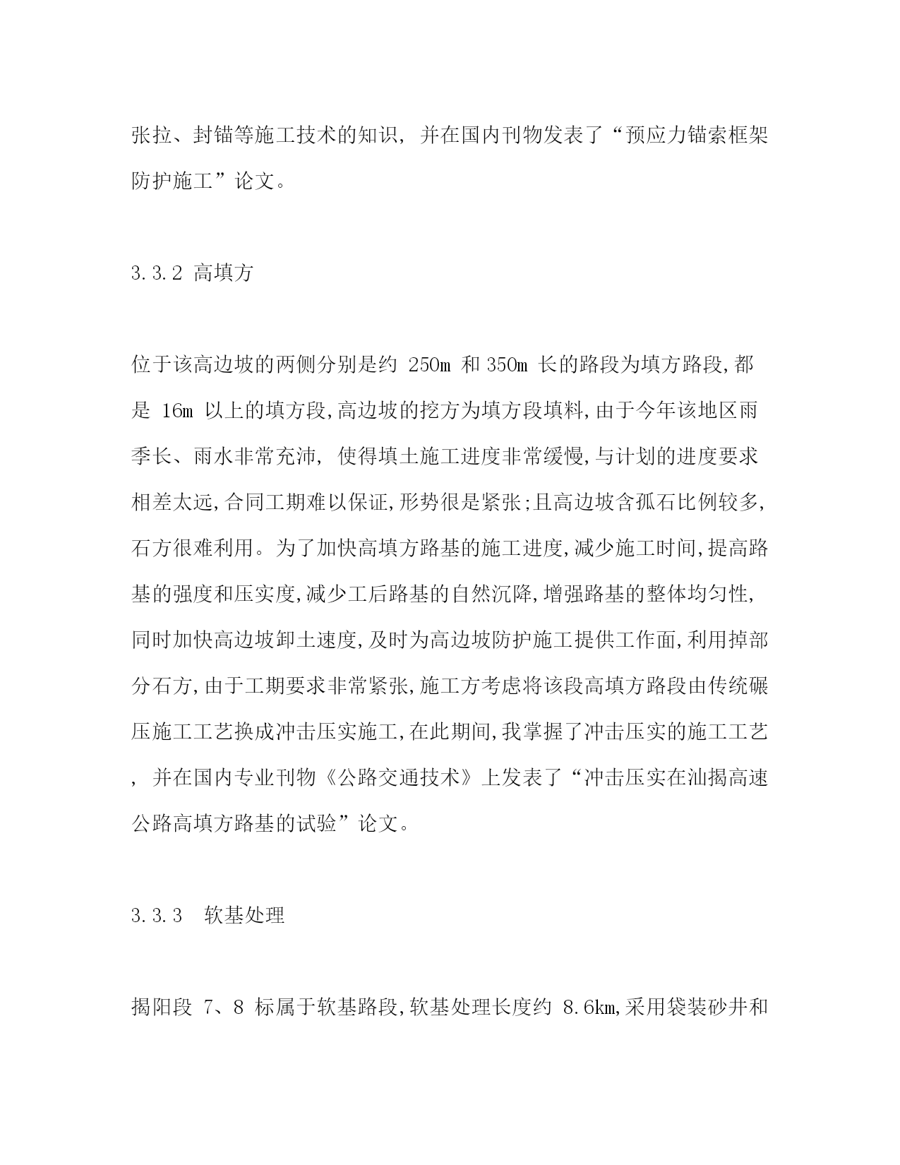 PAGE此资料由网络收集而来,如有侵权请告知上传者立即删除。资料共分享,我们负责传递知识。个人专业技术工作总结第1篇第2篇第3篇第4篇第5篇更多顶部目录第一篇:个人技术工作总结第二篇:个人技术工作总结第三篇:个人专业技术工作总结第四篇:个人技术工作总结第五篇:个人专业技术工作总结更多相关范文正文第一篇:个人技术工作总结个人技术工作总结本人于2020年12月经2020年12月经广东交通工程技术工程师资格评审委员会评审通过,具备路桥工程师资格以来,任省路桥建设发展有限公司控股的汕揭高速公路有限公司项目工程部副经理兼交通工程部副经理,负责汕揭高速公路项目的建设管理工作,个人技术工作总结。以下对任现职以来的专业技术工作进行简要总结。1工程招标方面的体会汕梅高速公路汕头至揭阳段建设长度为55.446km,其中潮汕段为k0+000~k26+700,揭阳段为k26+700~k54+446,由于客观原因,施工招标范围为揭阳段路基桥梁施工承包招标(7~11标),监理招标范围为全线监理招标。招标前后,全面参与工程量清单的编制、招标控制价的编制、资格预审、评审工作,对招标工作深有体会,对招投标法有了更深的认识。1.1招投标工作的严肃性随着建设方面法律法规的健全,招投标法规定工程达到一定规模就必须进行招标,有效的防止内定施工单位等***现象的产生,提高了施工单位选择的透明性和通过市场的自由竞争加强了工程造价的可控性。施工队伍选择好了就可以促进工程质量。在招投标过程中,一切都必须严格遵照法律规定的程序开展,招标必须公正、公平、公开,公证部门参与开标工程等等都体现了招投标工作的严肃性。1.2招标文件编制的重要性招标文件一方面是招标人提供给投标人编制投标文件的基本依据;另一方面是招标人拟订的合同文件的重要组成部分,一旦以招标文件的形式发出去,该部分属于合同条款的主要内容,是不允许做实质性的重大修改的。无论是招标条款还是工程量清单,都必须认真核对,慎重制定。工程建设过程中,利用空闲时间,在国内期刊上发表了“浅谈在汕揭高速公路工程招标中的认识”论文,总结了招投标工作的体会。2征地拆迁工作总结俗话说:巧妇难为无米之炊。能否给工程的建设提供一个良好的环境影响到一个工程能否顺利按期建成的关键,尤其在现在以人为本、征地拆迁成本大大增加的社会,征地拆迁工作异显其重要性。由于公司人事调动等机遇的问题,本人有幸得以在汕揭高速公路项目担任征地拆迁工作小组的组长,主持全线征地拆迁工作以及征拆协调工作。在潮汕地区地少人多、社会矛盾尖锐、潮汕人精明会算的背景下,征地拆迁工作比其他地方难度更大,周期更长,在征地拆迁工作方面,有几点较深的体会。(1)征地拆迁的补偿标准是关键,征拆合同条款是征拆协调的依据,决定了整个工程征地拆迁成本的高低。(2)二次征地比第一次征地花费的时间更长、难度更大、成本更高,所以在第一次征地前要认真核对好施工征地图,保证不少征地,避免二次征地。(3)与地方谈判要分清形势,避免赔偿因点扩展到面。(4)做好现场考证工作,对现场情况要多熟悉,知道症结才能更好的化解。(5)工程具有线路长,点多面广,征拆时要分清轻重缓急,逐个突破。(6)协调工作周期长,一件事情可能会半年一年才能解决得了,因此在做地方工作时要有耐心,通晓有关政策、地方法律法规,坚持原则的基础上加以灵活处理,同时要做好原始资料的保存工作。3工程管理方面的总结3.1质量公路建设质量是项目管理的核心,要做好质量管理工作,我认为有几点是必须要做到的:(1)在招标中选择资质强、信誉好的施工单位和监理单位是关键。(2)施工项目经理以及项目管理人员、项目监理的考核非常重要,他们能否用到工程项目中,必须要进行严格的考核,一发现不对,就要尽早下决心尽快换掉,虽然每更换一次项目经理或项目管理人员对工程进度、工程代价都是非常巨大的,但更换越晚,对工程的顺利开展越不利,造成的过程损失更大,工作总结《个人技术工作总结》。选择好的项目经理或项目管理人员、责任心强与业务能力强的监理也可以大大的缓解业主的管理压力和工程成本,所以在项目经理或项目管理人员、监理人员的考核必须要慎重、精心考核。(3)工程管理串穿整个建设过程,在工程管理中,要认真做好事前控制,过程控制和事后的跟踪。首先必须熟悉施工图纸和技术要求、规范标准,它们是工程建设的依据,也是质量检查的准则,在进行质量检查前必须摸透设计意图才能做好质量管理工作。在施工过程中,要把监理拉到一起,对发现的工程质量问题要充分发挥监理的作用,加强现场检查,加强对监理工作的监督,处理质量问题要解决果断,要安排专人跟踪负责,不能马虎走过场,发现问题不处理、处理不