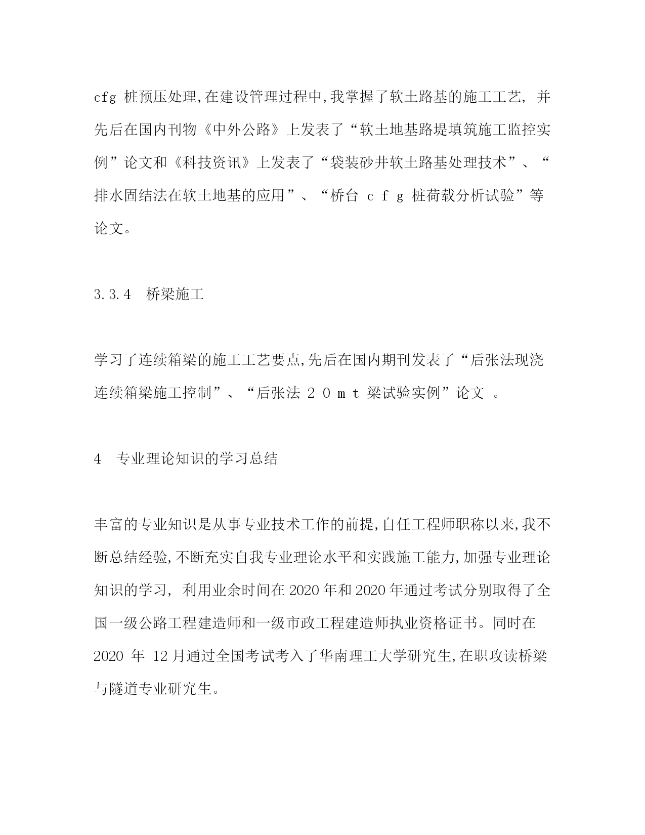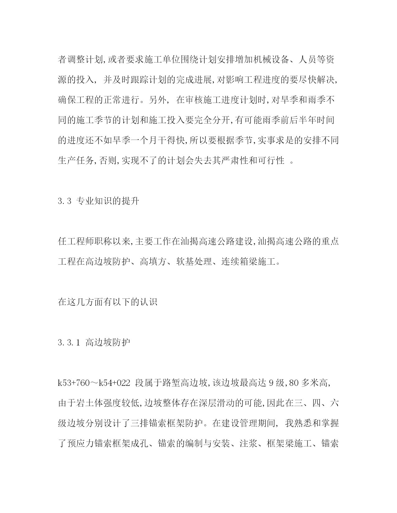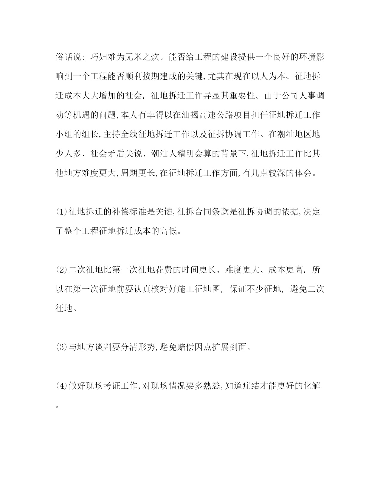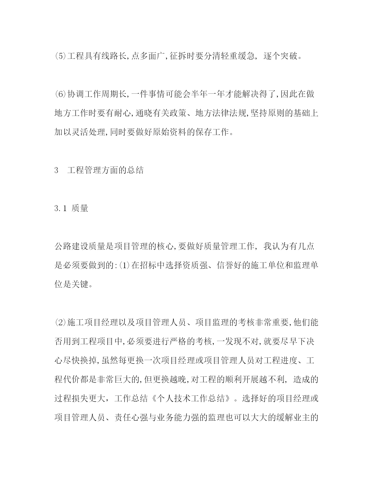 PAGE此资料由网络收集而来,如有侵权请告知上传者立即删除。资料共分享,我们负责传递知识。个人专业技术工作总结第1篇第2篇第3篇第4篇第5篇更多顶部目录第一篇:个人技术工作总结第二篇:个人技术工作总结第三篇:个人专业技术工作总结第四篇:个人技术工作总结第五篇:个人专业技术工作总结更多相关范文正文第一篇:个人技术工作总结个人技术工作总结本人于2020年12月经2020年12月经广东交通工程技术工程师资格评审委员会评审通过,具备路桥工程师资格以来,任省路桥建设发展有限公司控股的汕揭高速公路有限公司项目工程部副经理兼交通工程部副经理,负责汕揭高速公路项目的建设管理工作,个人技术工作总结。以下对任现职以来的专业技术工作进行简要总结。1工程招标方面的体会汕梅高速公路汕头至揭阳段建设长度为55.446km,其中潮汕段为k0+000~k26+700,揭阳段为k26+700~k54+446,由于客观原因,施工招标范围为揭阳段路基桥梁施工承包招标(7~11标),监理招标范围为全线监理招标。招标前后,全面参与工程量清单的编制、招标控制价的编制、资格预审、评审工作,对招标工作深有体会,对招投标法有了更深的认识。1.1招投标工作的严肃性随着建设方面法律法规的健全,招投标法规定工程达到一定规模就必须进行招标,有效的防止内定施工单位等***现象的产生,提高了施工单位选择的透明性和通过市场的自由竞争加强了工程造价的可控性。施工队伍选择好了就可以促进工程质量。在招投标过程中,一切都必须严格遵照法律规定的程序开展,招标必须公正、公平、公开,公证部门参与开标工程等等都体现了招投标工作的严肃性。1.2招标文件编制的重要性招标文件一方面是招标人提供给投标人编制投标文件的基本依据;另一方面是招标人拟订的合同文件的重要组成部分,一旦以招标文件的形式发出去,该部分属于合同条款的主要内容,是不允许做实质性的重大修改的。无论是招标条款还是工程量清单,都必须认真核对,慎重制定。工程建设过程中,利用空闲时间,在国内期刊上发表了“浅谈在汕揭高速公路工程招标中的认识”论文,总结了招投标工作的体会。2征地拆迁工作总结俗话说:巧妇难为无米之炊。能否给工程的建设提供一个良好的环境影响到一个工程能否顺利按期建成的关键,尤其在现在以人为本、征地拆迁成本大大增加的社会,征地拆迁工作异显其重要性。由于公司人事调动等机遇的问题,本人有幸得以在汕揭高速公路项目担任征地拆迁工作小组的组长,主持全线征地拆迁工作以及征拆协调工作。在潮汕地区地少人多、社会矛盾尖锐、潮汕人精明会算的背景下,征地拆迁工作比其他地方难度更大,周期更长,在征地拆迁工作方面,有几点较深的体会。(1)征地拆迁的补偿标准是关键,征拆合同条款是征拆协调的依据,决定了整个工程征地拆迁成本的高低。(2)二次征地比第一次征地花费的时间更长、难度更大、成本更高,所以在第一次征地前要认真核对好施工征地图,保证不少征地,避免二次征地。(3)与地方谈判要分清形势,避免赔偿因点扩展到面。(4)做好现场考证工作,对现场情况要多熟悉,知道症结才能更好的化解。(5)工程具有线路长,点多面广,征拆时要分清轻重缓急,逐个突破。(6)协调工作周期长,一件事情可能会半年一年才能解决得了,因此在做地方工作时要有耐心,通晓有关政策、地方法律法规,坚持原则的基础上加以灵活处理,同时要做好原始资料的保存工作。3工程管理方面的总结3.1质量公路建设质量是项目管理的核心,要做好质量管理工作,我认为有几点是必须要做到的:(1)在招标中选择资质强、信誉好的施工单位和监理单位是关键。(2)施工项目经理以及项目管理人员、项目监理的考核非常重要,他们能否用到工程项目中,必须要进行严格的考核,一发现不对,就要尽早下决心尽快换掉,虽然每更换一次项目经理或项目管理人员对工程进度、工程代价都是非常巨大的,但更换越晚,对工程的顺利开展越不利,造成的过程损失更大,工作总结《个人技术工作总结》。选择好的项目经理或项目管理人员、责任心强与业务能力强的监理也可以大大的缓解业主的管理压力和工程成本,所以在项目经理或项目管理人员、监理人员的考核必须要慎重、精心考核。(3)工程管理串穿整个建设过程,在工程管理中,要认真做好事前控制,过程控制和事后的跟踪。首先必须熟悉施工图纸和技术要求、规范标准,它们是工程建设的依据,也是质量检查的准则,在进行质量检查前必须摸透设计意图才能做好质量管理工作。在施工过程中,要把监理拉到一起,对发现的工程质量问题要充分发挥监理的作用,加强现场检查,加强对监理工作的监督,处理质量问题要解决果断,要安排专人跟踪负责,不能马虎走过场,发现问题不处理、处理不