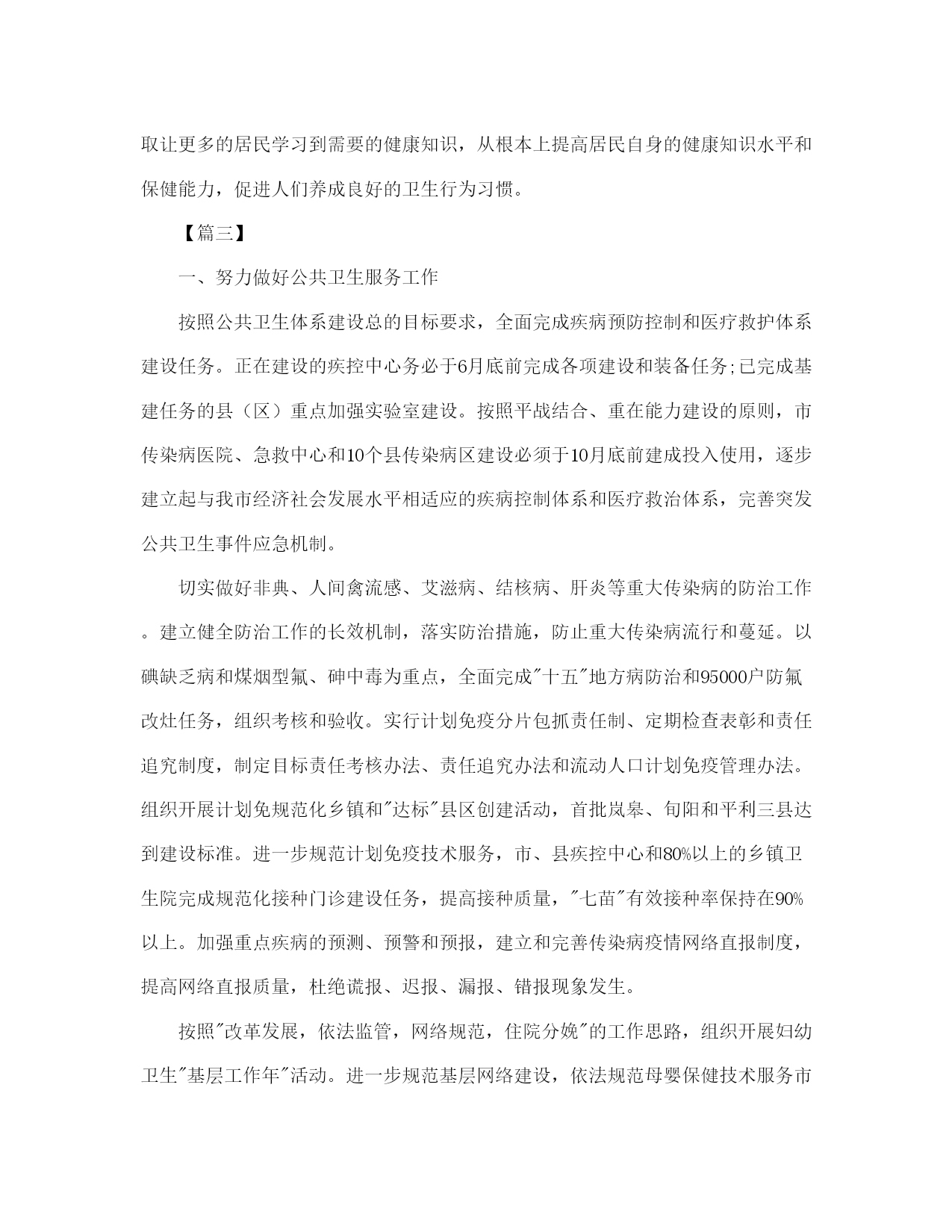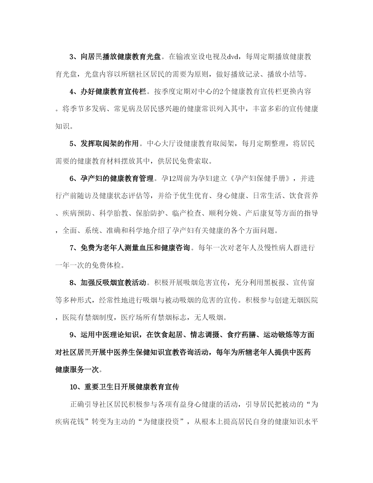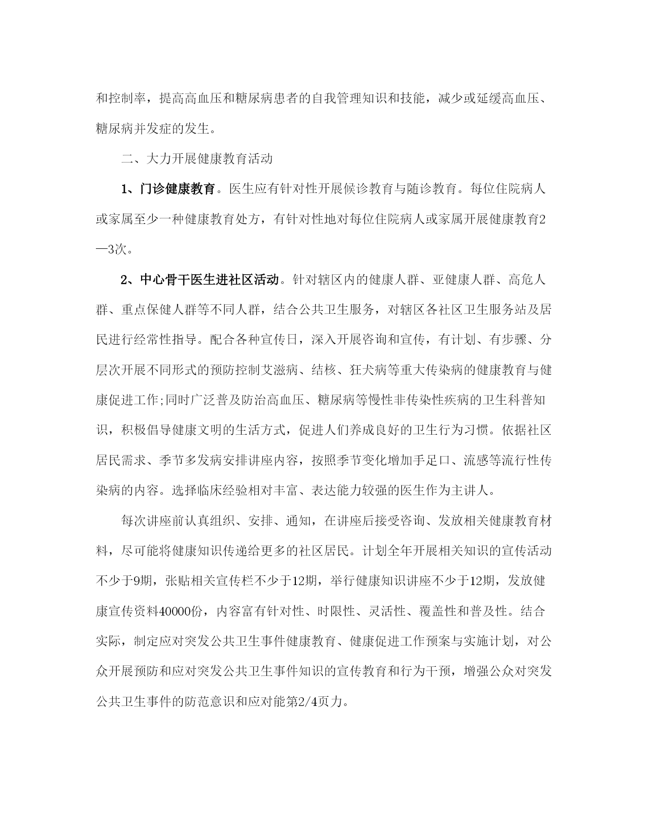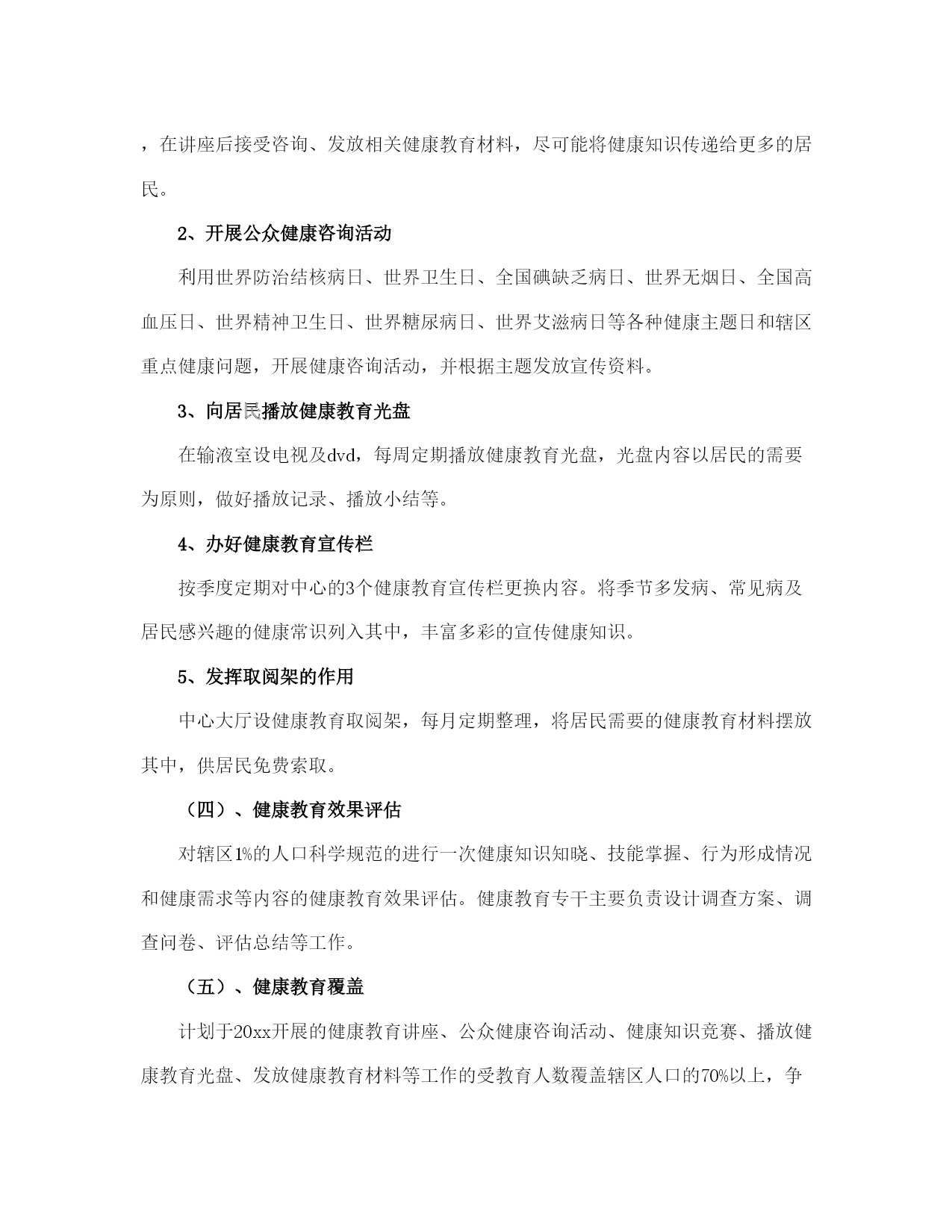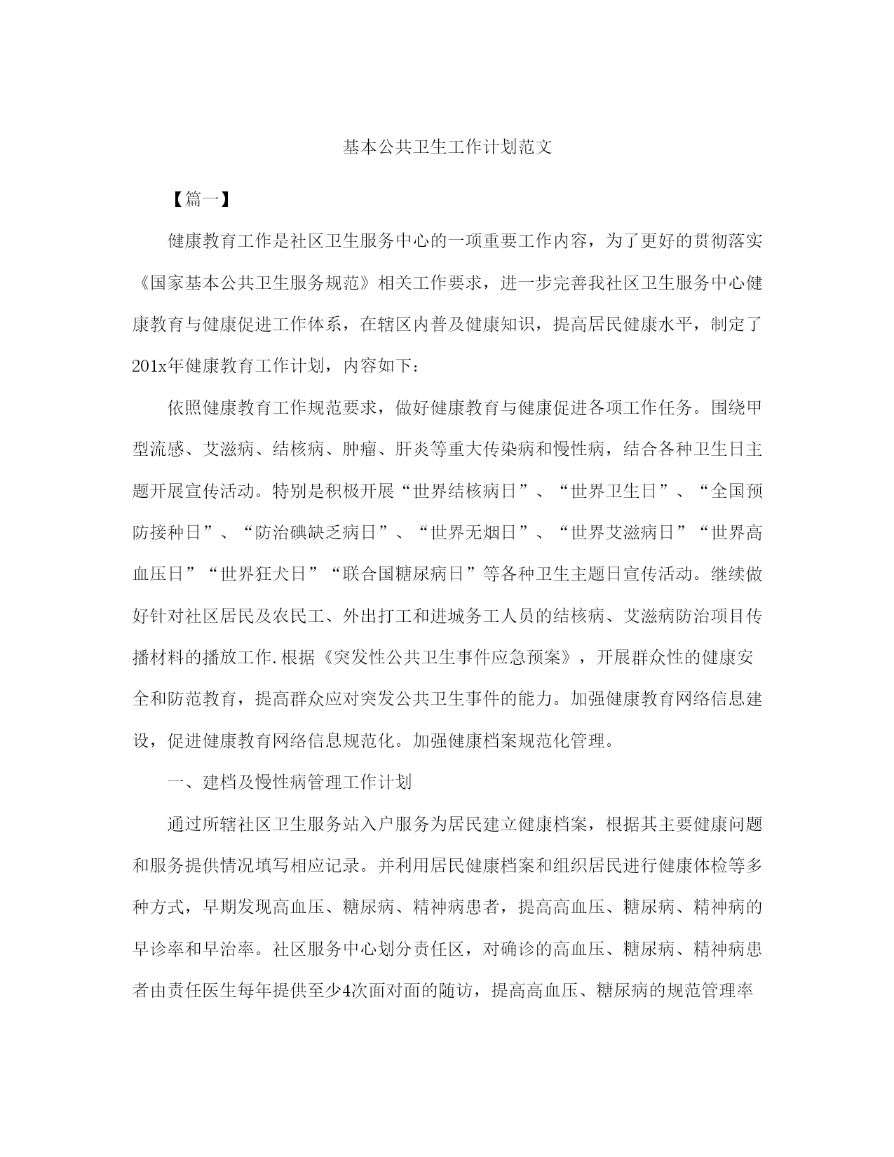 基本公共卫生工作计划范文(完整版)文档资料可直接使用,可编辑,欢迎下载基本公共卫生工作计划范文【篇一】健康教育工作是社区卫生服务中心的一项重要工作内容,为了更好的贯彻落实《国家基本公共卫生服务规范》相关工作要求,进一步完善我社区卫生服务中心健康教育与健康促进工作体系,在辖区内普及健康知识,提高居民健康水平,制定了201x年健康教育工作计划,内容如下:依照健康教育工作规范要求,做好健康教育与健康促进各项工作任务。围绕甲型流感、艾滋病、结核病、肿瘤、肝炎等重大传染病和慢性病,结合各种卫生日主题开展宣传活动。特别是积极开展“世界结核病日”、“世界卫生日”、“全国预防接种日”、“防治碘缺乏病日”、“世界无烟日”、“世界艾滋病日”“世界高血压日”“世界狂犬日”“联合国糖尿病日”等各种卫生主题日宣传活动。继续做好针对社区居民及农民工、外出打工和进城务工人员的结核病、艾滋病防治项目传播材料的播放工作.根据《突发性公共卫生事件应急预案》,开展群众性的健康安全和防范教育,提高群众应对突发公共卫生事件的能力。加强健康教育网络信息建设,促进健康教育网络信息规范化。加强健康档案规范化管理。一、建档及慢性病管理工作计划通过所辖社区卫生服务站入户服务为居民建立健康档案,根据其主要健康问题和服务提供情况填写相应记录。并利用居民健康档案和组织居民进行健康体检等多种方式,早期发现高血压、糖尿病、精神病患者,提高高血压、糖尿病、精神病的早诊率和早治率。社区服务中心划分责任区,对确诊的高血压、糖尿病、精神病患者由责任医生每年提供至少4次面对面的随访,提高高血压、糖尿病的规范管理率和控制率,提高高血压和糖尿病患者的自我管理知识和技能,减少或延缓高血压、糖尿病并发症的发生。二、大力开展健康教育活动1、门诊健康教育。医生应有针对性开展候诊教育与随诊教育。每位住院病人或家属至少一种健康教育处方,有针对性地对每位住院病人或家属开展健康教育2—3次。2、中心骨干医生进社区活动。针对辖区内的健康人群、亚健康人群、高危人群、重点保健人群等不同人群,结合公共卫生服务,对辖区各社区卫生服务站及居民进行经常性指导。配合各种宣传日,深入开展咨询和宣传,有计划、有步骤、分层次开展不同形式的预防控制艾滋病、结核、狂犬病等重大传染病的健康教育与健康促进工作;同时广泛普及防治高血压、糖尿病等慢性非传染性疾病的卫生科普知识,积极倡导健康文明的生活方式,促进人们养成良好的卫生行为习惯。依据社区居民需求、季节多发病安排讲座内容,按照季节变化增加手足口、流感等流行性传染病的内容。选择临床经验相对丰富、表达能力较强的医生作为主讲人。每次讲座前认真组织、安排、通知,在讲座后接受咨询、发放相关健康教育材料,尽可能将健康知识传递给更多的社区居民。计划全年开展相关知识的宣传活动不少于9期,张贴相关宣传栏不少于12期,举行健康知识讲座不少于12期,发放健康宣传资料40000份,内容富有针对性、时限性、灵活性、覆盖性和普及性。结合实际,制定应对突发公共卫生事件健康教育、健康促进工作预案与实施计划,对公众开展预防和应对突发公共卫生事件知识的宣传教育和行为干预,增强公众对突发公共卫生事件的防范意识和应对能第2/4页力。3、向居民播放健康教育光盘。在输液室设电视及dvd,每周定期播放健康教育光盘,光盘内容以所辖社区居民的需要为原则,做好播放记录、播放小结等。4、办好健康教育宣传栏。按季度定期对中心的2个健康教育宣传栏更换内容。将季节多发病、常见病及居民感兴趣的健康常识列入其中,丰富多彩的宣传健康知识。5、发挥取阅架的作用。中心大厅设健康教育取阅架,每月定期整理,将居民需要的健康教育材料摆放其中,供居民免费索取。6、孕产妇的健康教育管理。孕12周前为孕妇建立《孕产妇保健手册》,并进行产前随访及健康状态评估等,并给予优生优育、身心健康、日常生活、饮食营养、疾病预防、科学胎教、保胎防护、临产检查、顺利分娩、产后康复等方面的指导,全面、系统、准确和科学地介绍了孕产妇有关健康的各个方面问题。7、免费为老年人测量血压和健康咨询。每年一次对老年人及慢性病人群进行一年一次的免费体检。8、加强反吸烟宣教活动。积极开展吸烟危害宣传,充分利用黑板报、宣传窗等多种形式,经常性地进行吸烟与被动吸烟的危害的宣传。积极参与创建无烟医院,医院有禁烟制度,医疗场所有禁烟标志,无人吸烟。9、运用中医理论知识,在饮食起居、情志调摄、食疗药膳、运动锻炼等方面对社区居民开展中医养生保健知识宣教咨询活动,每年为所辖老年人提供中医药健康服务一次。10、重要卫生日开展健康教育宣传正确引导社区居民积极参与各项有益身心健康的活动,引导居民把被动的“为疾病花钱”转变为主动的“为健康投资”,从根本上提高居民自身的健康知识水平和保健能力。同