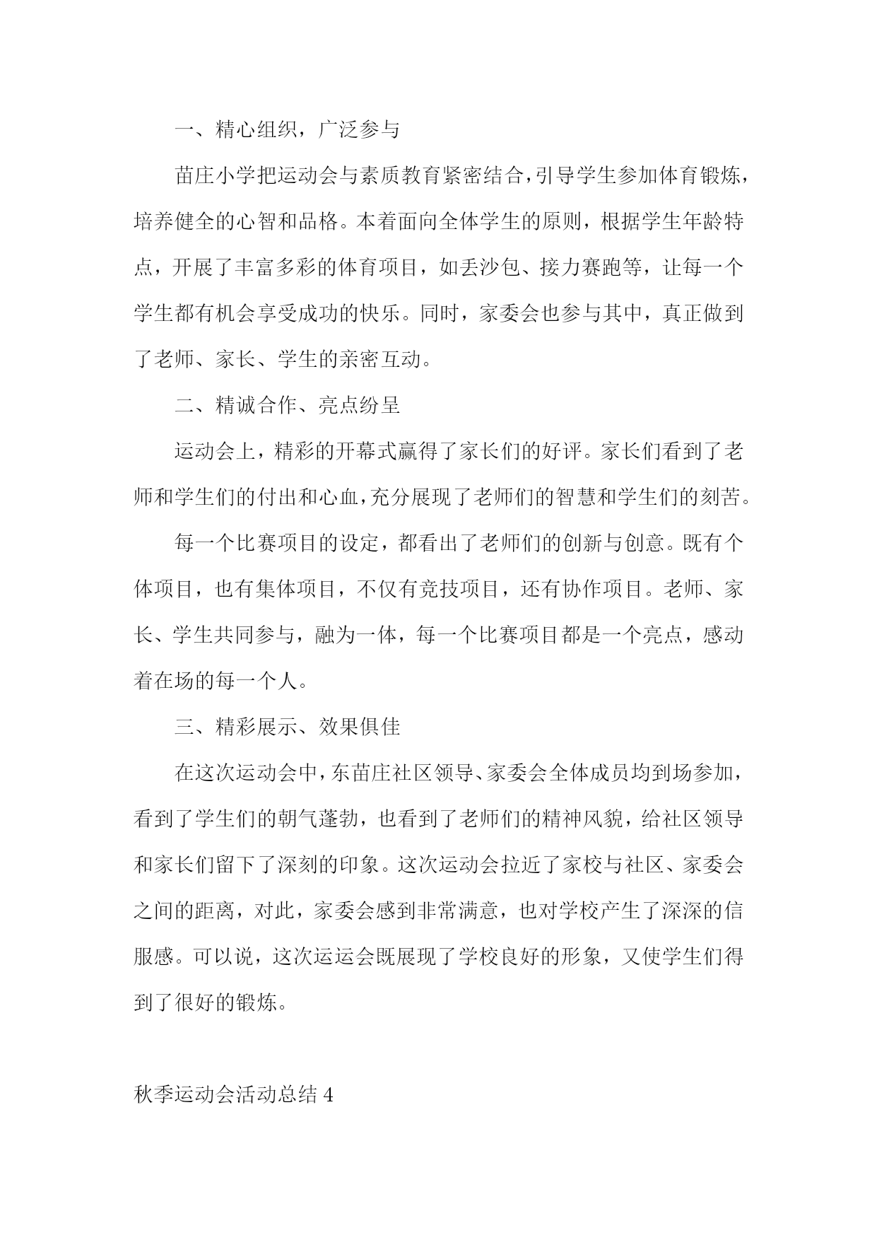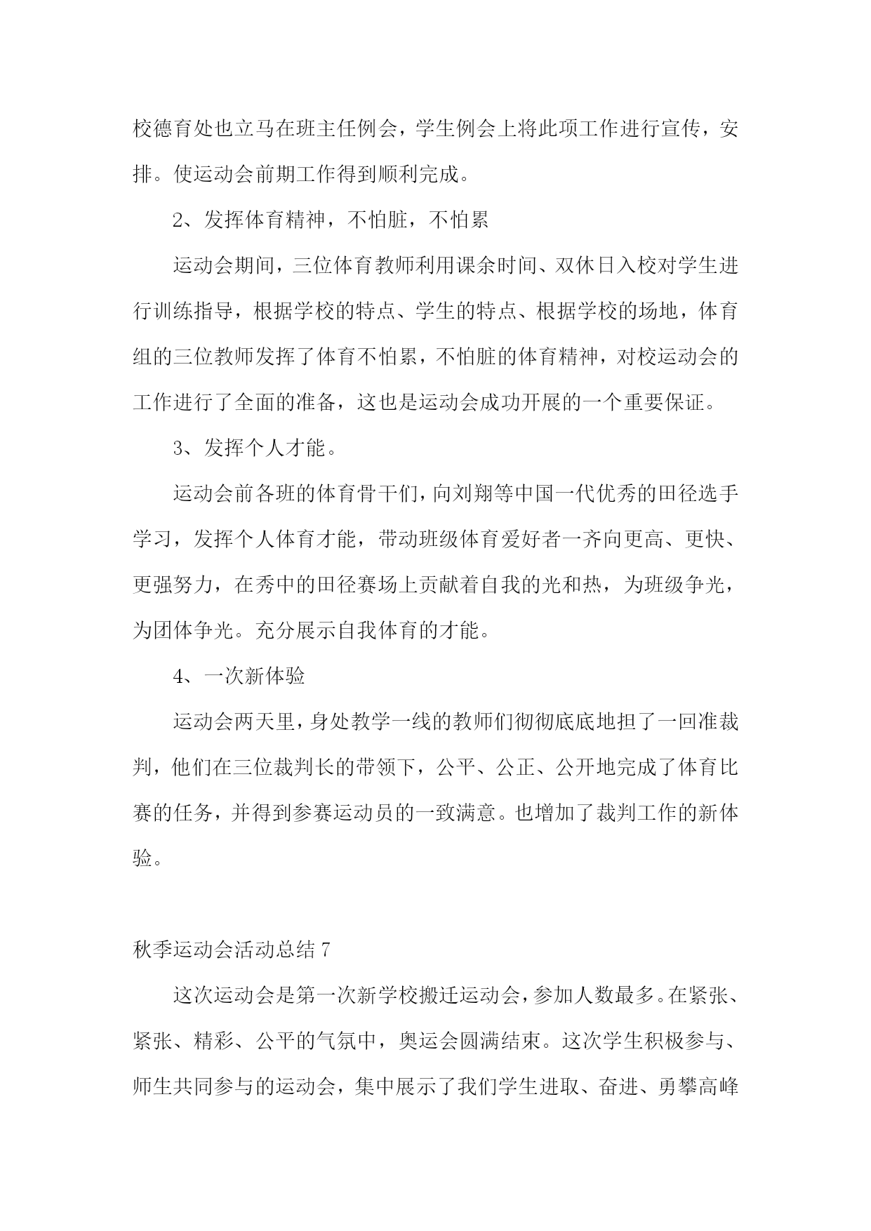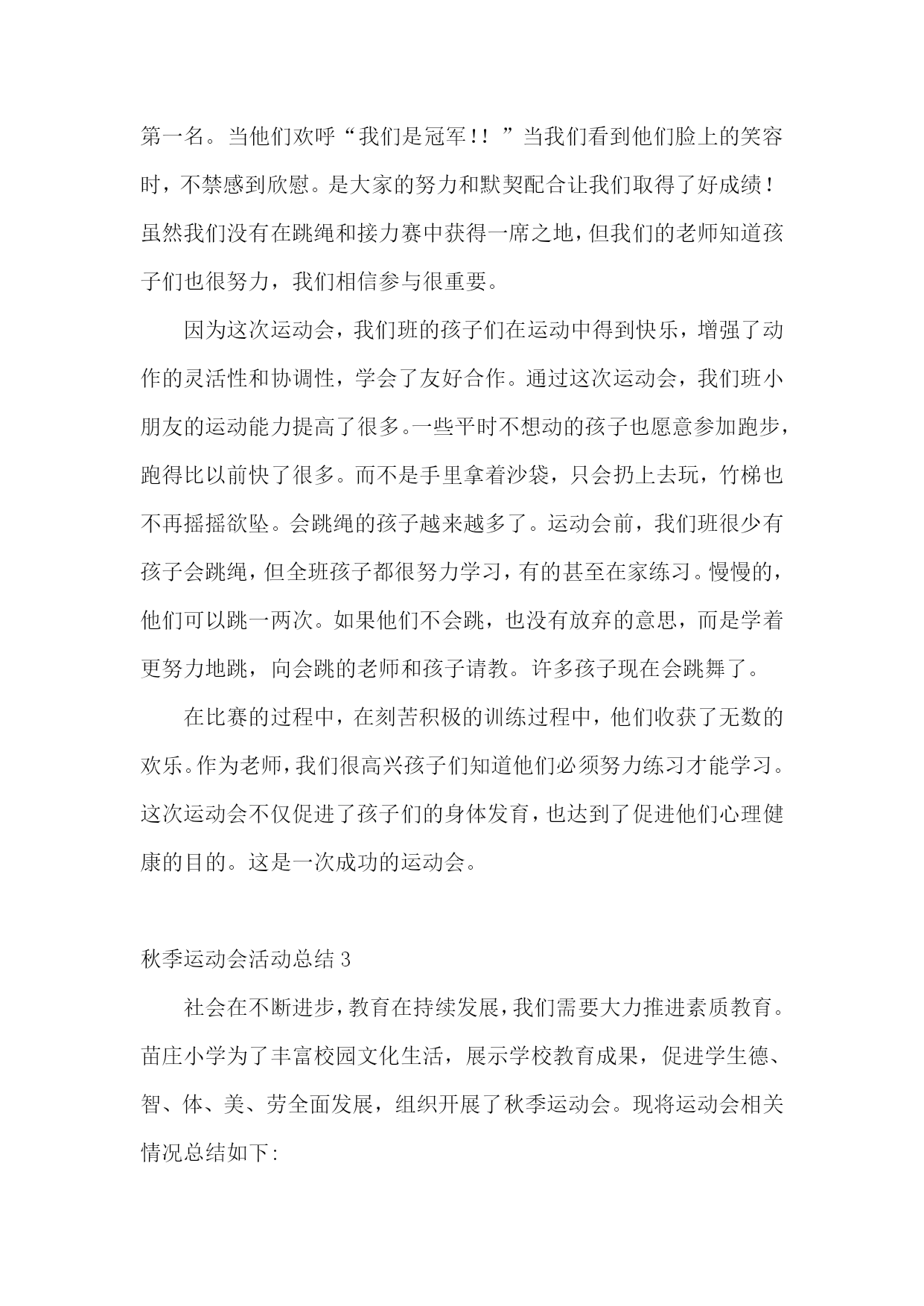 秋季运动会活动总结秋季运动会活动总结1“李校长--加油,加油!”随着震耳的呼喊声,整个会场气氛达到了高潮,啊!比赛结束了,忽然一阵淅沥的秋雨为秋运会画上了圆满的句号。历时一天半的秋季田径运动会,在组委会的精心组织下,经过全体工作人员、裁判员的辛勤工作和全体运动员的奋力拼搏,在紧张热烈的气氛中,顺利闭幕了。本次运动会是我校塑胶操场建成后的第一次盛会,有10个大项60个小项的比赛,共有360人次获奖;有21班级成绩突出,获得团体总分优胜奖;有14个班级获得体育道德风尚奖。回想这一天半运动会情况,屡屡好事和优异成绩层出不穷,但也有几点欠缺,现总结一下:1.学生方面:今年的运动会各班在班主任的带领下集合迅速及时,路途秩序井然,观众场上学生喊声响亮,掌声激烈,非运动员满场地闲逛的现象少了许多,每次比赛结束,观众席上再也看不到满地垃圾的现象;运动会结束后,各班的环境小卫士纷纷拿起了垃圾捅,将满地的垃圾和废纸一一捡起,使我们的运动场干净如初,这是多么好的一个倡导,这是多么好的一个举动,值得我校每一位同学平时继续发扬下去。2.比赛场上:运动员飞奔在火红的跑道上,身影跳跃成活泼的音符,脚步奏响出胜利的旋律,冲刺迸发出生命的活力,充分展示了学生团结协作、顽强拼搏的精神风貌。辛苦的裁判员老师们,准时到岗到位,始终如一。尤其是起终点的每一位老师,发令员的每一次枪响,我们的计时员神经就要被紧张一次,眼睛不敢眨一下,唯恐看不见烟雾,计不准确时间,他们整个上午或下午时刻都坚守在岗位上,从不擅自离开,听从计时长的调遣;终点名次裁判员也是如此,精力非常集中,等运动员快来到终点时,他们便睁大眼睛,紧盯着冲刺线,看谁的身躯先到,以便判出准确的名次。我们的终点裁判员邓老师,身患感冒,嗓子哑了,但也没有退缩,依然坚守岗位;我们的计时长雷老师也是如此,嗓子喊哑了,腿僵直了,也从未说一个“累”字,任劳任怨的完成了每一项比赛,在计时员当中,有一位老教师花白头发,始终坚守岗位,认认真真;我们的计时员业务有不熟练到熟练,到逐渐适应,手不停地写,嘴里不停地念,将一组组的比赛成绩誊写在单子上,他们都是第一个到,最后一个离开;我们的田赛裁判员表现也非常好,大部分都能按时到岗,辛勤工作,顺利完成了各项比赛任务;但也有个别老教师一天半时间就有三次迟到早退现象,不拿比赛当回事,持有“事不关己,高高挂起”的心态,对工作不负责任,造成了很坏的影响,试想一下如果都像你一样,那我们的运动会还会这么顺利吗?还能如期完成比赛任务吗?总之,这次运动会开的即紧张热烈又圆满顺利,比赛场上运动员们比技术、比力量、比毅力;运动场外观众同学比纪律、比卫生、比服务,因此涌现出了许多优秀的运动员,涌现出了许多拾金不昧优秀品质的同学,涌现出了一个个我爱我家的环境小卫士,我们相信,运动会虽然开完了,但这样的精神和做法将永远传递下去,为我校的发展继续添砖加瓦奉献一份力量。秋季运动会活动总结2本学期xx、xx周,秋季运动会在我园举行。以实施《纲要》和《指南》为核心,从小树立孩子积极参与体育运动的意识,培养勇敢坚强、不怕困难的优秀品质,做一个健康快乐、积极乐观的人。本着安全第一、全班积极参与、孩子真心参与的三大原则,运动会进行得很顺利。在“我运动,我健康,我快乐”的口号下,在老师的带领下,我们X班的孩子们积极参加了这次秋季运动会。班级比赛前,我们班每天都进行项目训练,每天的训练项目都有条不紊的进行,比如跳绳,沙袋,障碍训练,周五接力赛。全班同学都投入到运动会的训练中,积极性非常高。他们争强好胜,为班级和自己赢得了荣誉。所以训练很认真。他们不仅比以前更遵守秩序,而且每个孩子都认真训练,希望成为代表班级的小运动员。每天早上,在游戏和练习之后,我们班在晨间谈话中总结,指出需要改进的地方。比如接力赛时每队最后一个孩子必须举起接力棒,障碍赛时双脚起跳,跳绳时要远离对方,防止别人和自己被迫停下来,沙袋要看着自己的头,不能猛砸下去。随着全班的日复一日的训练,孩子们越来越熟练,不会再犯以前的错误了。我们老师看到他们心里也是高兴的。比赛中,我们班的小朋友万在沙袋投掷比赛中以X的优异成绩获得了大班组第一名,障碍赛也在xxx、xxx等小朋友的努力下获得了第一名。当他们欢呼“我们是冠军!!”当我们看到他们脸上的笑容时,不禁感到欣慰。是大家的努力和默契配合让我们取得了好成绩!虽然我们没有在跳绳和接力赛中获得一席之地,但我们的老师知道孩子们也很努力,我们相信参与很重要。因为这次运动会,我们班的孩子们在运动中得到快乐,增强了动作的灵活性和协调性,学会了友好合作。通过这次运动会,我们班小朋友的运动能力提高了很多。一些平时不想动的孩子也愿意参加跑步,跑得比以前快了很多。而不是手里拿着沙袋,只会扔上去玩,竹梯也不再摇摇欲坠。会跳绳的孩子越