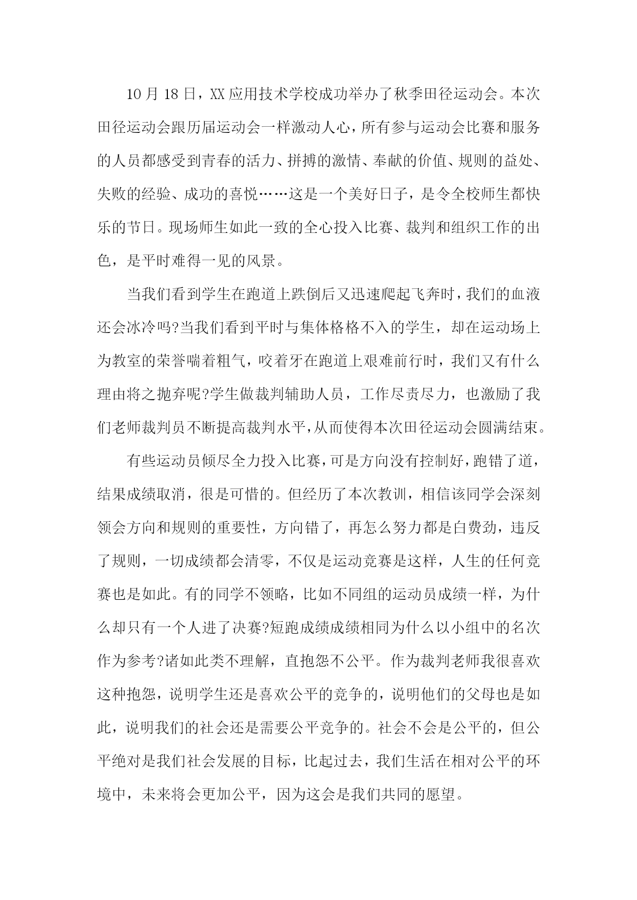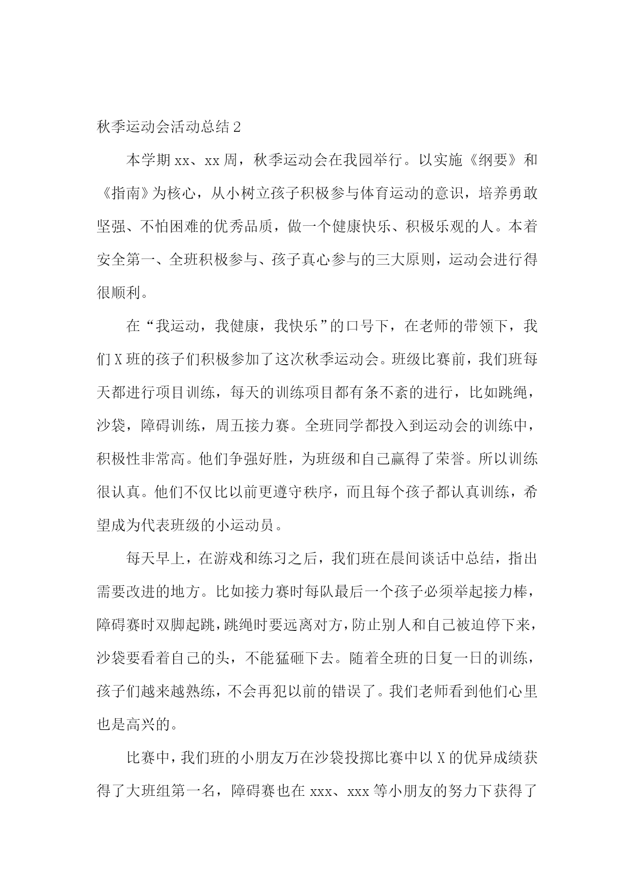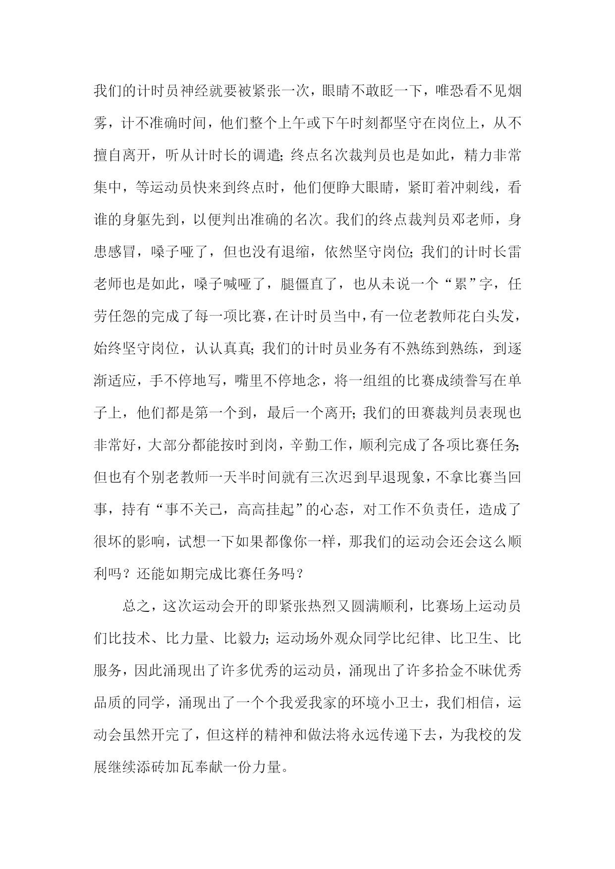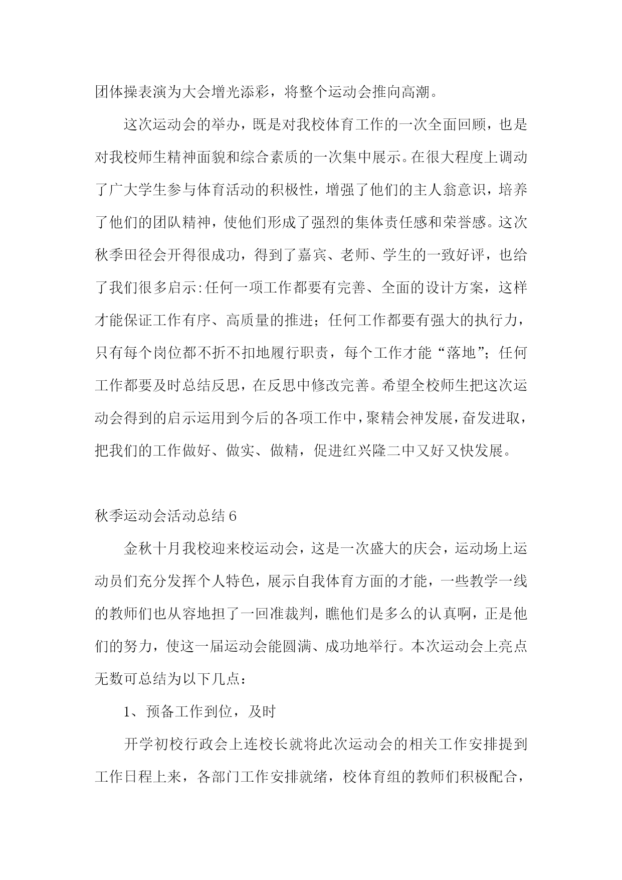 秋季运动会活动总结秋季运动会活动总结1“李校长--加油,加油!”随着震耳的呼喊声,整个会场气氛达到了高潮,啊!比赛结束了,忽然一阵淅沥的秋雨为秋运会画上了圆满的句号。历时一天半的秋季田径运动会,在组委会的精心组织下,经过全体工作人员、裁判员的辛勤工作和全体运动员的奋力拼搏,在紧张热烈的气氛中,顺利闭幕了。本次运动会是我校塑胶操场建成后的第一次盛会,有10个大项60个小项的比赛,共有360人次获奖;有21班级成绩突出,获得团体总分优胜奖;有14个班级获得体育道德风尚奖。回想这一天半运动会情况,屡屡好事和优异成绩层出不穷,但也有几点欠缺,现总结一下:1.学生方面:今年的运动会各班在班主任的带领下集合迅速及时,路途秩序井然,观众场上学生喊声响亮,掌声激烈,非运动员满场地闲逛的现象少了许多,每次比赛结束,观众席上再也看不到满地垃圾的现象;运动会结束后,各班的环境小卫士纷纷拿起了垃圾捅,将满地的垃圾和废纸一一捡起,使我们的运动场干净如初,这是多么好的一个倡导,这是多么好的一个举动,值得我校每一位同学平时继续发扬下去。2.比赛场上:运动员飞奔在火红的跑道上,身影跳跃成活泼的音符,脚步奏响出胜利的旋律,冲刺迸发出生命的活力,充分展示了学生团结协作、顽强拼搏的精神风貌。辛苦的裁判员老师们,准时到岗到位,始终如一。尤其是起终点的每一位老师,发令员的每一次枪响,我们的计时员神经就要被紧张一次,眼睛不敢眨一下,唯恐看不见烟雾,计不准确时间,他们整个上午或下午时刻都坚守在岗位上,从不擅自离开,听从计时长的调遣;终点名次裁判员也是如此,精力非常集中,等运动员快来到终点时,他们便睁大眼睛,紧盯着冲刺线,看谁的身躯先到,以便判出准确的名次。我们的终点裁判员邓老师,身患感冒,嗓子哑了,但也没有退缩,依然坚守岗位;我们的计时长雷老师也是如此,嗓子喊哑了,腿僵直了,也从未说一个“累”字,任劳任怨的完成了每一项比赛,在计时员当中,有一位老教师花白头发,始终坚守岗位,认认真真;我们的计时员业务有不熟练到熟练,到逐渐适应,手不停地写,嘴里不停地念,将一组组的比赛成绩誊写在单子上,他们都是第一个到,最后一个离开;我们的田赛裁判员表现也非常好,大部分都能按时到岗,辛勤工作,顺利完成了各项比赛任务;但也有个别老教师一天半时间就有三次迟到早退现象,不拿比赛当回事,持有“事不关己,高高挂起”的心态,对工作不负责任,造成了很坏的影响,试想一下如果都像你一样,那我们的运动会还会这么顺利吗?还能如期完成比赛任务吗?总之,这次运动会开的即紧张热烈又圆满顺利,比赛场上运动员们比技术、比力量、比毅力;运动场外观众同学比纪律、比卫生、比服务,因此涌现出了许多优秀的运动员,涌现出了许多拾金不昧优秀品质的同学,涌现出了一个个我爱我家的环境小卫士,我们相信,运动会虽然开完了,但这样的精神和做法将永远传递下去,为我校的发展继续添砖加瓦奉献一份力量。秋季运动会活动总结2本学期xx、xx周,秋季运动会在我园举行。以实施《纲要》和《指南》为核心,从小树立孩子积极参与体育运动的意识,培养勇敢坚强、不怕困难的优秀品质,做一个健康快乐、积极乐观的人。本着安全第一、全班积极参与、孩子真心参与的三大原则,运动会进行得很顺利。在“我运动,我健康,我快乐”的口号下,在老师的带领下,我们X班的孩子们积极参加了这次秋季运动会。班级比赛前,我们班每天都进行项目训练,每天的训练项目都有条不紊的进行,比如跳绳,沙袋,障碍训练,周五接力赛。全班同学都投入到运动会的训练中,积极性非常高。他们争强好胜,为班级和自己赢得了荣誉。所以训练很认真。他们不仅比以前更遵守秩序,而且每个孩子都认真训练,希望成为代表班级的小运动员。每天早上,在游戏和练习之后,我们班在晨间谈话中总结,指出需要改进的地方。比如接力赛时每队最后一个孩子必须举起接力棒,障碍赛时双脚起跳,跳绳时要远离对方,防止别人和自己被迫停下来,沙袋要看着自己的头,不能猛砸下去。随着全班的日复一日的训练,孩子们越来越熟练,不会再犯以前的错误了。我们老师看到他们心里也是高兴的。比赛中,我们班的小朋友万在沙袋投掷比赛中以X的优异成绩获得了大班组第一名,障碍赛也在xxx、xxx等小朋友的努力下获得了第一名。当他们欢呼“我们是冠军!!”当我们看到他们脸上的笑容时,不禁感到欣慰。是大家的努力和默契配合让我们取得了好成绩!虽然我们没有在跳绳和接力赛中获得一席之地,但我们的老师知道孩子们也很努力,我们相信参与很重要。因为这次运动会,我们班的孩子们在运动中得到快乐,增强了动作的灵活性和协调性,学会了友好合作。通过这次运动会,我们班小朋友的运动能力提高了很多。一些平时不想动的孩子也愿意参加跑步,跑得比以前快了很多。而不是手里拿着沙袋,只会扔上去玩,竹梯也不再摇摇欲坠。会跳绳的孩子越