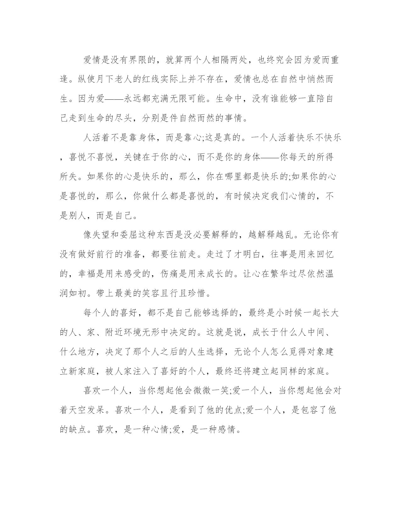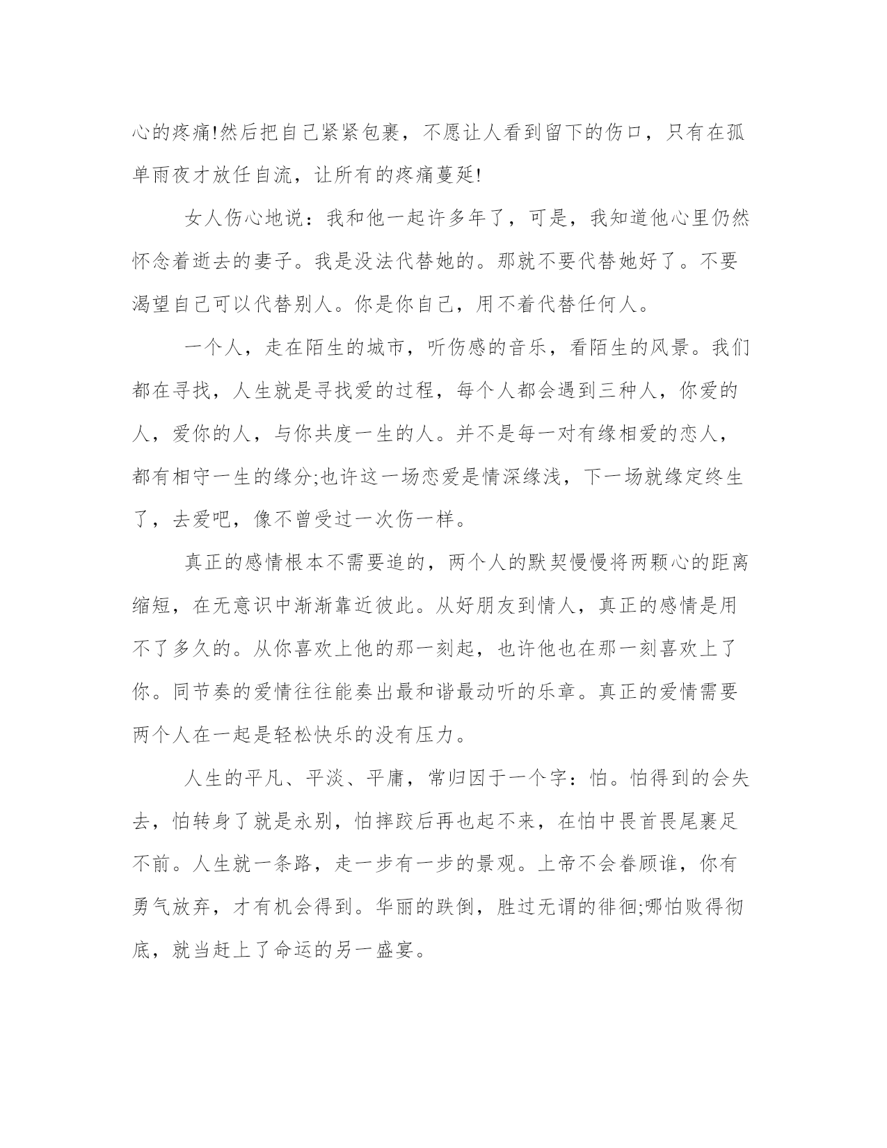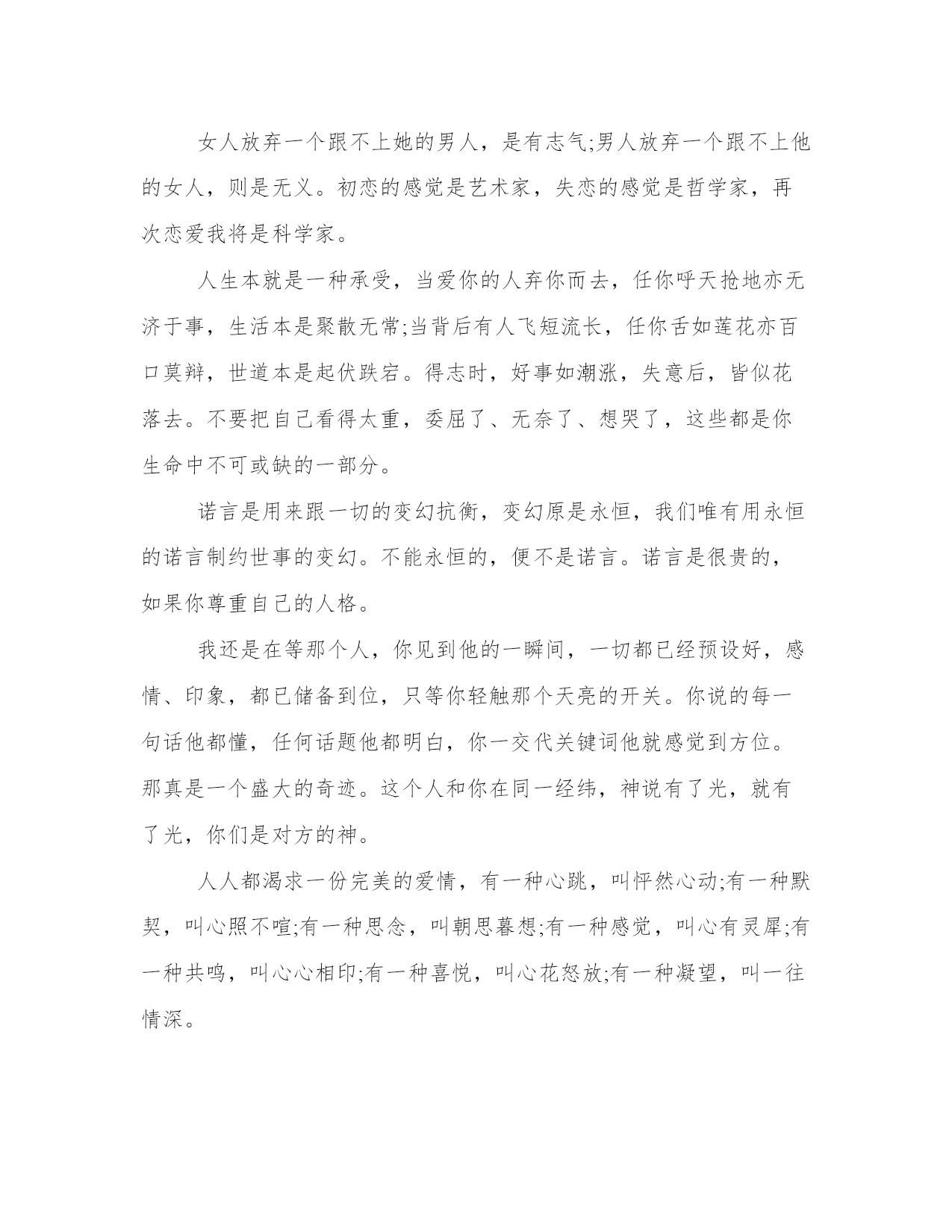 专属女人的生活心情语录忘掉那些长篇大论,忽略那些爱情专家,摒弃那些星座指南吧。爱情从来就没有一个公式可循,有时候想要平平淡淡却变得轰轰烈烈,有时候不想爱他却变得无法自拔。给爱情一个机会,趁你们还年轻。走过去牵她的手,趁你们还相爱。谁的经验都不要信,听从自己的内心。生命无法用来证明爱情,就像我们无法证明自己可以不再相信爱情。在这个城市里,诚如劳力士是物质的奢侈品,爱情则是精神上的奢侈品。可是生命脆弱无比,根本没办法承受那么多的奢侈。爱上一个人,就是爱上一个伤口。每一次爱情,都像一个新鲜的伤口,生长在心里,偶尔疼痛。然而,正是那些疼痛和记忆让我们变得成熟、风情、包容、自制,并且冷静,更懂爱,也更会爱。不属于自己的浪漫,就象绑在线上的风筝,不管飞多高,风停了总会有跌落的时候;不属于自己的感情,就象握在手里的沙子,不管握多紧,都会有流逝的风险;不属于自己的心动,就象上了发条的钟表,不管走多久,终会有停摆的一天。为什么我们总是不懂得珍惜眼前人?在未可预知的重逢里,我们以为总会重逢,总会有缘再会,总以为有机会说一声对不起,却从没想过每一次挥手道别,都可能是诀别,每一声叹息,都可能是人间最后的一声叹息。人和人之间,总是以相同点结缘,相同的年份相同的区域相同的熟人相同的爱好。若是再好,还有相同的藏书、热爱过同一首歌曲、追过同一名歌星。所以当我们遇见稍微有一些与自己类似的人,便激动得不能自已。因你不用再去解释当初看那本书时为何流泪,因对方和你一个手势便能知根知底。在我们的记忆中,每一次“错过”都是美好的:或是浪漫的情感历程,或是平步青云的官运,或是唾手可得的财气。但同时,我们也许错过了疾病,错过了灾难,错过了失败,错过了与己无益的是与非。因此,不必为错过叹息,因为在叹息中,我们又将错过今天的美好。我们常感叹生活太过平淡,其实,人生中,除了幸福和痛苦,平淡占据了我们大部分生活。我们要学会享受平淡,平淡如同清茶,点缀着生活的宁静和温馨;我们要学会承受平淡,学会承受淡淡的孤寂与失落,承受那挥之不去的枯燥与沉寂,还要承受那遥遥无期的等待与无奈。生活本身就是一种承受。黎明和黄昏周而复始的交替,人生也在白昼和黑夜之间挣扎,在前行的路上,我们都会面对一个问题,生命随时都可能结束。所有的梦想和期望、功名和利禄、困窘和失败都会在死亡的那一刻时消失。那么,既然来时和去时都一无所有,我们还有什么理由不坦然面对生命?爱情总是让人充满幻想,总以为可以百毒不侵。甜言蜜语不是毒药。它像是锋利的刀子穿入心脏的快感,当爱情离开时你也体会它穿心的疼痛!然后把自己紧紧包裹,不愿让人看到留下的伤口,只有在孤单雨夜才放任自流,让所有的疼痛蔓延!女人伤心地说:我和他一起许多年了,可是,我知道他心里仍然怀念着逝去的妻子。我是没法代替她的。那就不要代替她好了。不要渴望自己可以代替别人。你是你自己,用不着代替任何人。一个人,走在陌生的城市,听伤感的音乐,看陌生的风景。我们都在寻找,人生就是寻找爱的过程,每个人都会遇到三种人,你爱的人,爱你的人,与你共度一生的人。并不是每一对有缘相爱的恋人,都有相守一生的缘分;也许这一场恋爱是情深缘浅,下一场就缘定终生了,去爱吧,像不曾受过一次伤一样。真正的感情根本不需要追的,两个人的默契慢慢将两颗心的距离缩短,在无意识中渐渐靠近彼此。从好朋友到情人,真正的感情是用不了多久的。从你喜欢上他的那一刻起,也许他也在那一刻喜欢上了你。同节奏的爱情往往能奏出最和谐最动听的乐章。真正的爱情需要两个人在一起是轻松快乐的没有压力。人生的平凡、平淡、平庸,常归因于一个字:怕。怕得到的会失去,怕转身了就是永别,怕摔跤后再也起不来,在怕中畏首畏尾裹足不前。人生就一条路,走一步有一步的景观。上帝不会眷顾谁,你有勇气放弃,才有机会得到。华丽的跌倒,胜过无谓的徘徊;哪怕败得彻底,就当赶上了命运的另一盛宴。有很多人,你原以为可以忘记,其实没有。他们一直在你心底的一个角落,直到你的生命尽头。在尽头你会怀念每一个角落里的黑暗之中的光,因为他们组成你的记忆与感情,但是你已经不能拥抱他们。只能在最后明白,路途是一个念念不忘的失去的过程。突然明白,别人怎么看你,或者你自己如何地探测生活,都不重要。重要的是你必须要用一种真实的方式,度过在手指缝之间如雨水一样无法停止下落的时间,你要知道自己将会如何生活。突然明白,别人怎么看你,或者你自己如何地探测生活,都不重要。重要的是你必须要用一种真实的方式,度过在手指缝之间如雨水一样无法停止下落的时间,你要知道自己将会如何生活。你过得快不快乐,只有自己知道。谁都有一段不为人知的故事,谁都会脆弱的想要一个停靠,谁都想和某个人完成曾经诺言,谁都有微笑然后转身流泪,谁都曾生活的多少有点苦涩。我只想要少一点悲伤悲伤,多一点快乐。我只想